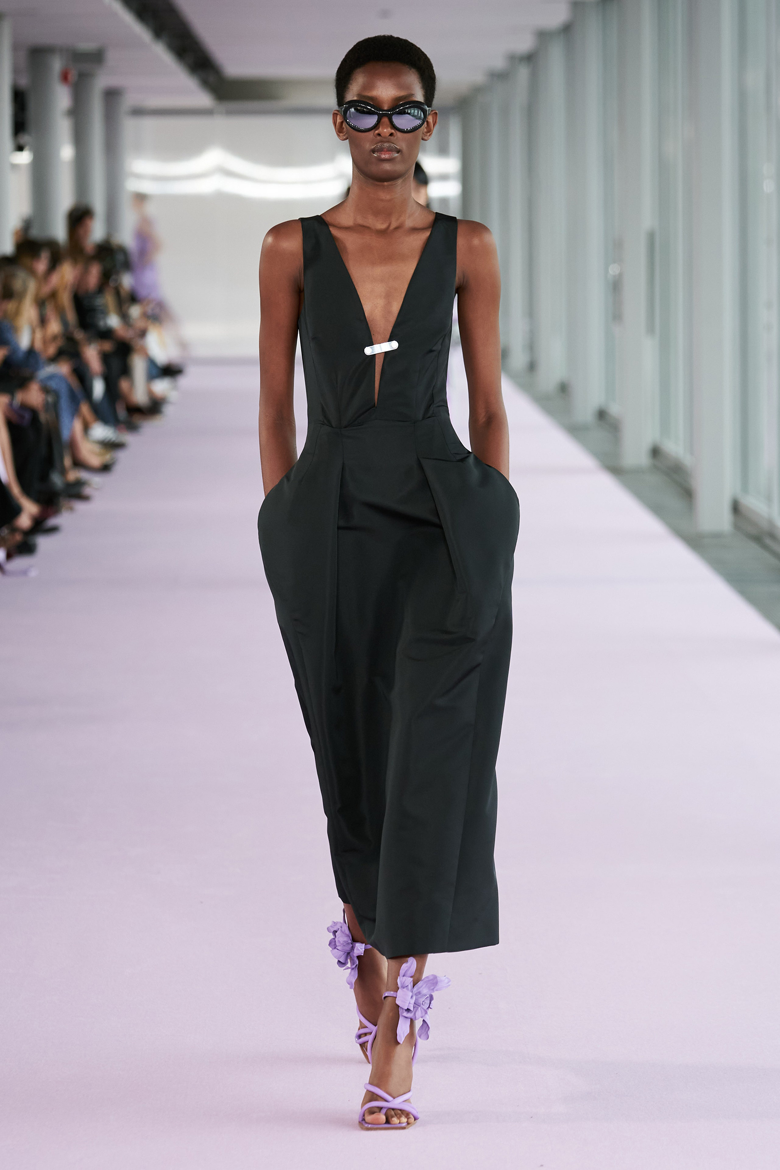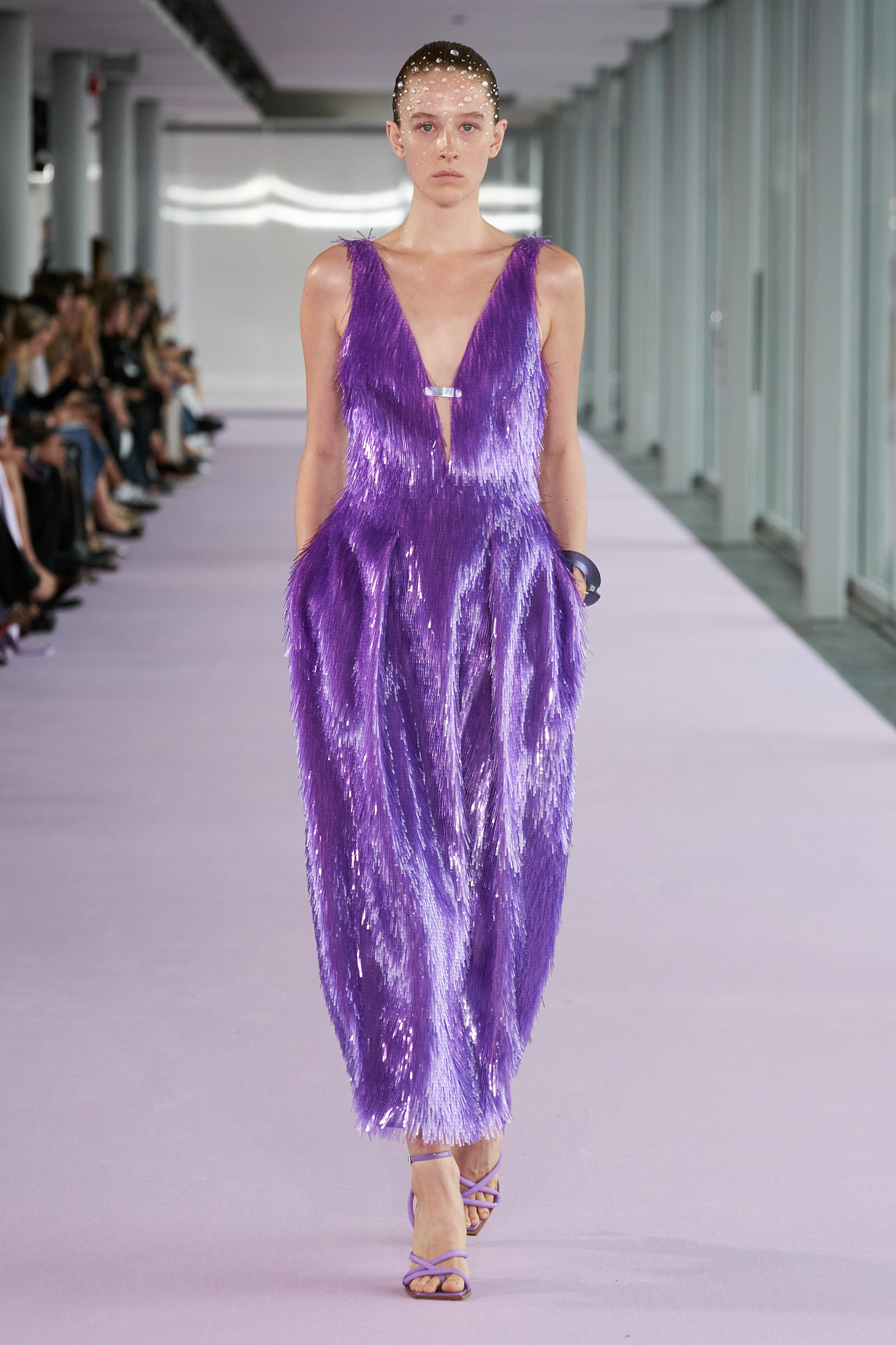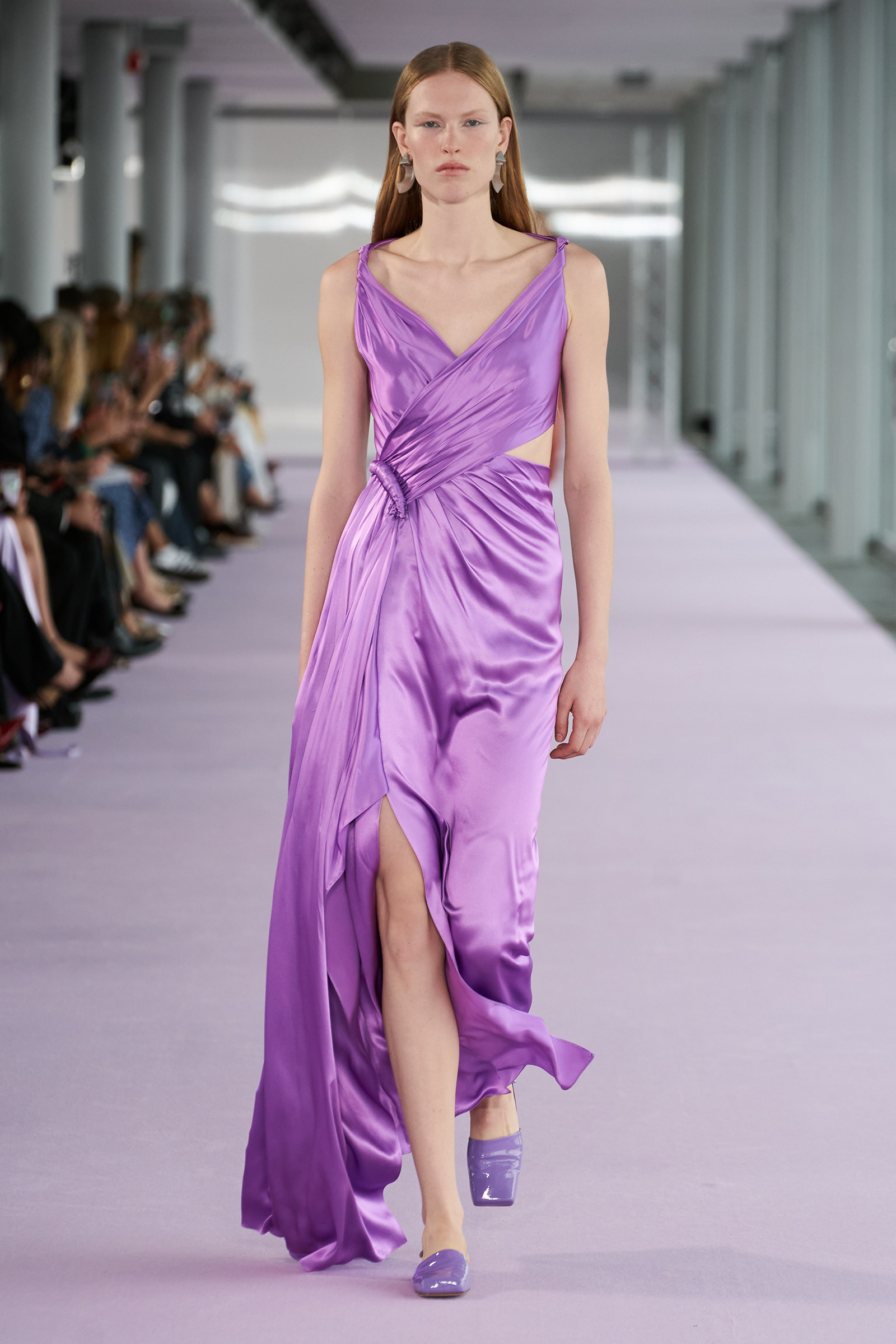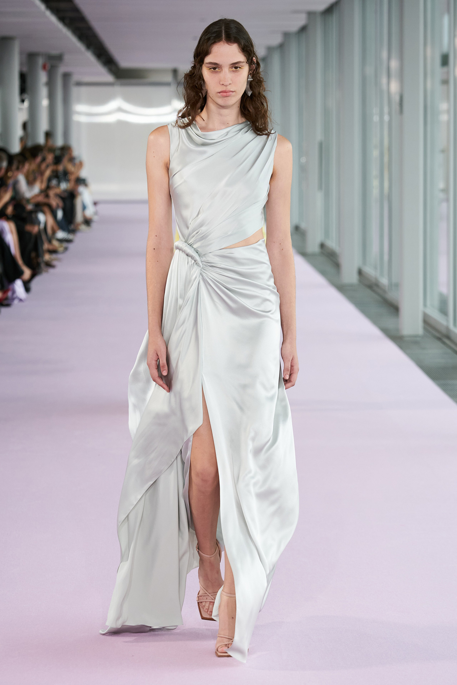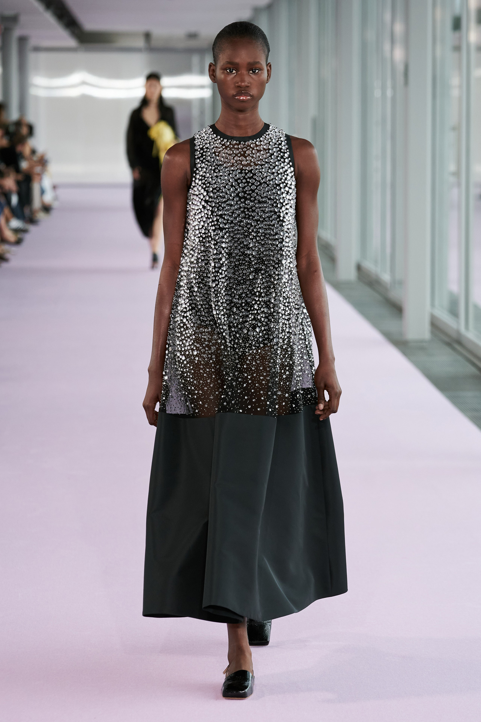 Playing on the same organic/sculptural dissonance, pointy corseted bustiers were lacquered in a lustrous black glow, made with the same technique that gives Steinway pianofortes their patina, or were polished to achieve the chrome shine of race cars. They looked slightly dangerous, like poisonous blooms sprouting from liquid long skirts. On a less disquieting note, draped dresses in flimsy jersey highlighted Del Core’s skilled understanding of the intricacies of fluid construction, which he honed worked alongside Alessandro Michele on special pieces for a coterie of celebrities. This is an arena where he feels comfortable: his loyal following of megastars—Florence Welch, Beyoncé, Björk, Anya Taylor-Joy—enjoys the theatricality of his designs.
