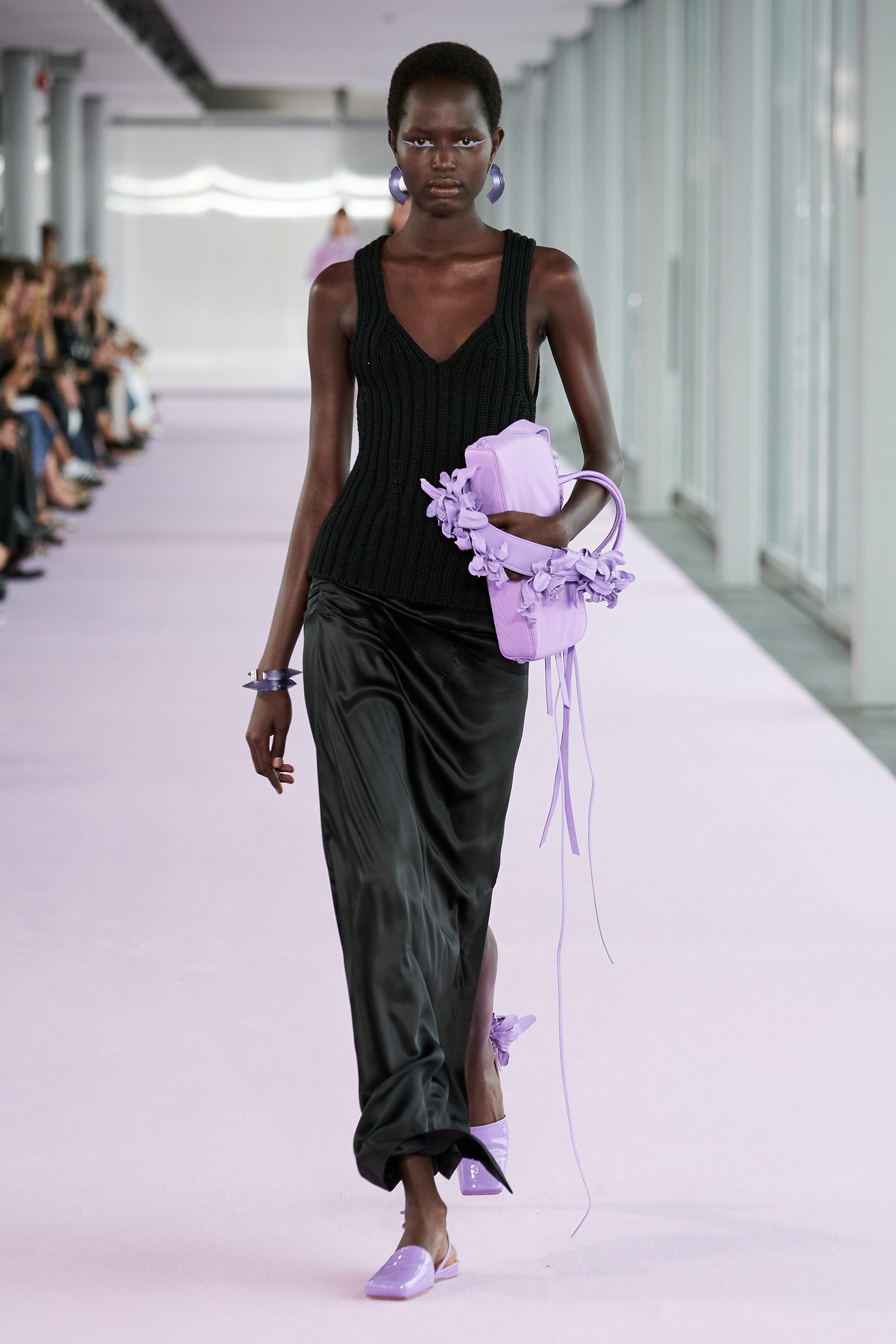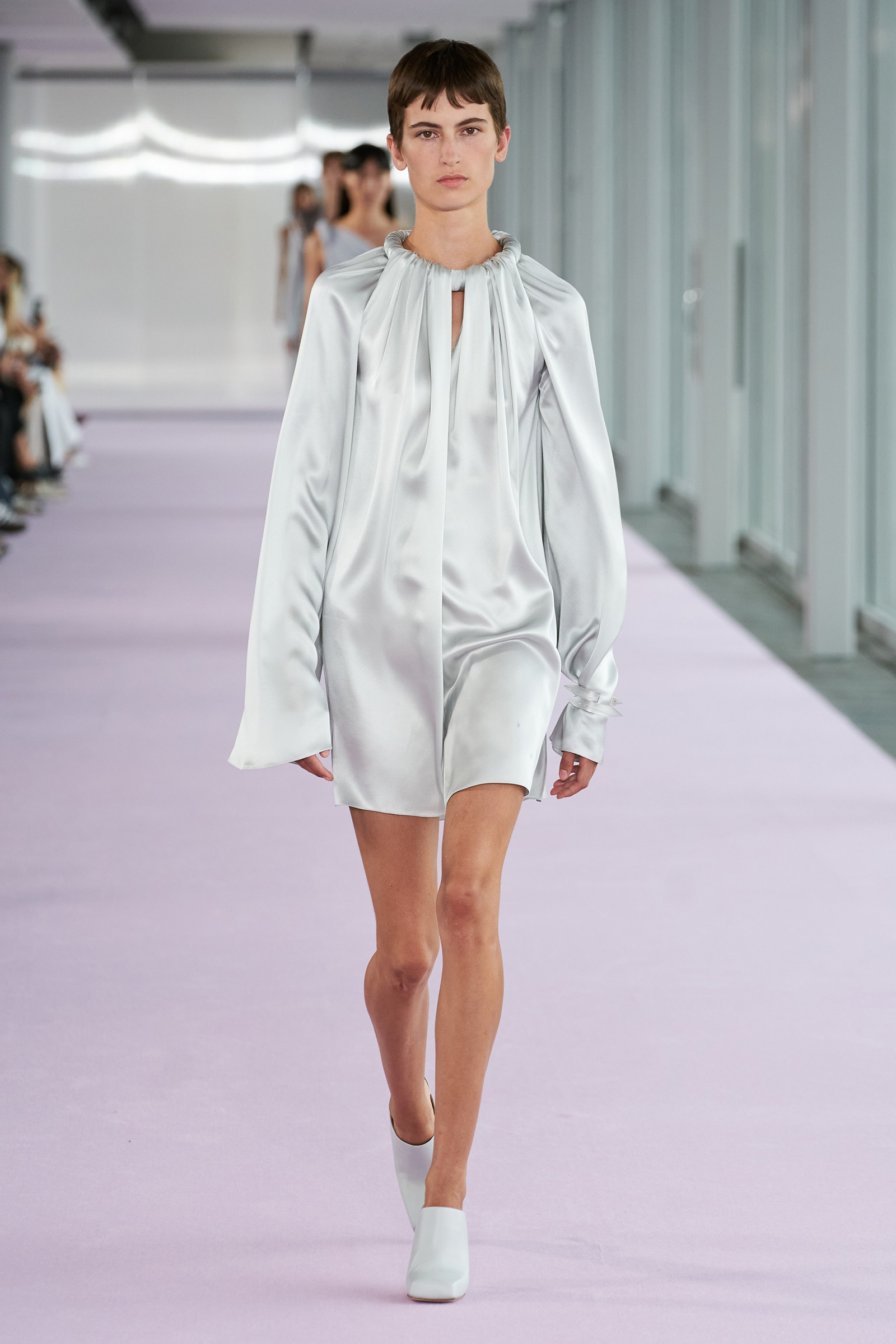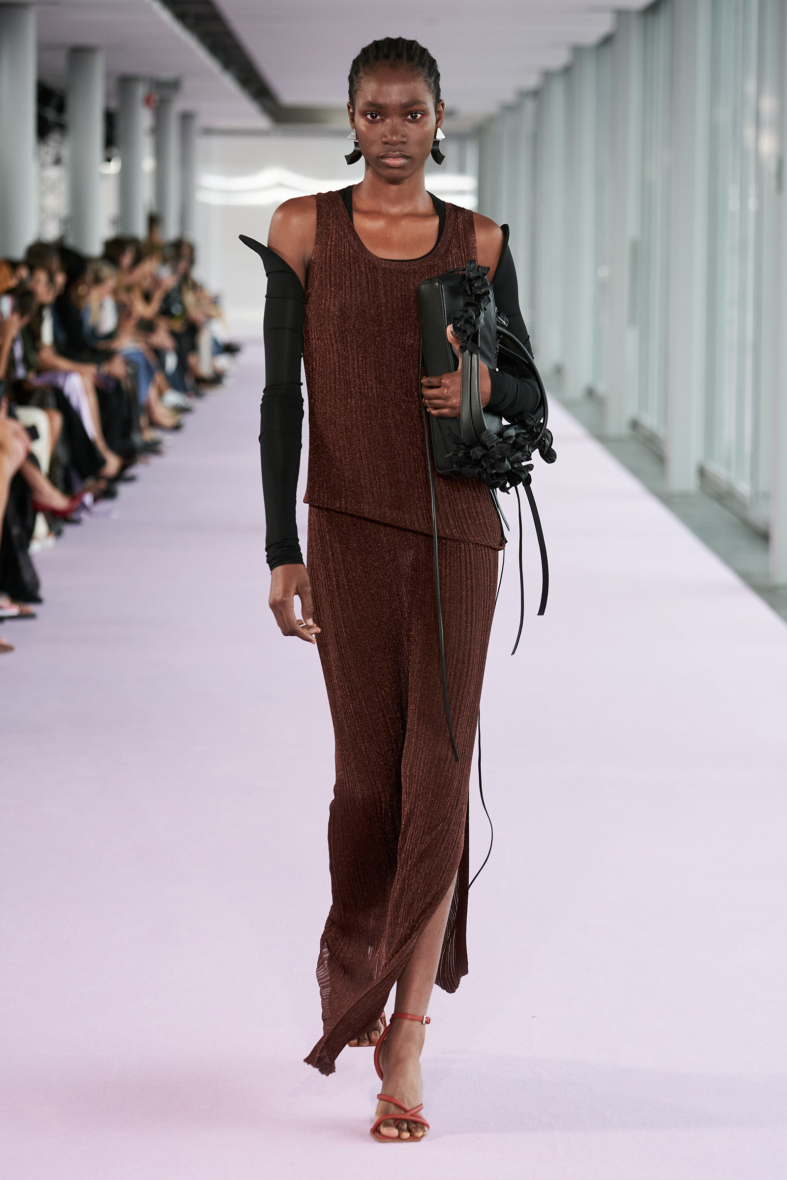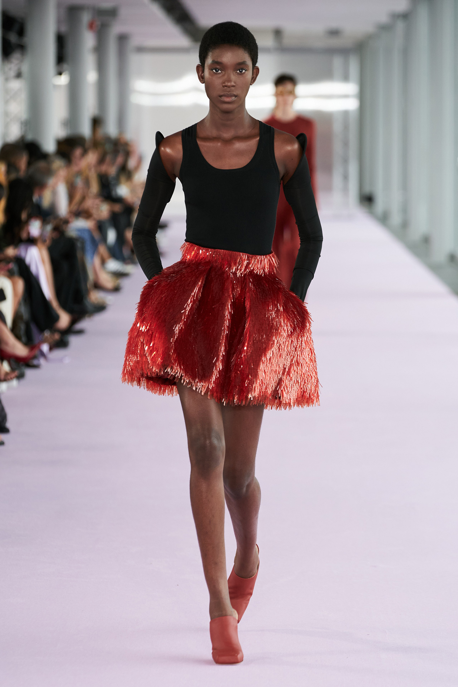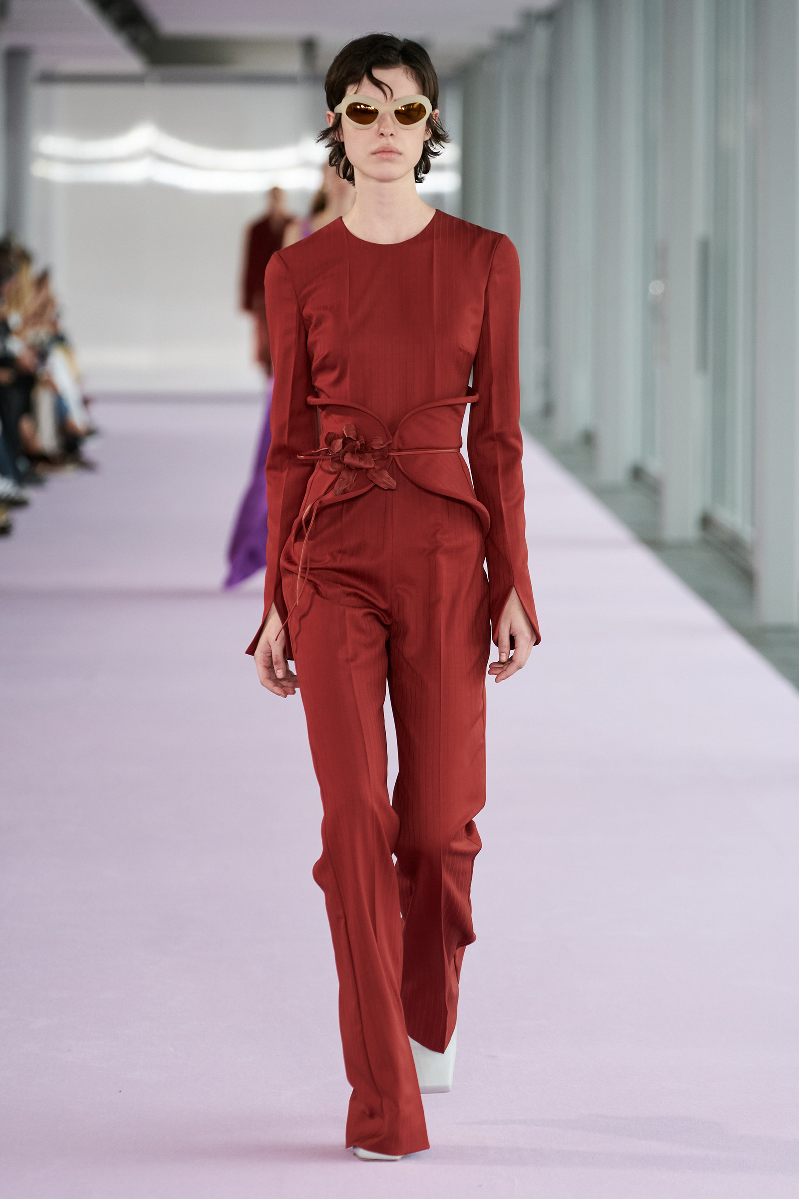 Playing on the same organic/sculptural dissonance, pointy corseted bustiers were lacquered in a lustrous black glow, made with the same technique that gives Steinway pianofortes their patina, or were polished to achieve the chrome shine of race cars. They looked slightly dangerous, like poisonous blooms sprouting from liquid long skirts. On a less disquieting note, draped dresses in flimsy jersey highlighted Del Core’s skilled understanding of the intricacies of fluid construction, which he honed worked alongside Alessandro Michele on special pieces for a coterie of celebrities. This is an arena where he feels comfortable: his loyal following of megastars—Florence Welch, Beyoncé, Björk, Anya Taylor-Joy—enjoys the theatricality of his designs.