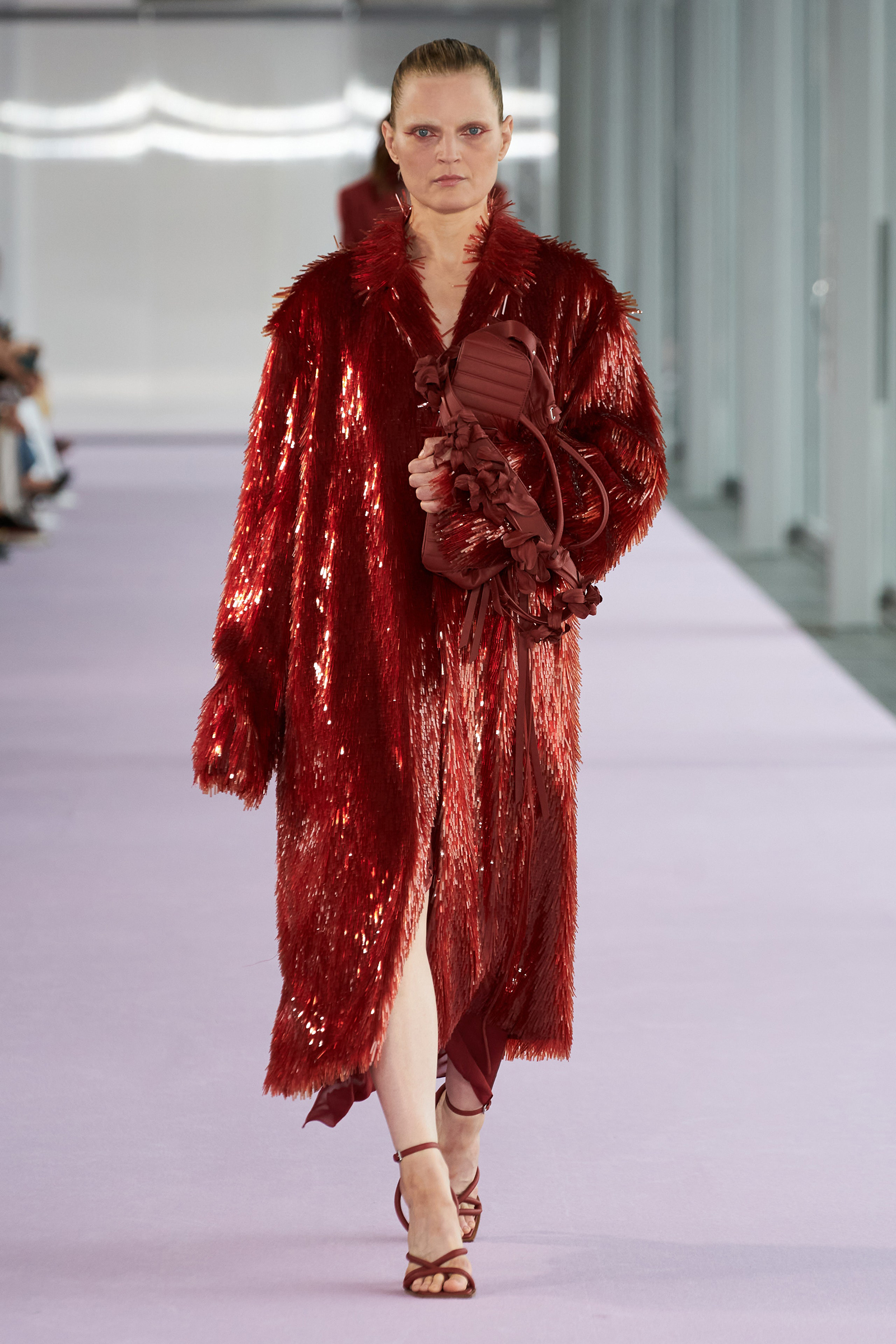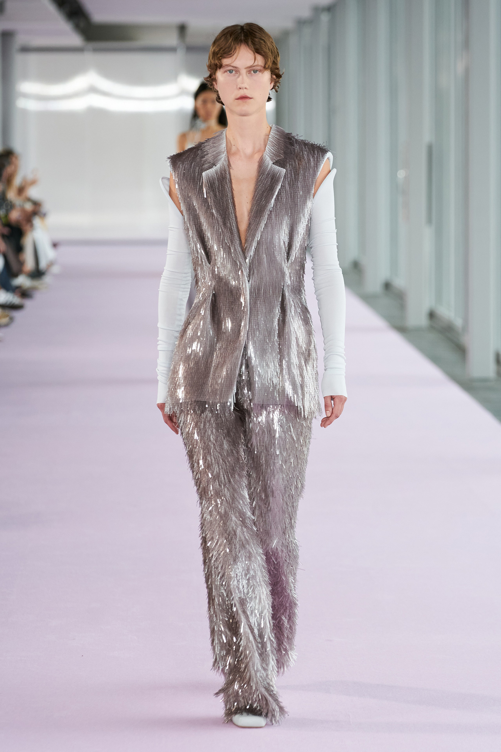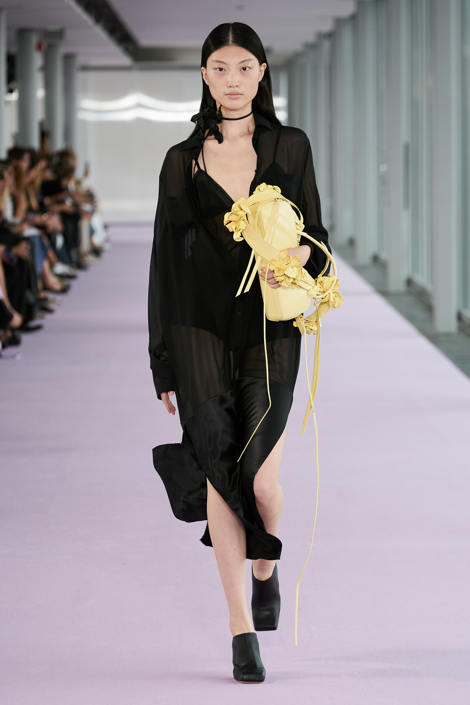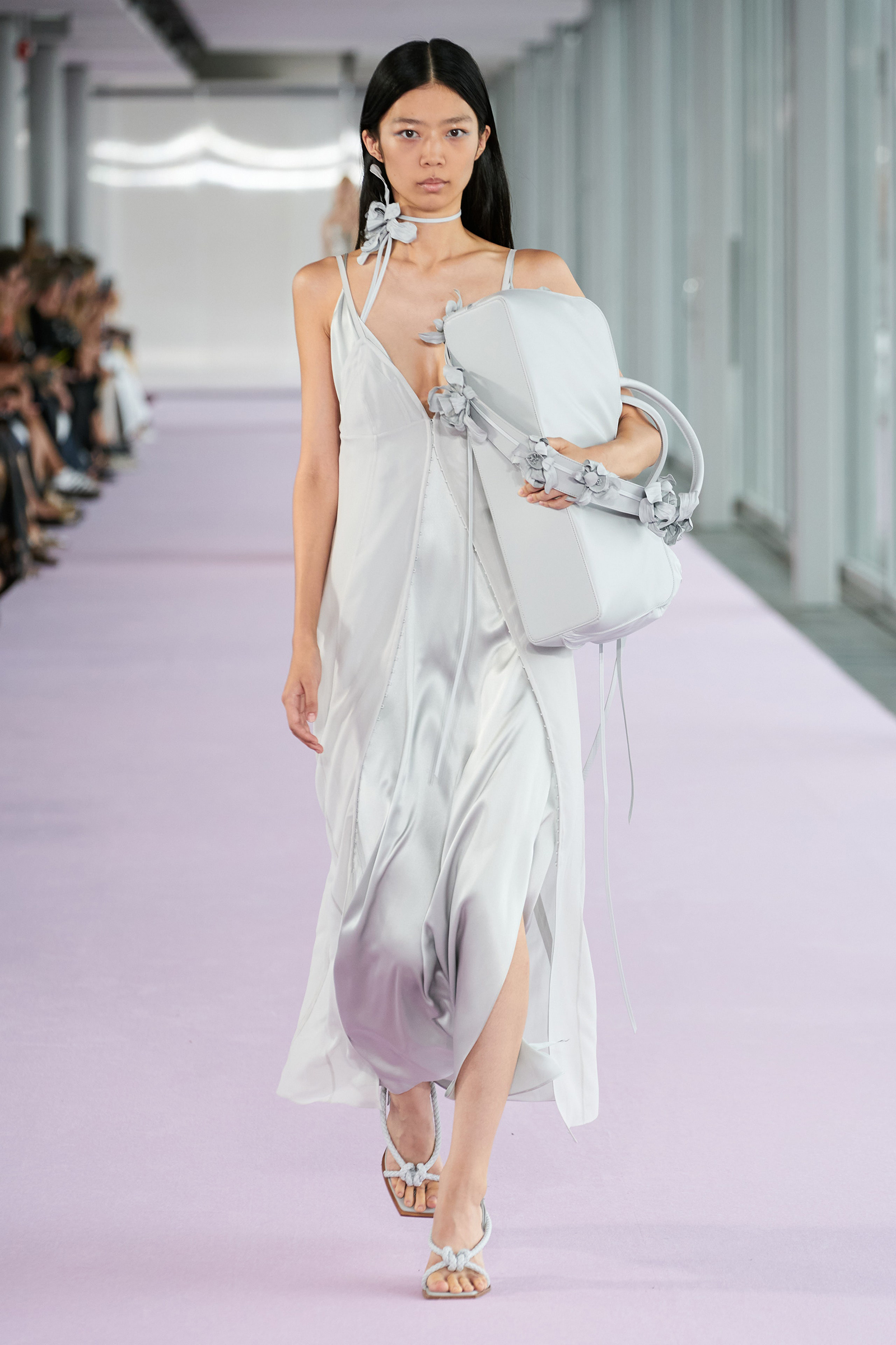 Playing on the same organic/sculptural dissonance, pointy corseted bustiers were lacquered in a lustrous black glow, made with the same technique that gives Steinway pianofortes their patina, or were polished to achieve the chrome shine of race cars. They looked slightly dangerous, like poisonous blooms sprouting from liquid long skirts. On a less disquieting note, draped dresses in flimsy jersey highlighted Del Core’s skilled understanding of the intricacies of fluid construction, which he honed worked alongside Alessandro Michele on special pieces for a coterie of celebrities. This is an arena where he feels comfortable: his loyal following of megastars—Florence Welch, Beyoncé, Björk, Anya Taylor-Joy—enjoys the theatricality of his designs.