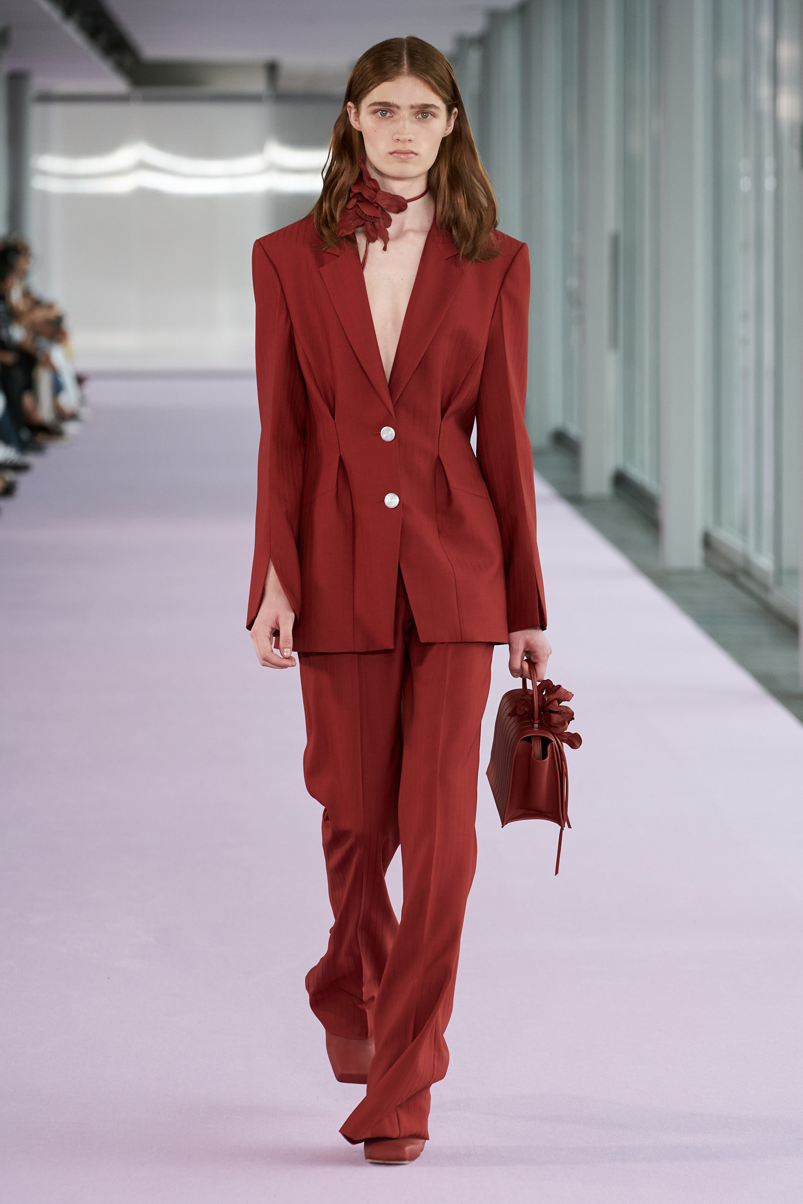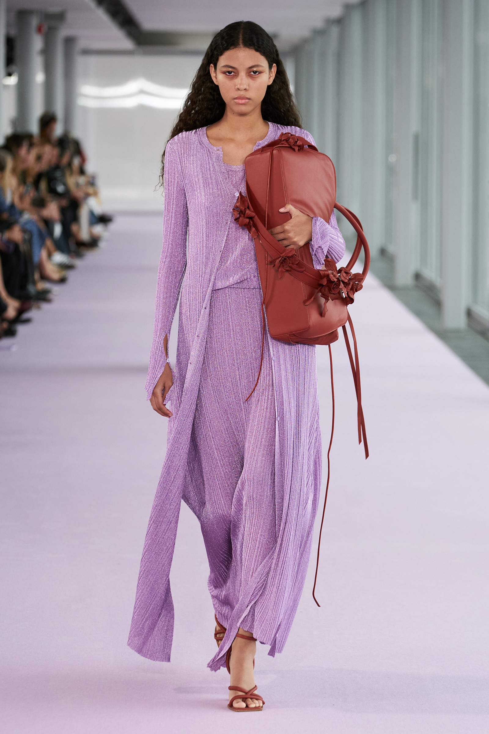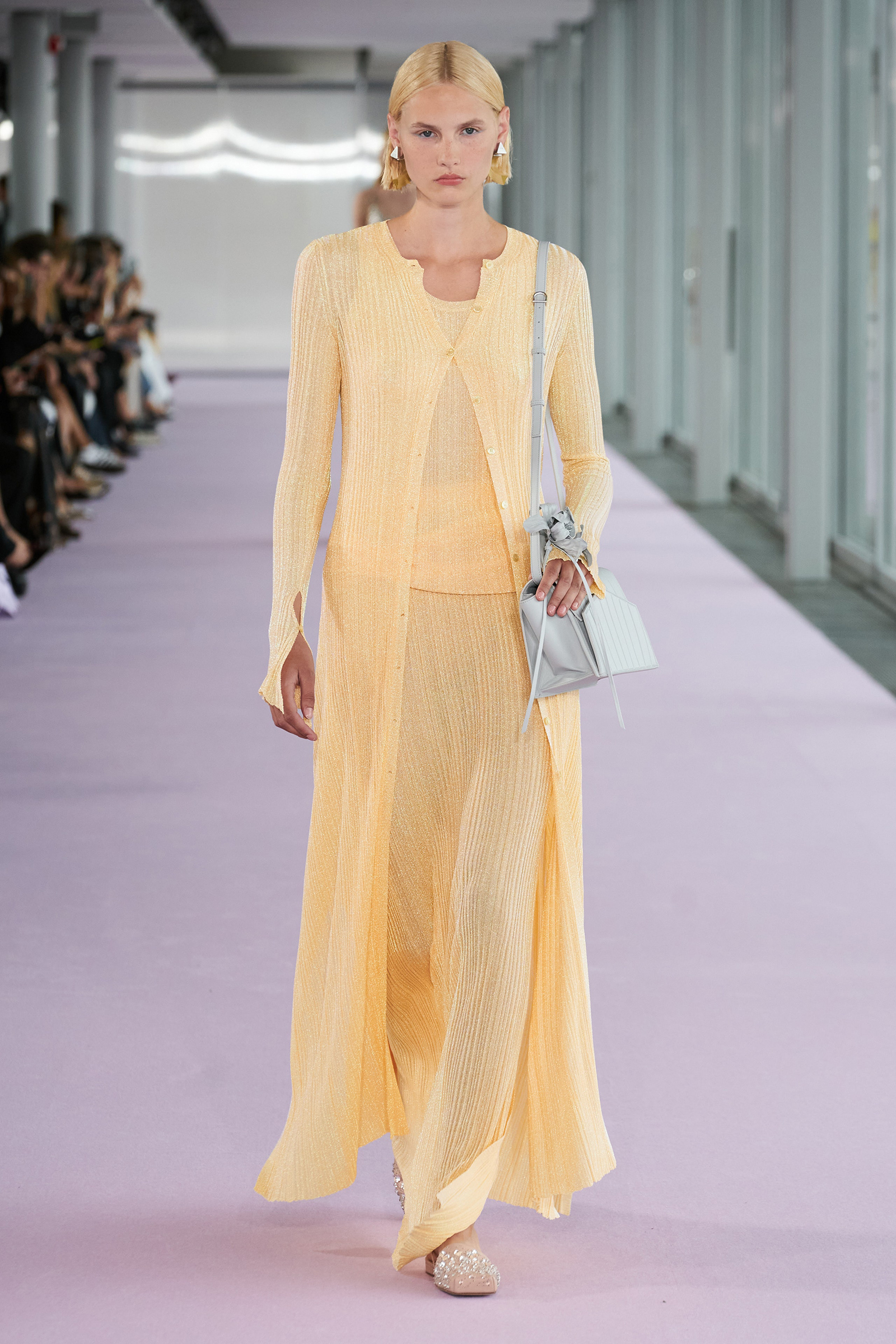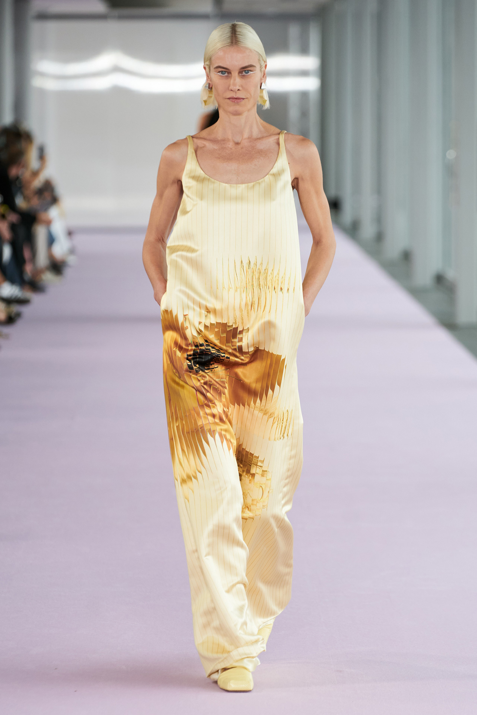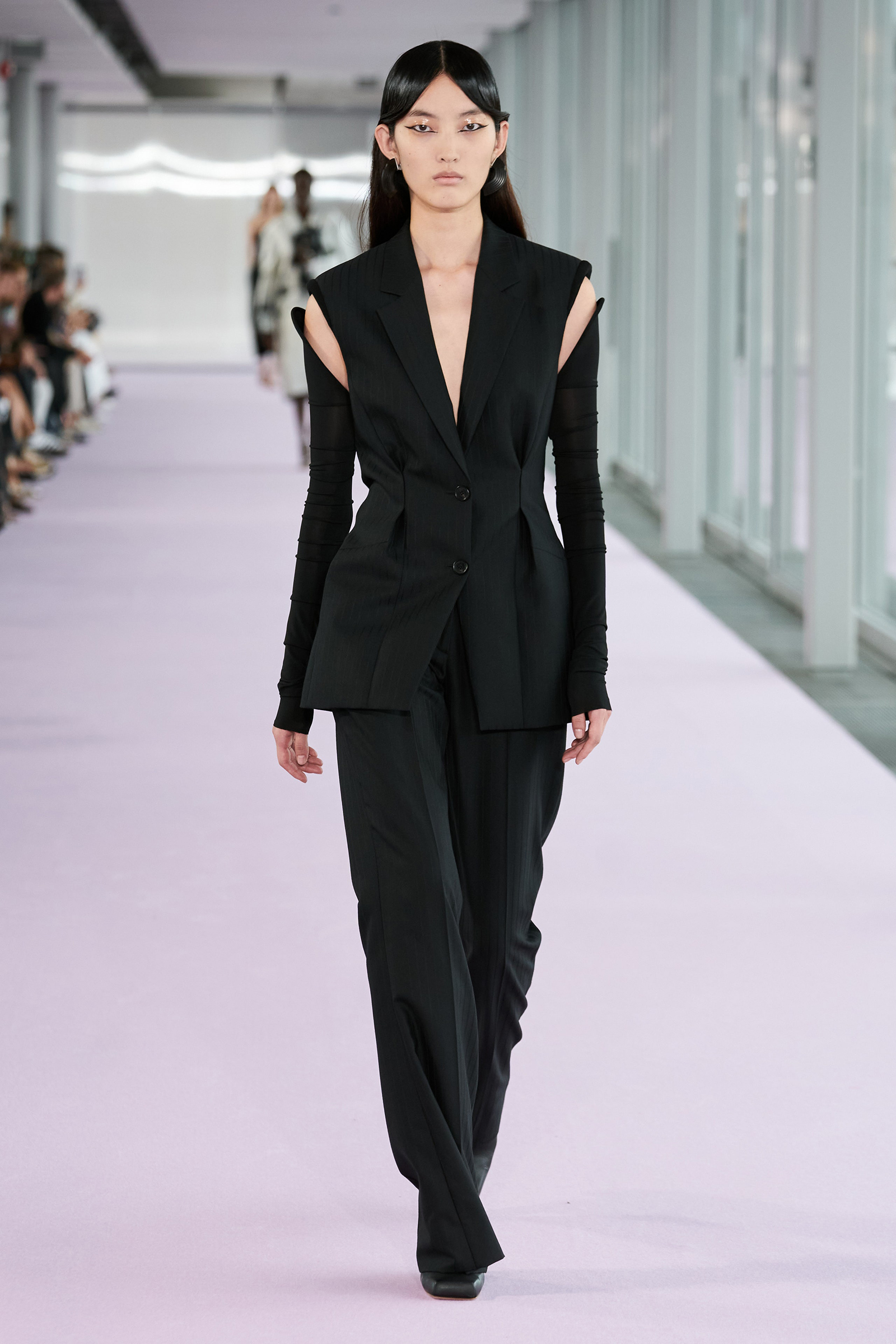 Playing on the same organic/sculptural dissonance, pointy corseted bustiers were lacquered in a lustrous black glow, made with the same technique that gives Steinway pianofortes their patina, or were polished to achieve the chrome shine of race cars. They looked slightly dangerous, like poisonous blooms sprouting from liquid long skirts. On a less disquieting note, draped dresses in flimsy jersey highlighted Del Core’s skilled understanding of the intricacies of fluid construction, which he honed worked alongside Alessandro Michele on special pieces for a coterie of celebrities. This is an arena where he feels comfortable: his loyal following of megastars—Florence Welch, Beyoncé, Björk, Anya Taylor-Joy—enjoys the theatricality of his designs.