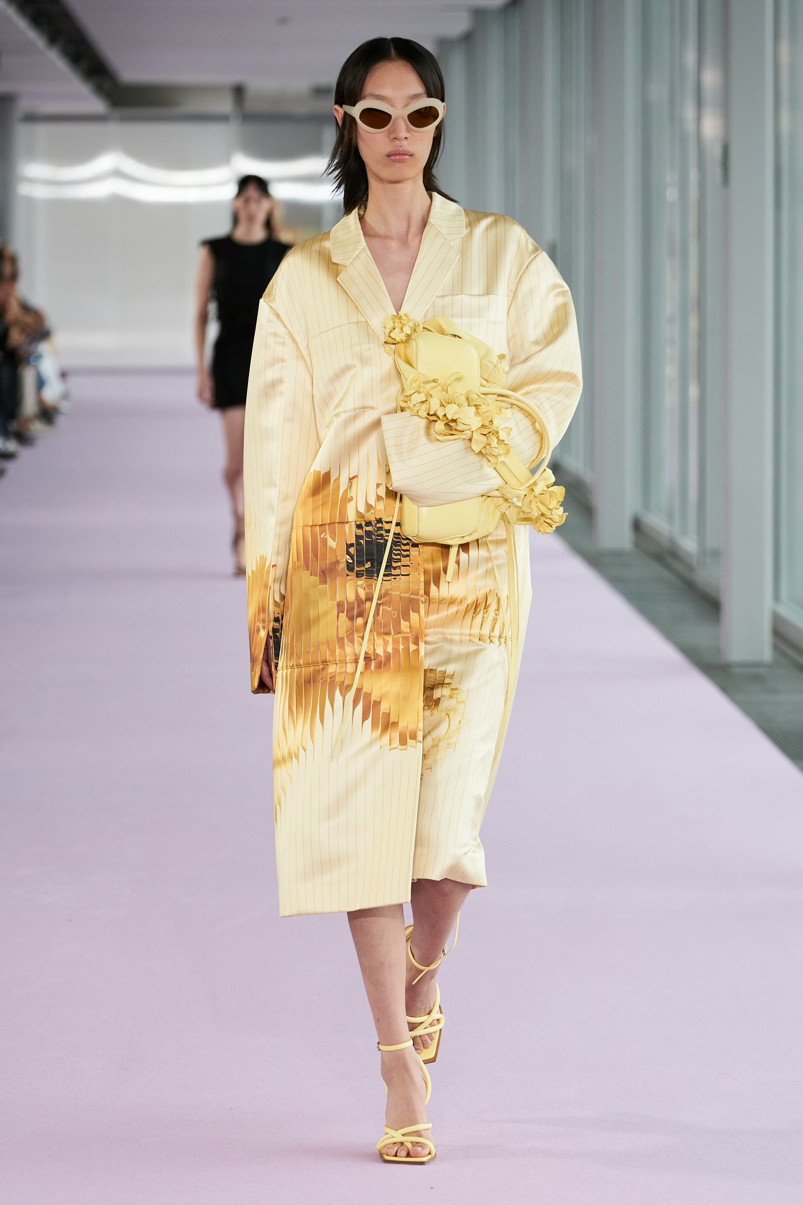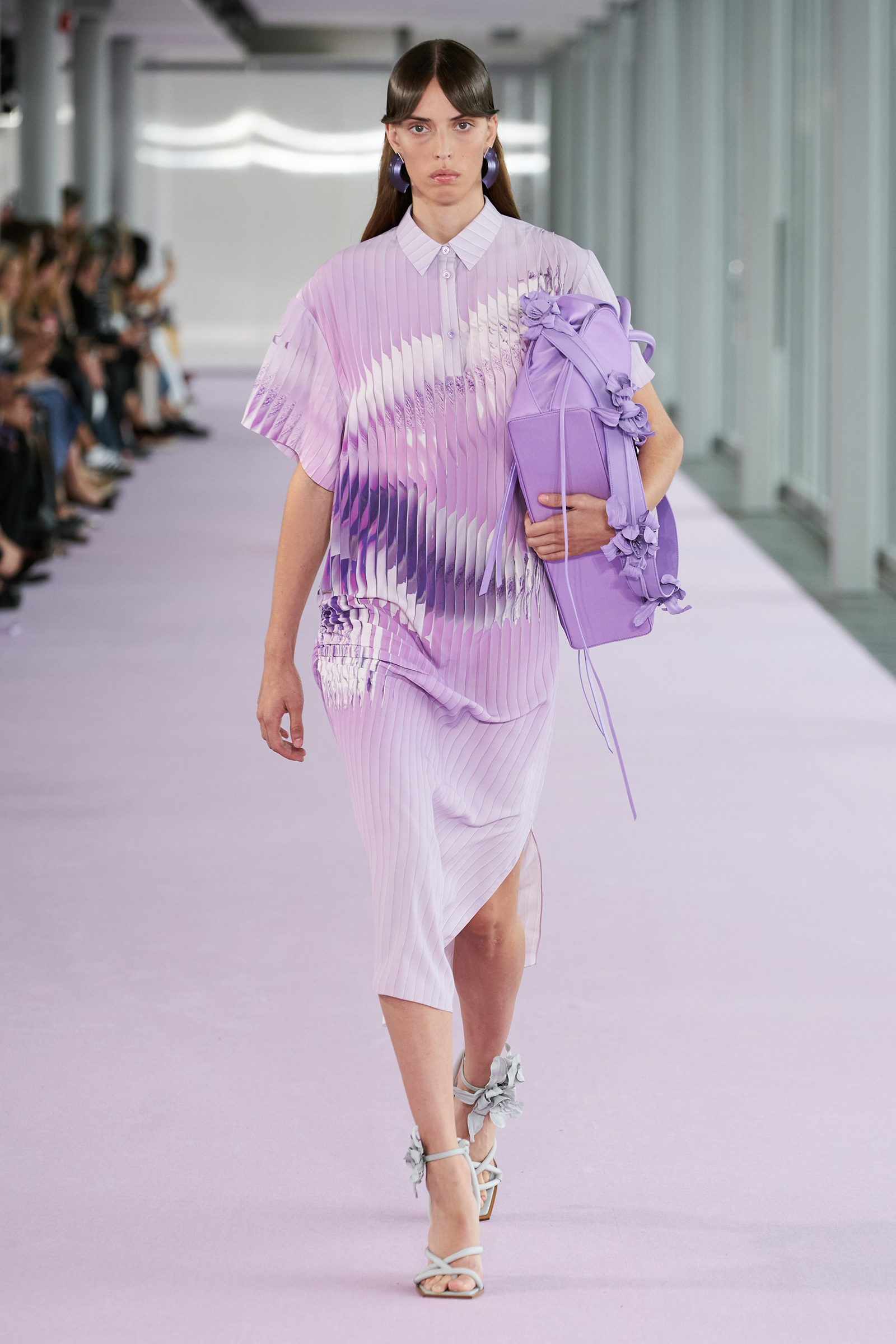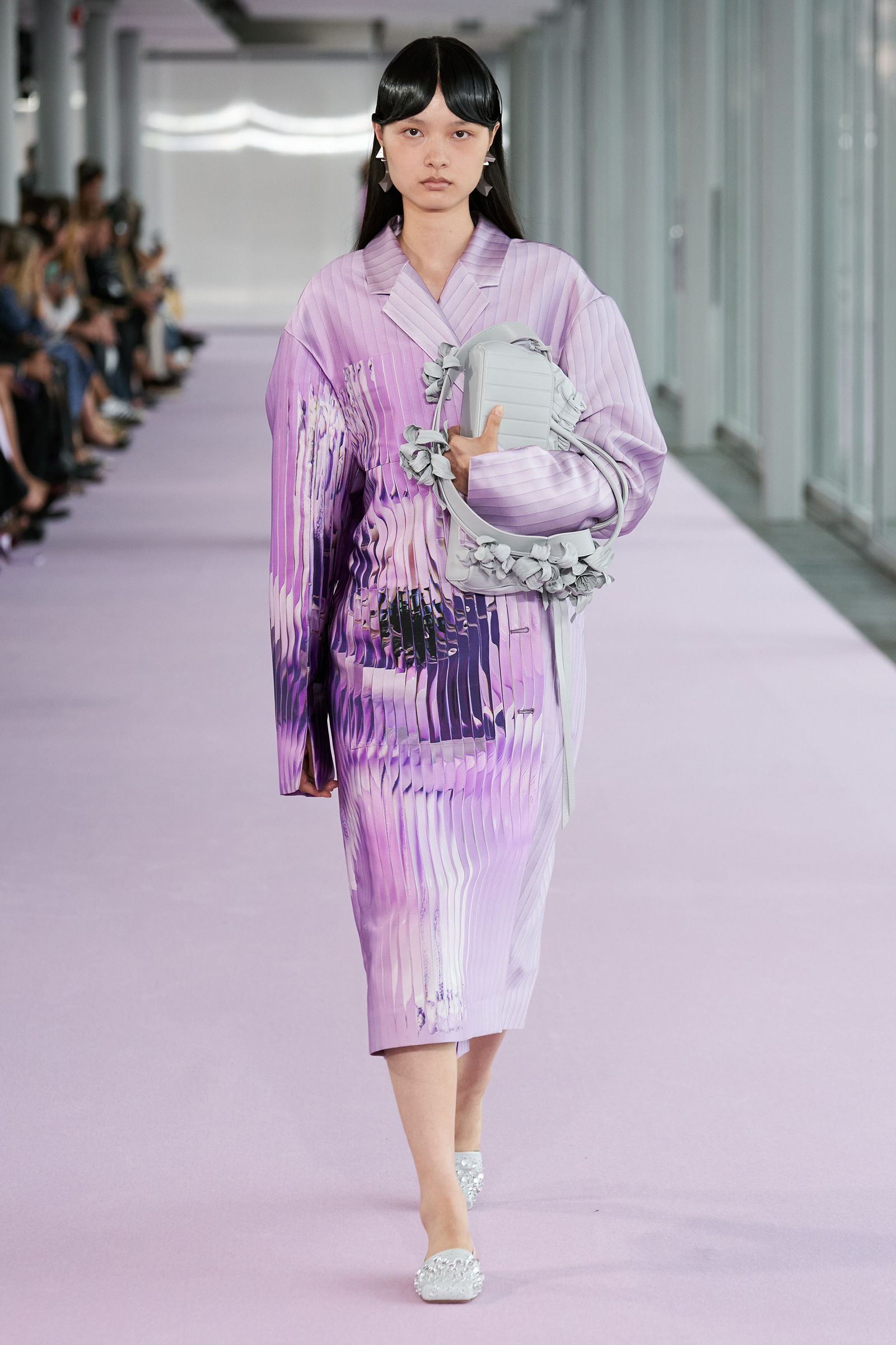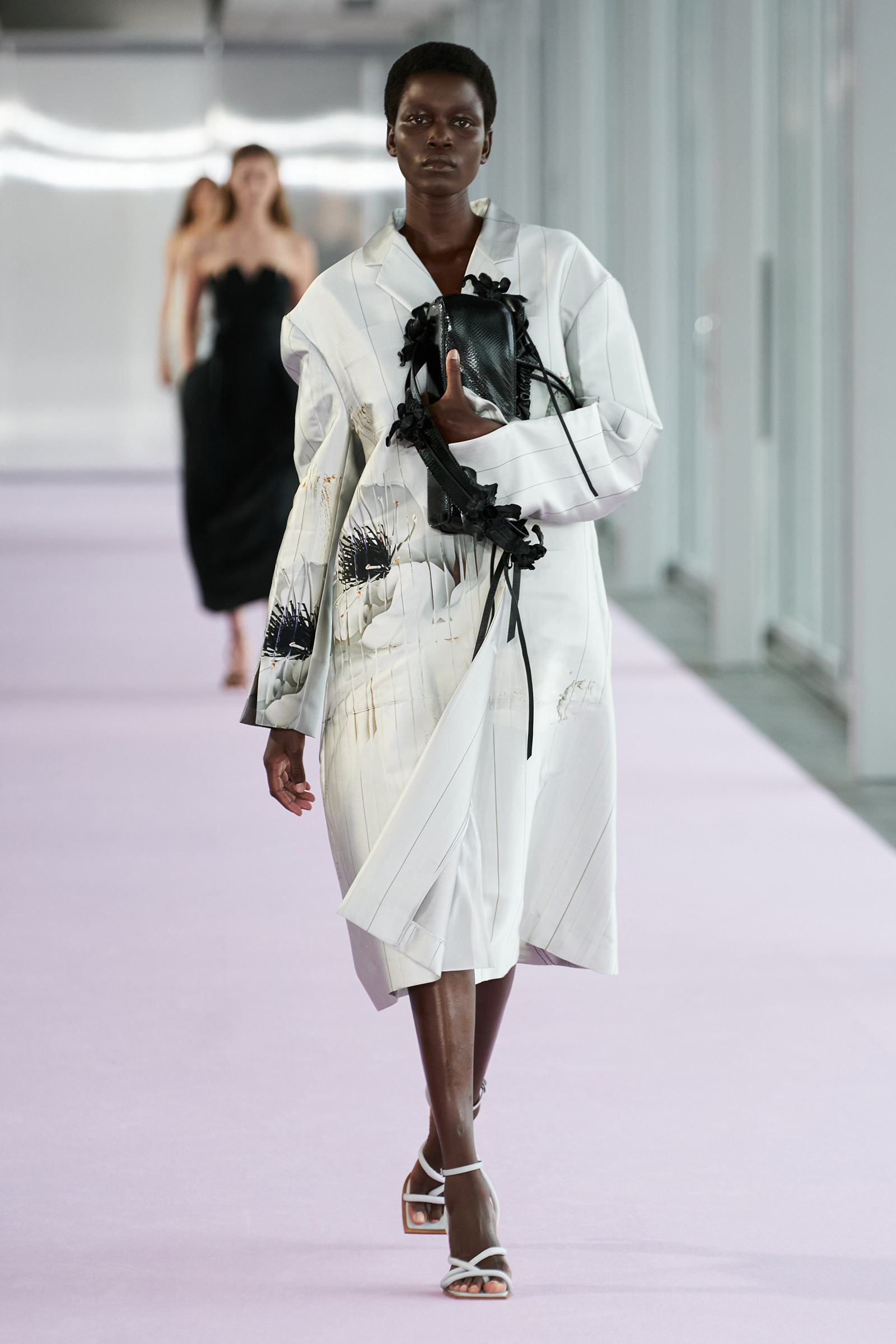 Daniel Del Core staged his Spring show in a glass-and-steel modernist venue perched atop a high-rise building. Suspended over a sweeping view of Milan’s landscape, the setting somehow read as a metaphor for his atypical designs, which live in a blurred territory between couture and RTW, a liminal space where extreme expressive creativity feels the pull (and the strain) of the laws of reality.