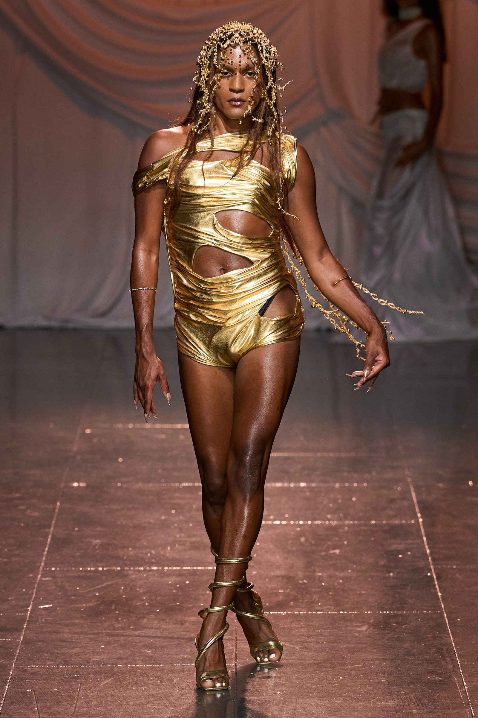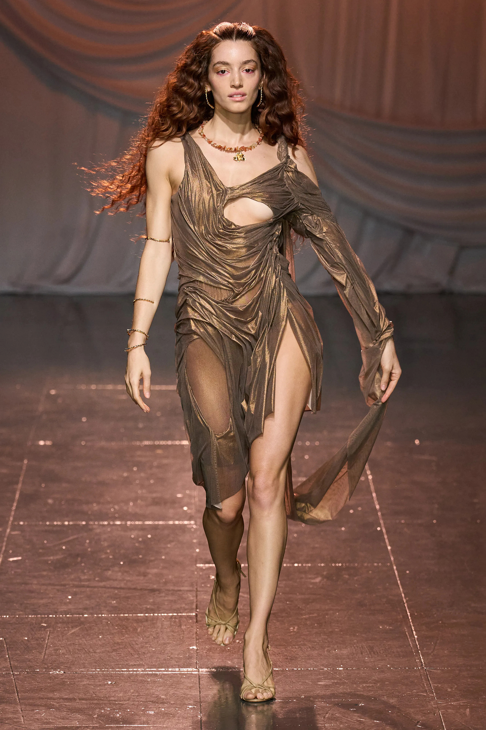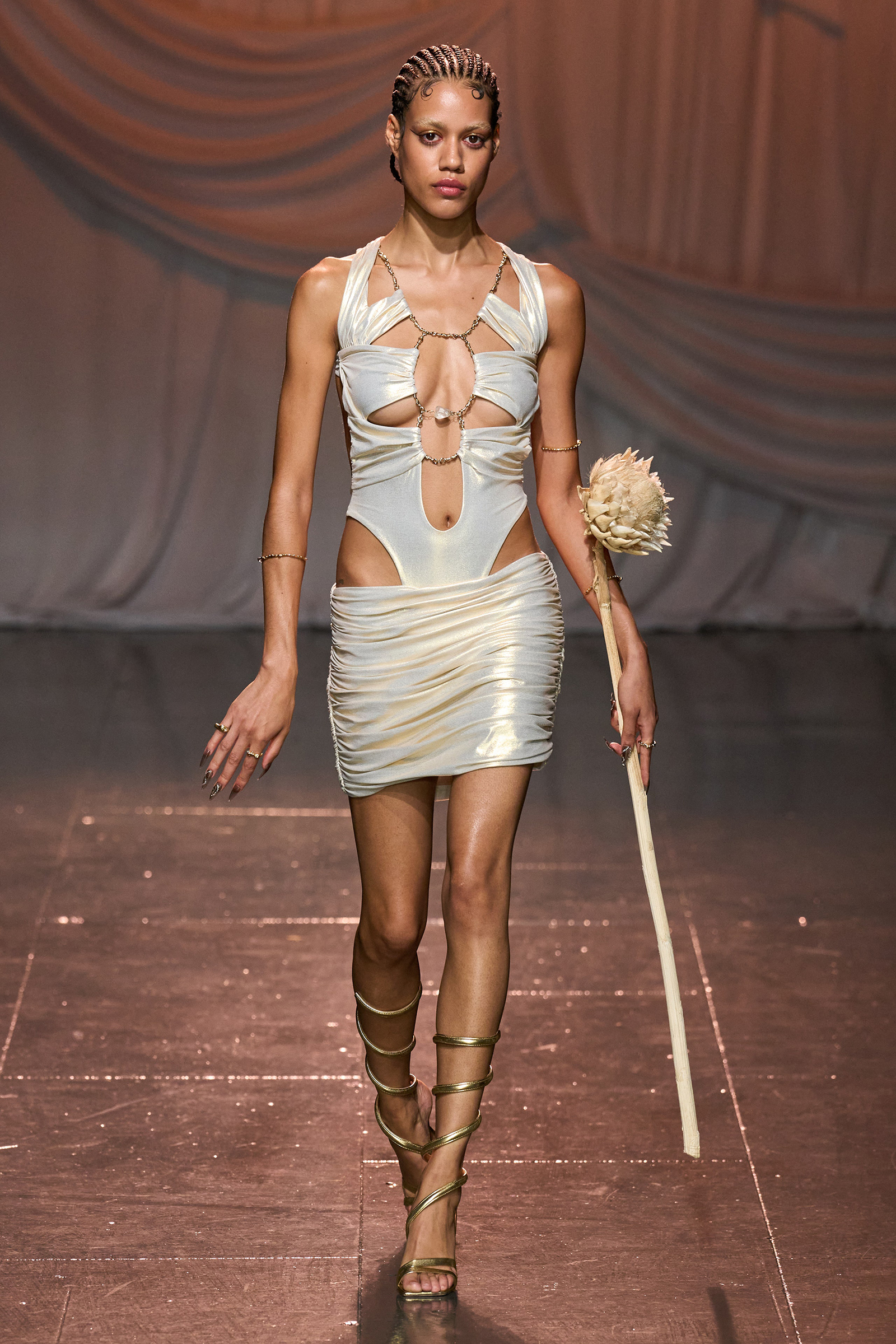 The mood embodied a goddess fantasy with cut-out dresses of varying lengths and lashings of gold details throughout. Hand-knitted cream seafoam-inspired minidresses created an alluring, disheveled-yet-refined look from cotton offcuts. A coral off-the-shoulder minidress with a draped, ruched skirt was particularly striking. Elsewhere, gold lamé draped the body with peekaboos, fashioning seductive dresses.