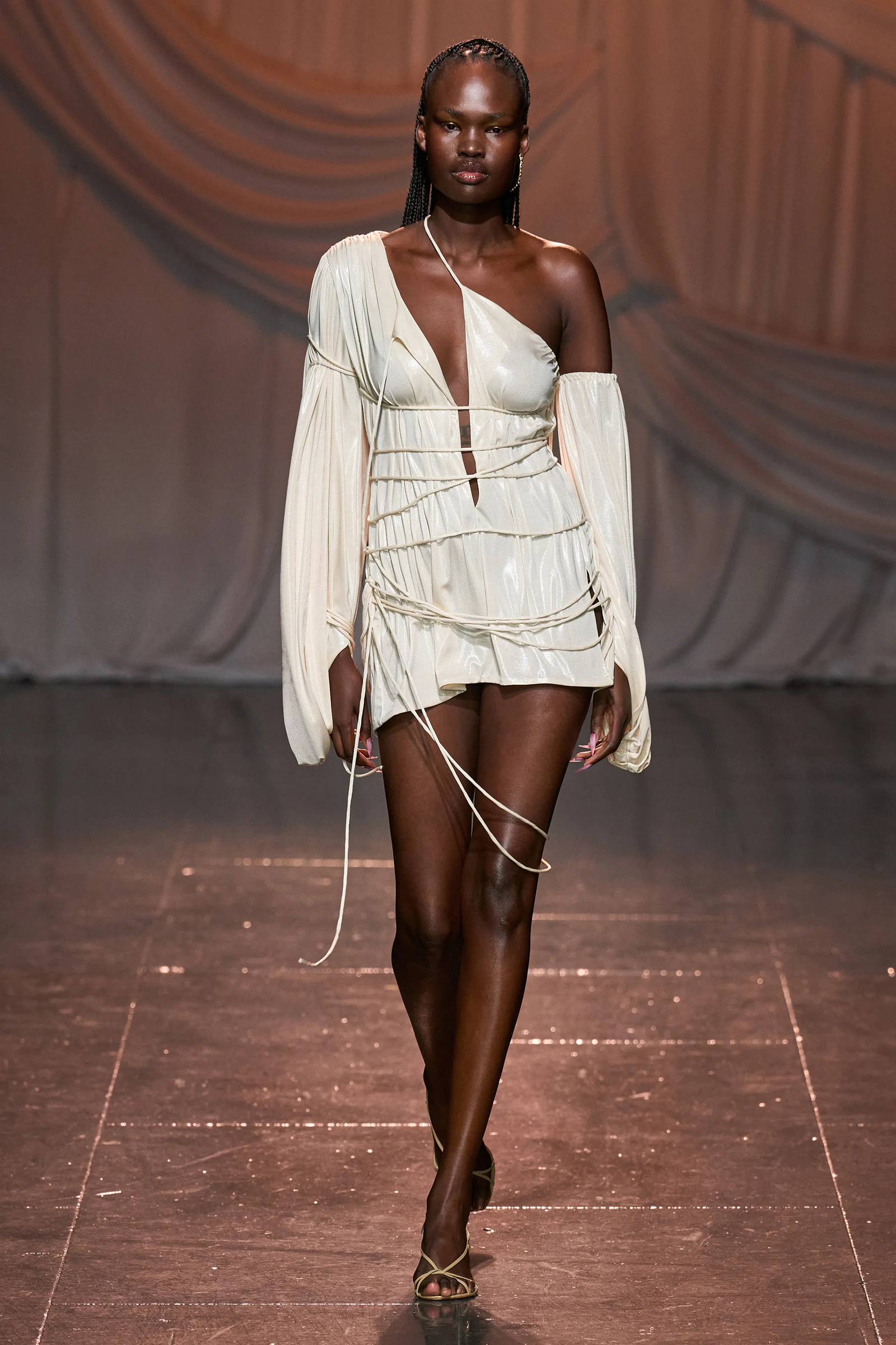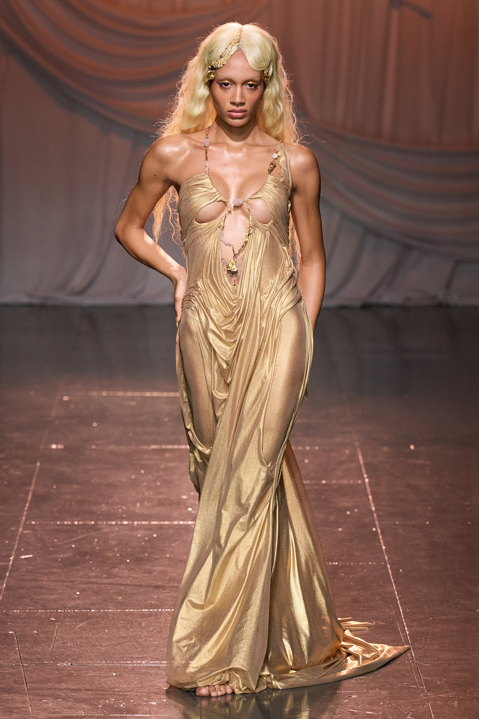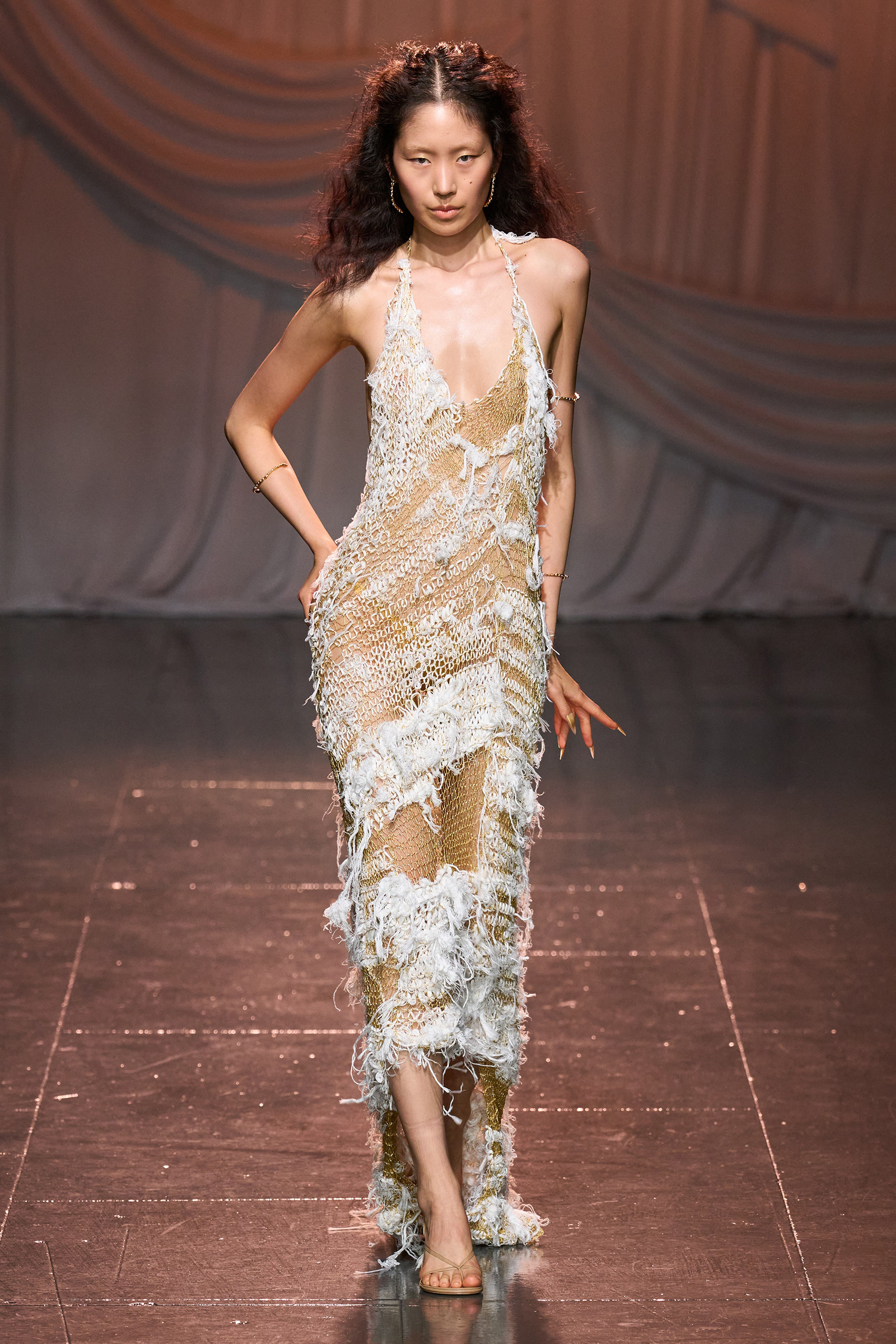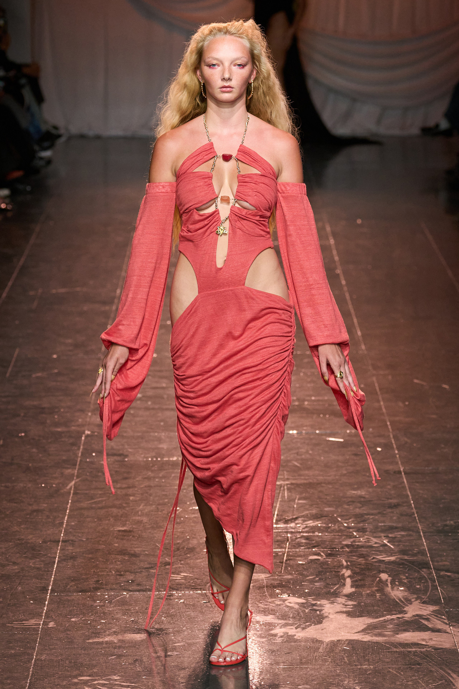 The mood embodied a goddess fantasy with cut-out dresses of varying lengths and lashings of gold details throughout. Hand-knitted cream seafoam-inspired minidresses created an alluring, disheveled-yet-refined look from cotton offcuts. A coral off-the-shoulder minidress with a draped, ruched skirt was particularly striking. Elsewhere, gold lamé draped the body with peekaboos, fashioning seductive dresses.