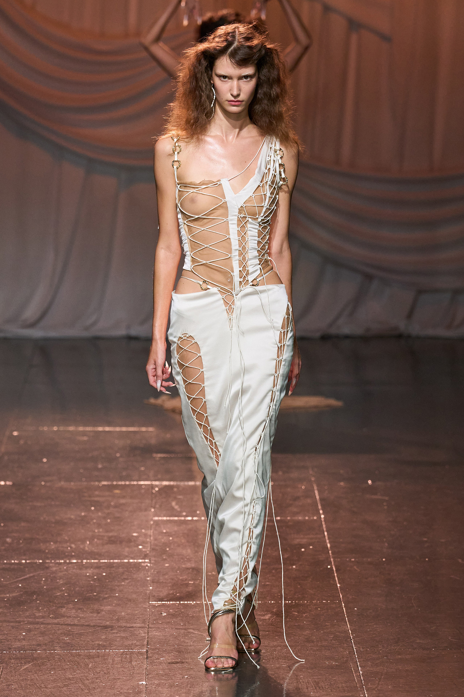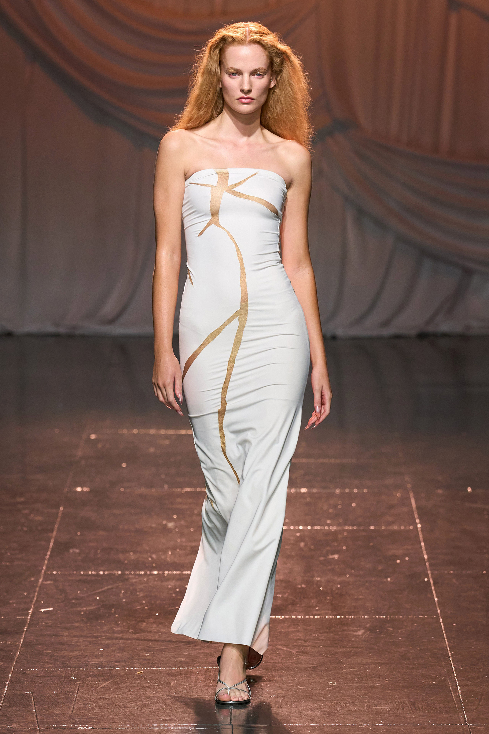 As the show progressed, the idea of breaking and healing was depicted through the garments—“like piecing back a broken heart,” said Petsa. Form-fitting gowns in ivory and nude featured cut outs with lace-up details on the sides and back, emulating corsetry, as well as a Greek statue wrapped in fabric and string for cargo shipping. A hand-drawn graphic of the body was digitally printed onto waist-cinching column dresses made from bamboo fabric.