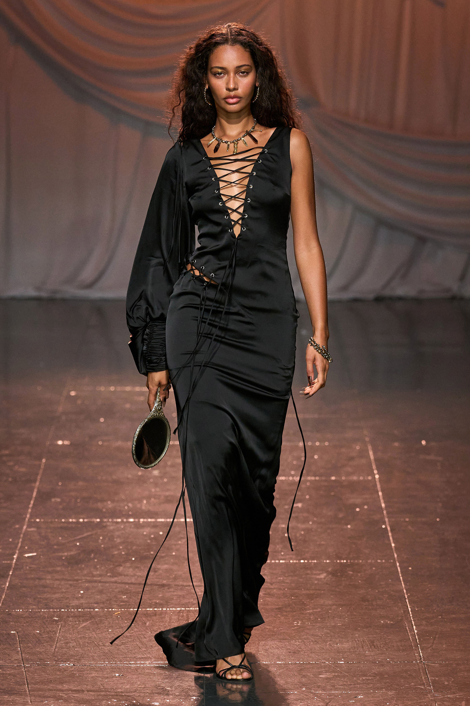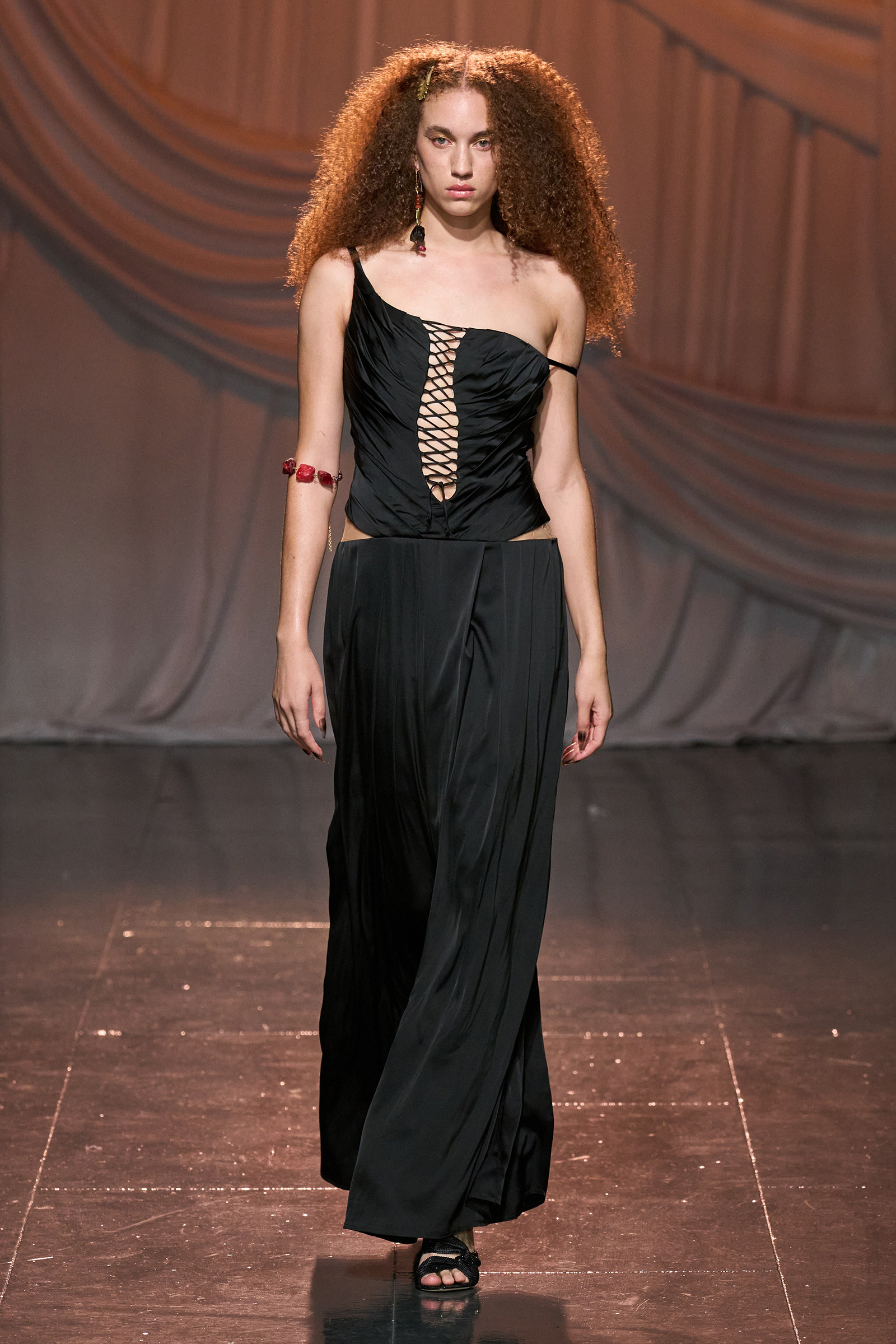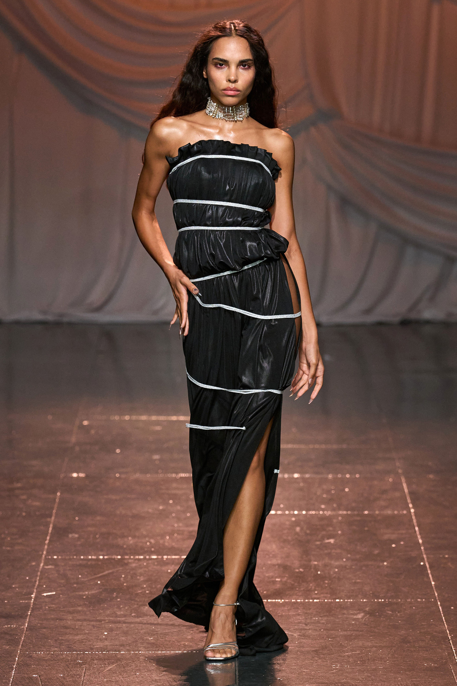 Petsa’s enduring wet-look dresses, a long-time and often-imitated signature, here took the form of two-piece sets with low-slung maxi skirts and off-the-shoulder gowns featuring extreme thigh-high slits. As a whole, Petsa is confidently finding her stride and expanding her repertoire without compromising her design language.