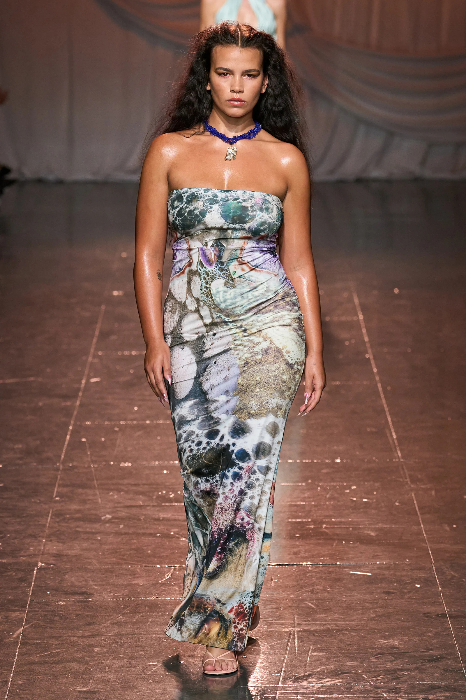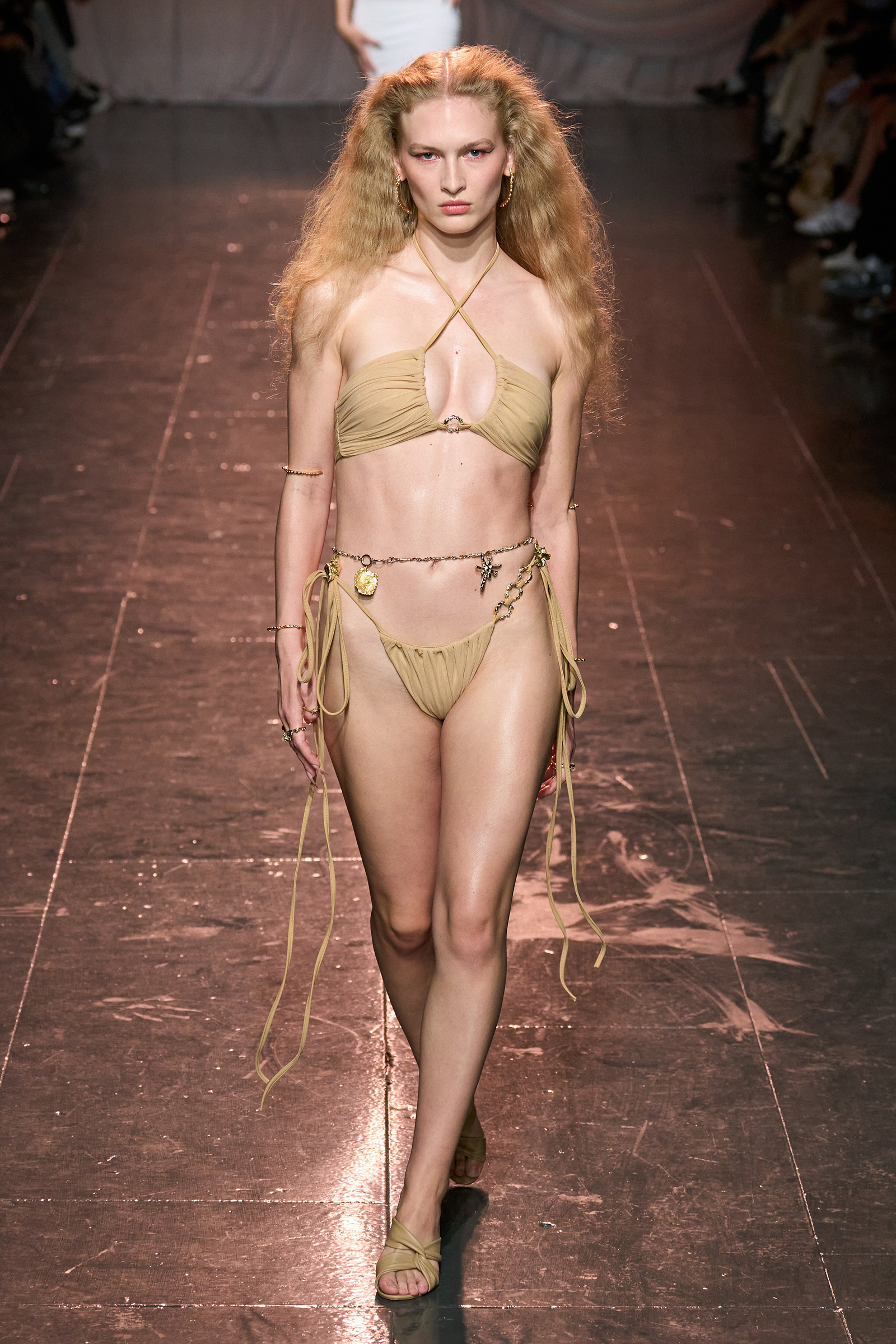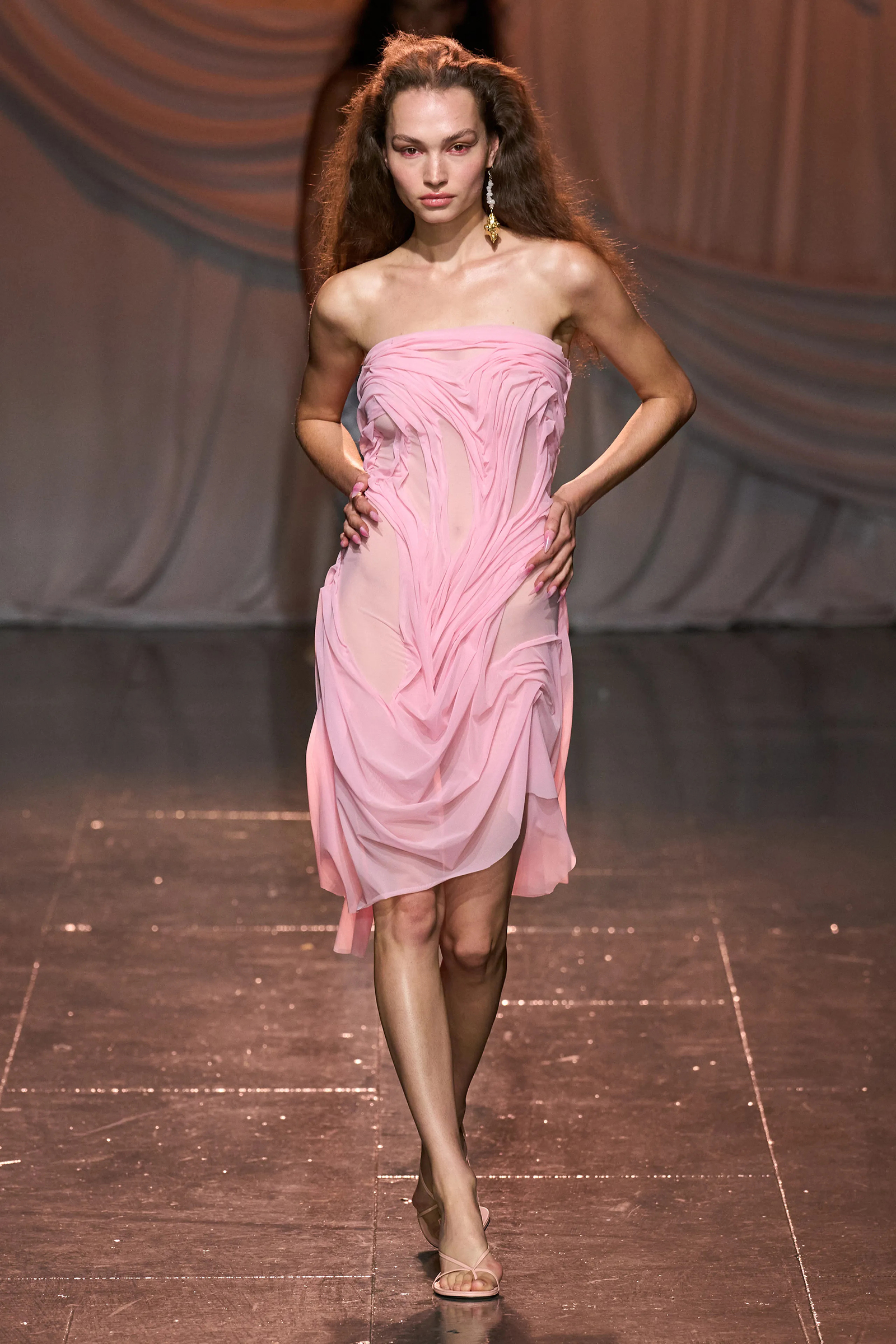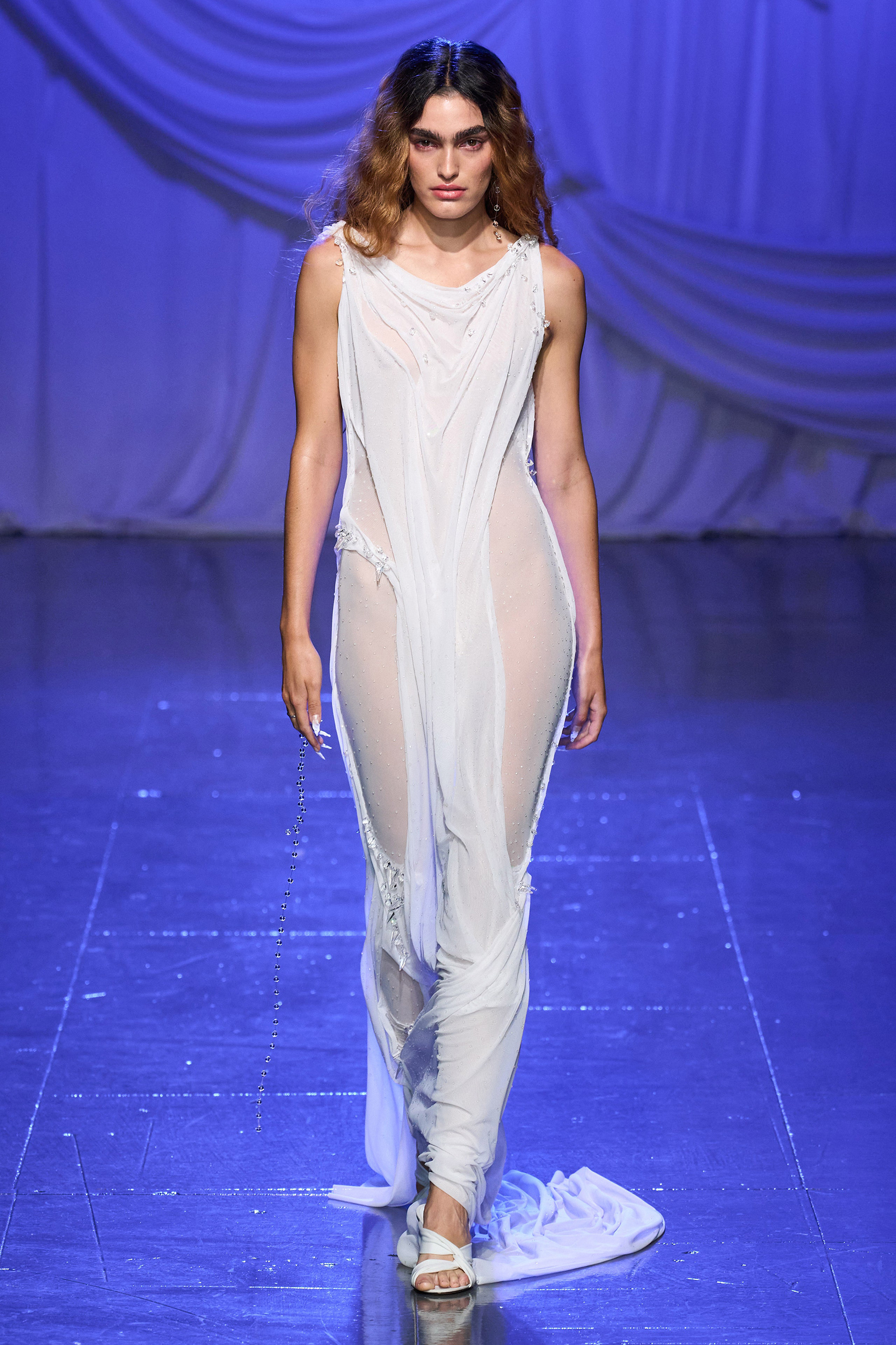 Petsa’s enduring wet-look dresses, a long-time and often-imitated signature, here took the form of two-piece sets with low-slung maxi skirts and off-the-shoulder gowns featuring extreme thigh-high slits. As a whole, Petsa is confidently finding her stride and expanding her repertoire without compromising her design language.
