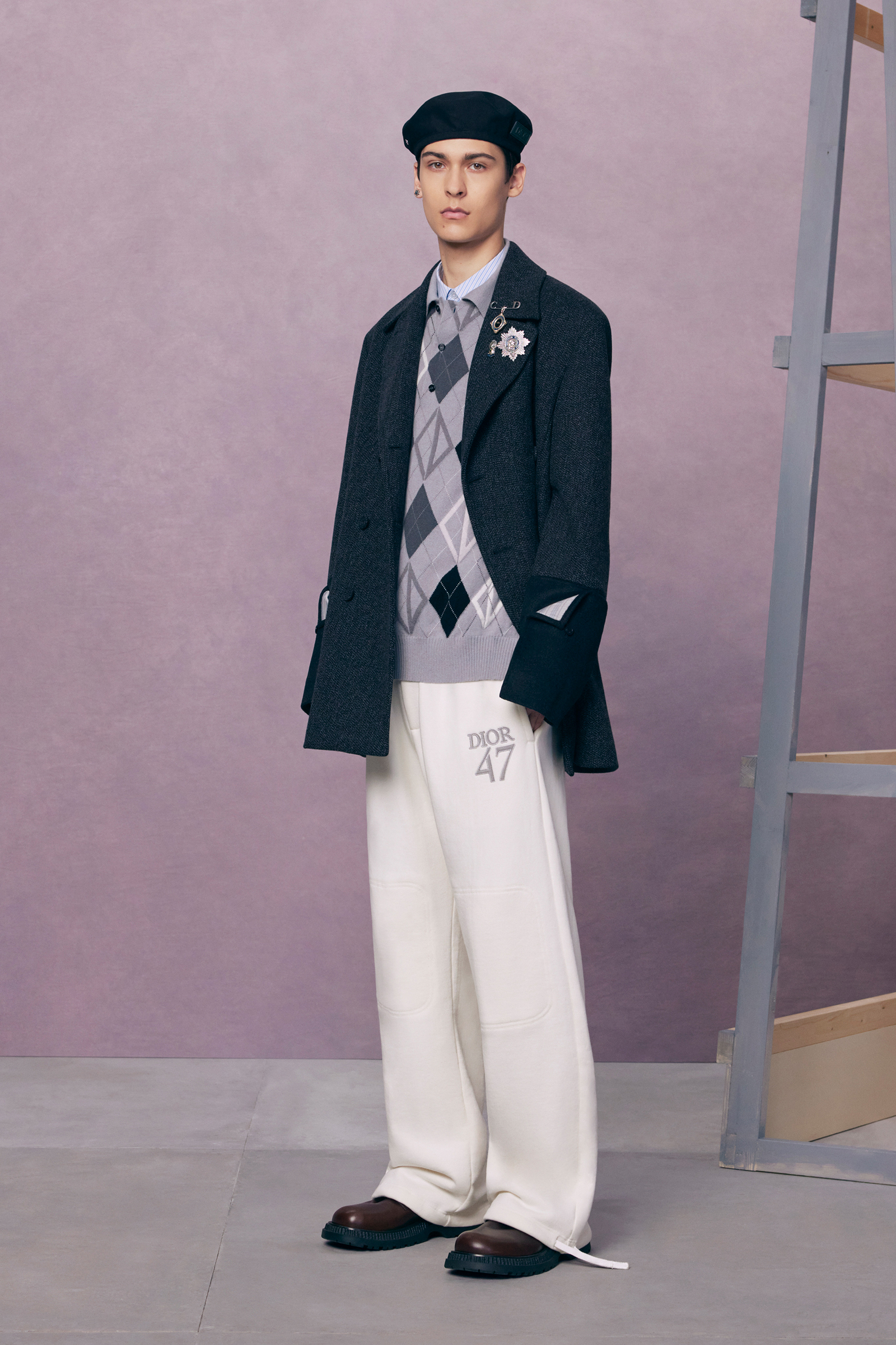 Come to the jeweled insignia, and the clever merge of British argyle sweater and Christian Dior lozenge-shaped logo, and you see Jones operating with his French couture house head on. He revived the logo from a 1960s design sourced in the Dior archives. The jewelry meanwhile—including CD safety-pinned medals pinned to jackets and a silver metal chain belt—is derived from the Grand Cross of the French Legion d’Honneur. It’s also something of an insider salute to the way Petri styled Camden antique brooches as pins on kilts and vintage coats in a seminal shoot by Marc Lebon for The Face in 1984.