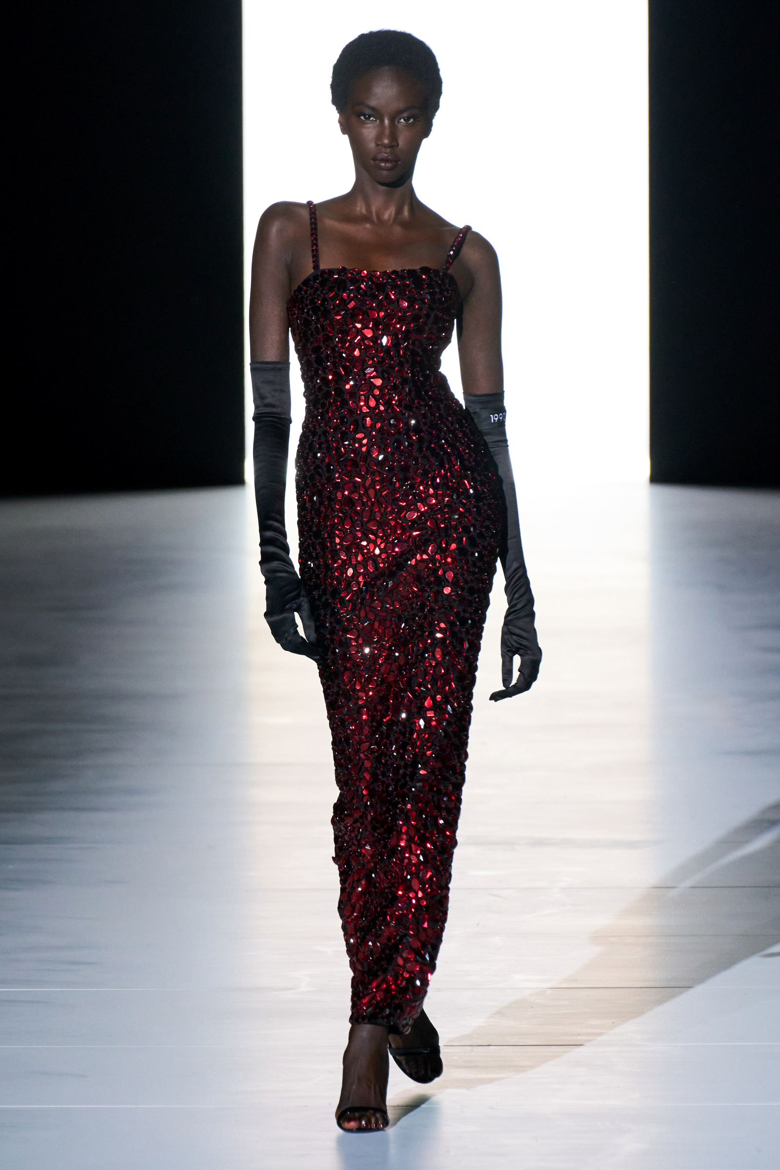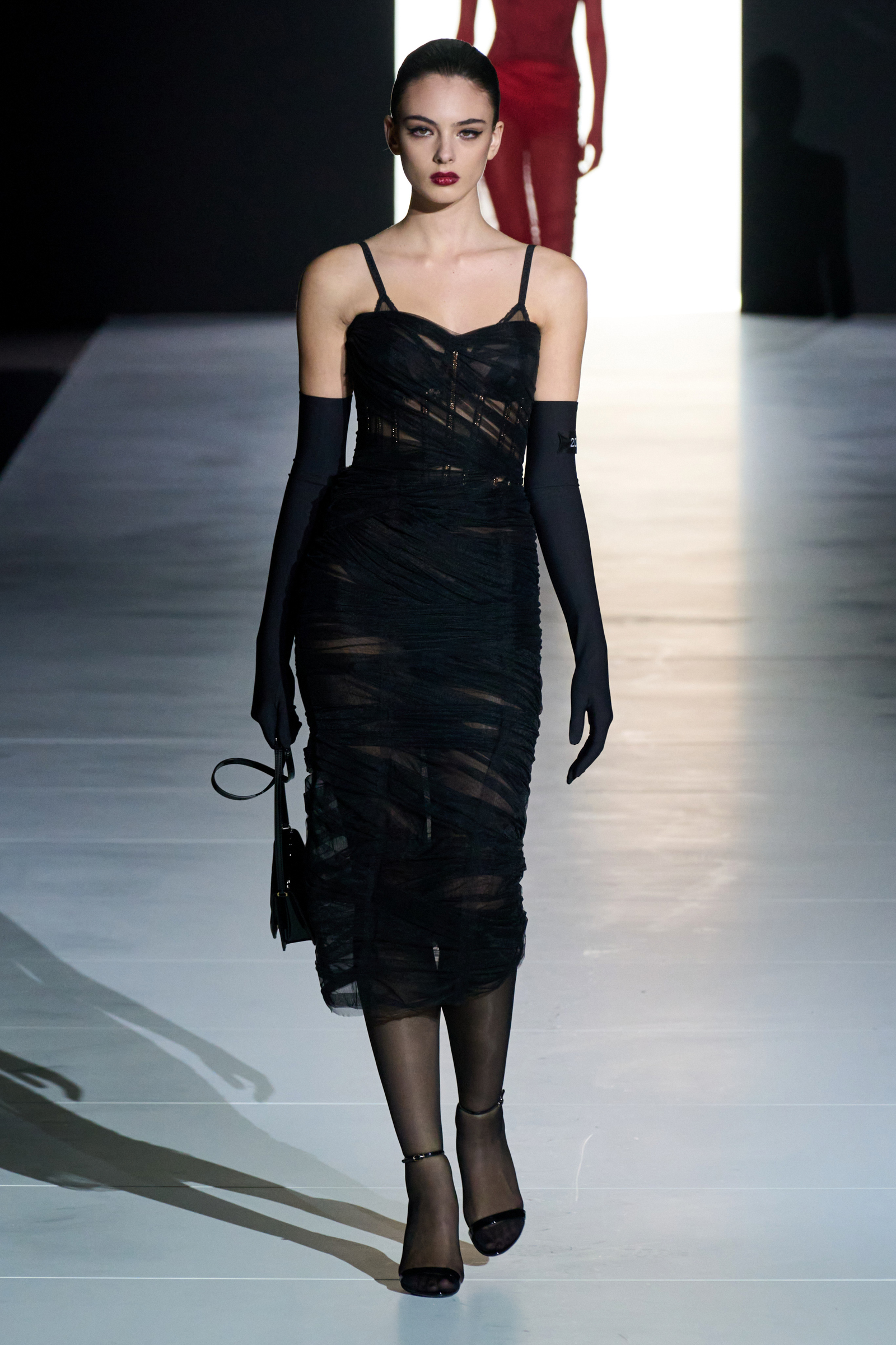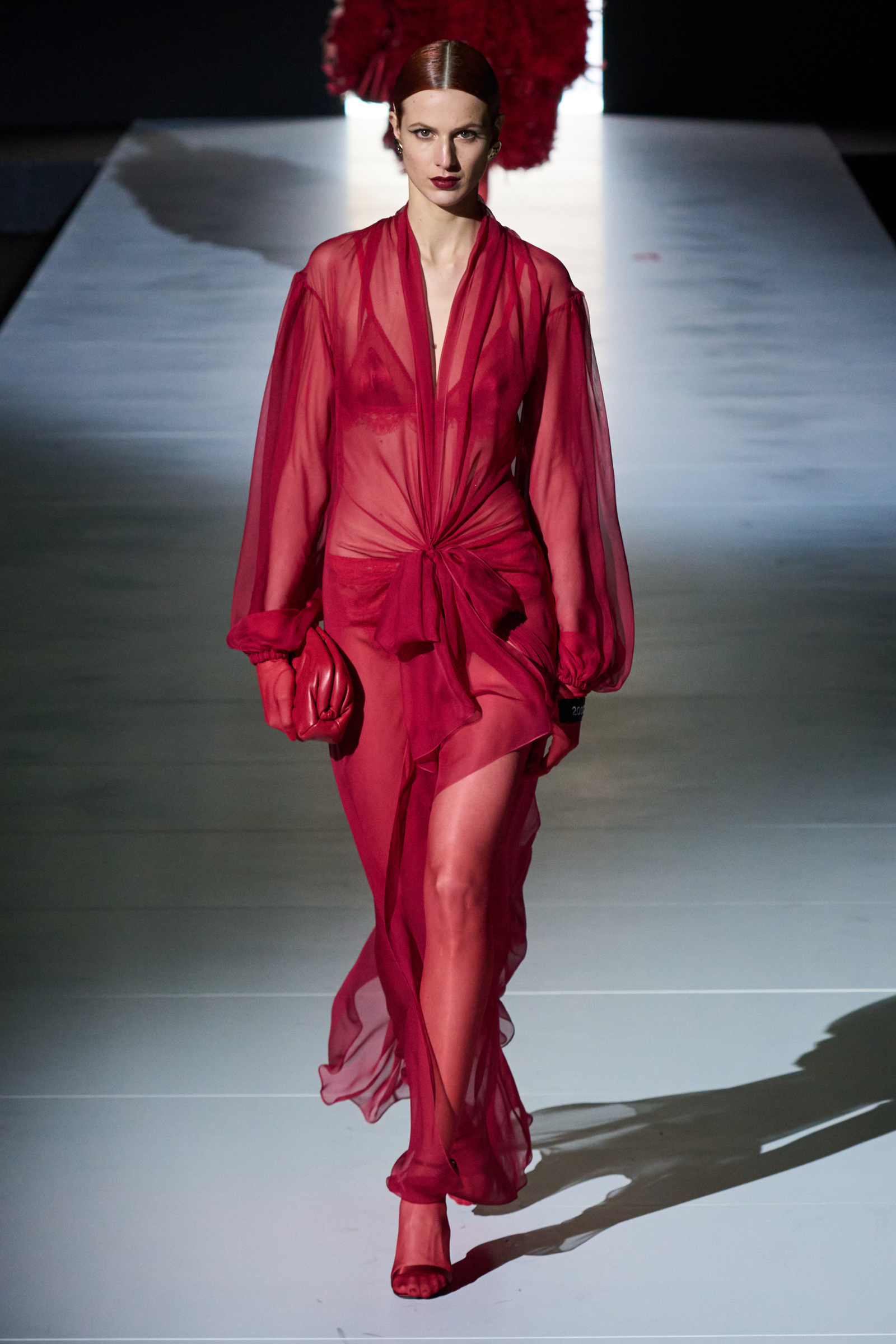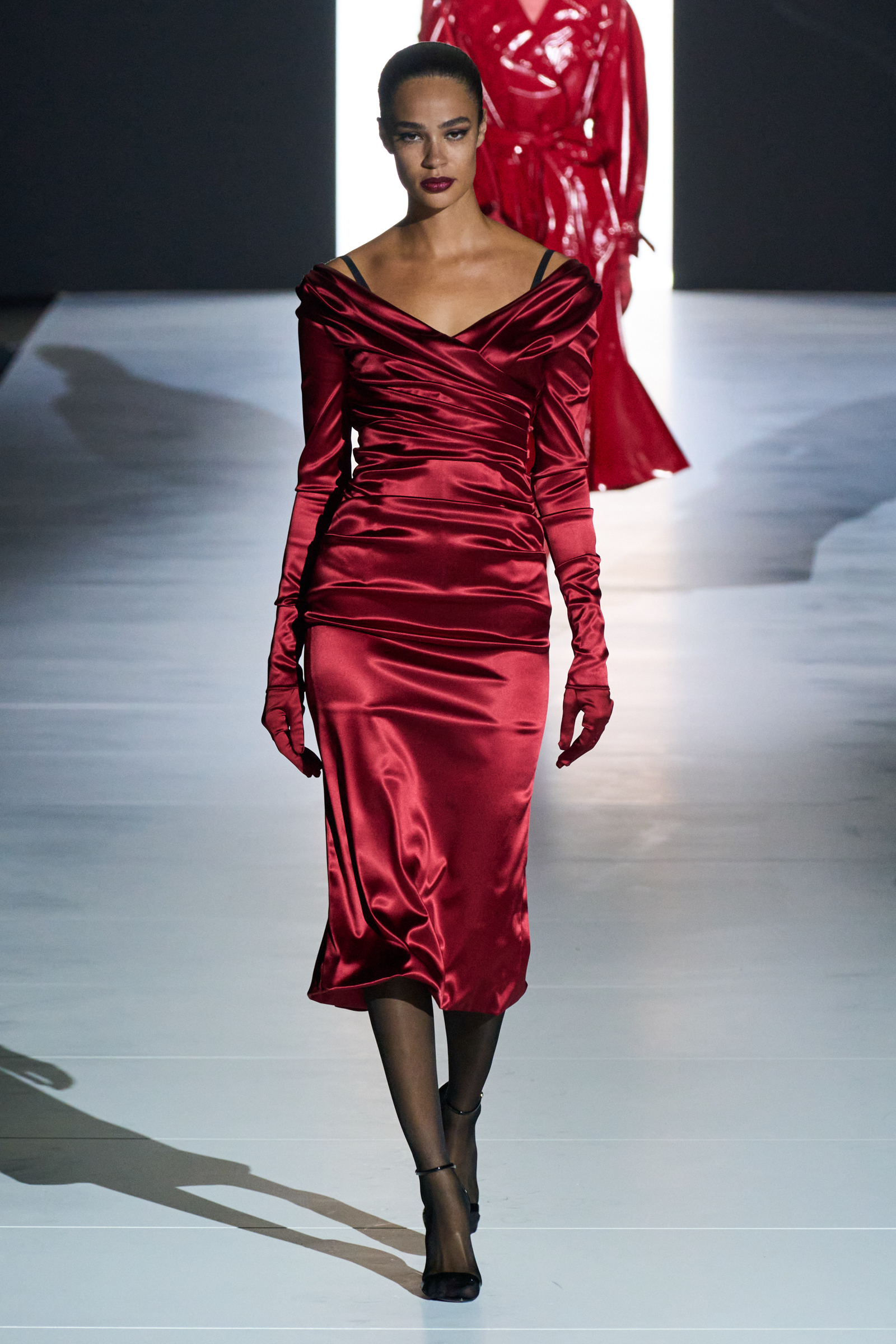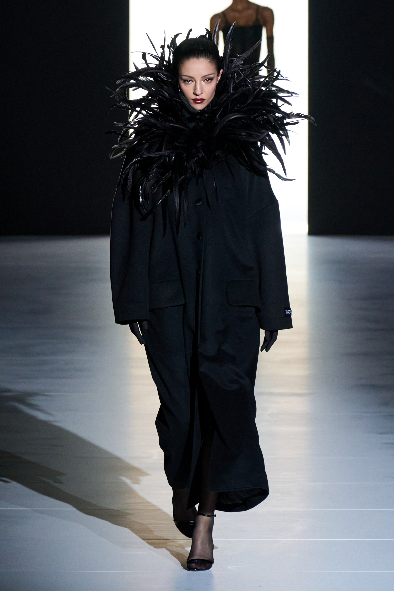 Where does their instinct toward classicism and the timeless come from? “This last year, when it was fashion, fashion, fashion, volume, volume, ’80s—it was exhausting,” Dolce said. “You know when you eat too much, and you need still water? We just want to work with the best quality silk, the best quality wool. No strange fabrics.” But that doesn’t mean they completely neglected the extras. One parka looked glossily gold-leafed and another was lined entirely in feathers. Anok Yai’s show-closing red crystal wiggle dress was a knockout.