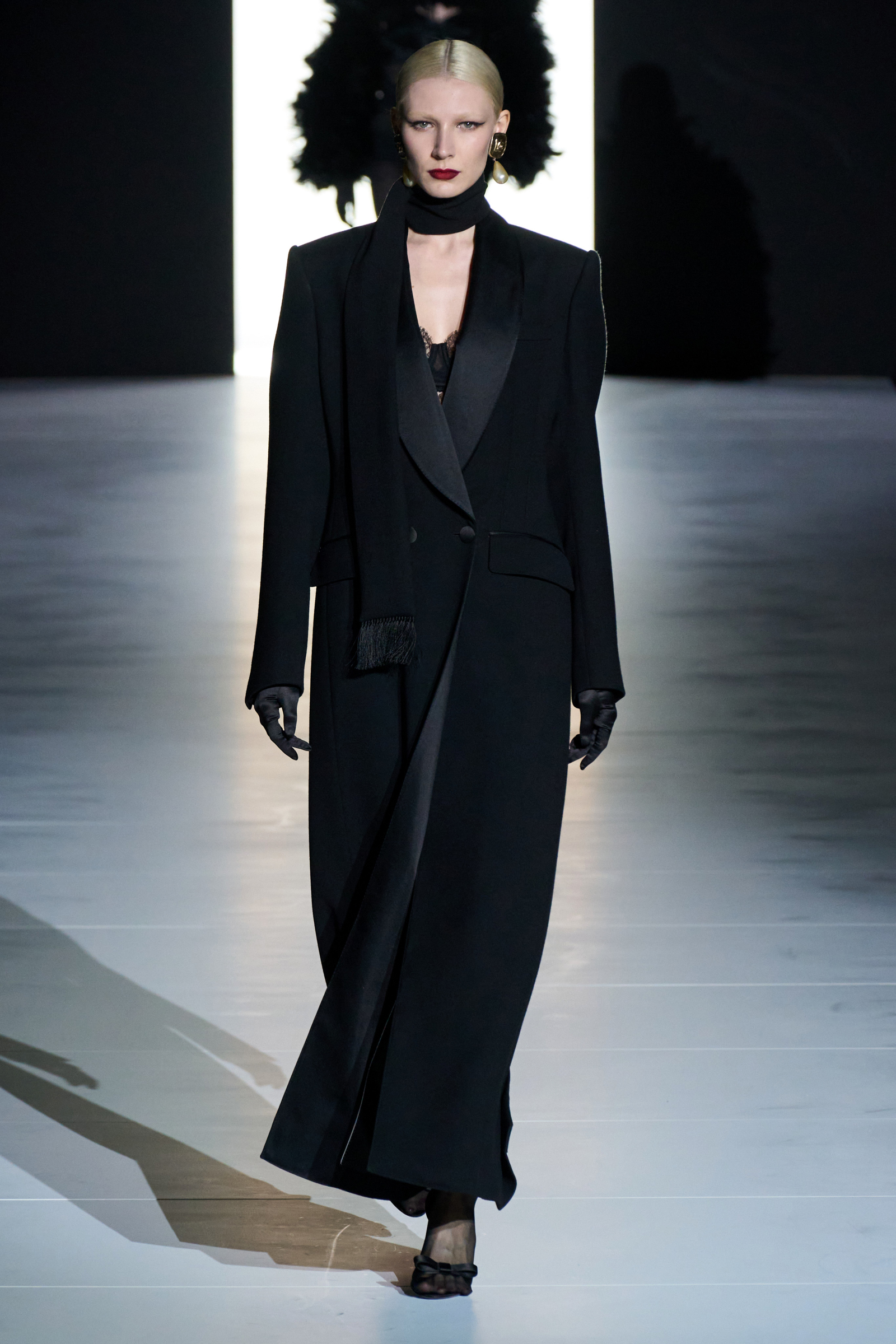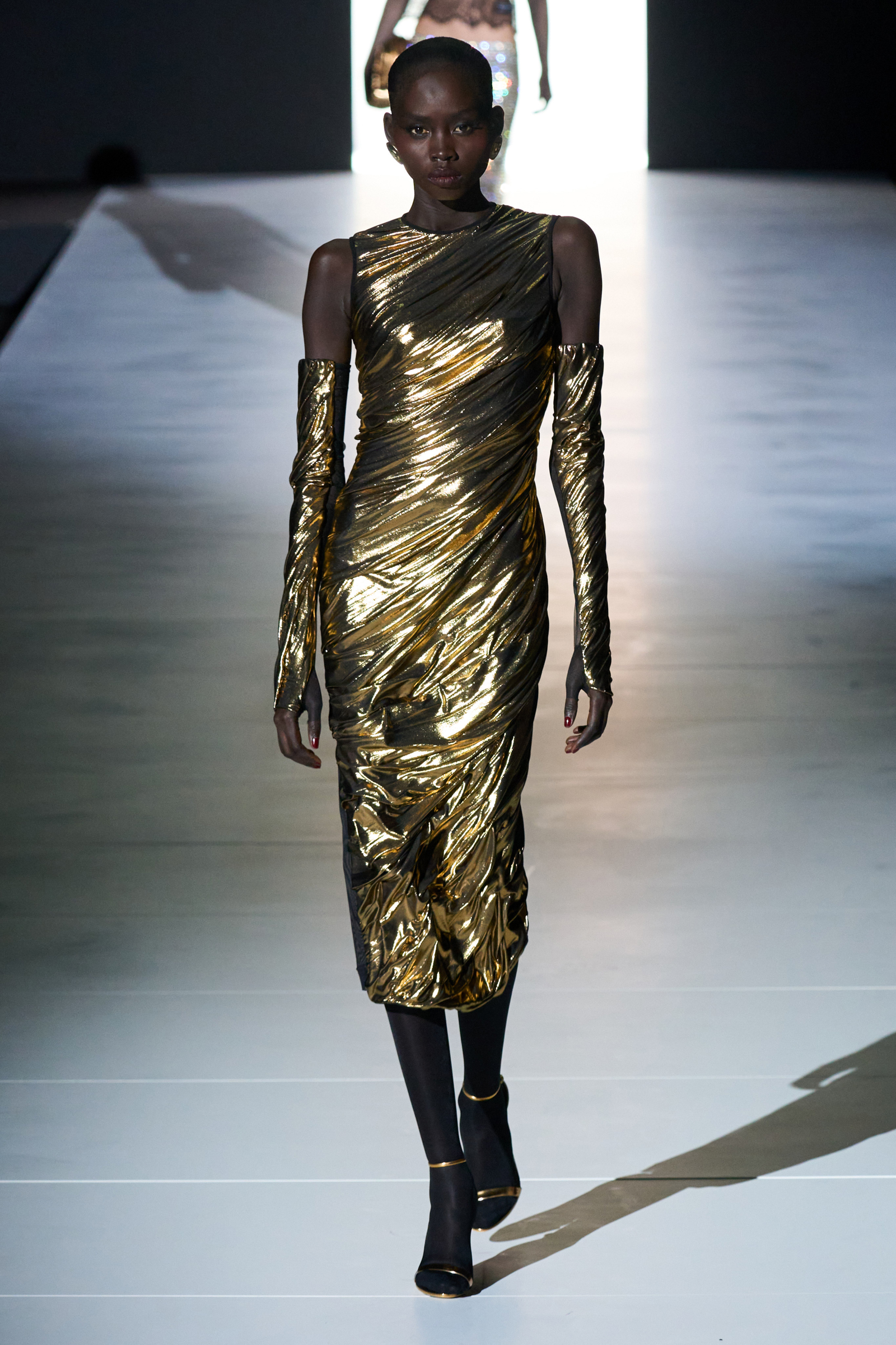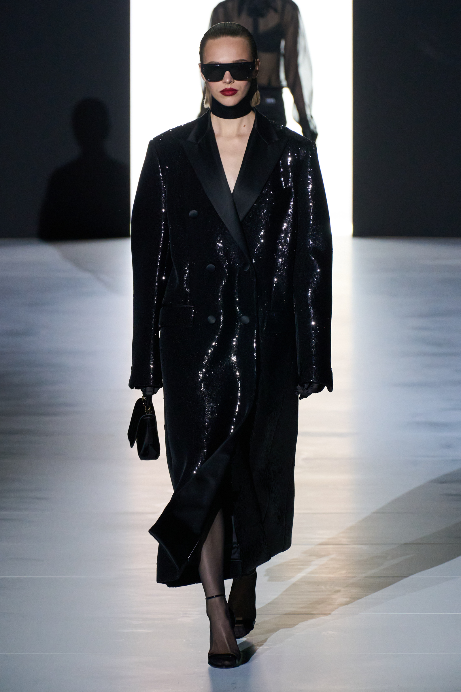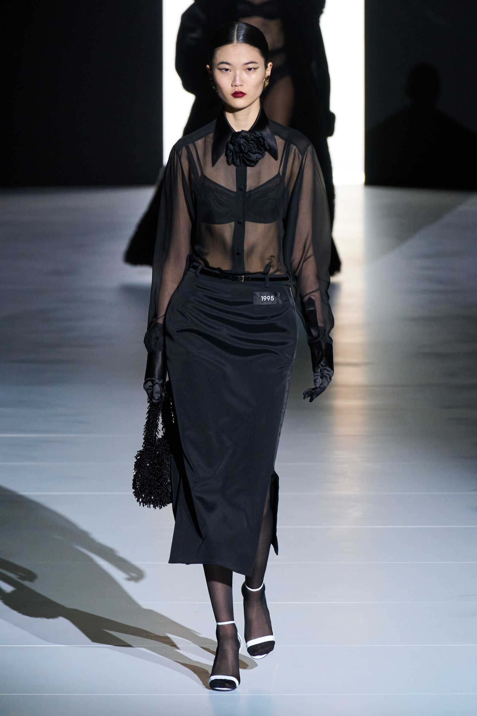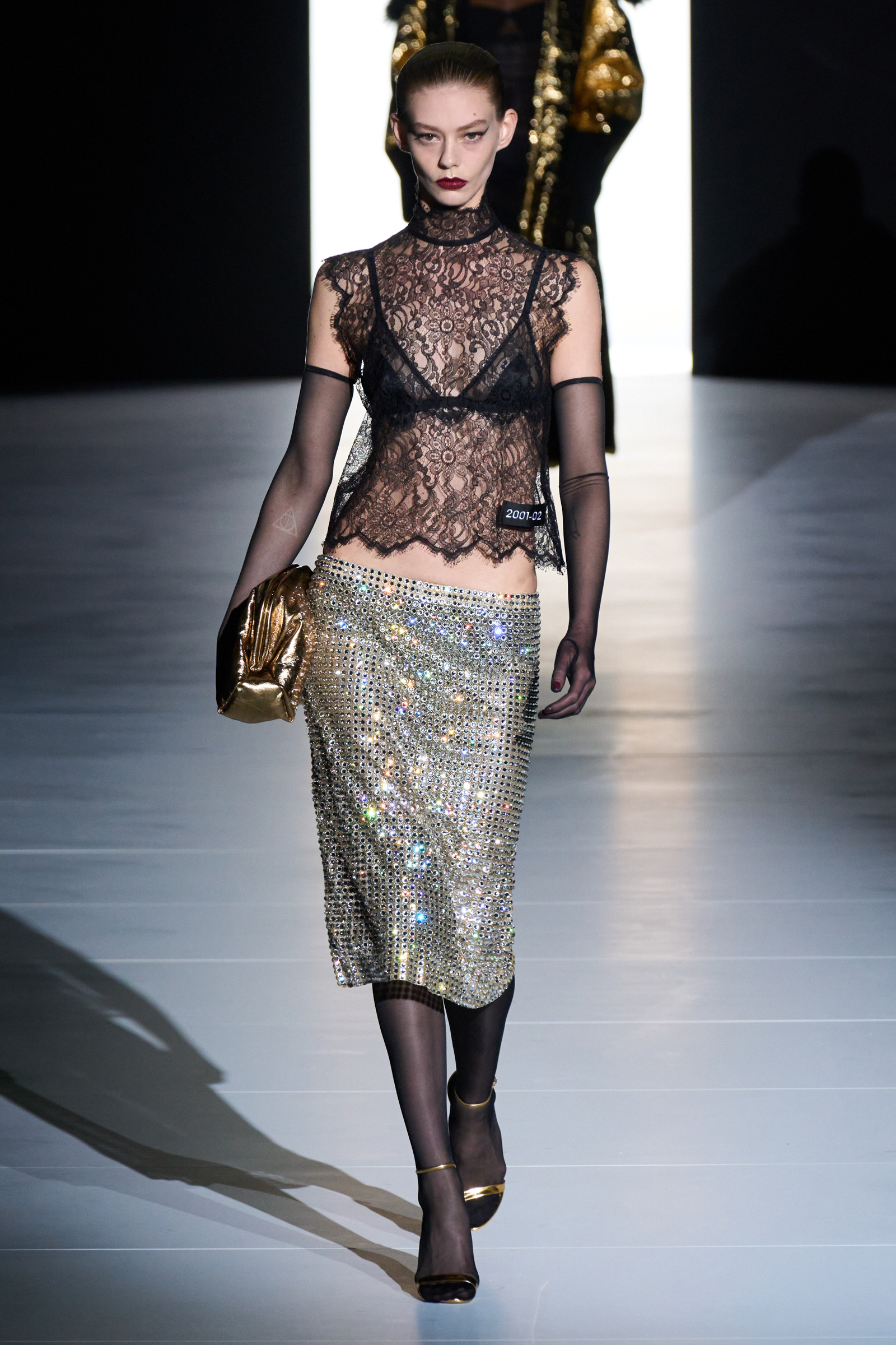 Where does their instinct toward classicism and the timeless come from? “This last year, when it was fashion, fashion, fashion, volume, volume, ’80s—it was exhausting,” Dolce said. “You know when you eat too much, and you need still water? We just want to work with the best quality silk, the best quality wool. No strange fabrics.” But that doesn’t mean they completely neglected the extras. One parka looked glossily gold-leafed and another was lined entirely in feathers. Anok Yai’s show-closing red crystal wiggle dress was a knockout.