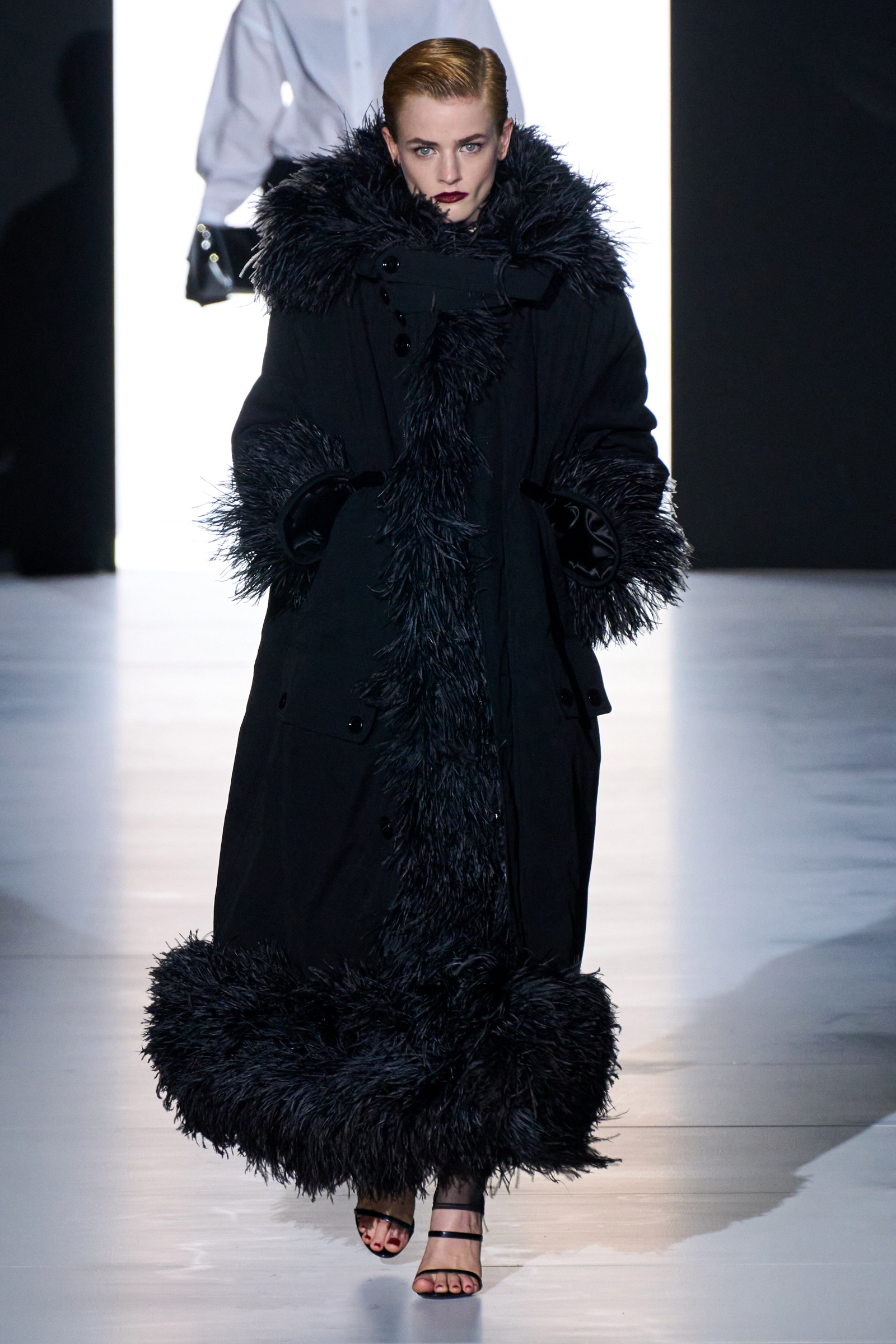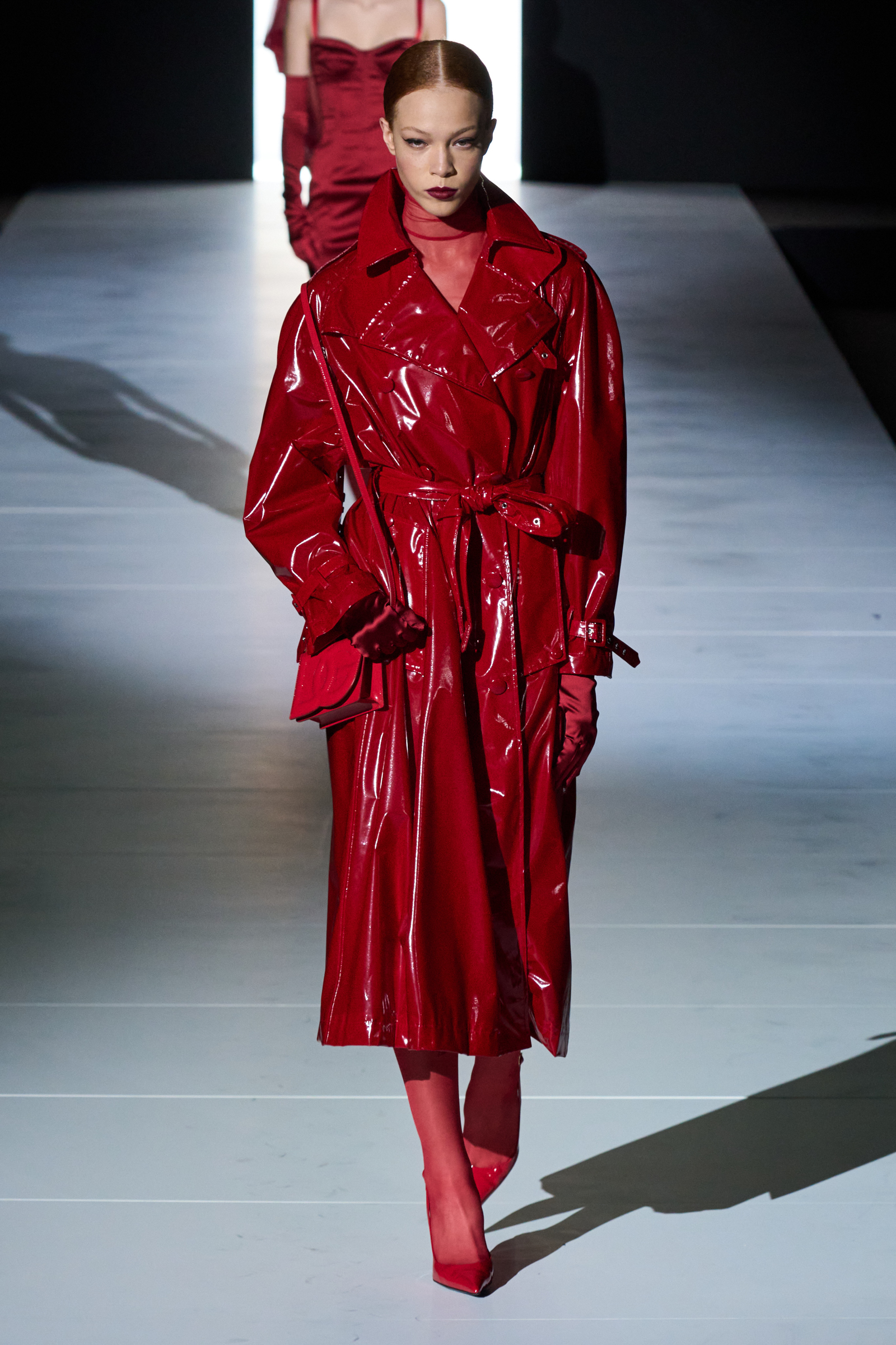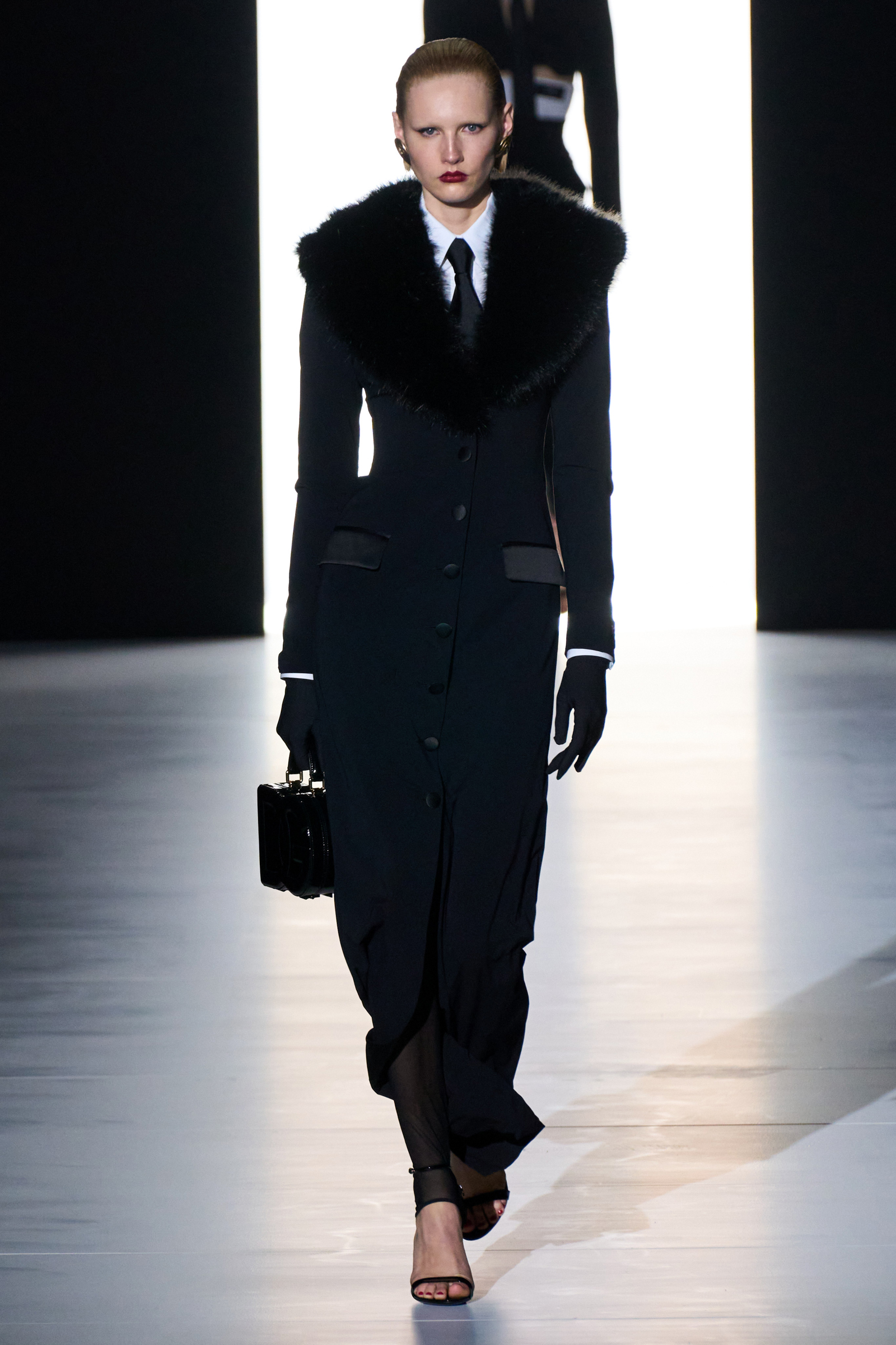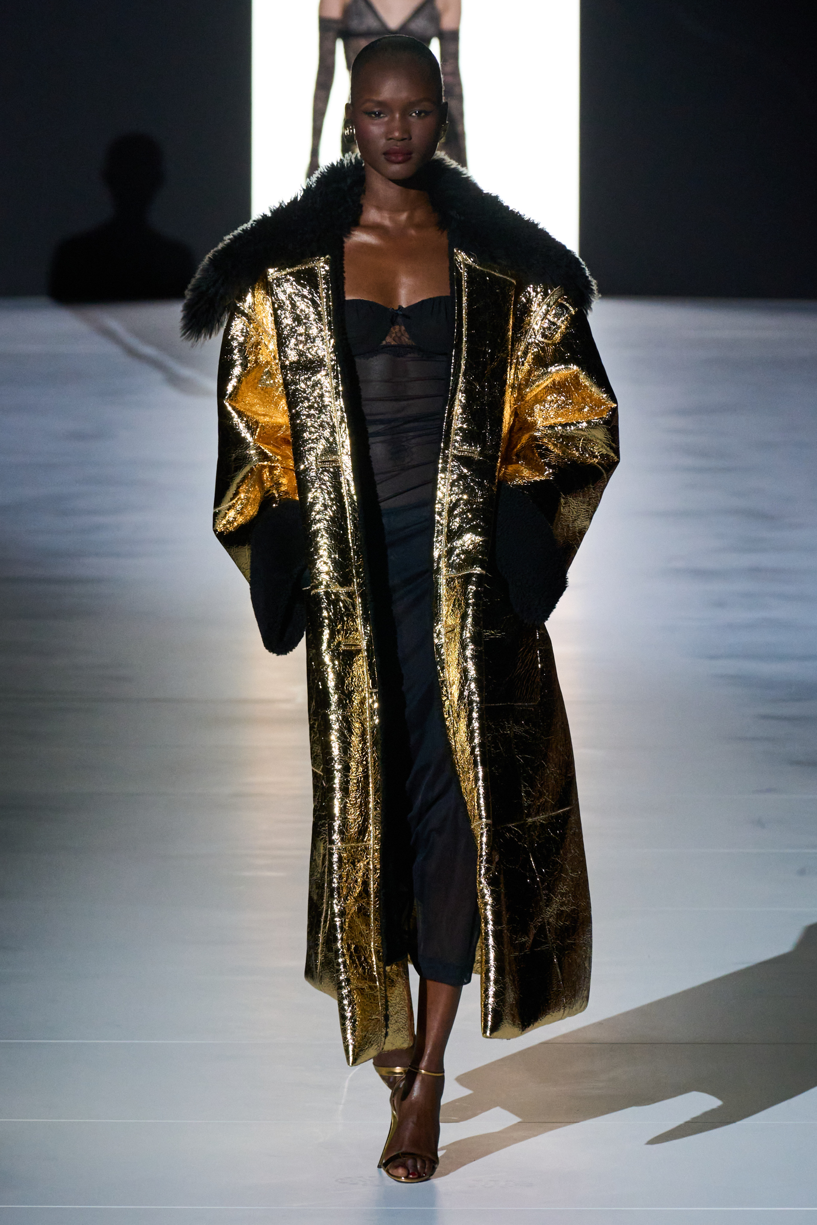 Where does their instinct toward classicism and the timeless come from? “This last year, when it was fashion, fashion, fashion, volume, volume, ’80s—it was exhausting,” Dolce said. “You know when you eat too much, and you need still water? We just want to work with the best quality silk, the best quality wool. No strange fabrics.” But that doesn’t mean they completely neglected the extras. One parka looked glossily gold-leafed and another was lined entirely in feathers. Anok Yai’s show-closing red crystal wiggle dress was a knockout.