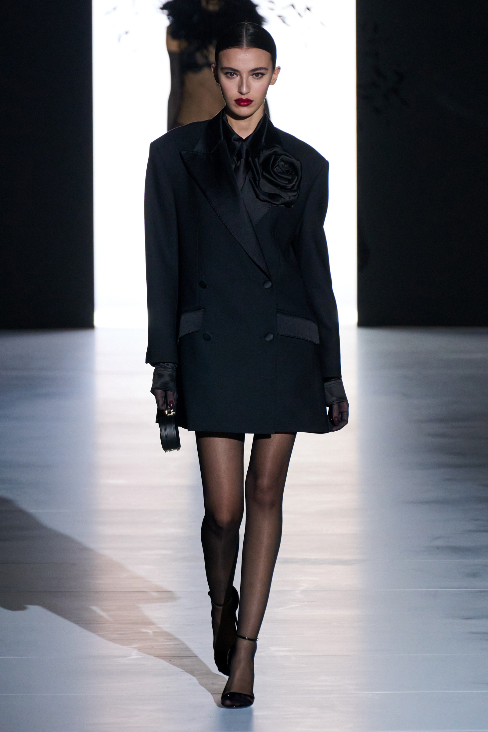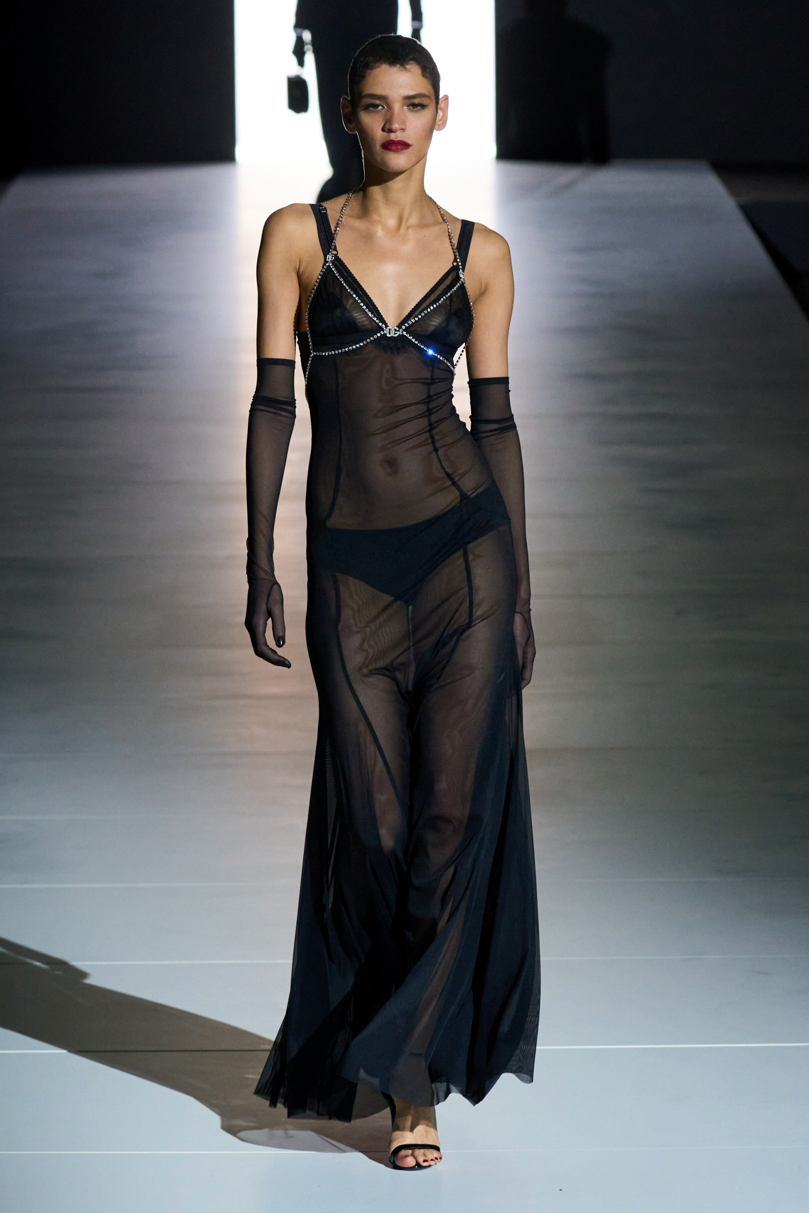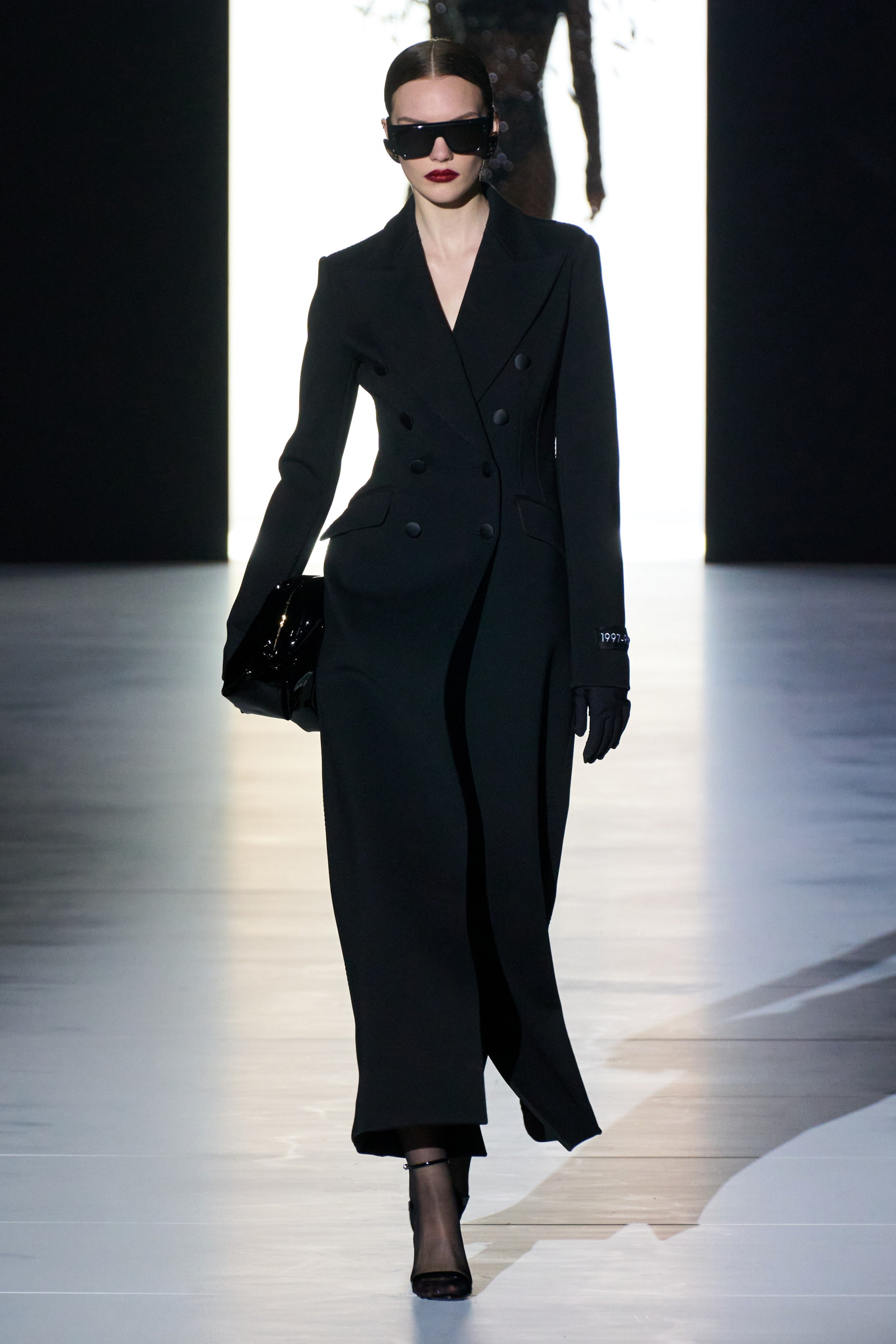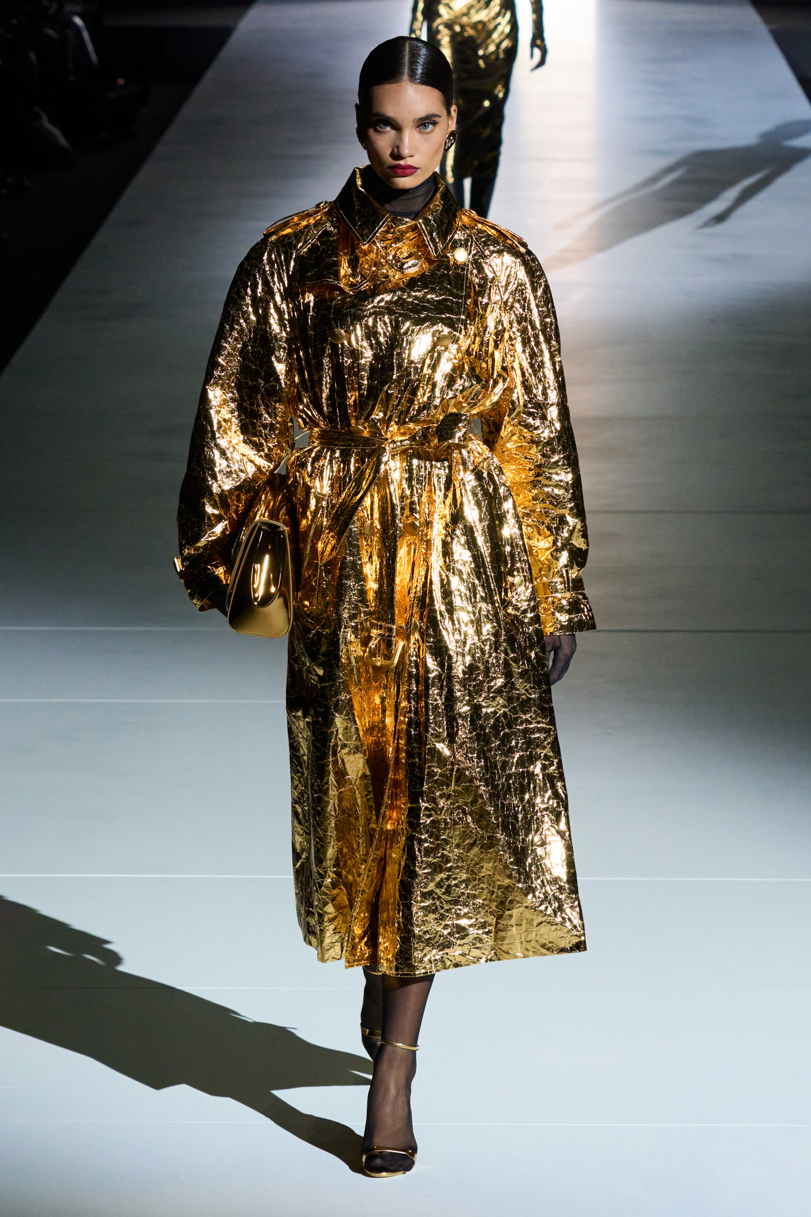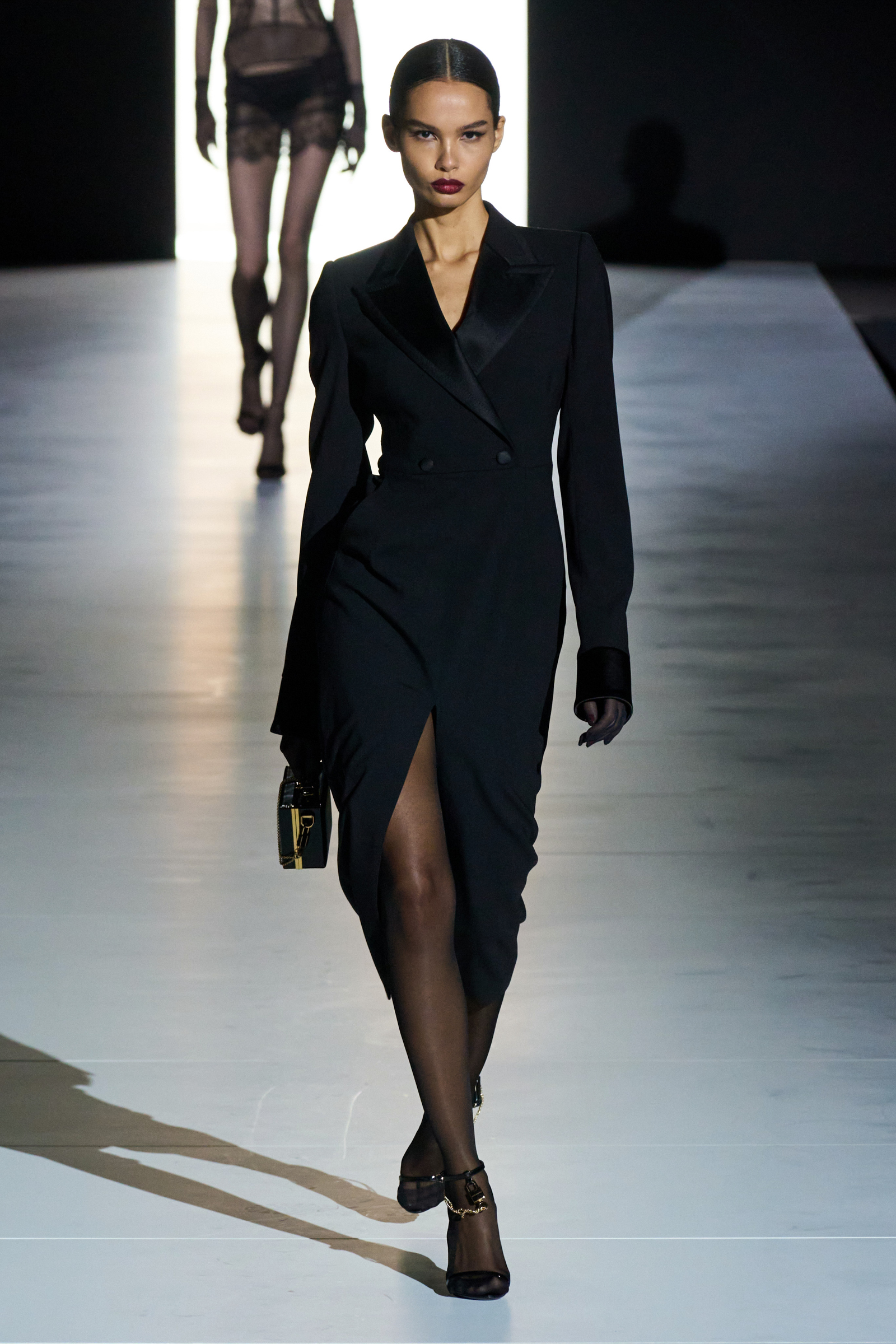 Where does their instinct toward classicism and the timeless come from? “This last year, when it was fashion, fashion, fashion, volume, volume, ’80s—it was exhausting,” Dolce said. “You know when you eat too much, and you need still water? We just want to work with the best quality silk, the best quality wool. No strange fabrics.” But that doesn’t mean they completely neglected the extras. One parka looked glossily gold-leafed and another was lined entirely in feathers. Anok Yai’s show-closing red crystal wiggle dress was a knockout.