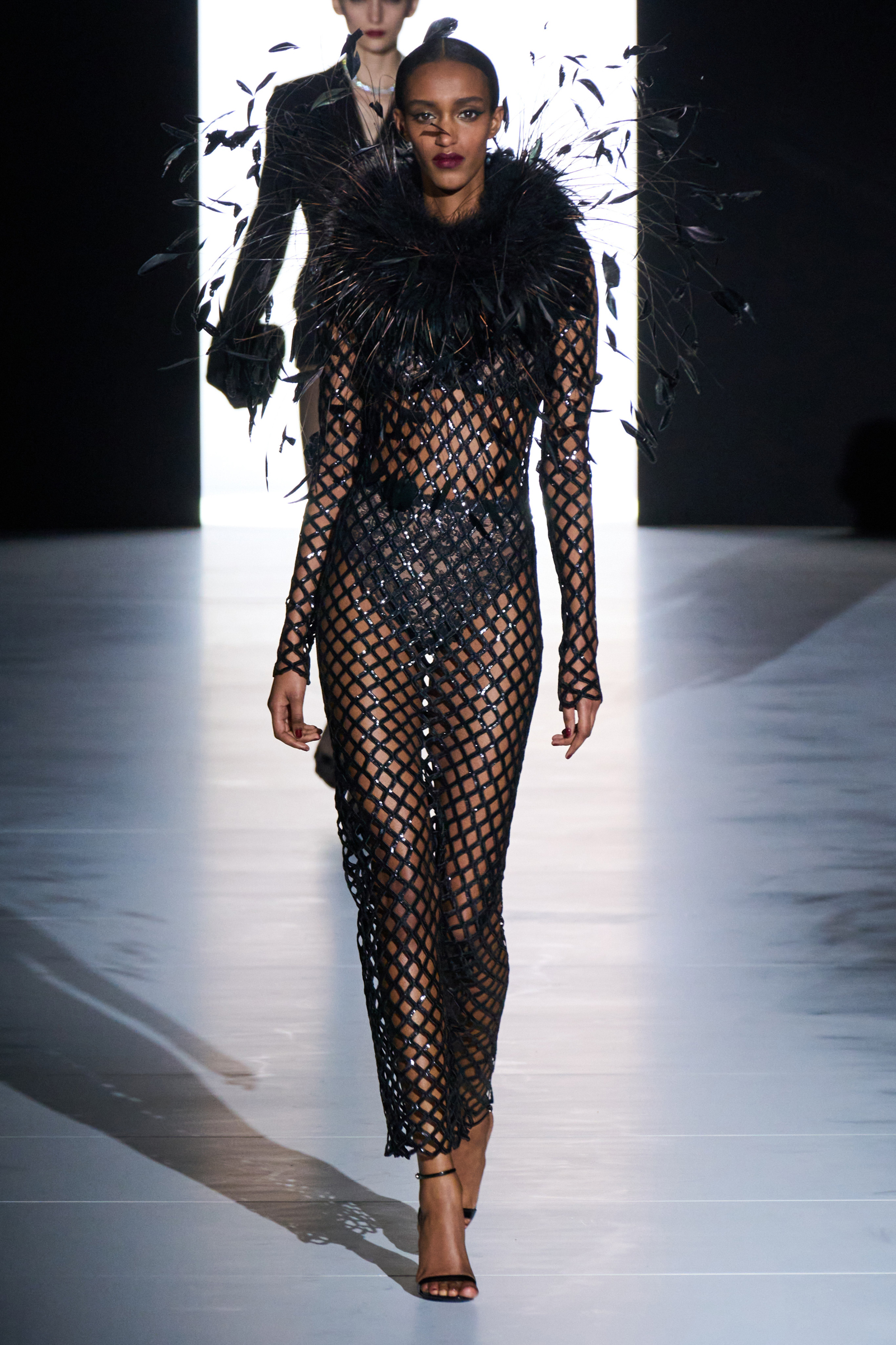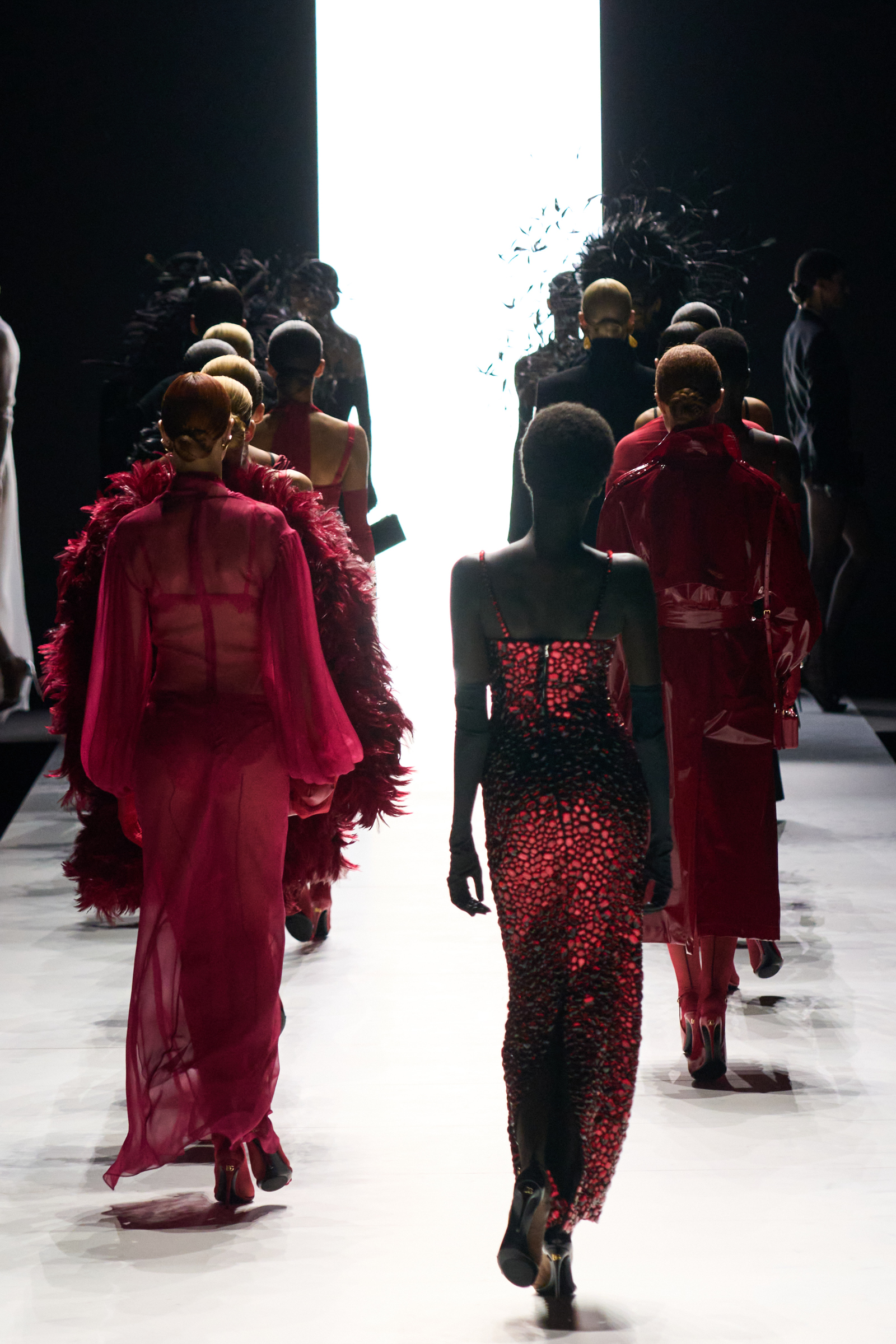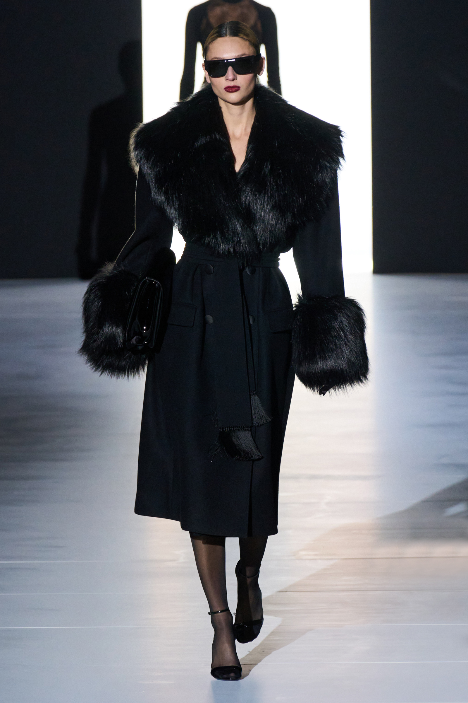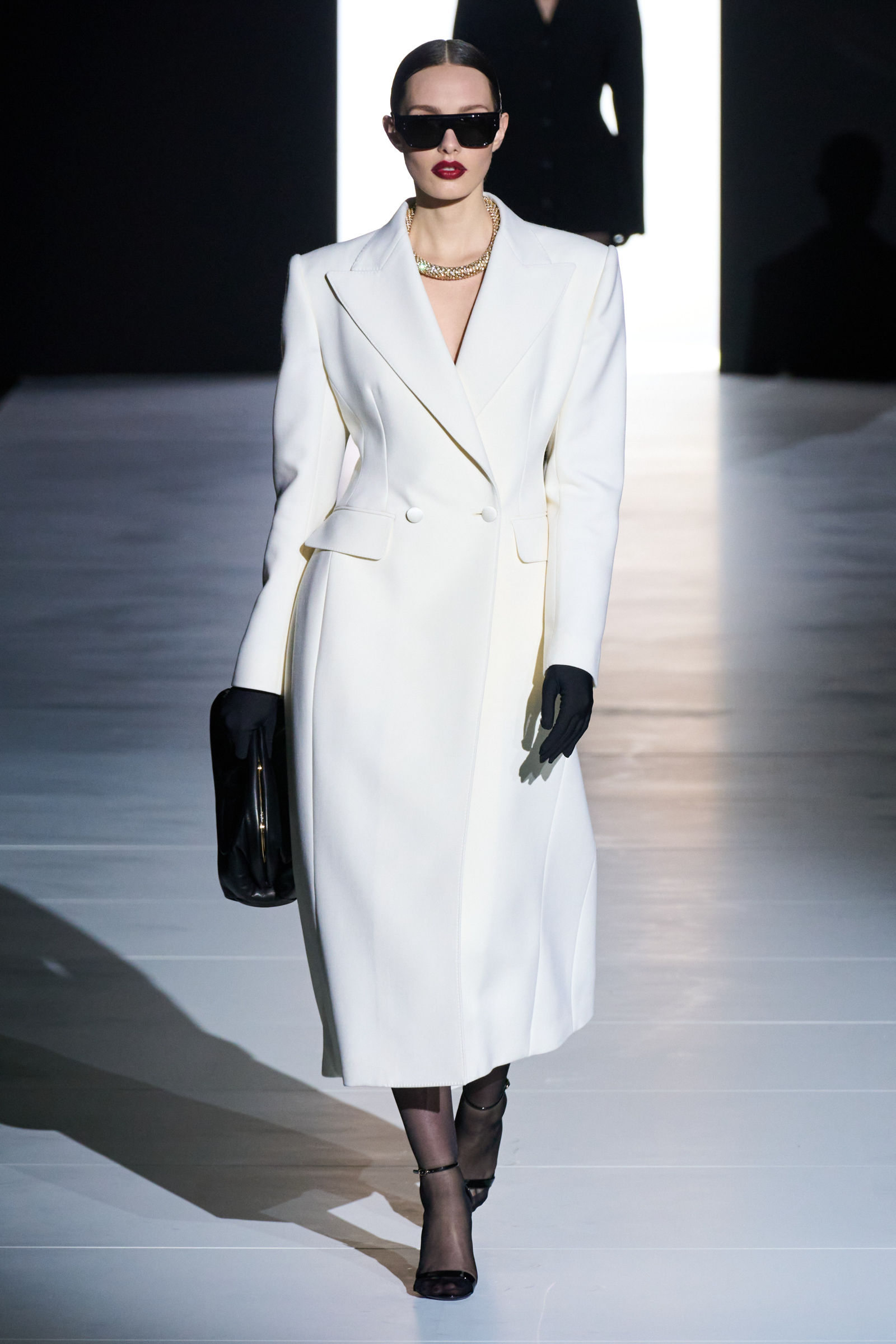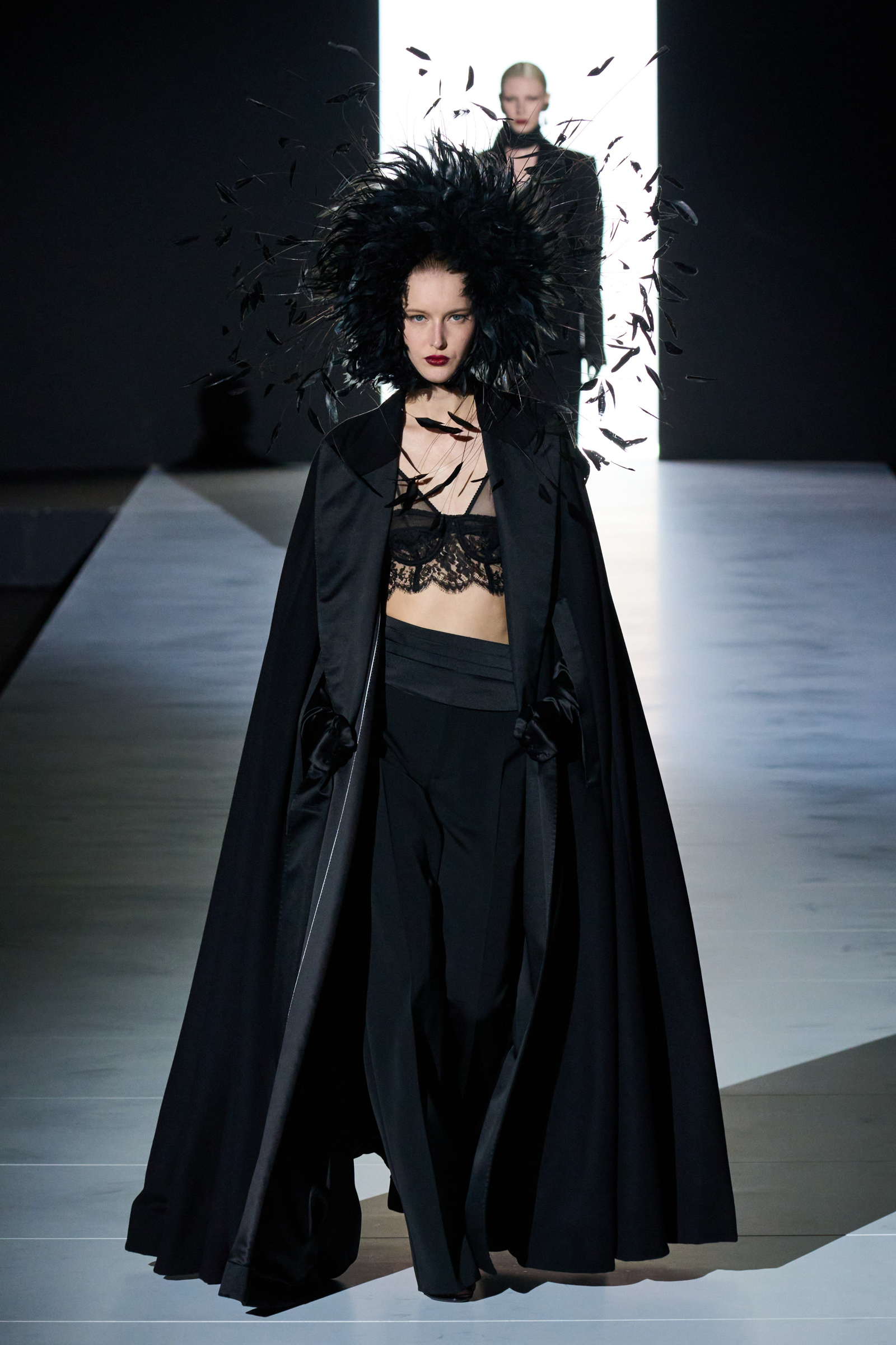 Where does their instinct toward classicism and the timeless come from? “This last year, when it was fashion, fashion, fashion, volume, volume, ’80s—it was exhausting,” Dolce said. “You know when you eat too much, and you need still water? We just want to work with the best quality silk, the best quality wool. No strange fabrics.” But that doesn’t mean they completely neglected the extras. One parka looked glossily gold-leafed and another was lined entirely in feathers. Anok Yai’s show-closing red crystal wiggle dress was a knockout.