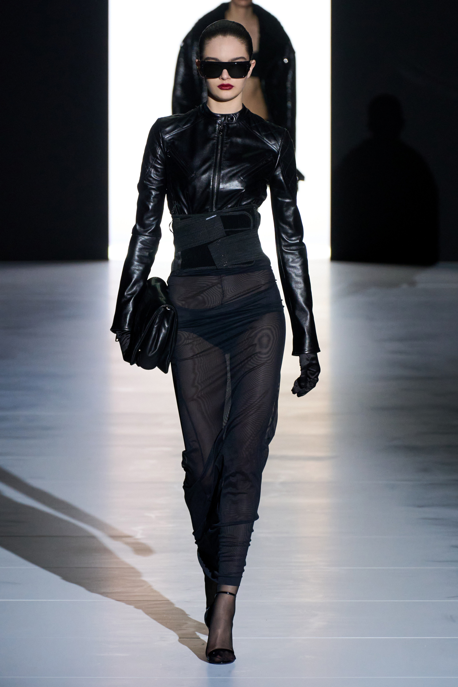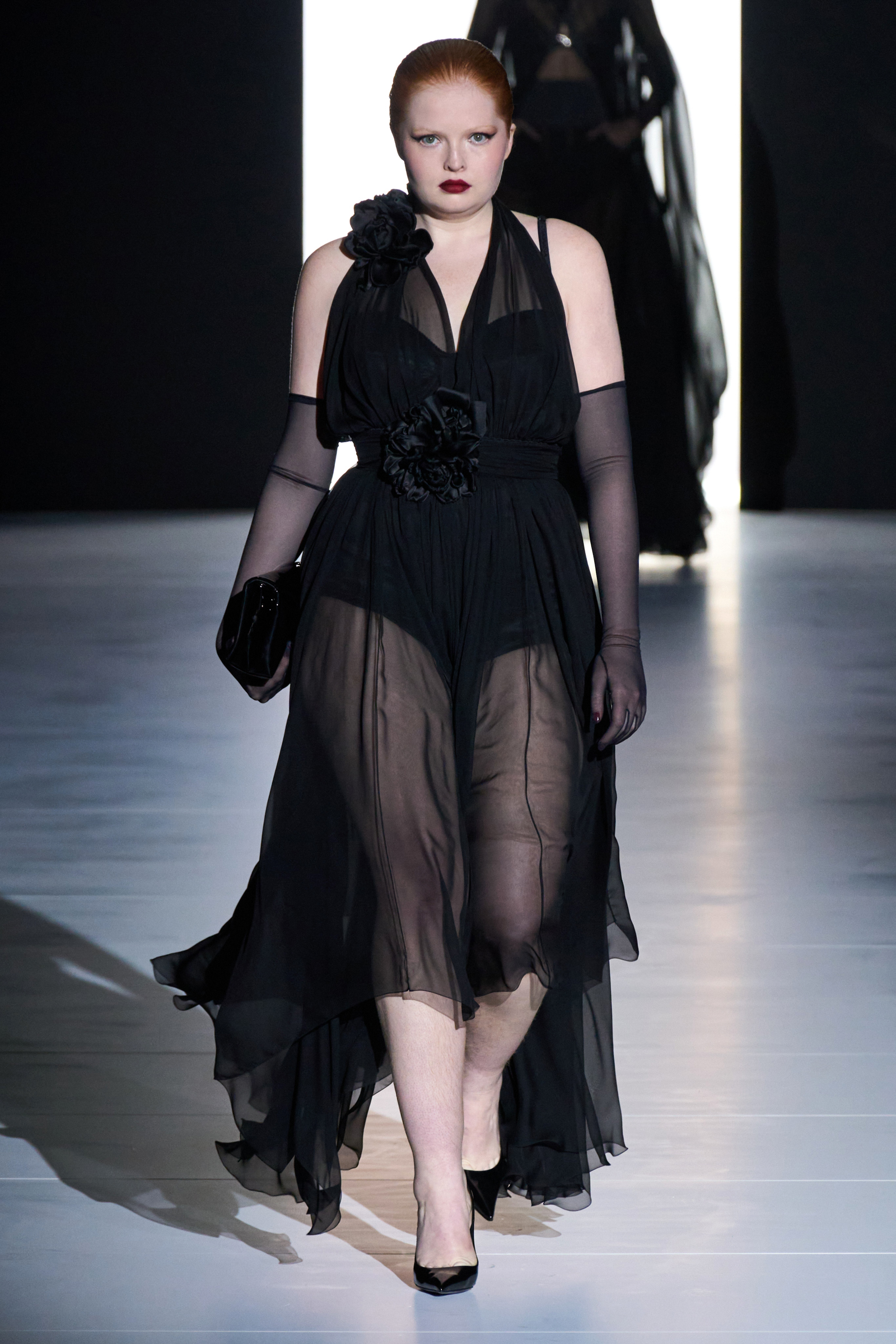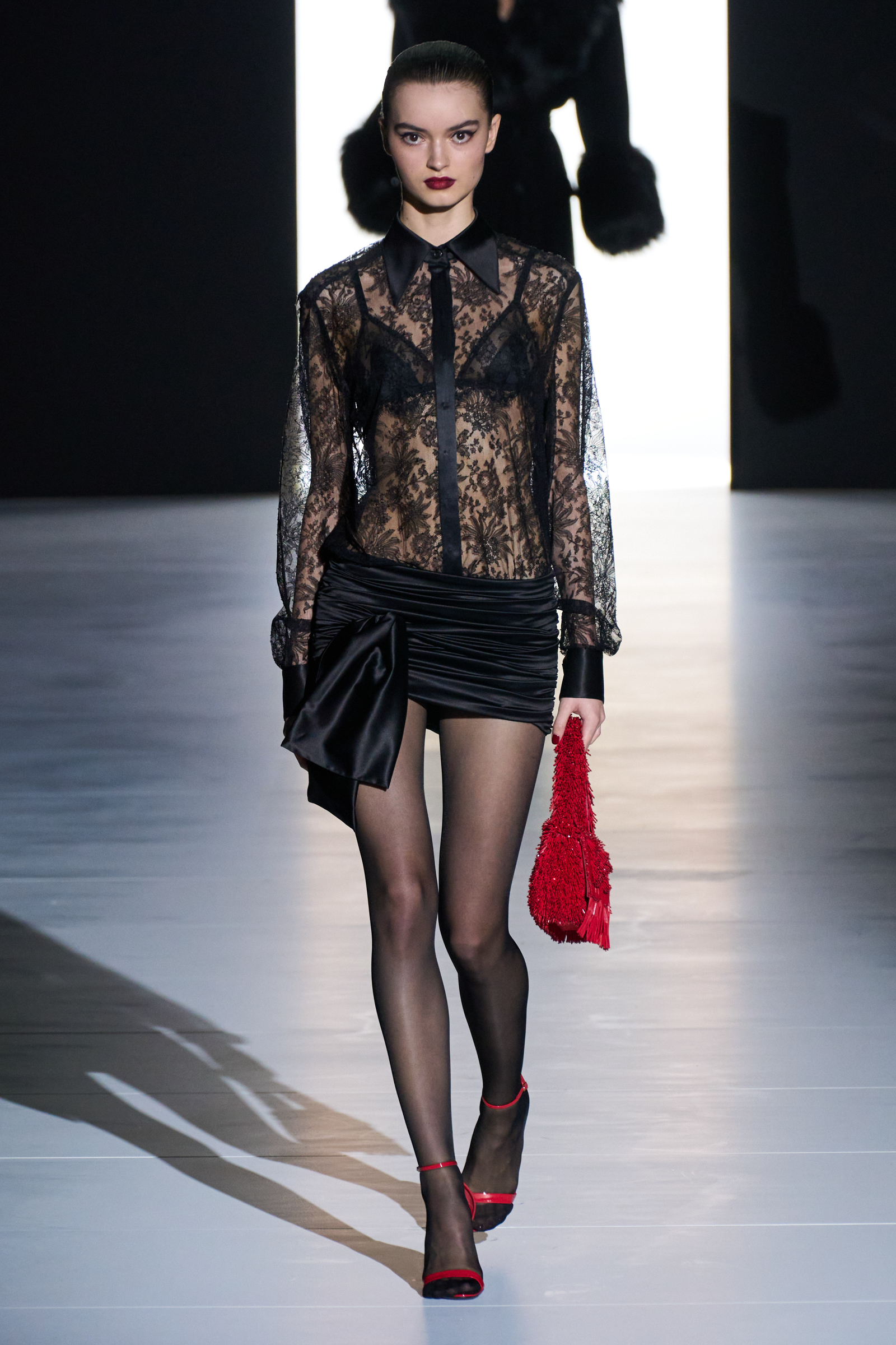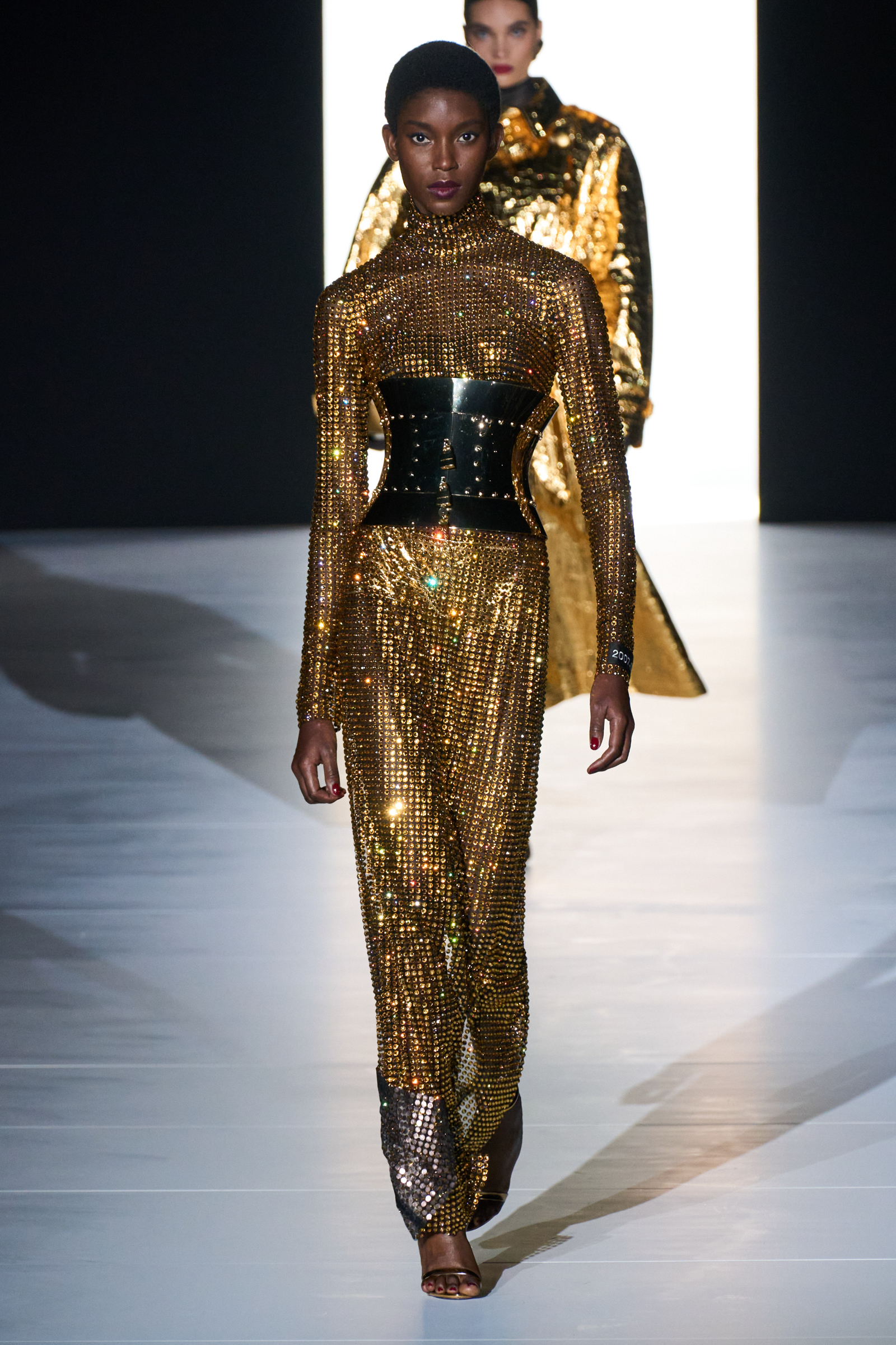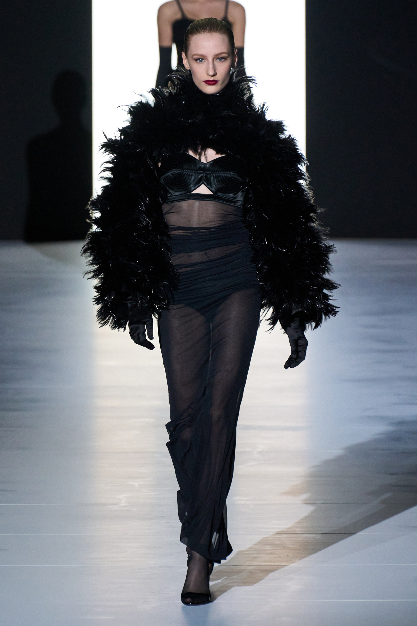 Where does their instinct toward classicism and the timeless come from? “This last year, when it was fashion, fashion, fashion, volume, volume, ’80s—it was exhausting,” Dolce said. “You know when you eat too much, and you need still water? We just want to work with the best quality silk, the best quality wool. No strange fabrics.” But that doesn’t mean they completely neglected the extras. One parka looked glossily gold-leafed and another was lined entirely in feathers. Anok Yai’s show-closing red crystal wiggle dress was a knockout.