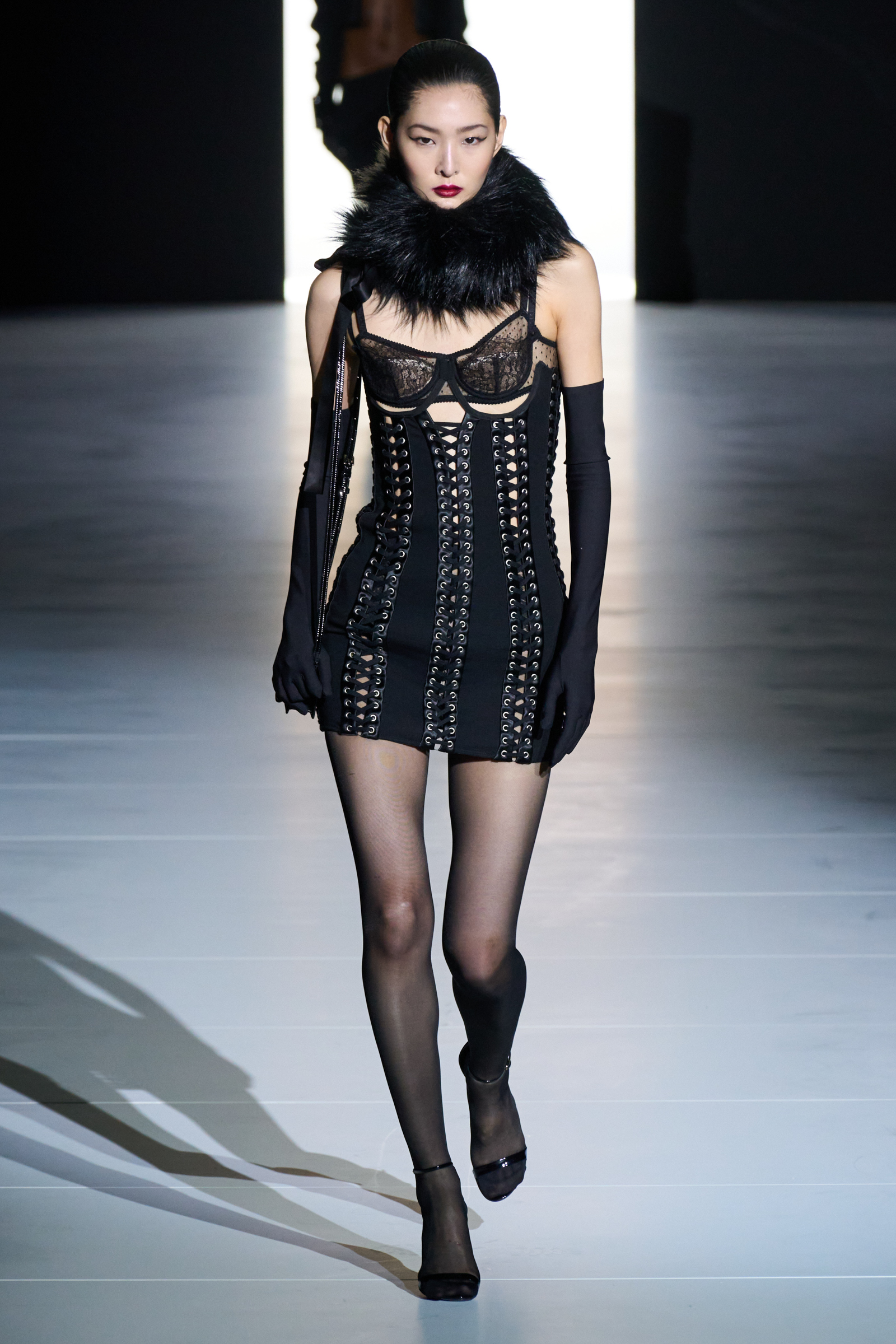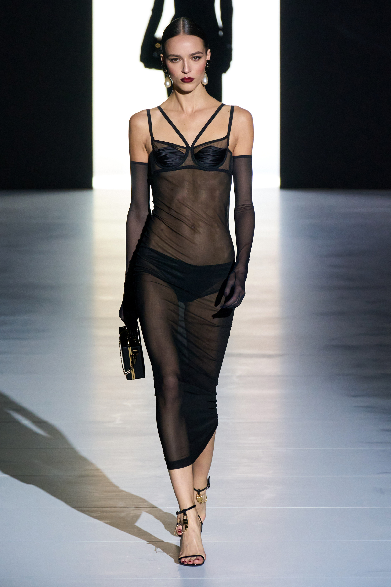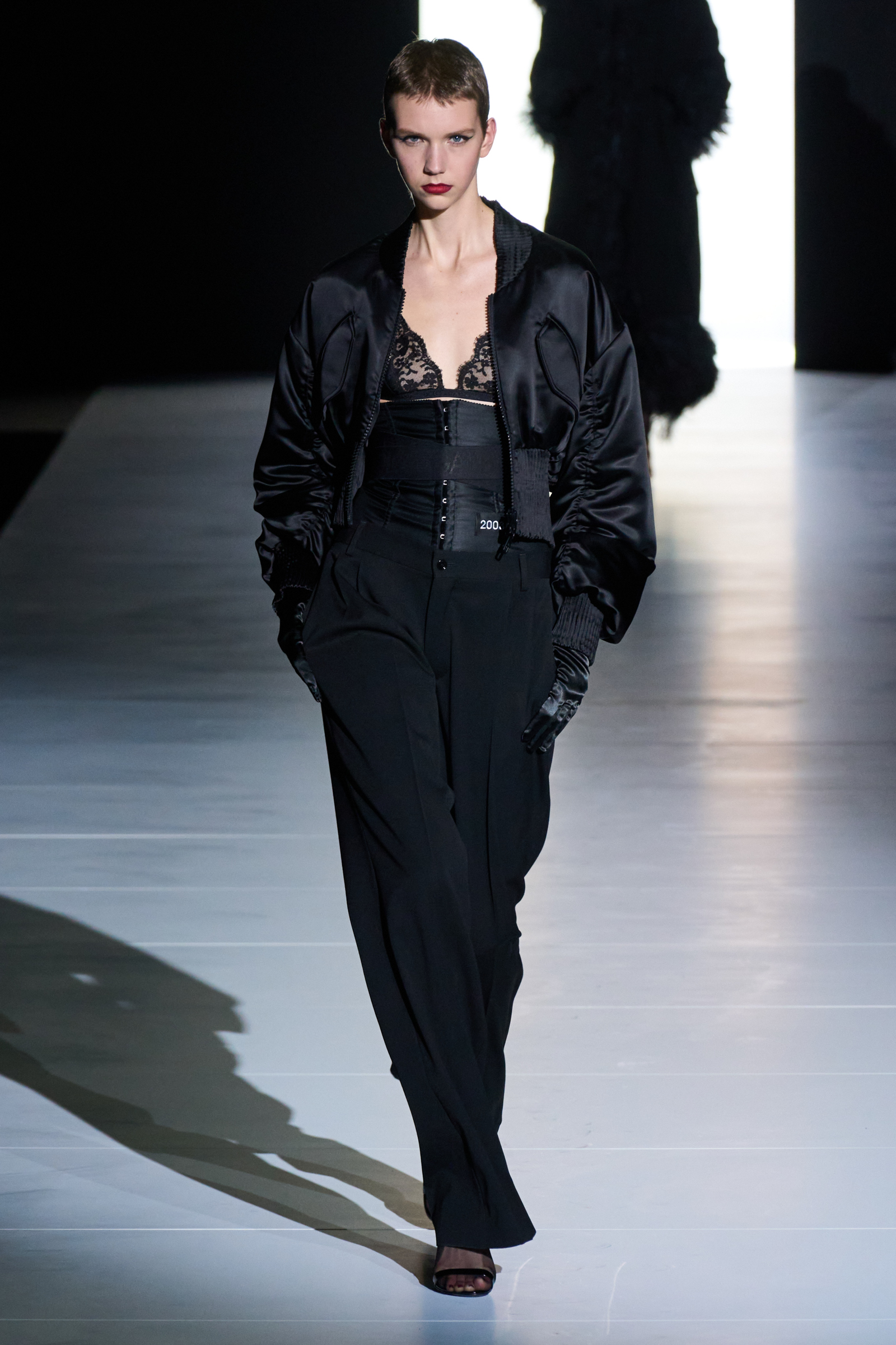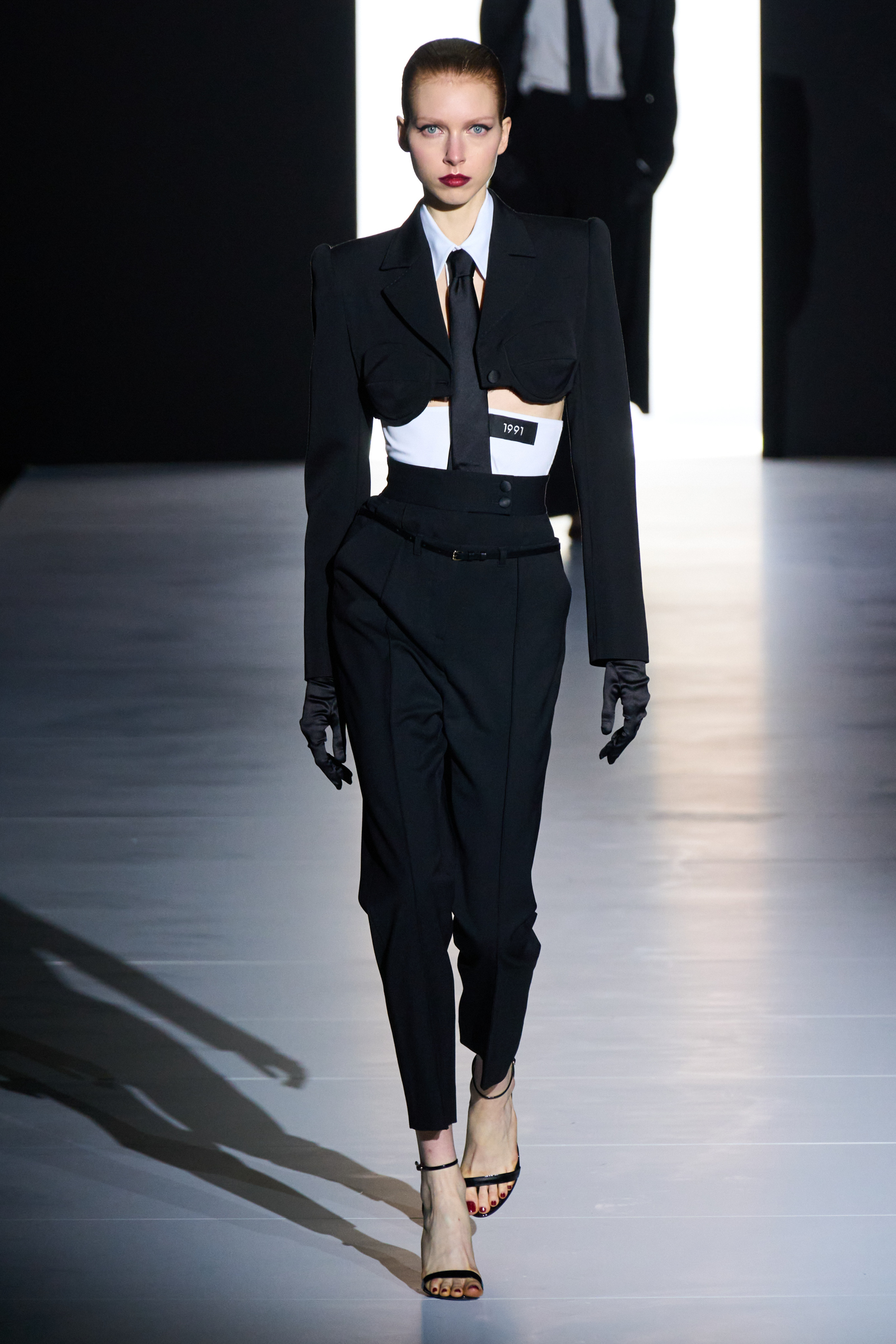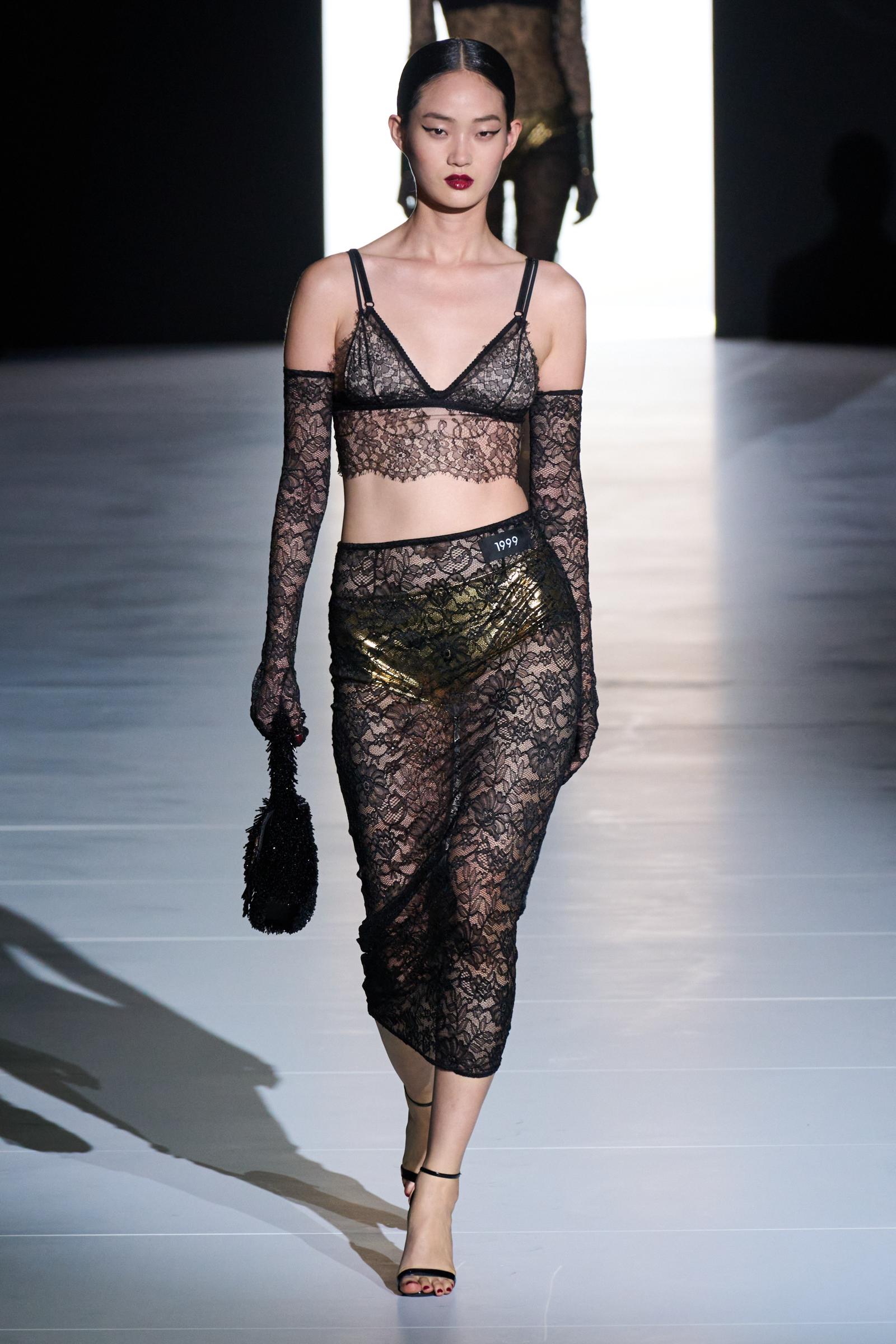 Lingerie dressing is a look that’s been embraced by a new generation of designers and their young followers, but Dolce and Gabbana were ahead of this particular curve by a good 30 years, a fact proven by the exposed corset from 1991 that they paired with a suit whose cropped jacket and cigarette pants were evocative of a matador’s outfit. There was much more of this kind of thing on the runway: lacy teddies, embroidered tulle slips, and bras with poured metal cups mixed with other corsets bearing hooks-and-eyes, lacing details, and gold whaleboning.