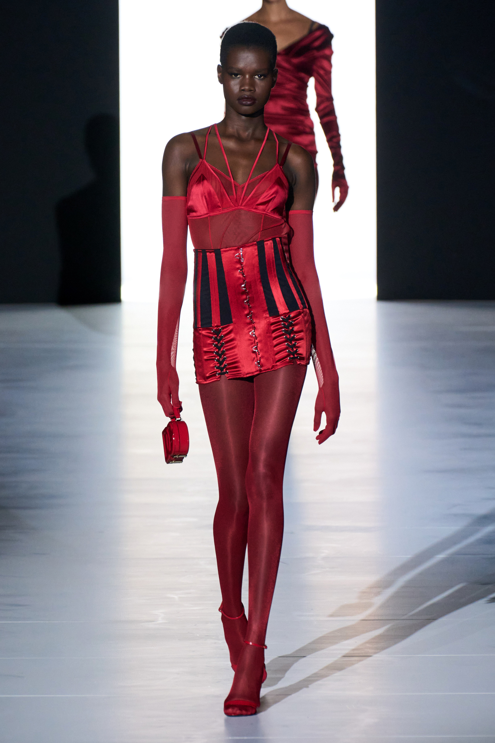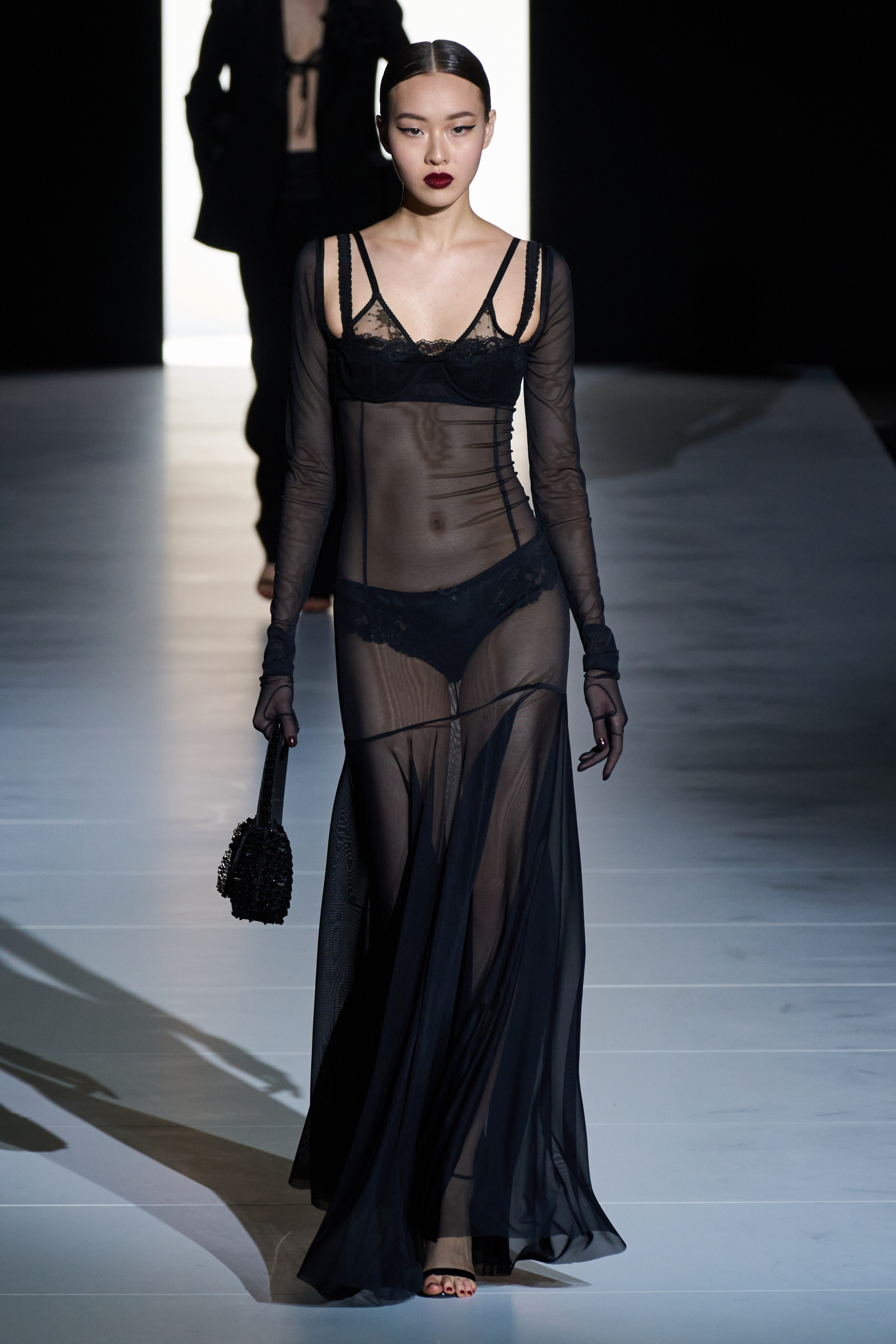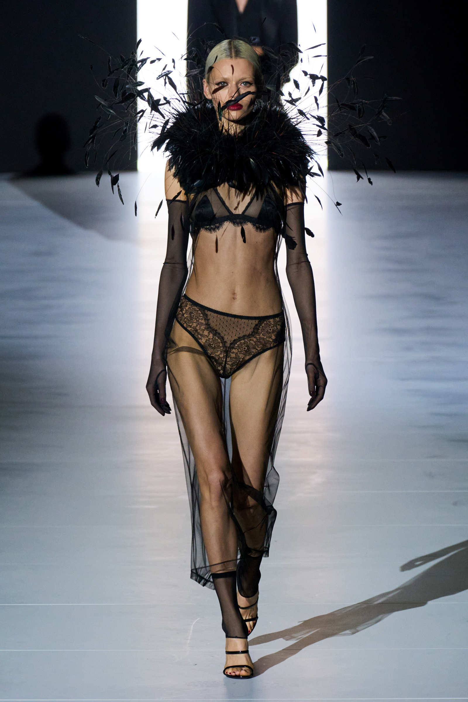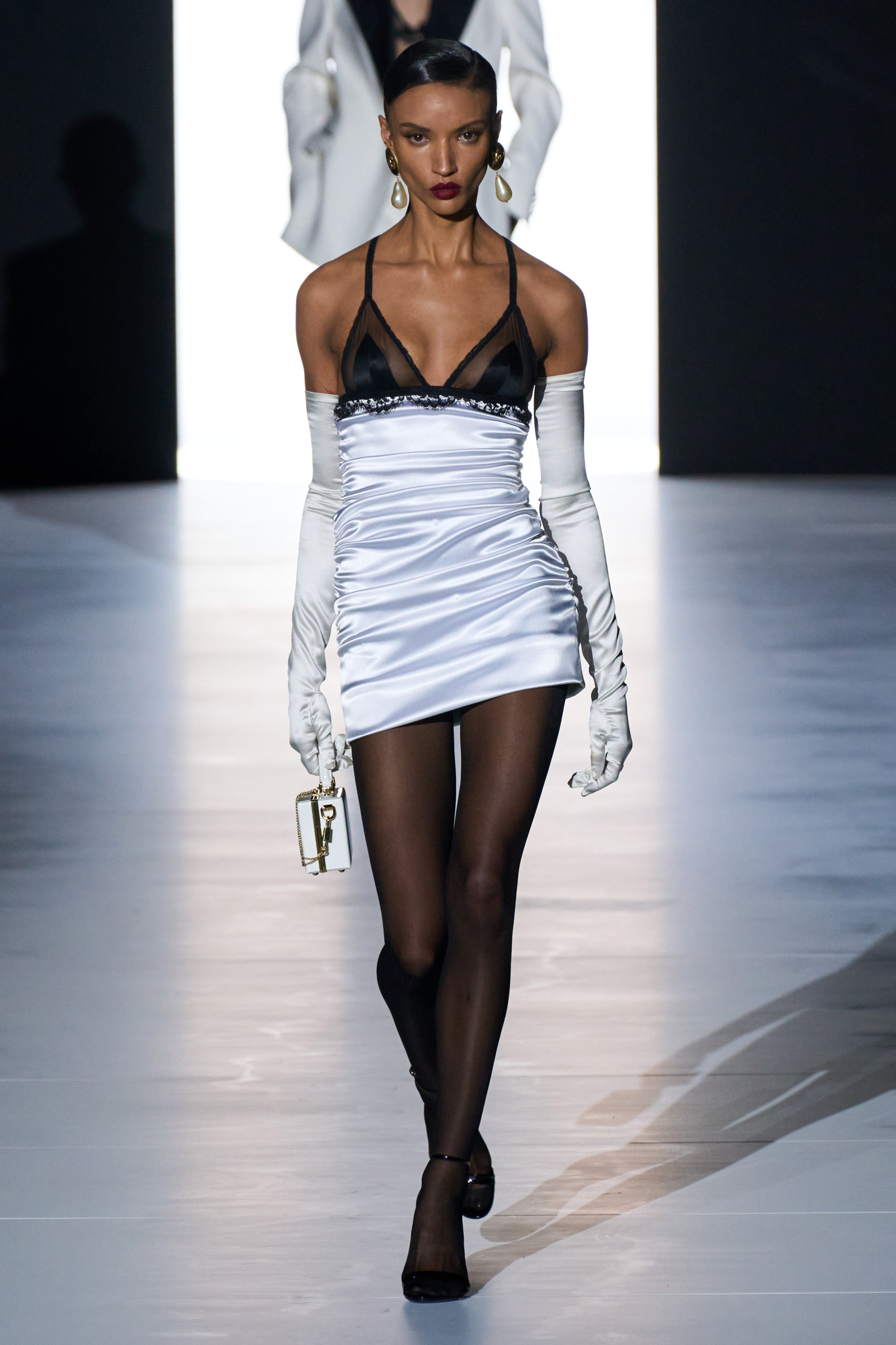 Lingerie dressing is a look that’s been embraced by a new generation of designers and their young followers, but Dolce and Gabbana were ahead of this particular curve by a good 30 years, a fact proven by the exposed corset from 1991 that they paired with a suit whose cropped jacket and cigarette pants were evocative of a matador’s outfit. There was much more of this kind of thing on the runway: lacy teddies, embroidered tulle slips, and bras with poured metal cups mixed with other corsets bearing hooks-and-eyes, lacing details, and gold whaleboning.
