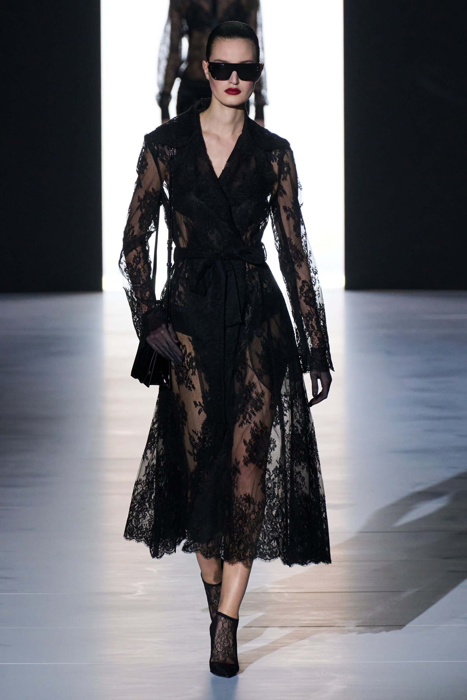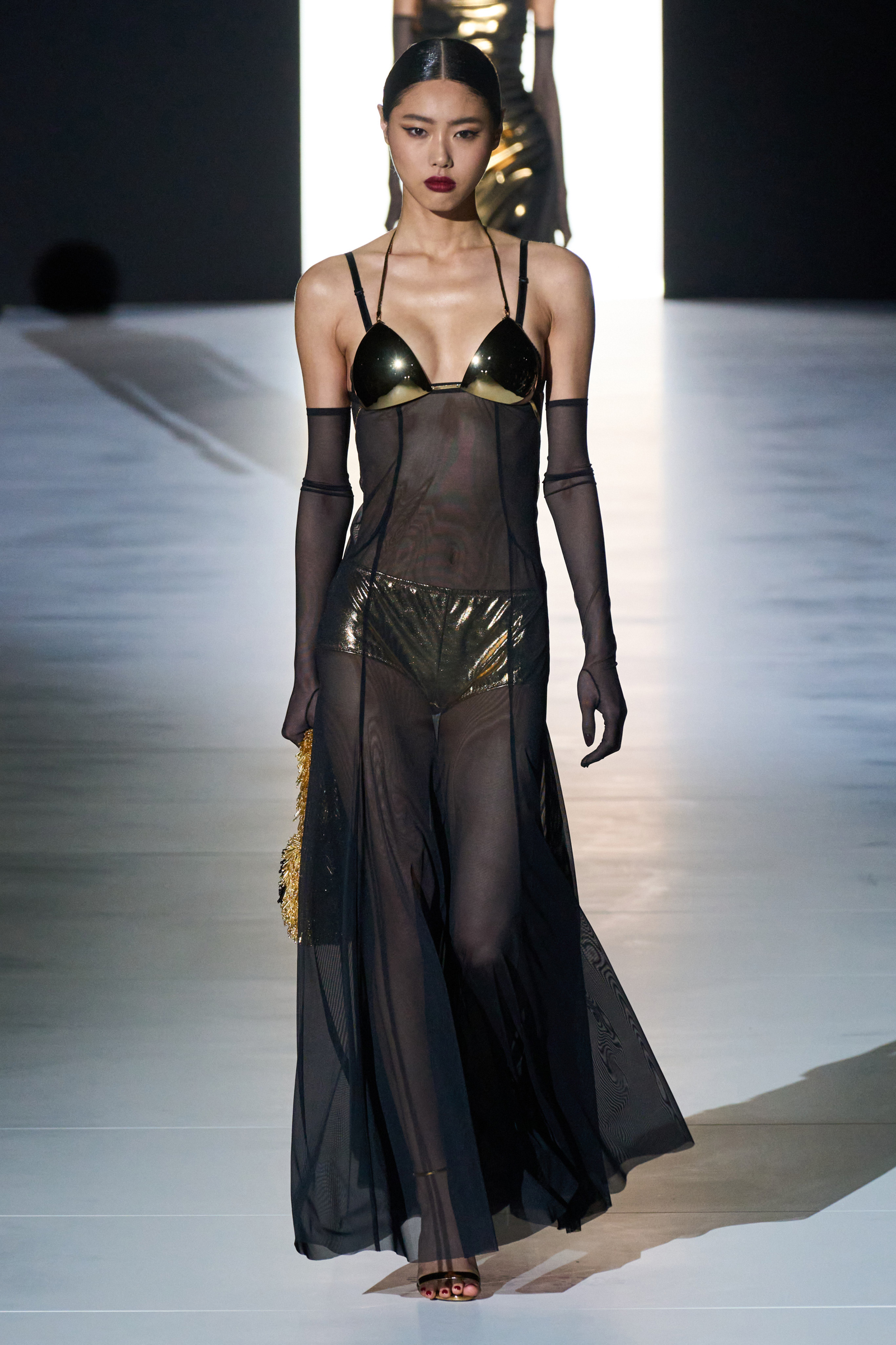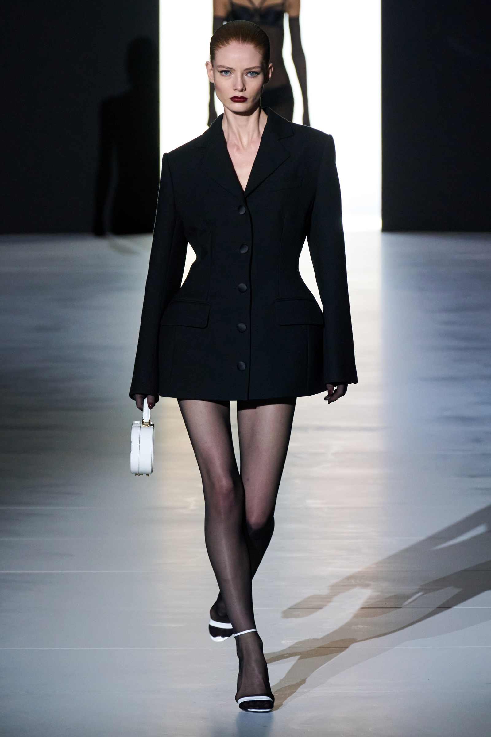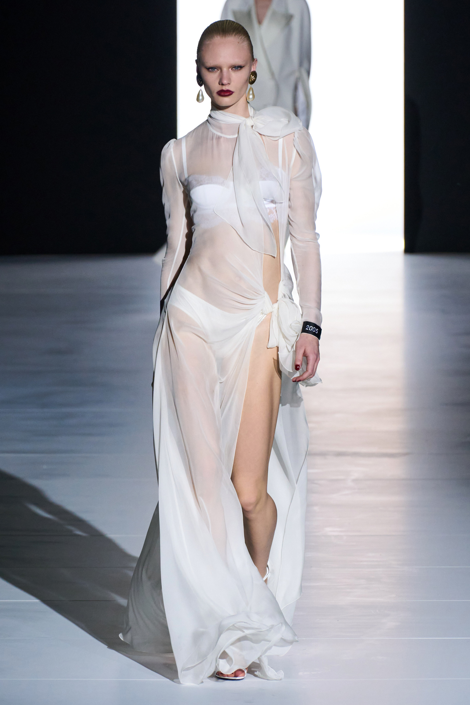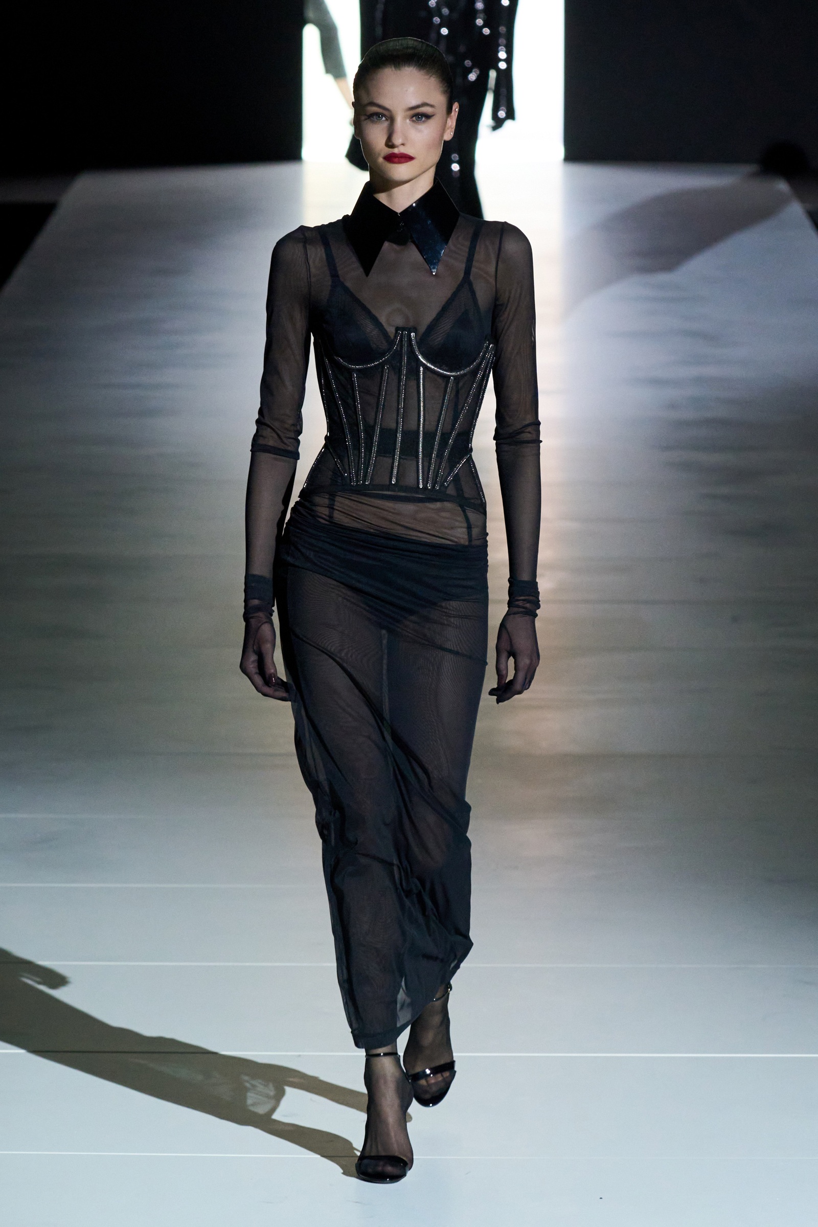 Lingerie dressing is a look that’s been embraced by a new generation of designers and their young followers, but Dolce and Gabbana were ahead of this particular curve by a good 30 years, a fact proven by the exposed corset from 1991 that they paired with a suit whose cropped jacket and cigarette pants were evocative of a matador’s outfit. There was much more of this kind of thing on the runway: lacy teddies, embroidered tulle slips, and bras with poured metal cups mixed with other corsets bearing hooks-and-eyes, lacing details, and gold whaleboning.