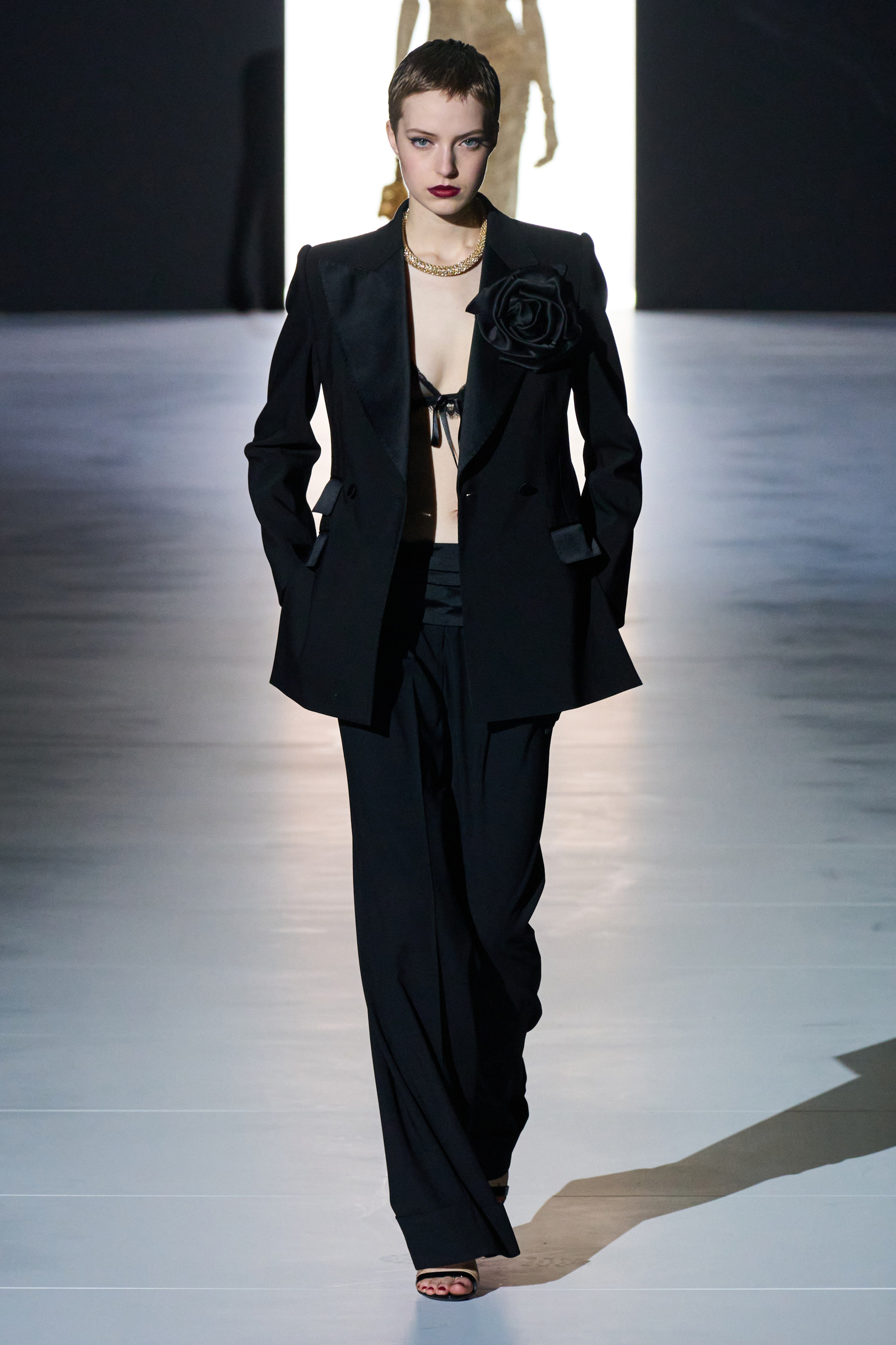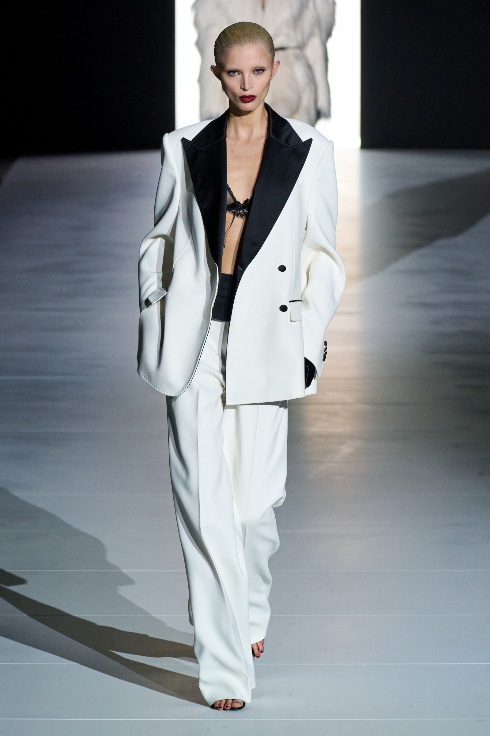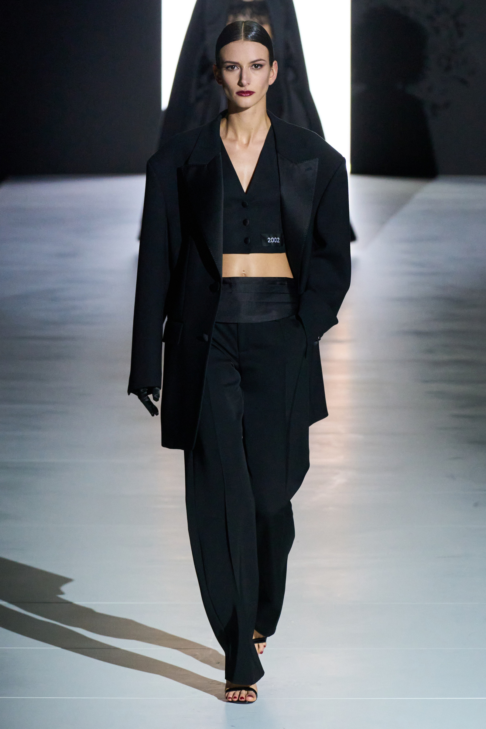 Kim Kardashian was in the house this afternoon. Last season Dolce and Gabbana worked with her to identify archive pieces worthy of modern tweaks. Today she was a front-row guest, but the project they started together has kept the designers’ interest. An hourglass shaped black double-wool coat bearing the label 1997-98 at the left cuff is a fine example of Dolce’s obsession; ditto a white tux with black satin revers and cummerbund, the model of which seemed specially chosen for her resemblance to the icy blonde Nadja Auermann, a favorite of the photographer Helmut Newton, who liked a woman in a strong suit as much as these guys do.
