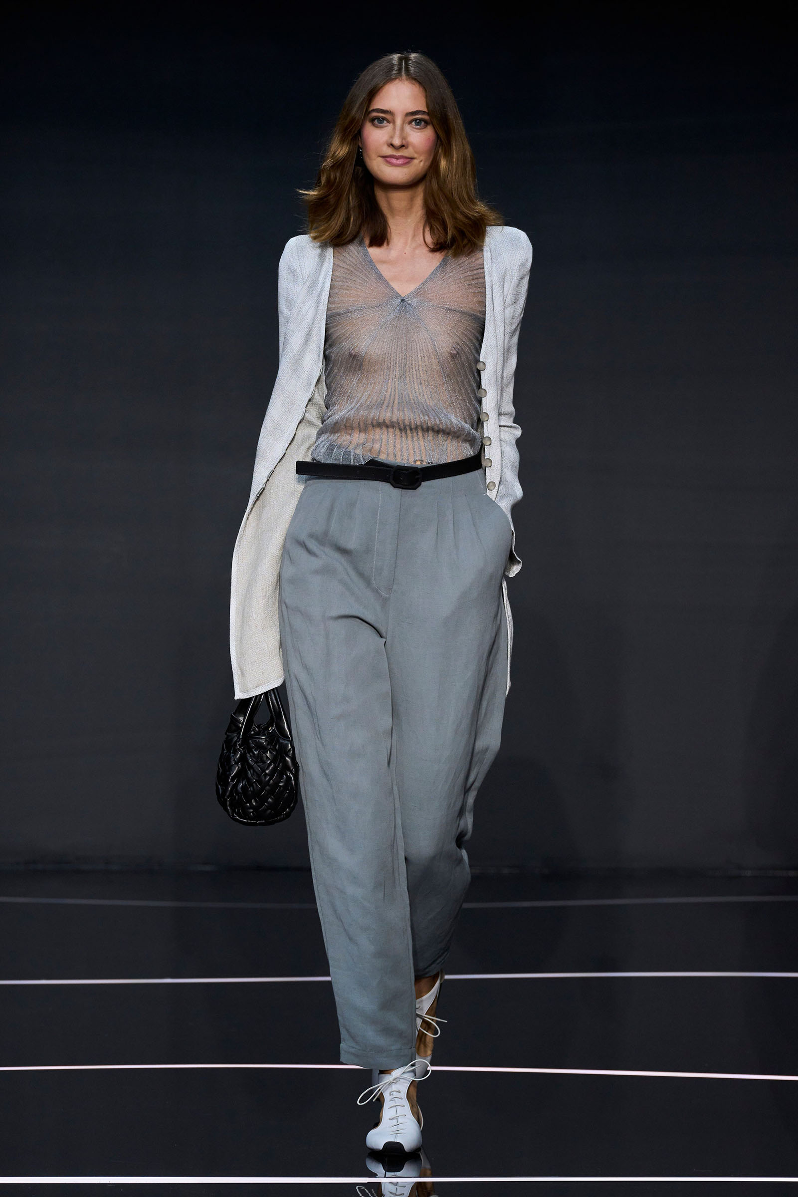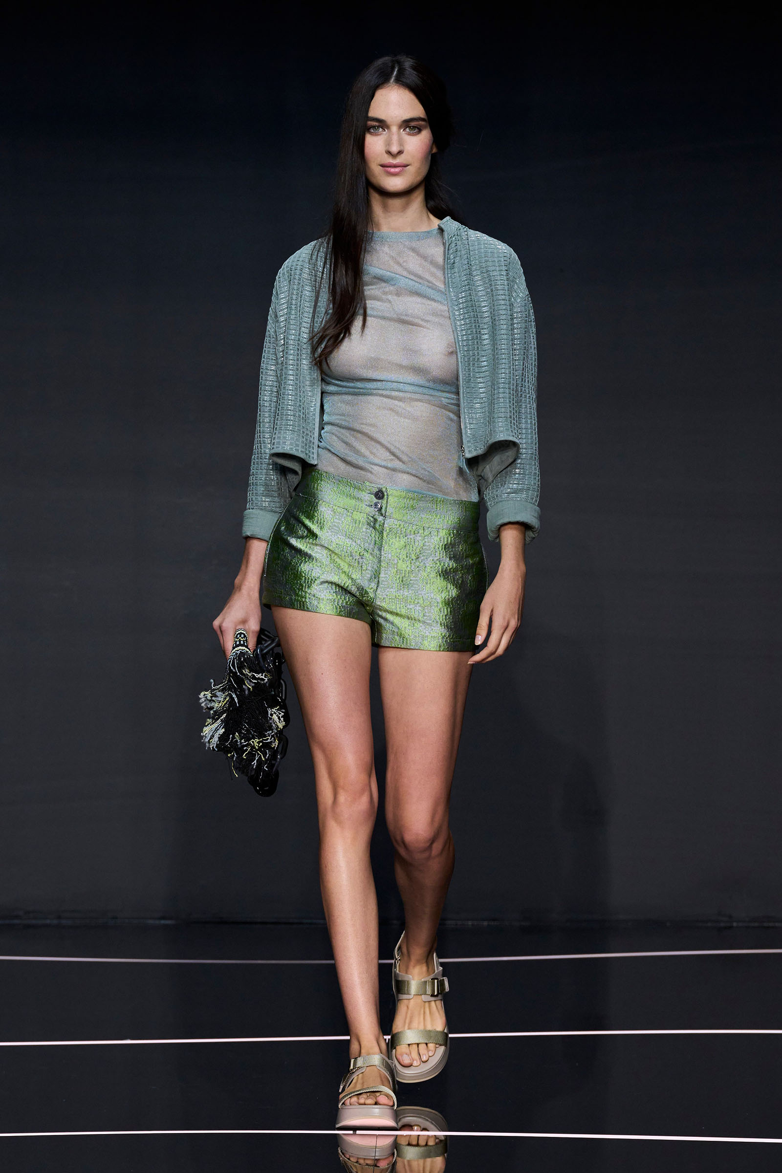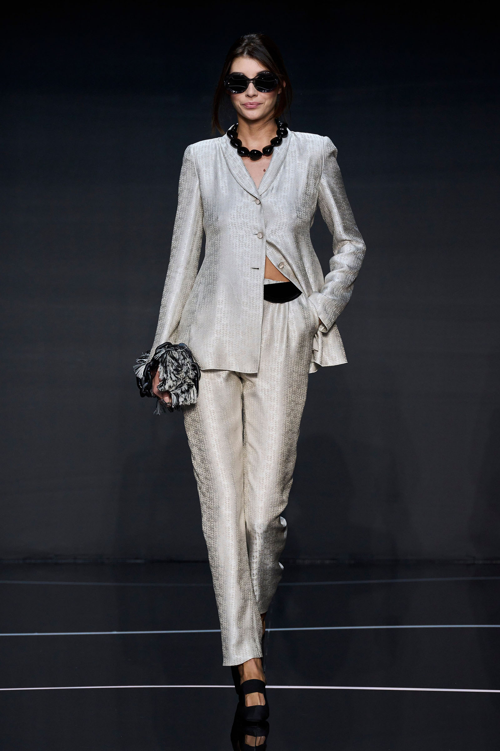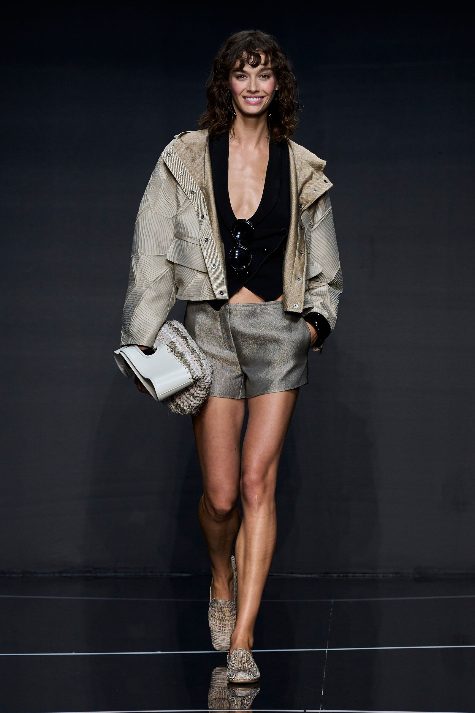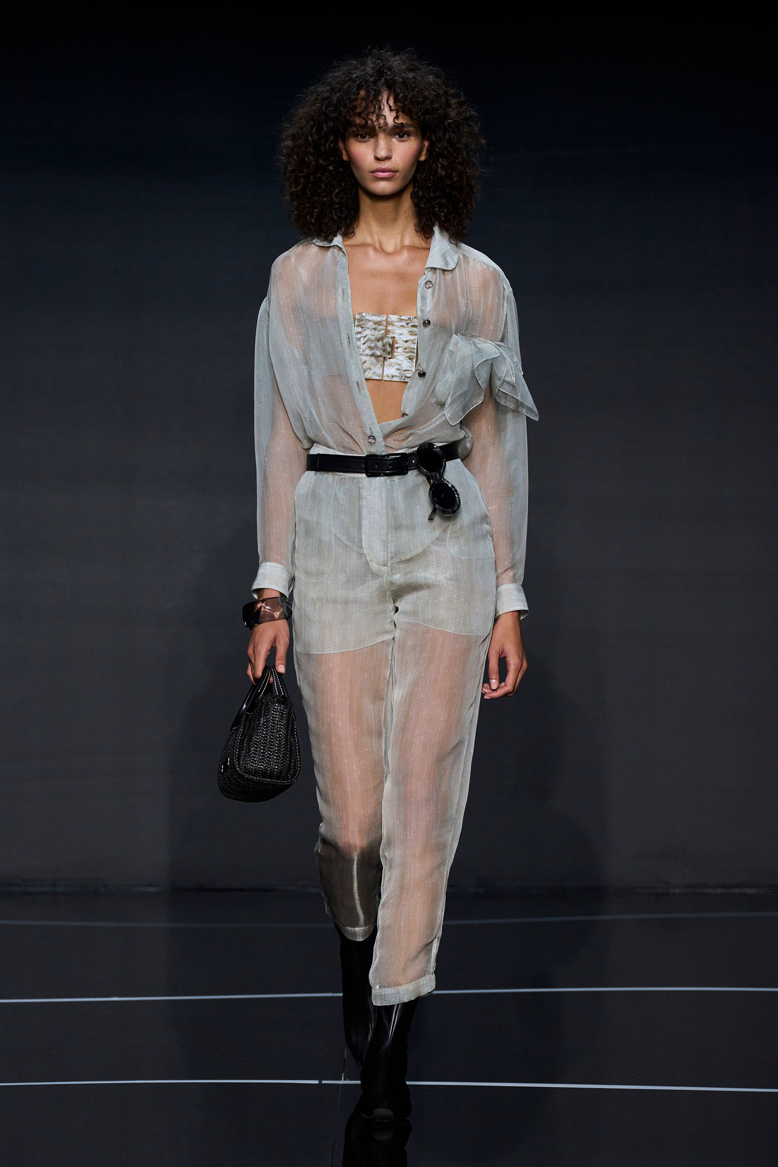 A wide-shoulder loose-skirt jacket in white tweed, a version of the Armani template that shifted the course of fashion at the same time Emporio launched, acted as the palate-cleansing opening look. It was worn above a crop top barely wider than a belt—that later was used as a belt—cinched with a large tortoiseshell square fastening and a pair of black pants and sandals. This was prototypic Armani styled with unpretentious ease. It was followed by a series of hammered metallic-jacquard looks, easy separates precisely defined. Gauzy shirts and overalls were worn over shorts and skirts. Those 1981 clutches aside, the models carried summer bags in loosely meshed leather.