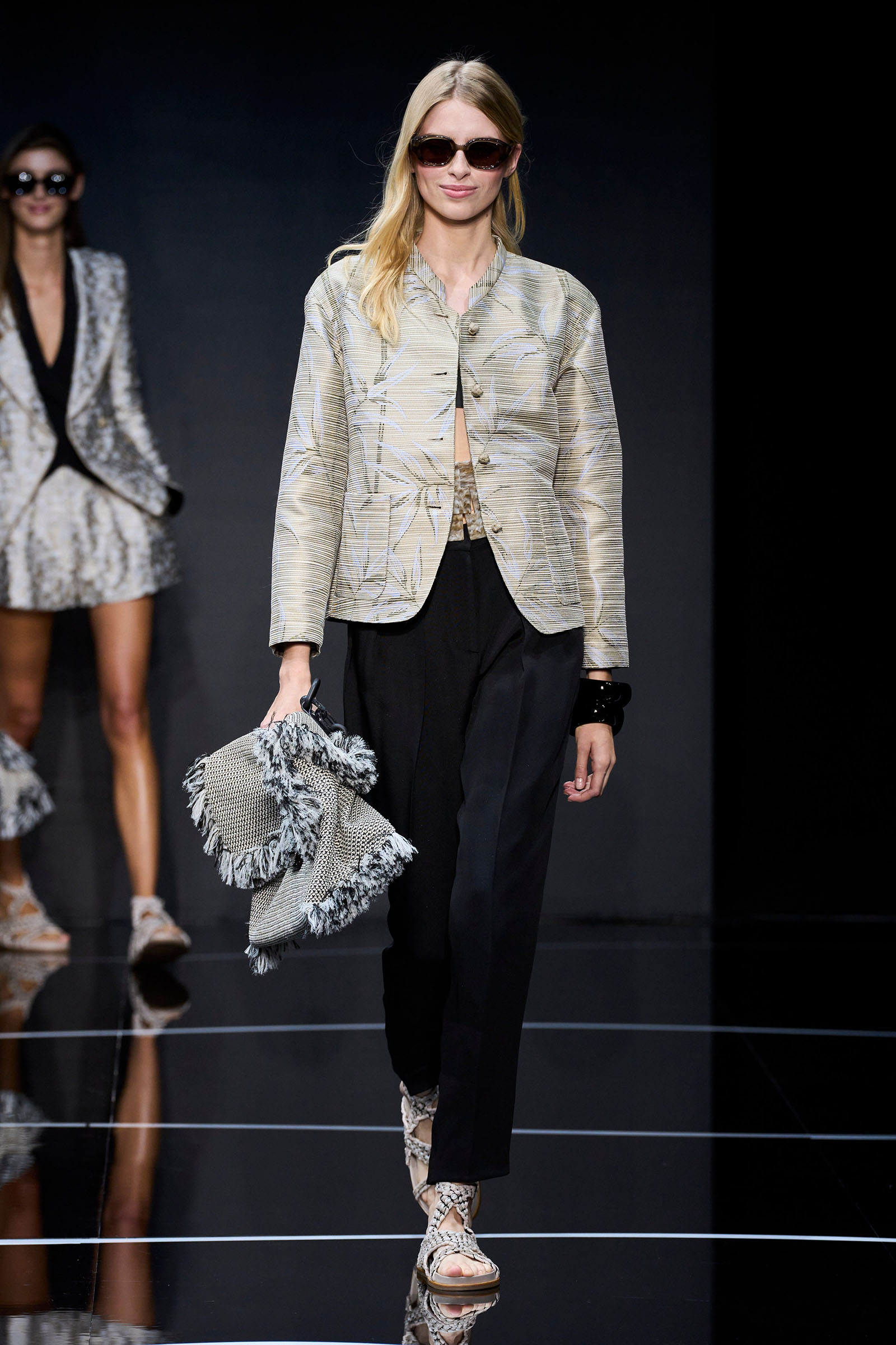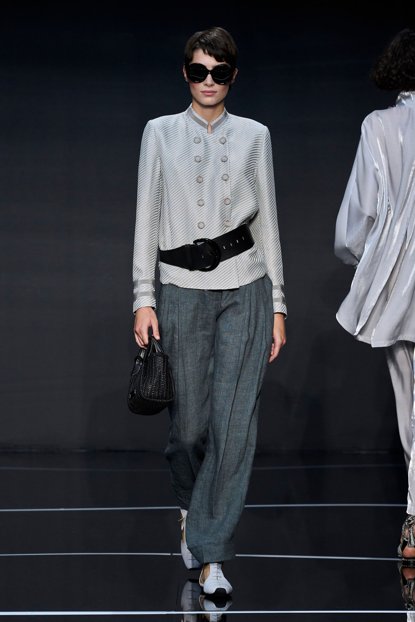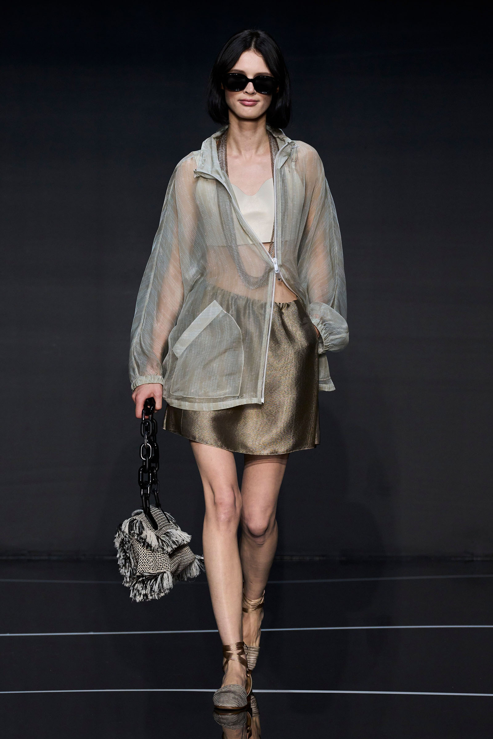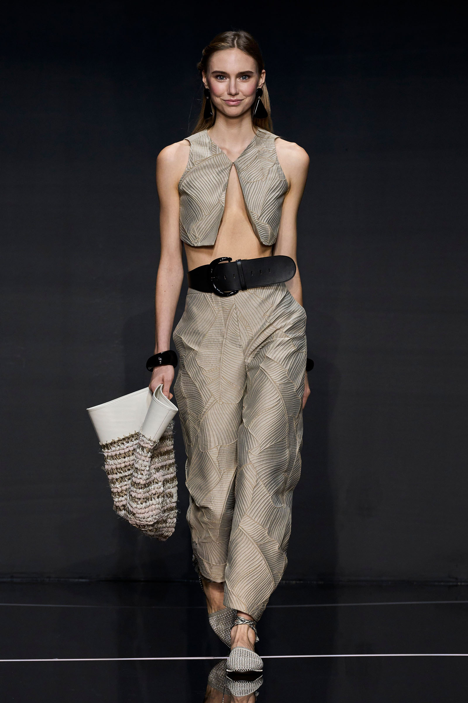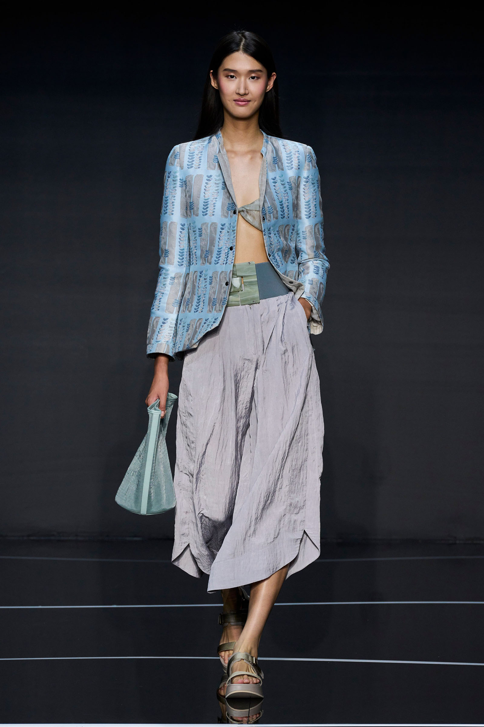 A wide-shoulder loose-skirt jacket in white tweed, a version of the Armani template that shifted the course of fashion at the same time Emporio launched, acted as the palate-cleansing opening look. It was worn above a crop top barely wider than a belt—that later was used as a belt—cinched with a large tortoiseshell square fastening and a pair of black pants and sandals. This was prototypic Armani styled with unpretentious ease. It was followed by a series of hammered metallic-jacquard looks, easy separates precisely defined. Gauzy shirts and overalls were worn over shorts and skirts. Those 1981 clutches aside, the models carried summer bags in loosely meshed leather.