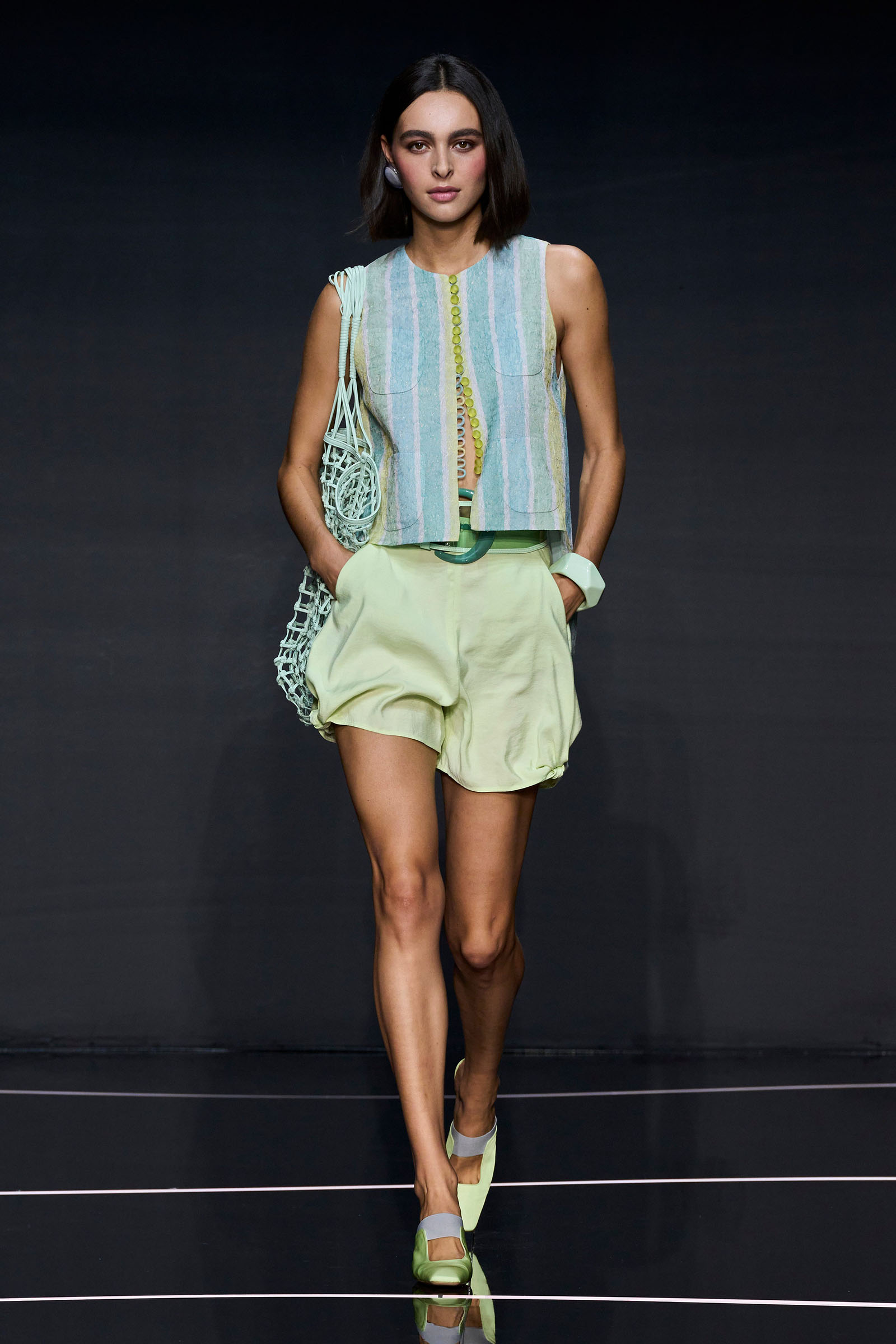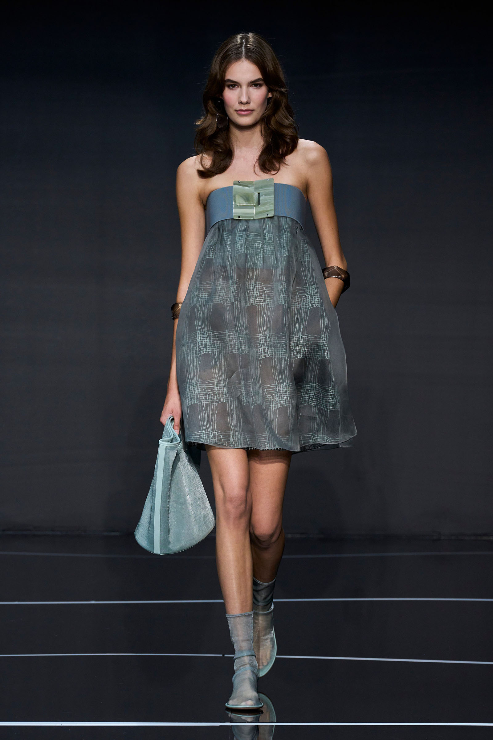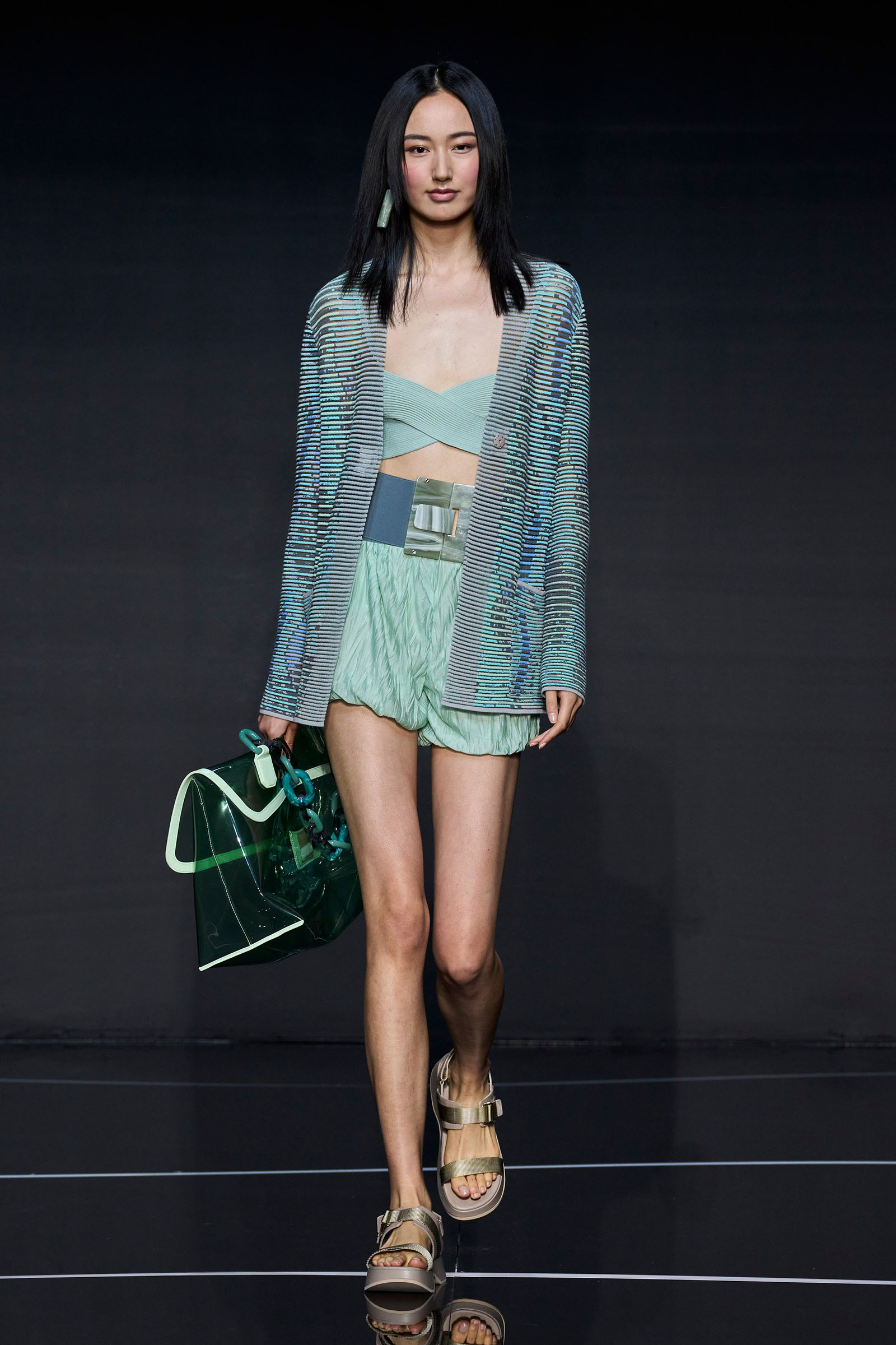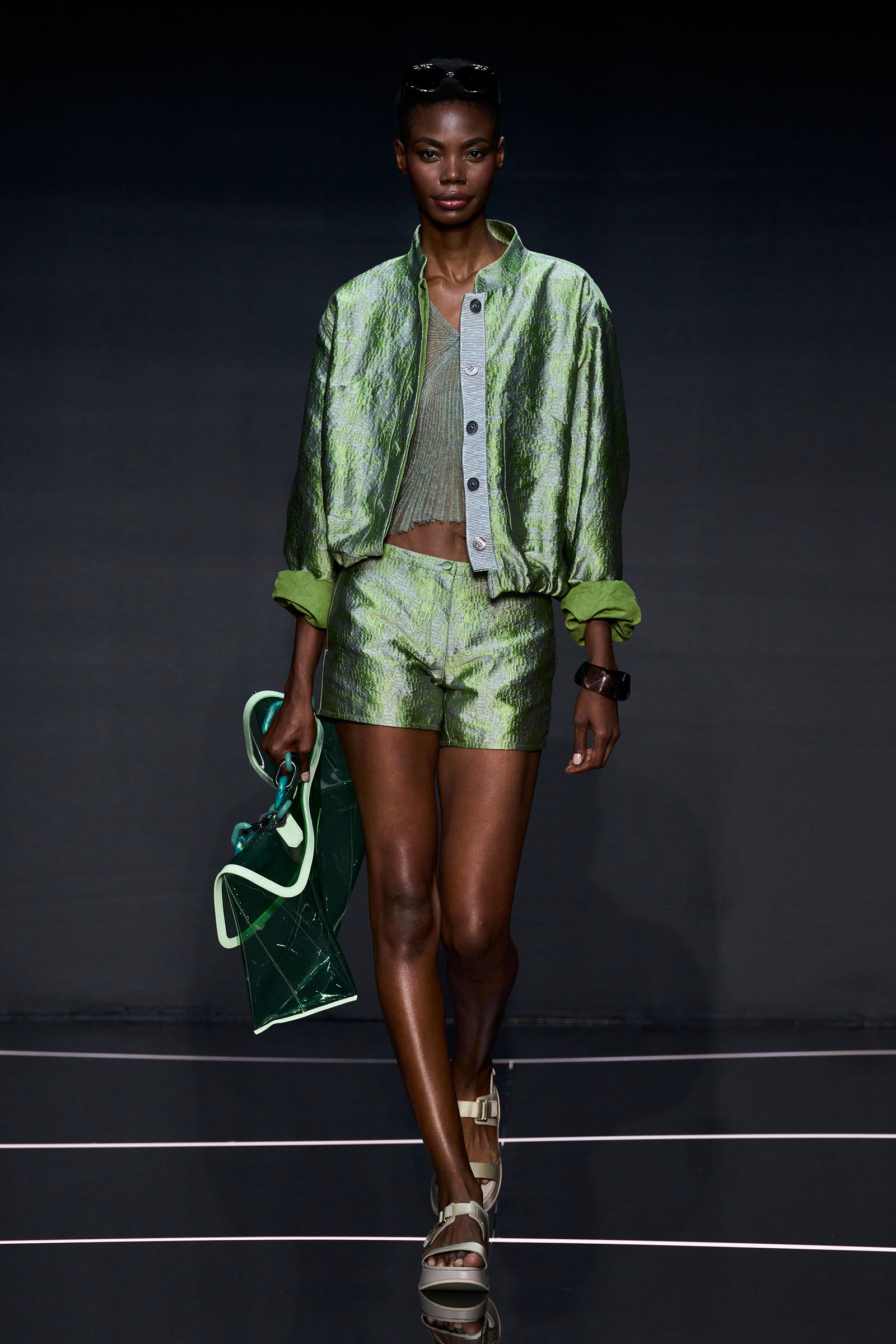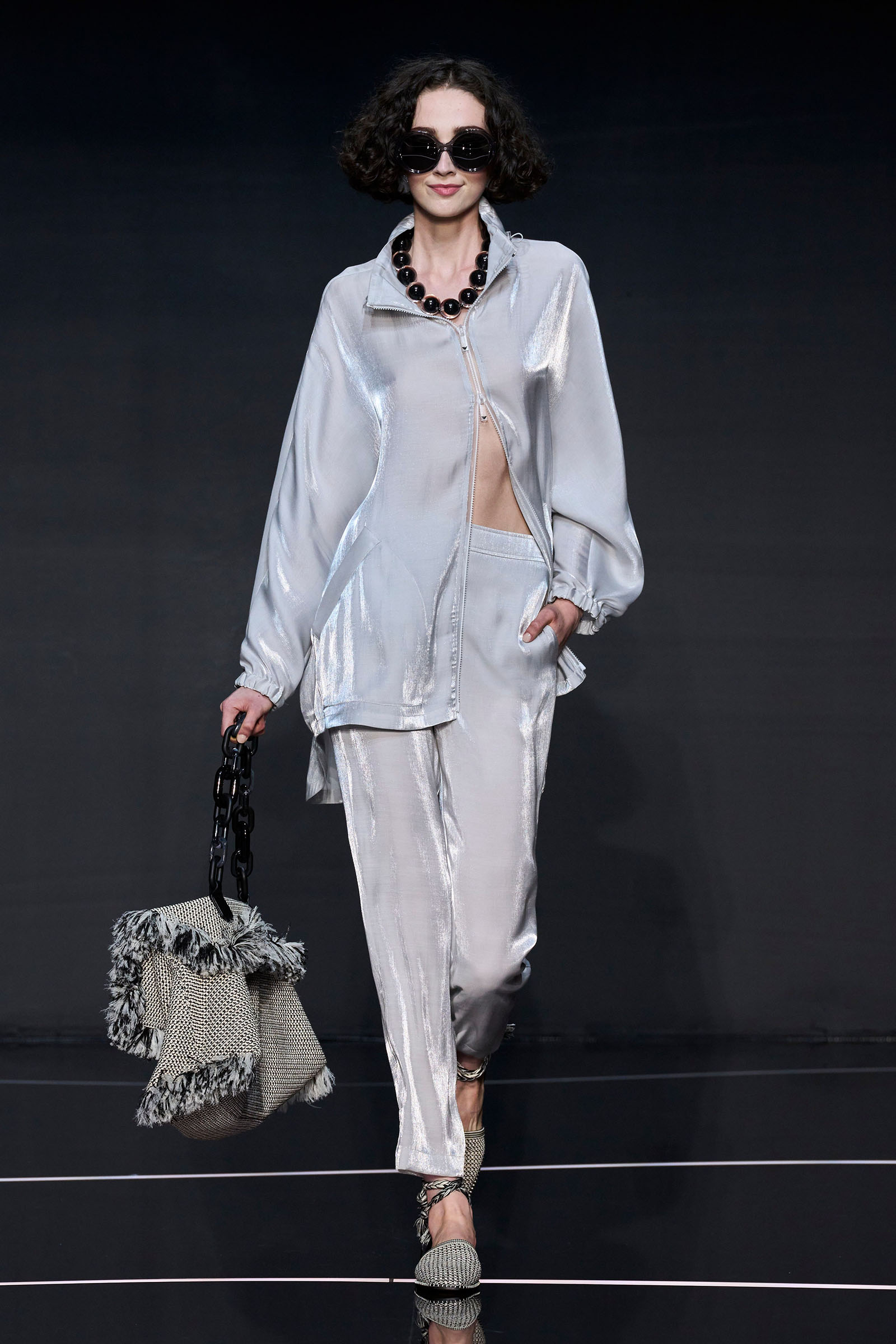 A wide-shoulder loose-skirt jacket in white tweed, a version of the Armani template that shifted the course of fashion at the same time Emporio launched, acted as the palate-cleansing opening look. It was worn above a crop top barely wider than a belt—that later was used as a belt—cinched with a large tortoiseshell square fastening and a pair of black pants and sandals. This was prototypic Armani styled with unpretentious ease. It was followed by a series of hammered metallic-jacquard looks, easy separates precisely defined. Gauzy shirts and overalls were worn over shorts and skirts. Those 1981 clutches aside, the models carried summer bags in loosely meshed leather.