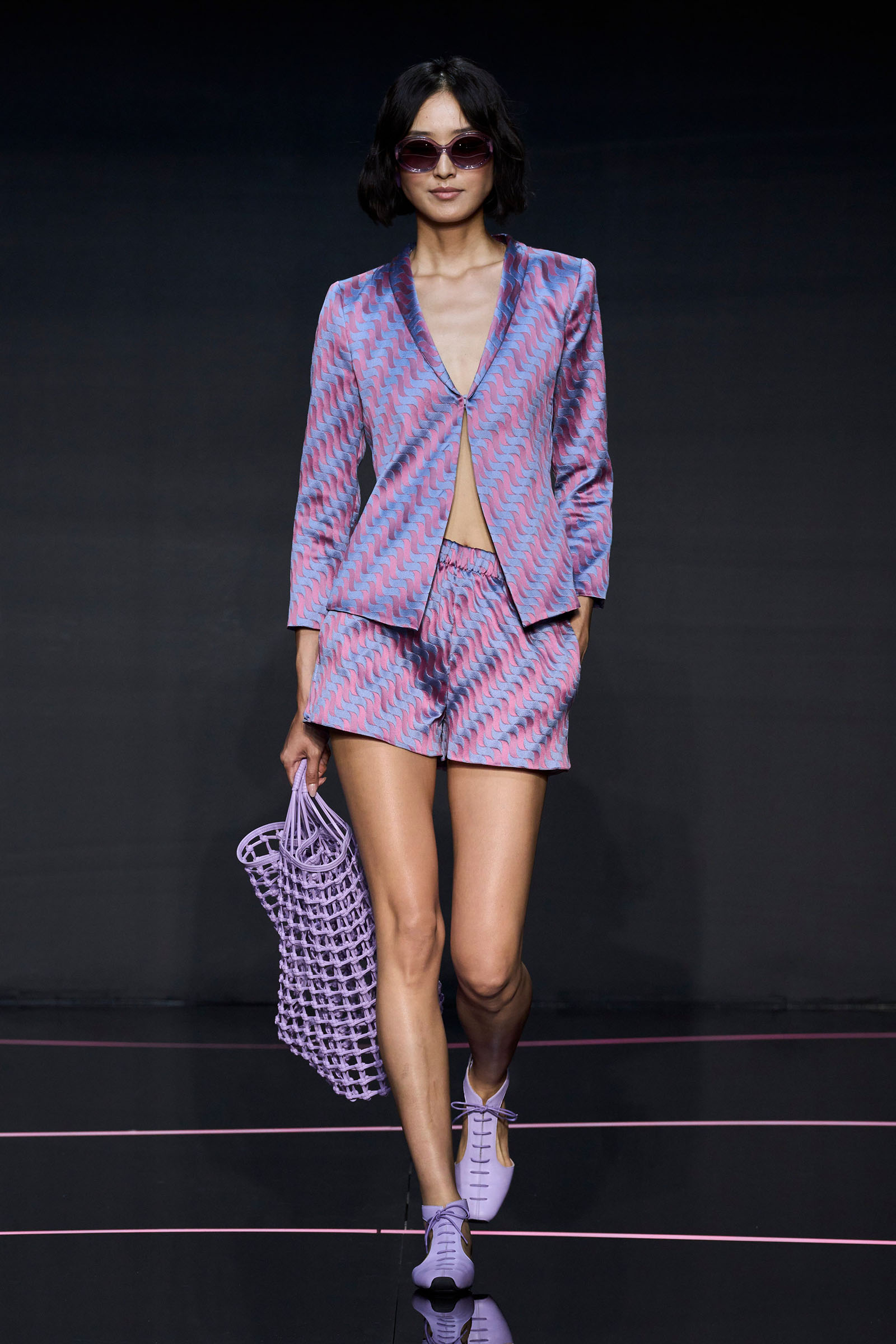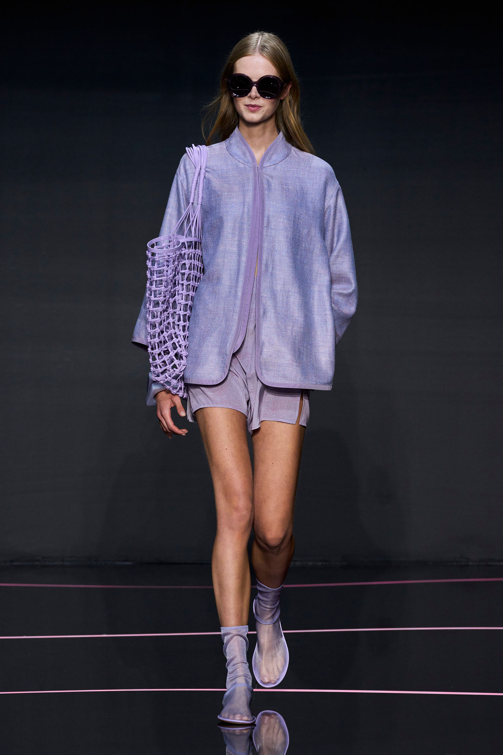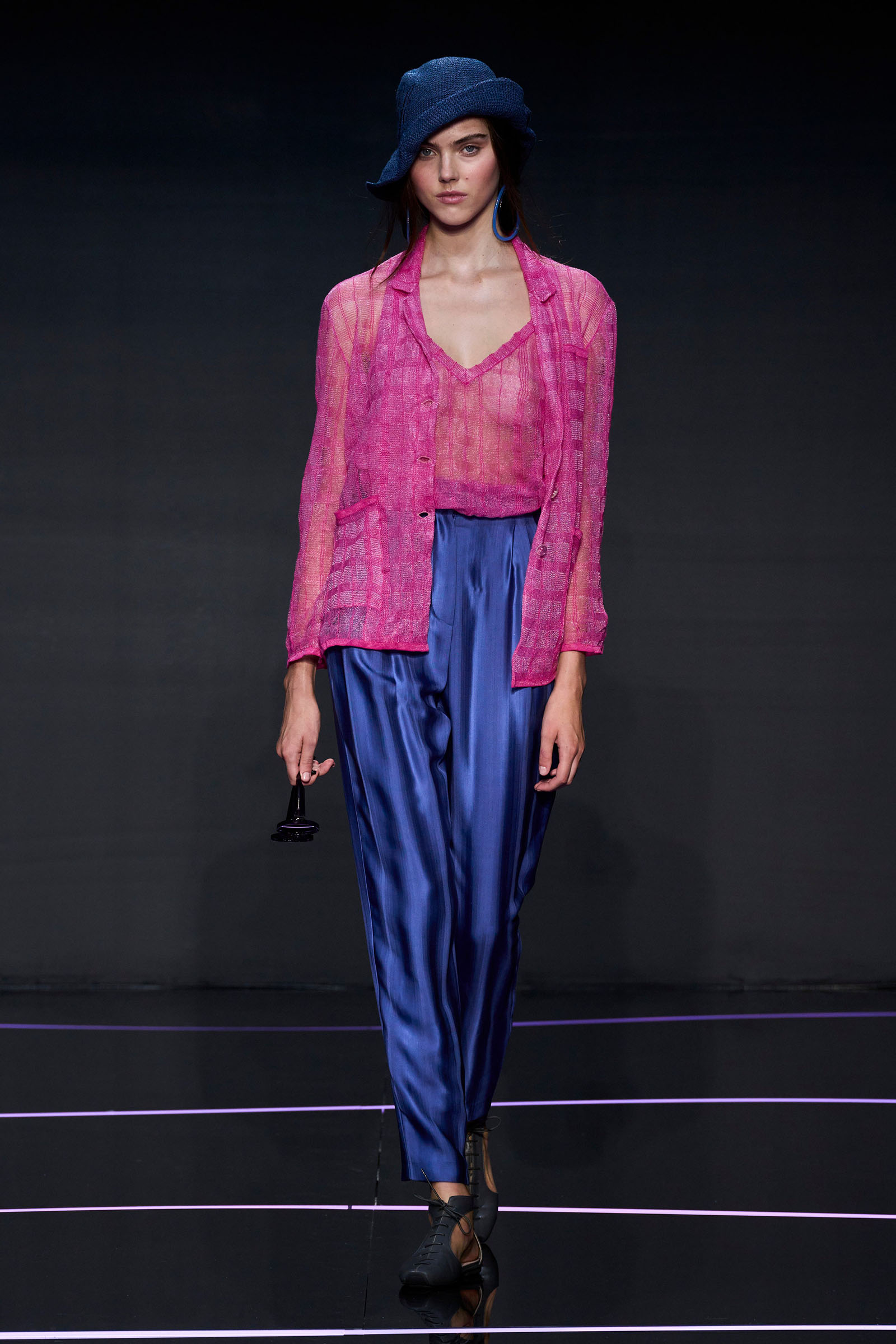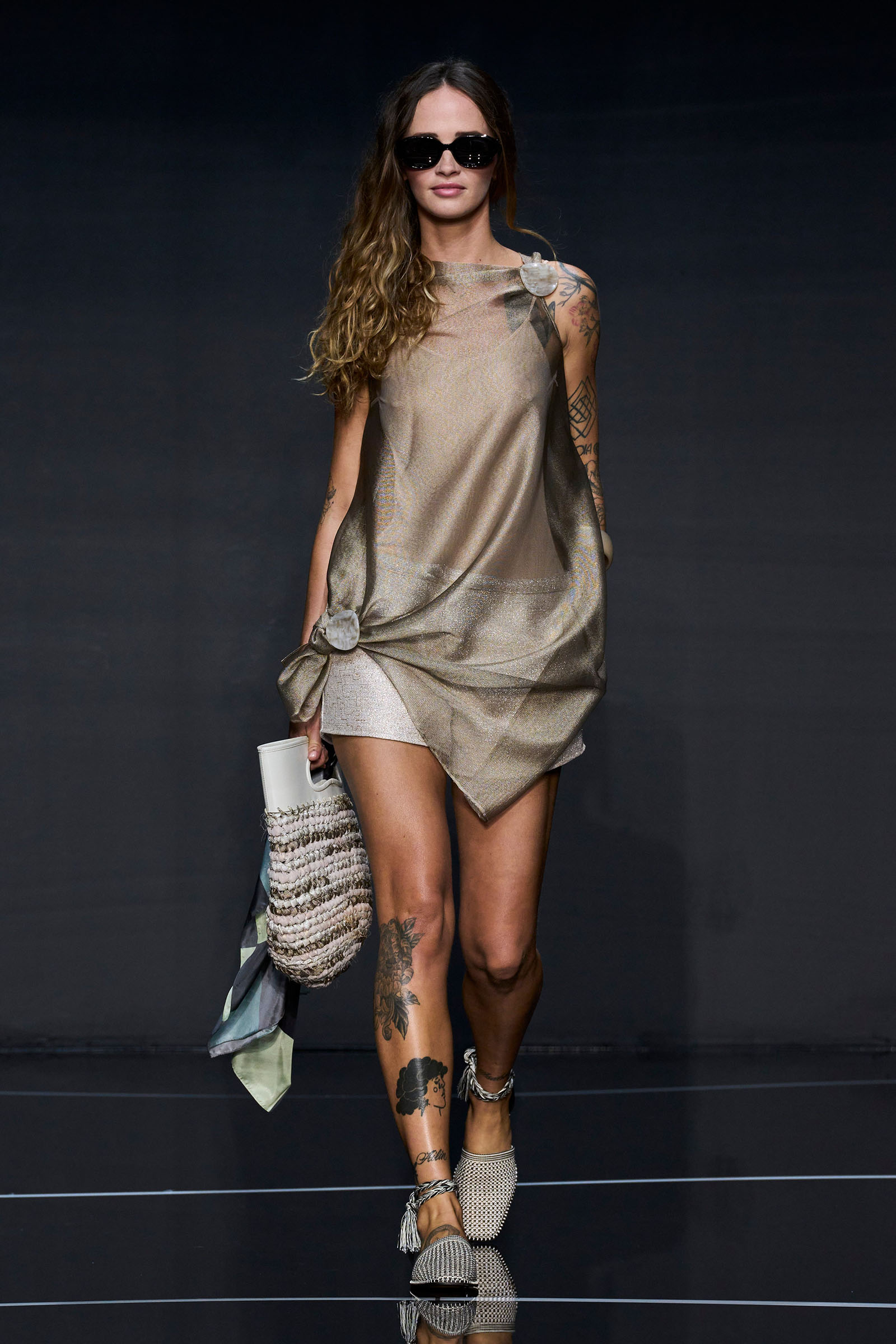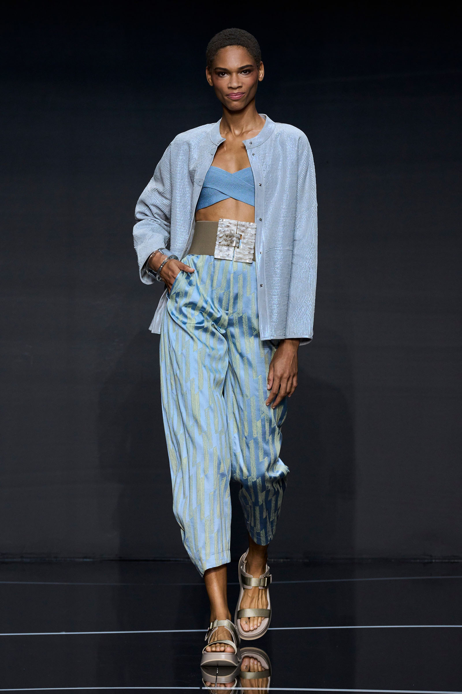 A wide-shoulder loose-skirt jacket in white tweed, a version of the Armani template that shifted the course of fashion at the same time Emporio launched, acted as the palate-cleansing opening look. It was worn above a crop top barely wider than a belt—that later was used as a belt—cinched with a large tortoiseshell square fastening and a pair of black pants and sandals. This was prototypic Armani styled with unpretentious ease. It was followed by a series of hammered metallic-jacquard looks, easy separates precisely defined. Gauzy shirts and overalls were worn over shorts and skirts. Those 1981 clutches aside, the models carried summer bags in loosely meshed leather.