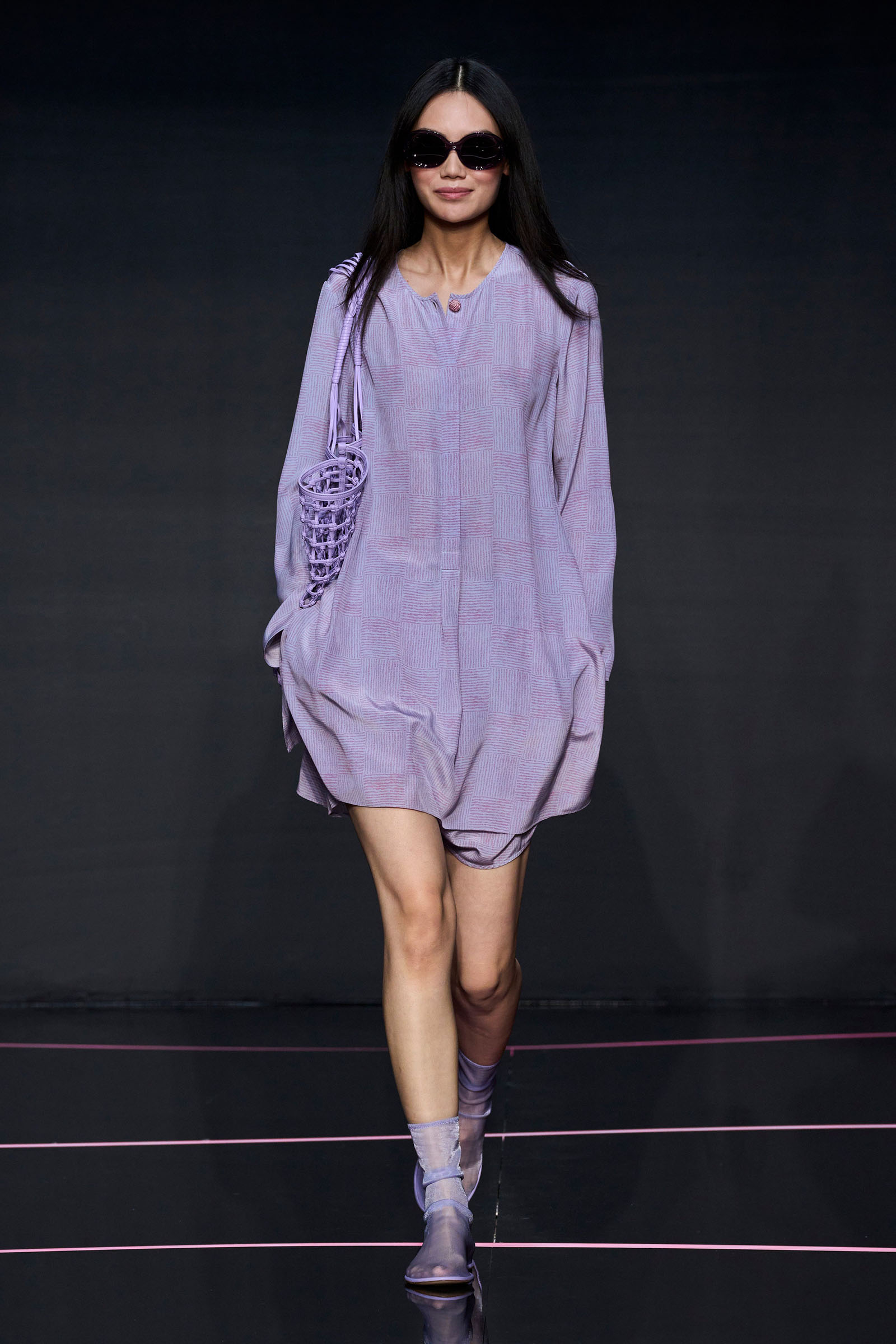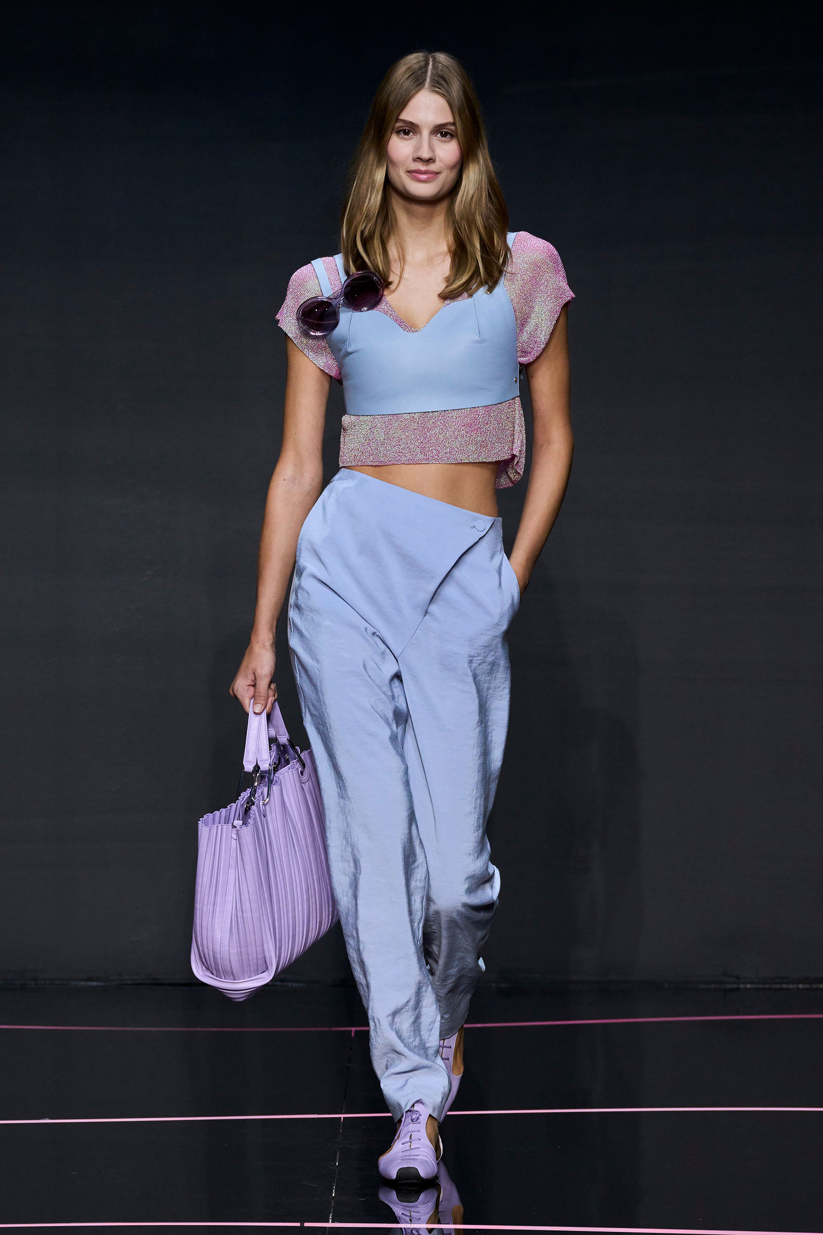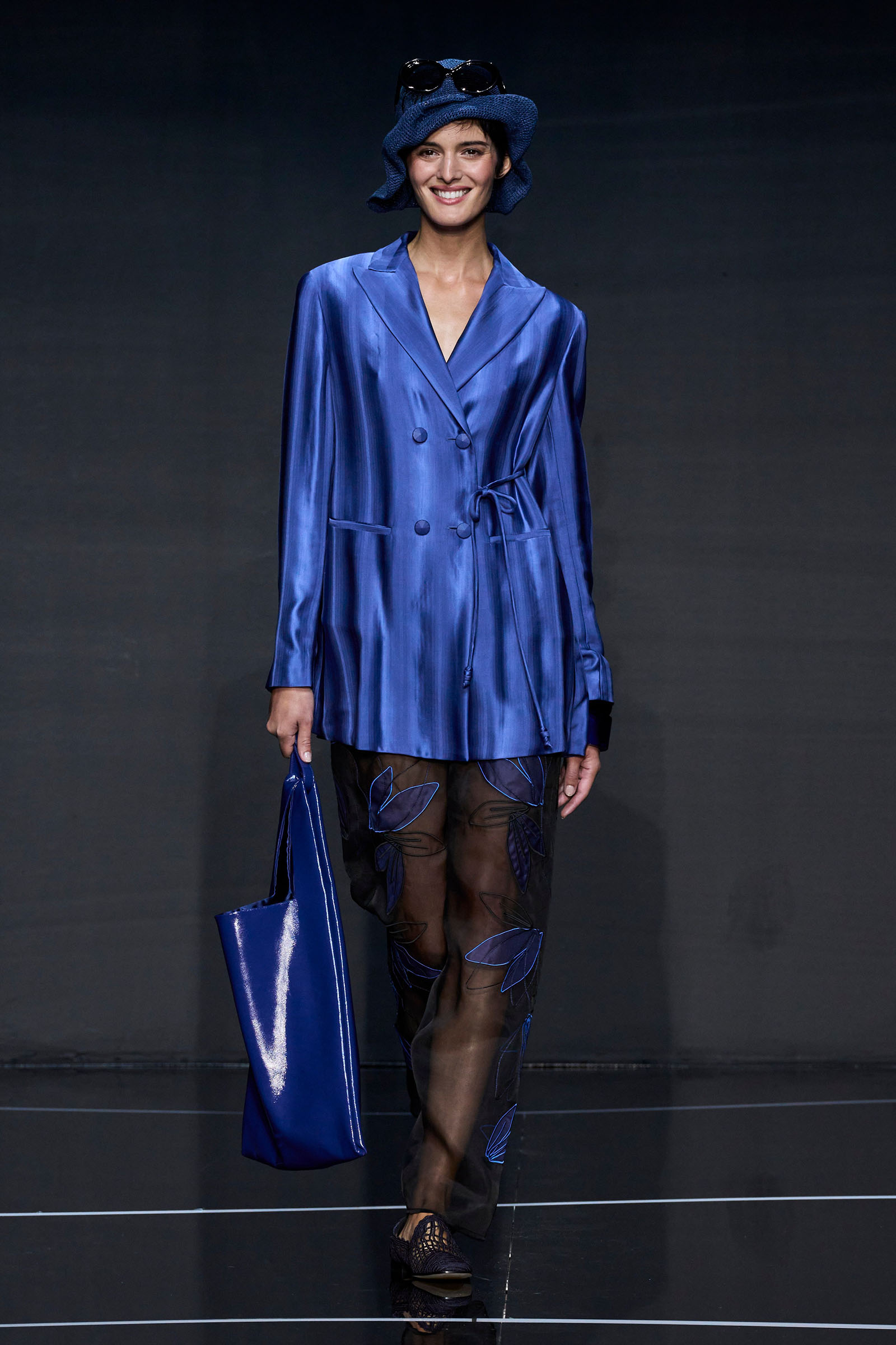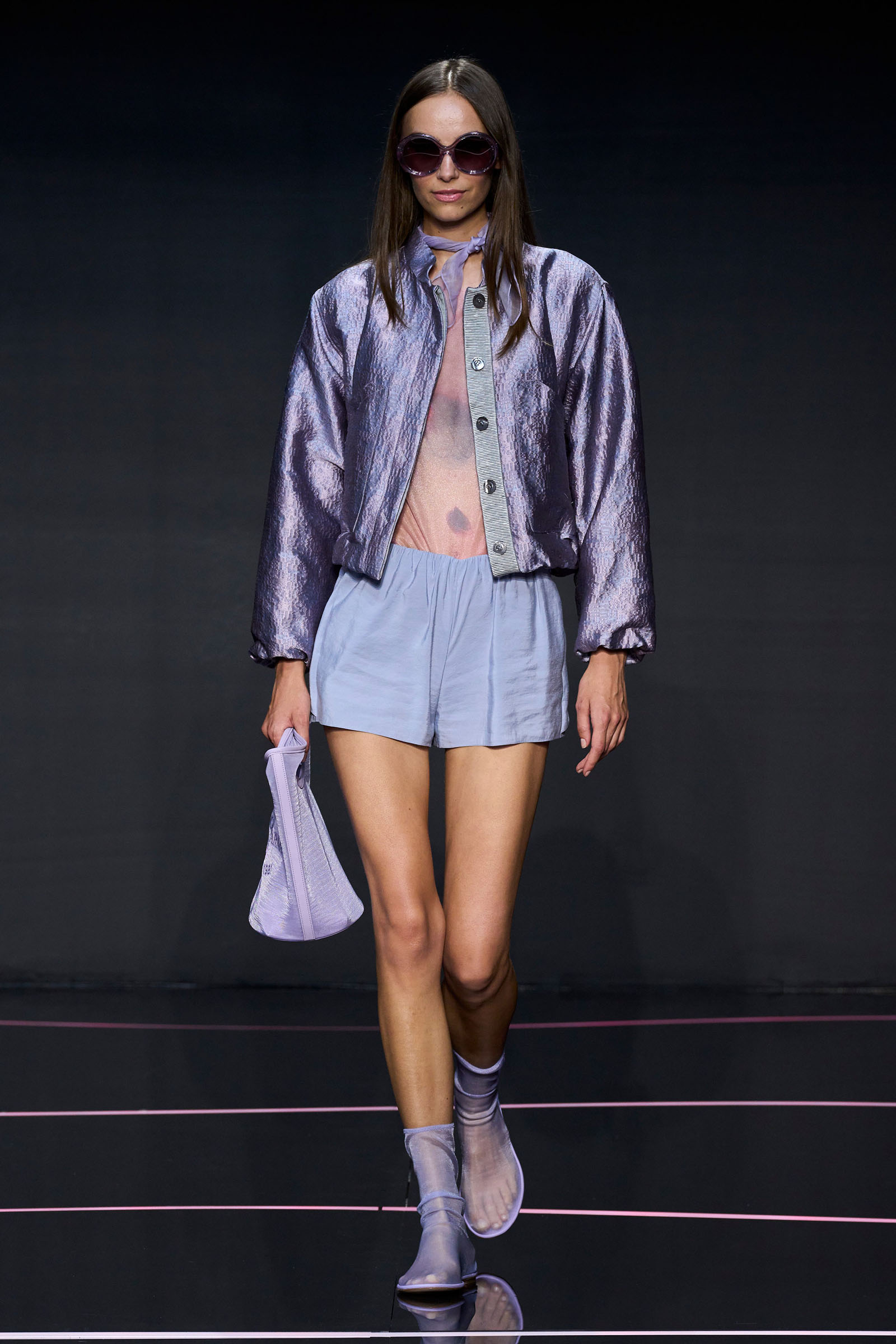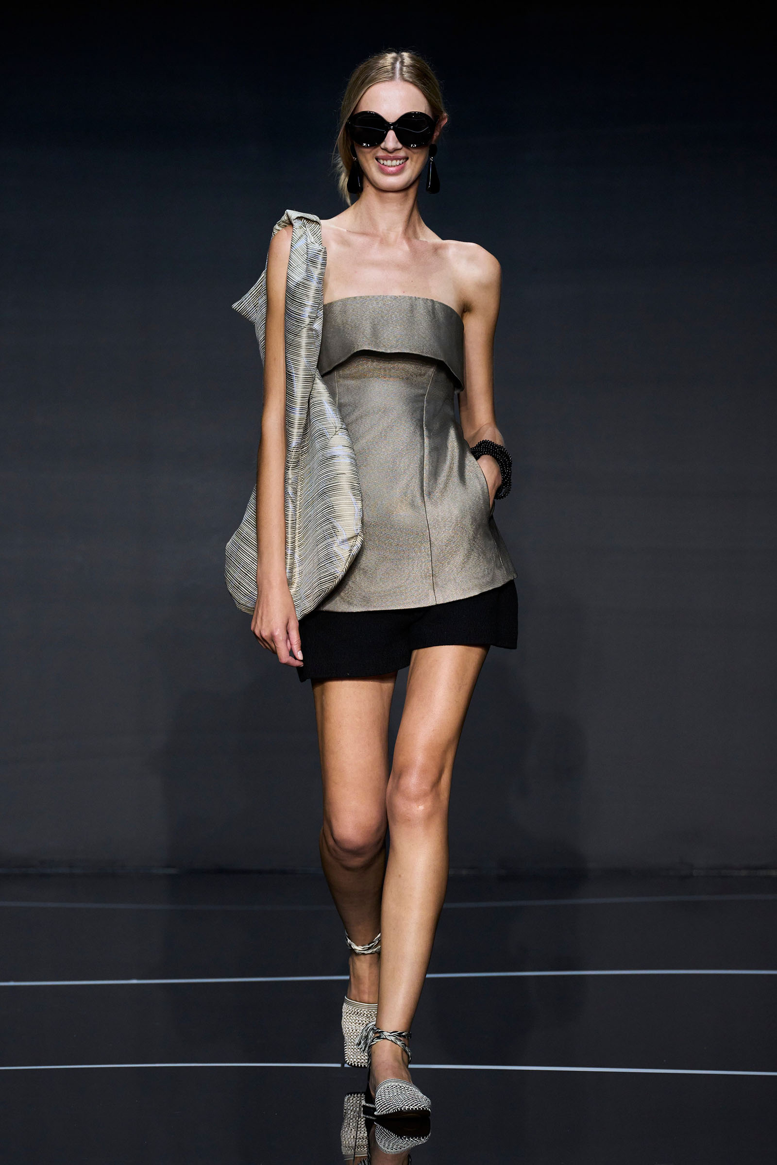 A wide-shoulder loose-skirt jacket in white tweed, a version of the Armani template that shifted the course of fashion at the same time Emporio launched, acted as the palate-cleansing opening look. It was worn above a crop top barely wider than a belt—that later was used as a belt—cinched with a large tortoiseshell square fastening and a pair of black pants and sandals. This was prototypic Armani styled with unpretentious ease. It was followed by a series of hammered metallic-jacquard looks, easy separates precisely defined. Gauzy shirts and overalls were worn over shorts and skirts. Those 1981 clutches aside, the models carried summer bags in loosely meshed leather.