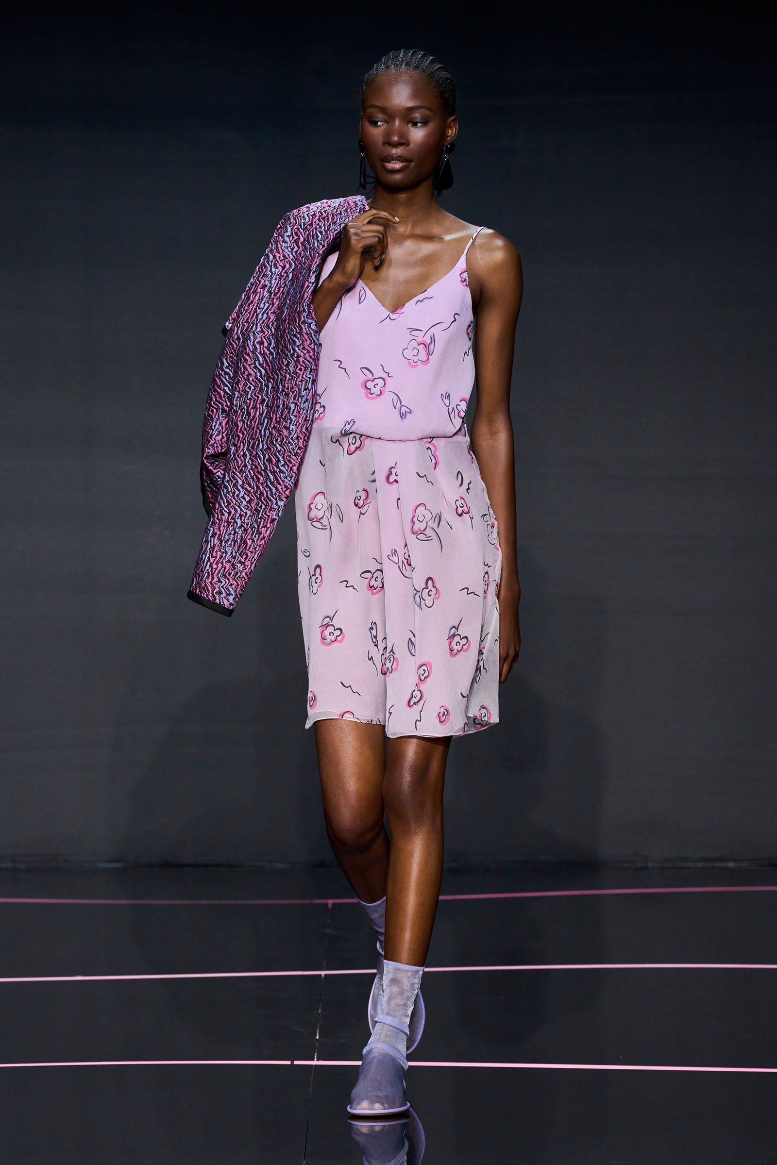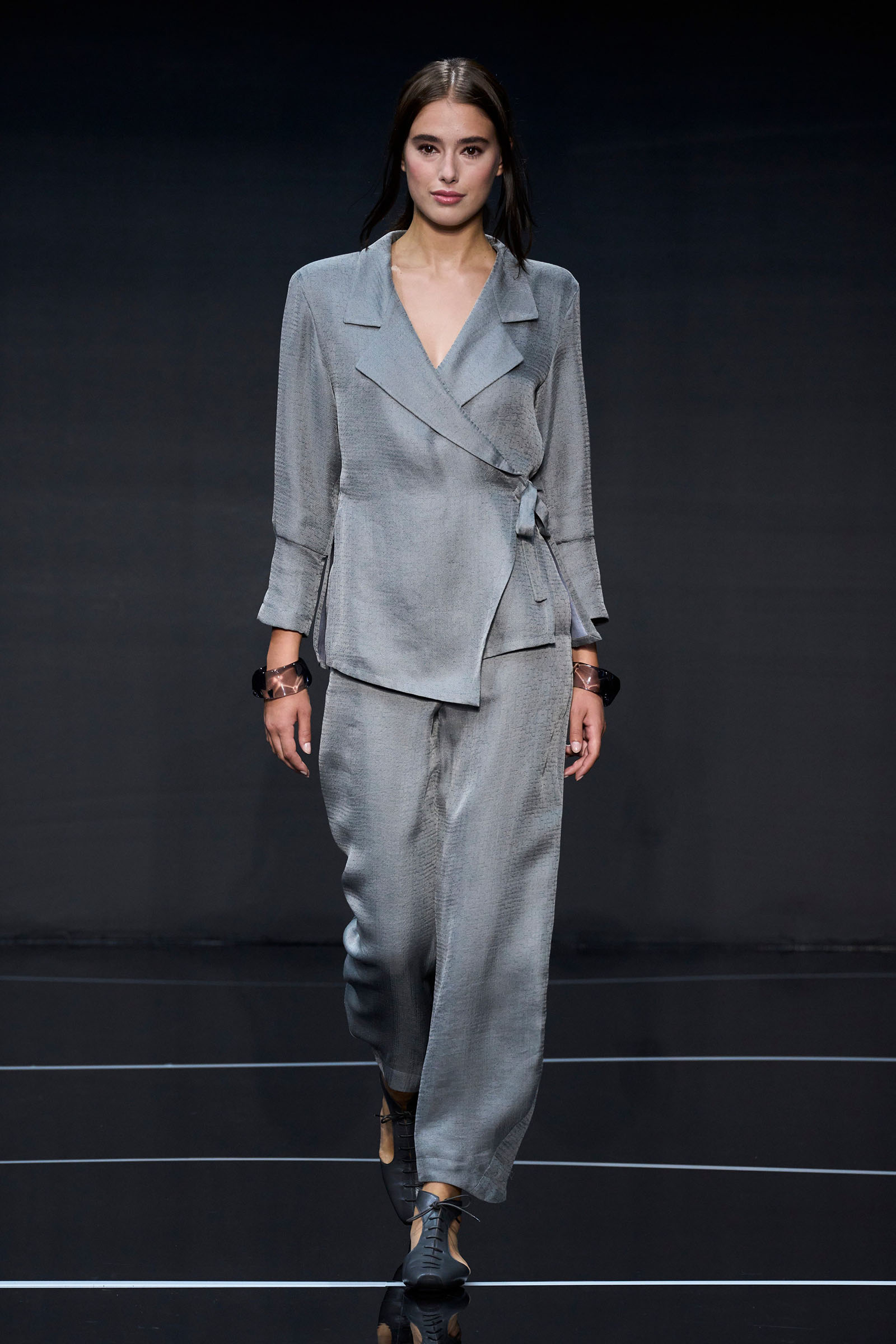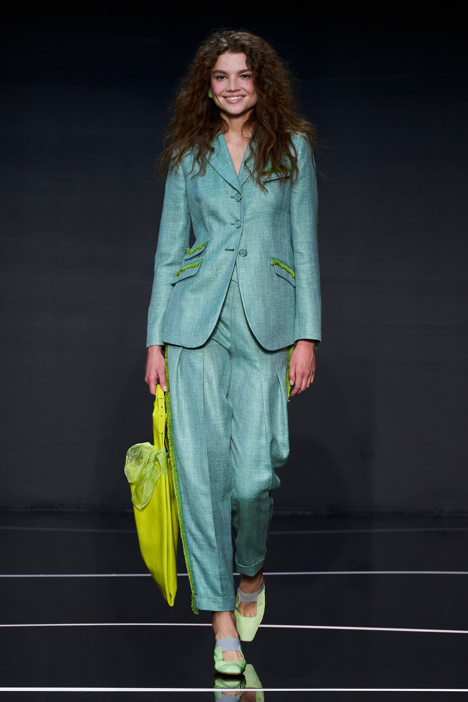 Outside Giorgio Armani’s teatro on Via Tortona, a queue of at least 300 people waited patiently in the rain before this Emporio Armani show. It was glaringly obvious they weren’t fashion people because fashion people rarely queue patiently and never in the rain. Instead they were young Milanese waiting to collect packets of seeds and soil distributed from an electric Emporio-branded Piaggio Ape. This was part of a sustainability-driven partnership named Forestami, with the Polytechnic of Milan and the mayor’s office, that is working to rewild the city.