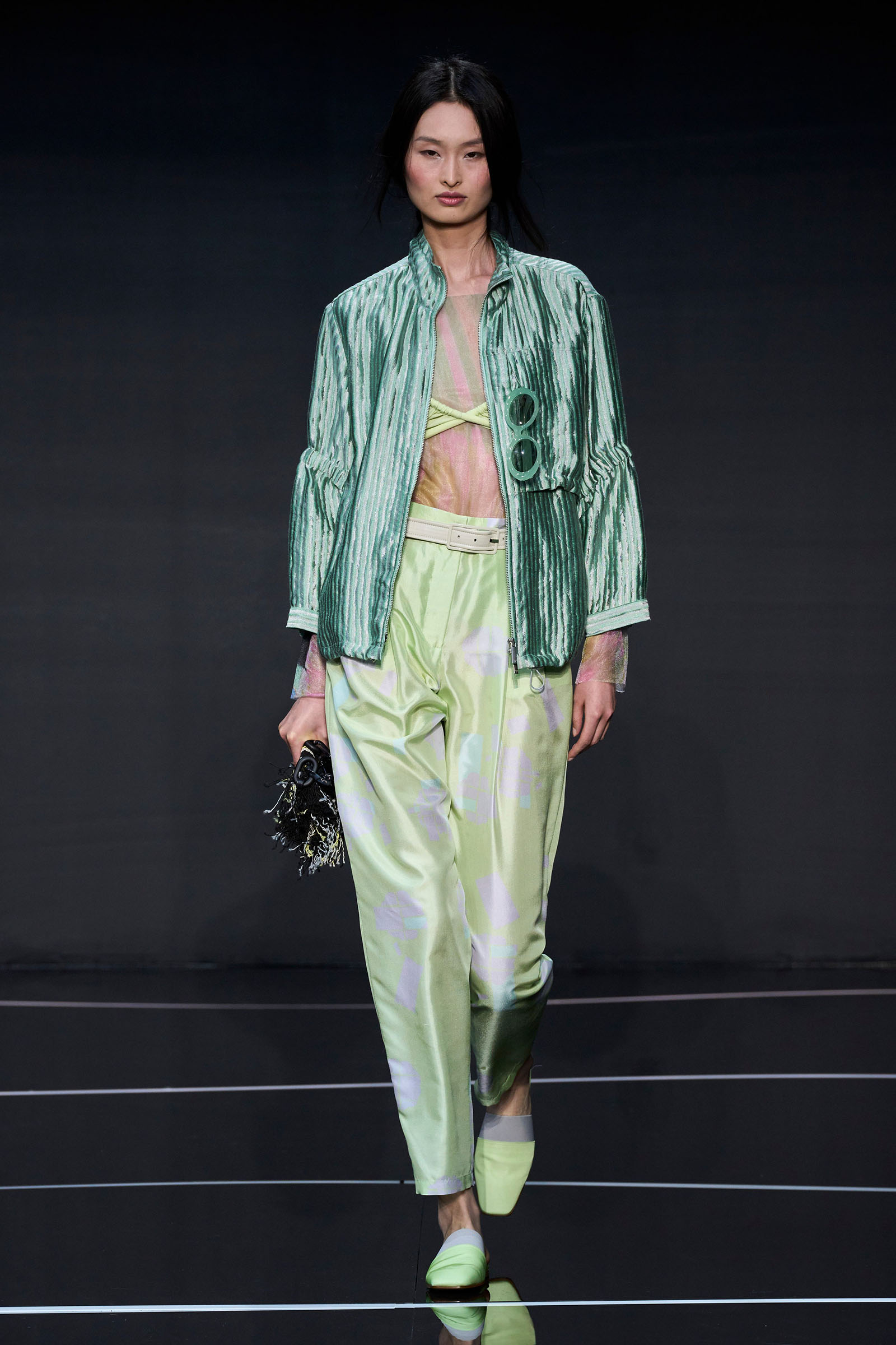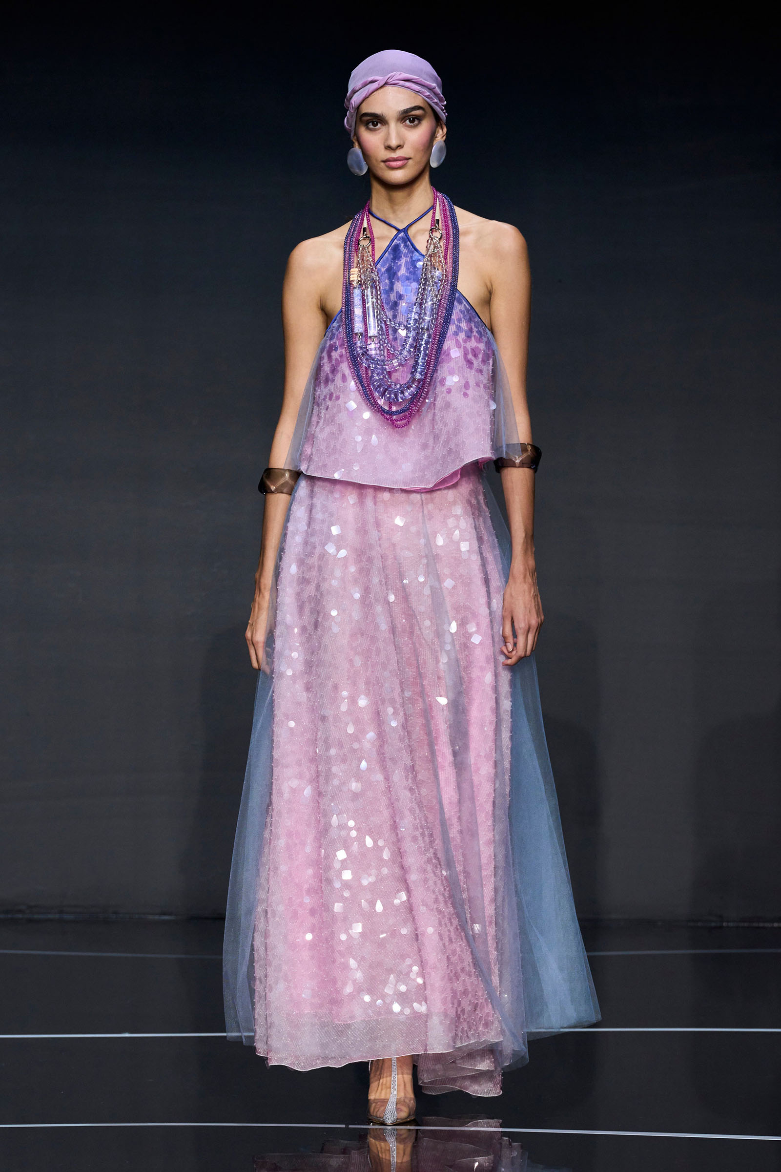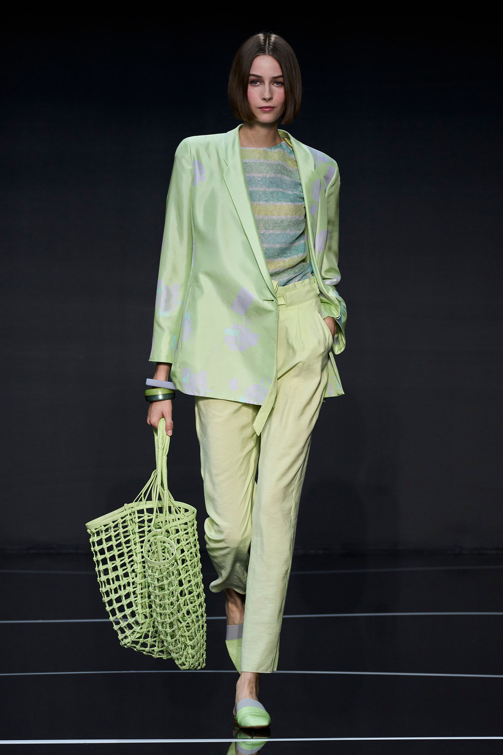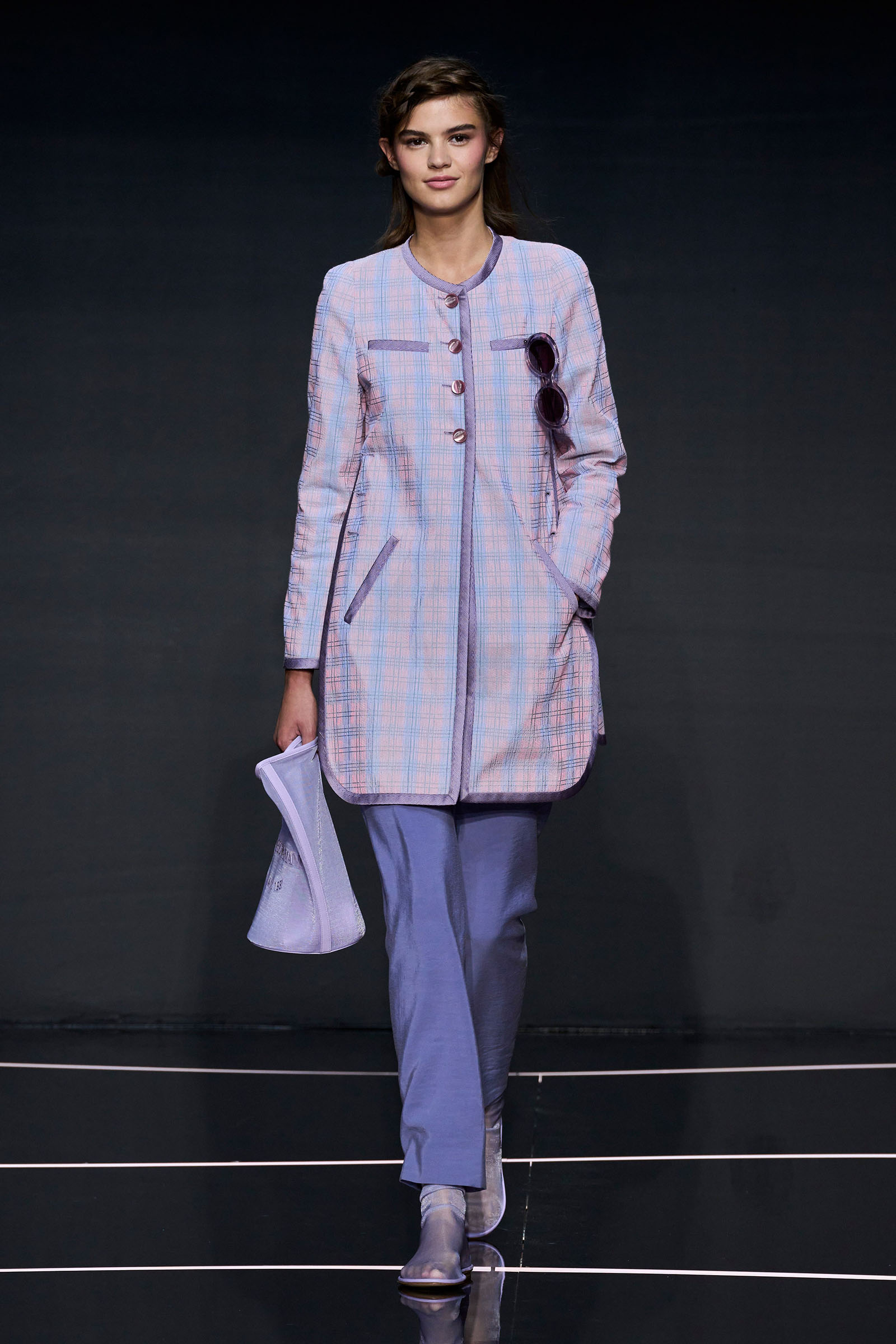 The color story segued from neutrals to a rainbow of ice cream shades. Light tailored jackets, sometimes double-breasted and patterned with mini chevrons, were fastened by strips of fabrics that doubled as belts. A suit in turquoise herringbone wool was lined with tufts of green wool. Split-yoke tunics, piped at the edges and checked, seemed drawn from the archives but felt fresh on the eye. The models in a closing section of colorful floor-length dresses and skirts teamed with heaped necklaces and headscarves returned at the end with Armani in their midst.