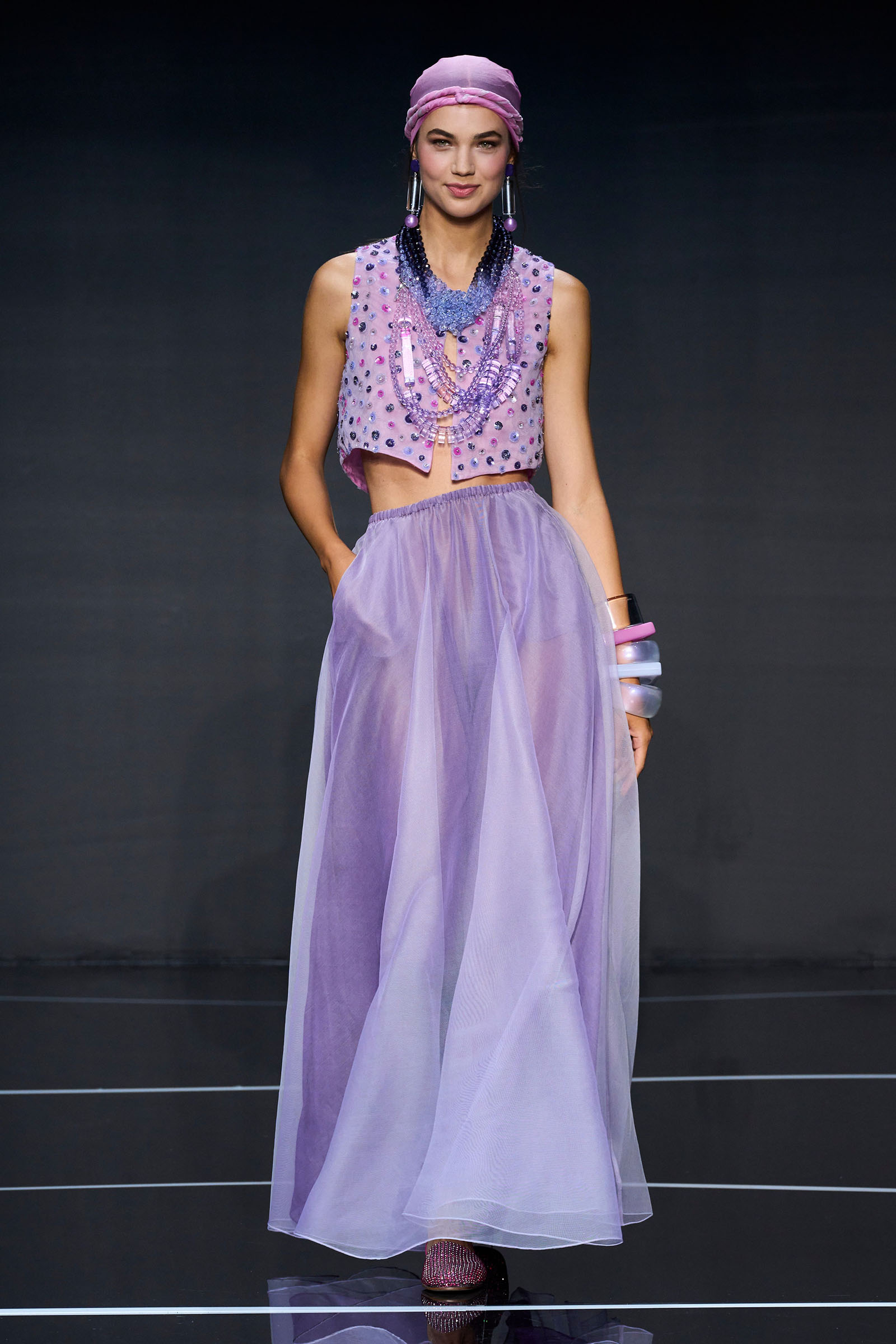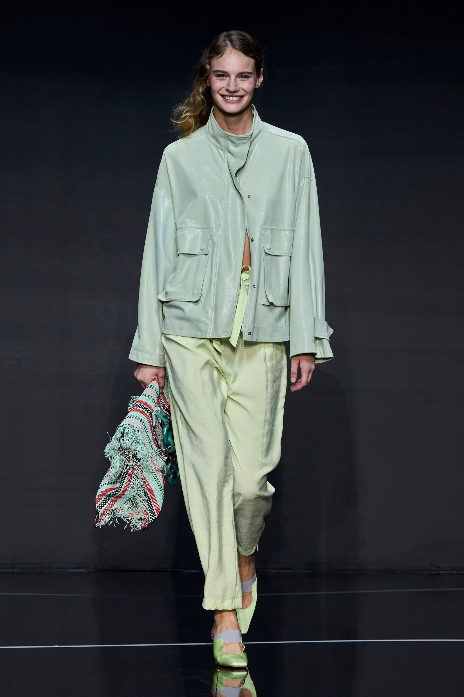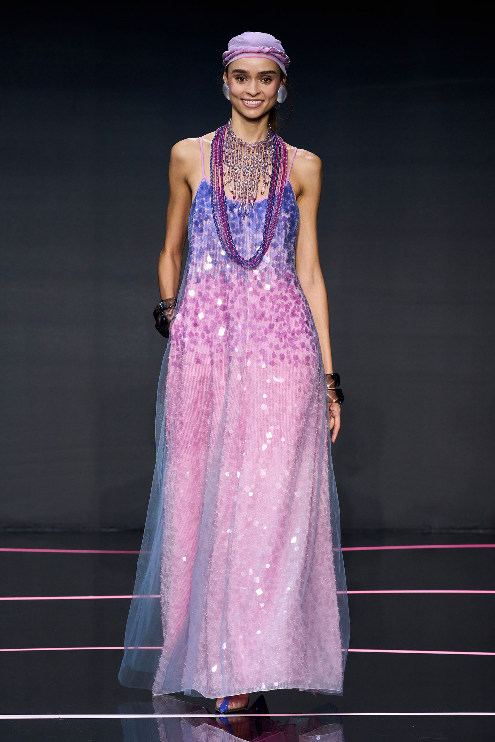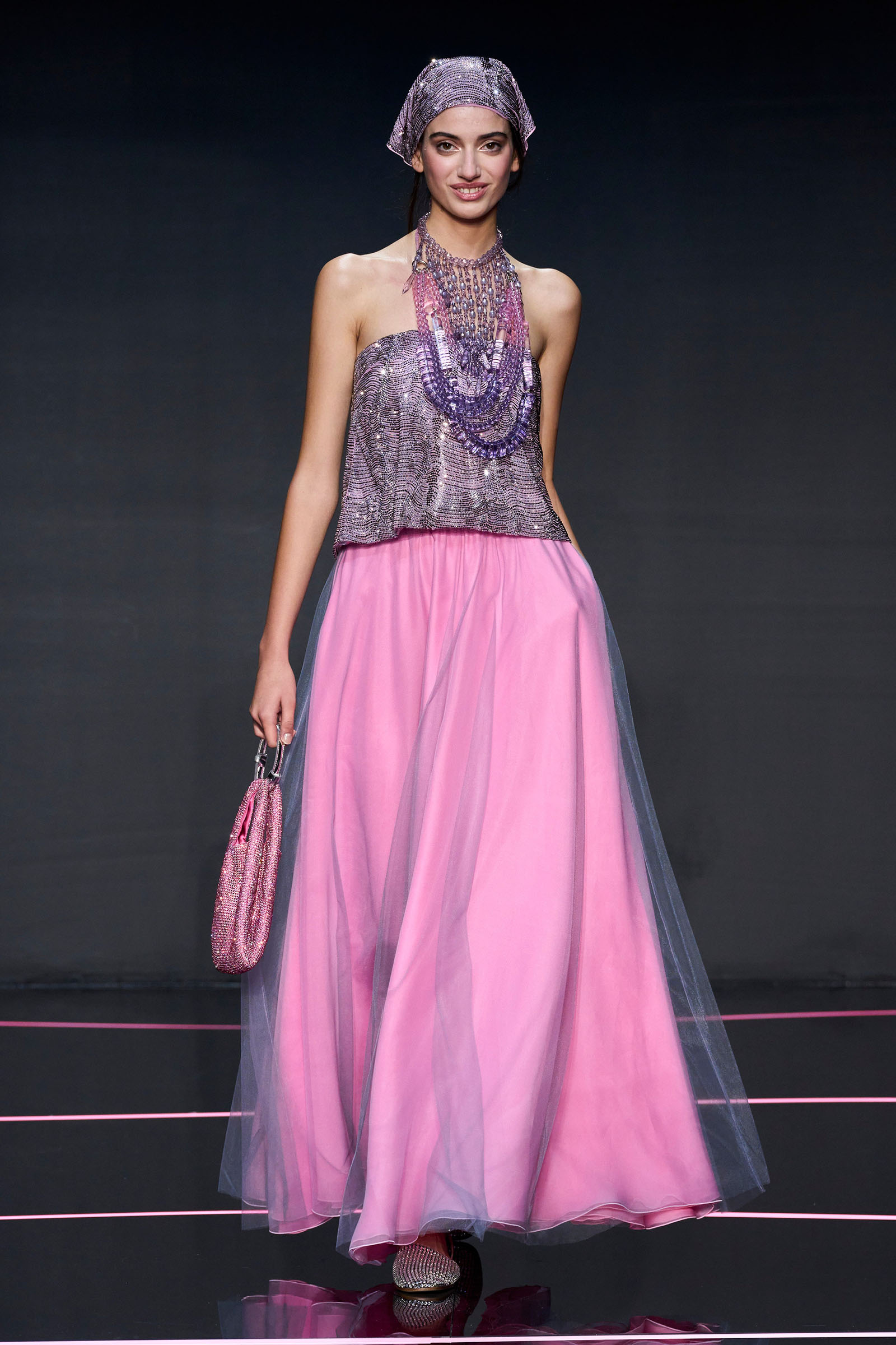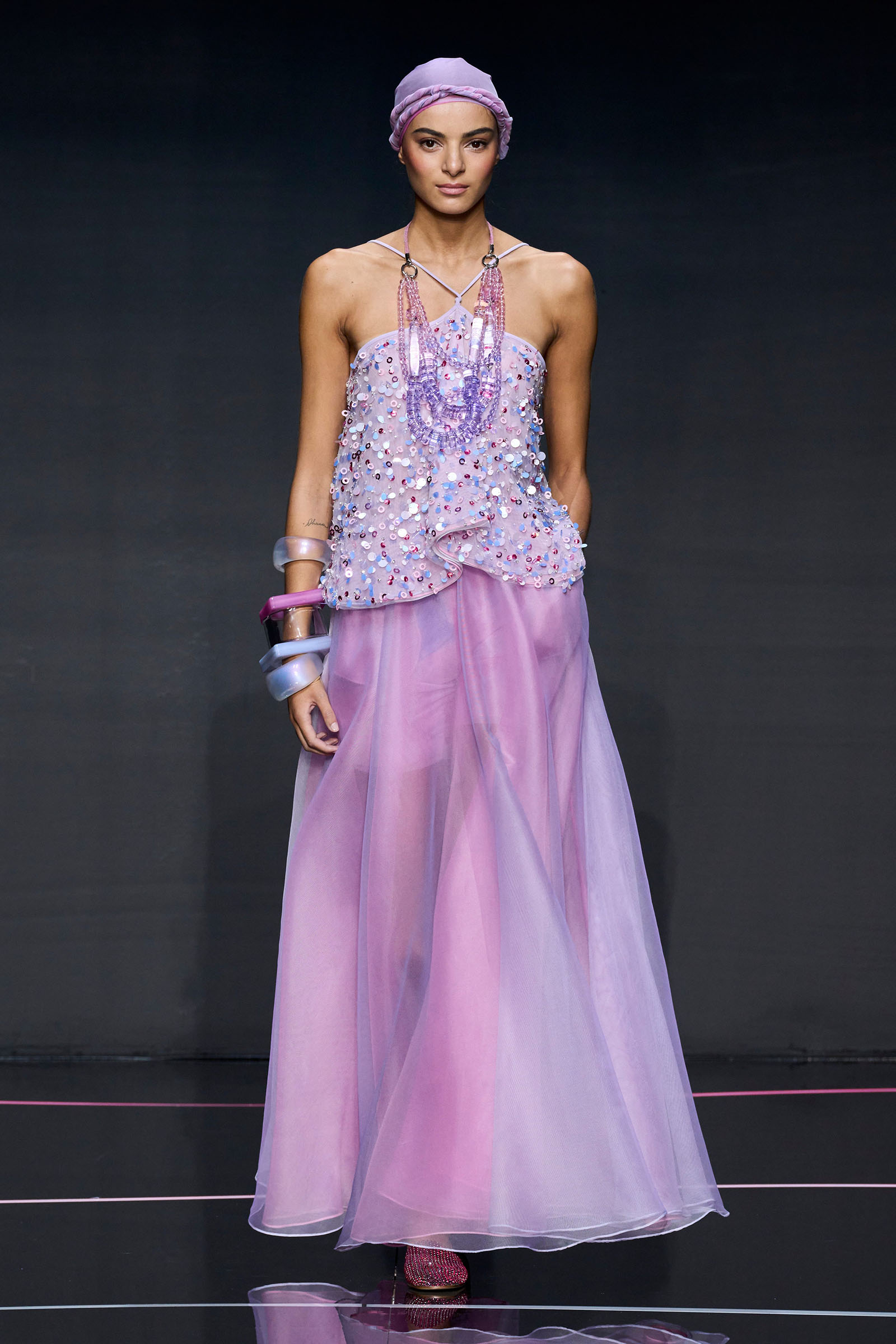 The color story segued from neutrals to a rainbow of ice cream shades. Light tailored jackets, sometimes double-breasted and patterned with mini chevrons, were fastened by strips of fabrics that doubled as belts. A suit in turquoise herringbone wool was lined with tufts of green wool. Split-yoke tunics, piped at the edges and checked, seemed drawn from the archives but felt fresh on the eye. The models in a closing section of colorful floor-length dresses and skirts teamed with heaped necklaces and headscarves returned at the end with Armani in their midst.