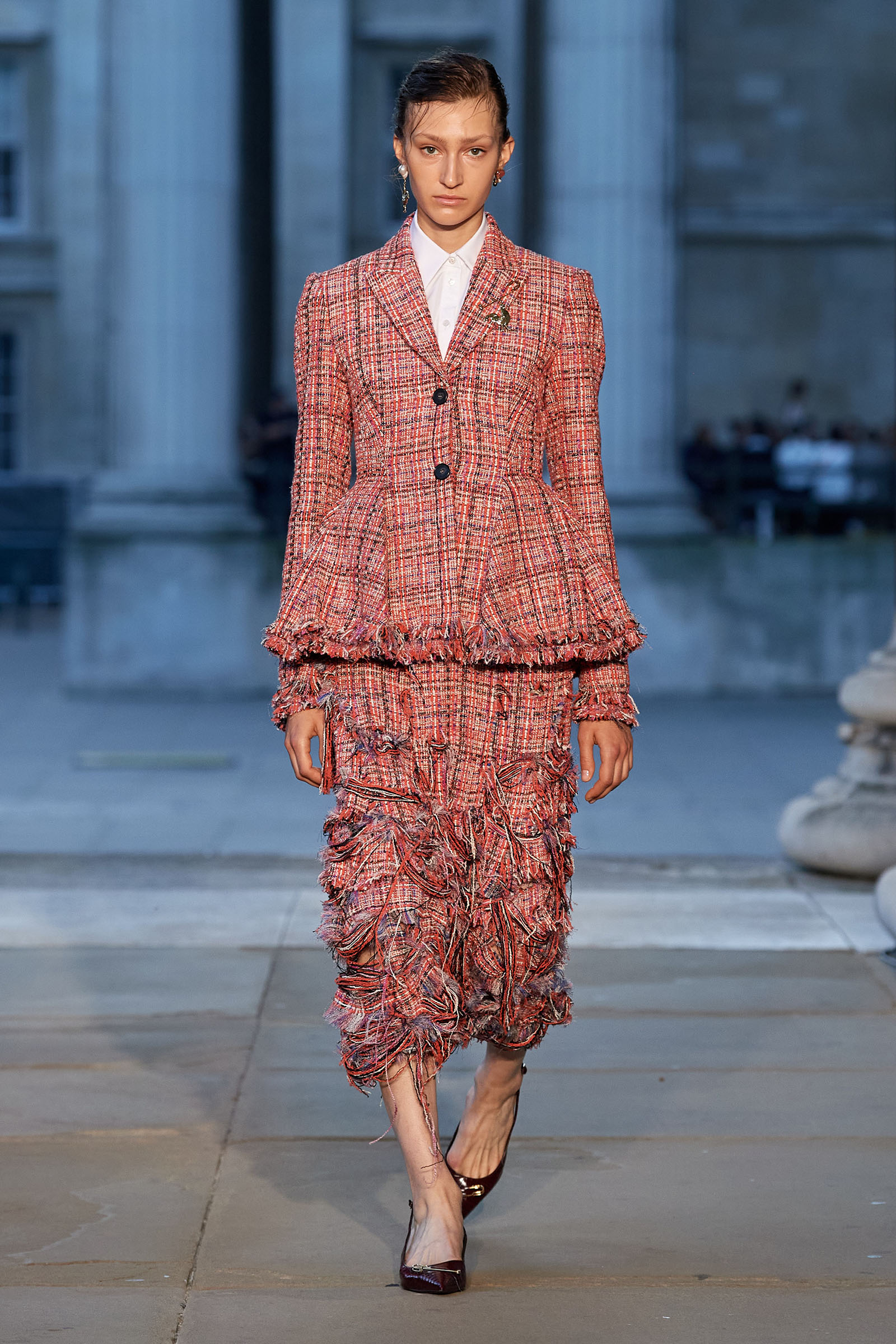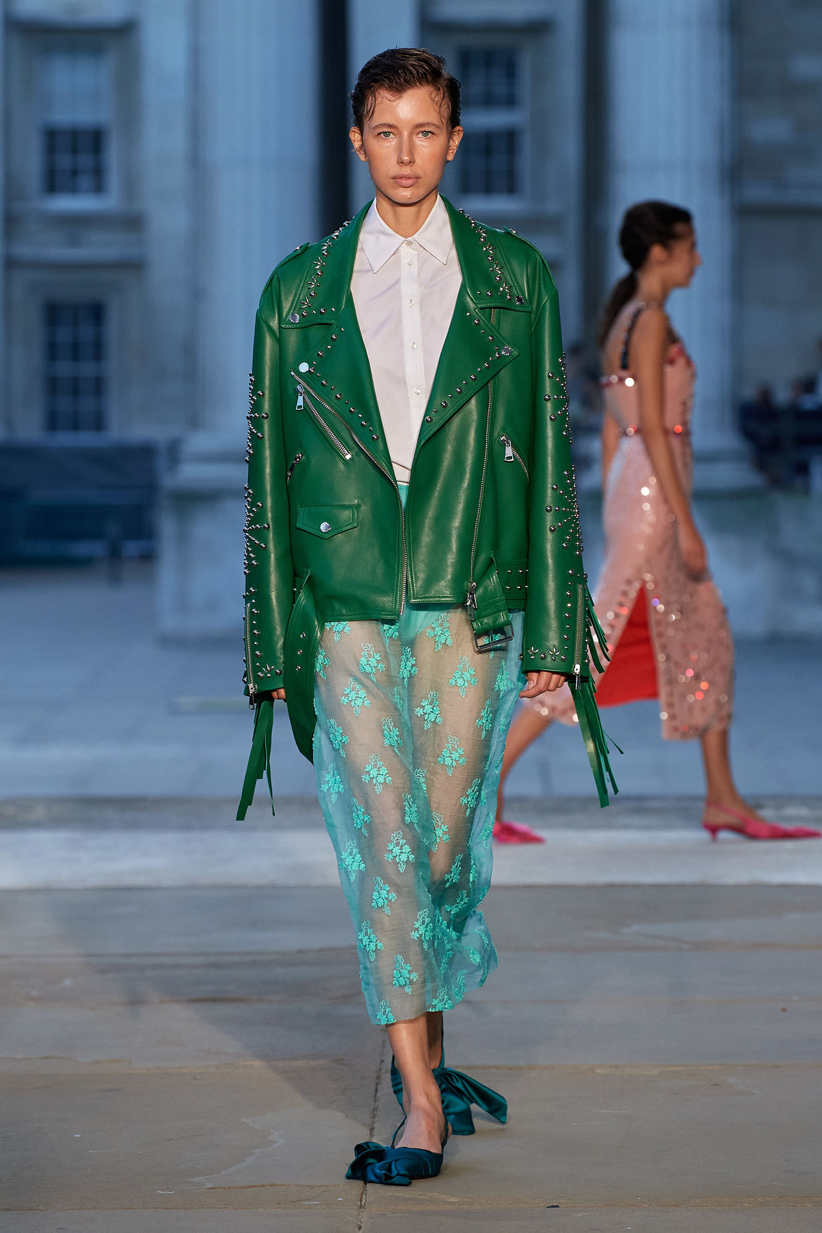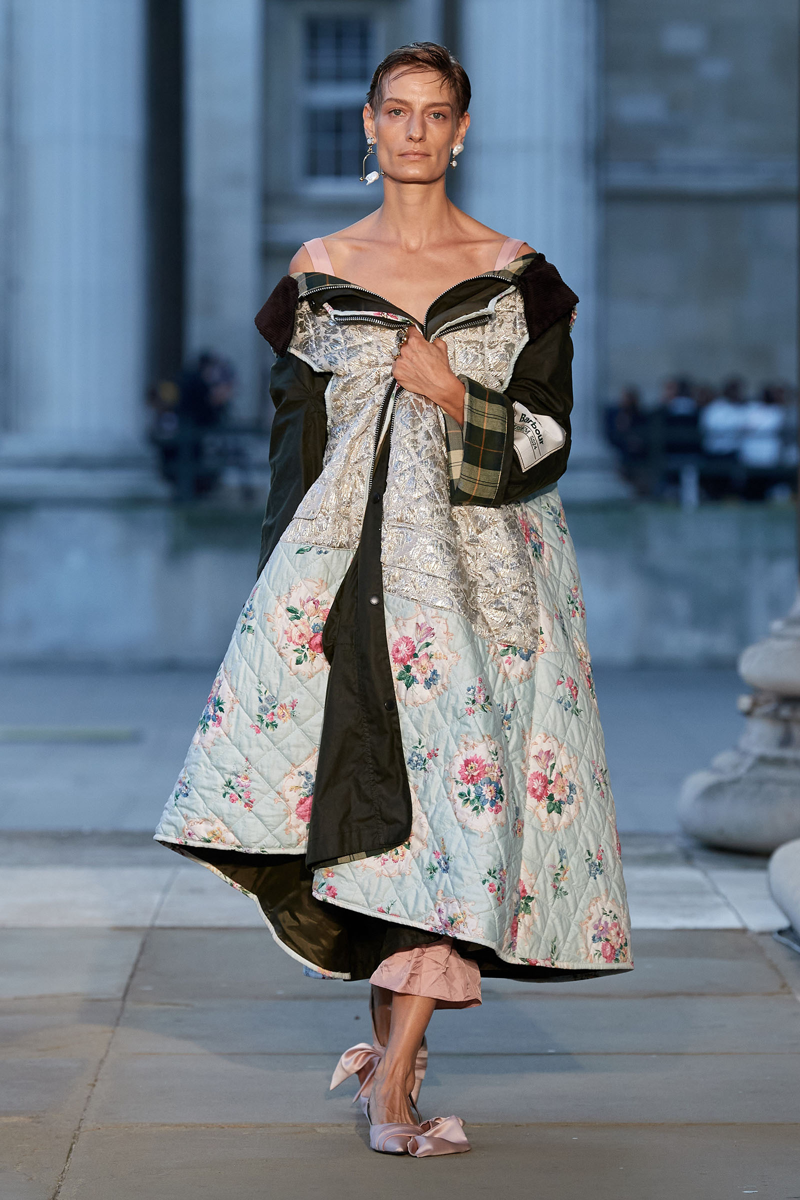 Some of Debo’s 1940s floral curtains even got whipped up into the skirts of his evening dresses—and, by the looks of it, into the gloriously chintzy fusion of Barbour waxed jacket and voluminous opera coat that opened his show at the British Museum. “I was lucky enough to work with the textile and jewelry archivists at Chatsworth, and with Helen Marchant, [Debo’s] former private secretary,” he said. His research within Debo’s wardobe, formal portraits, family snaps, and the house itself blended into a collection where richly tattered fabrics—as if gently decayed over centuries—were mixed up with all manner of full-skirted, vivid-print frocks; jeweled lingerie dresses; kilt suits; unraveling tweeds; and Elvis-tribute, rock-and-roll, crystal-studded leather jackets.