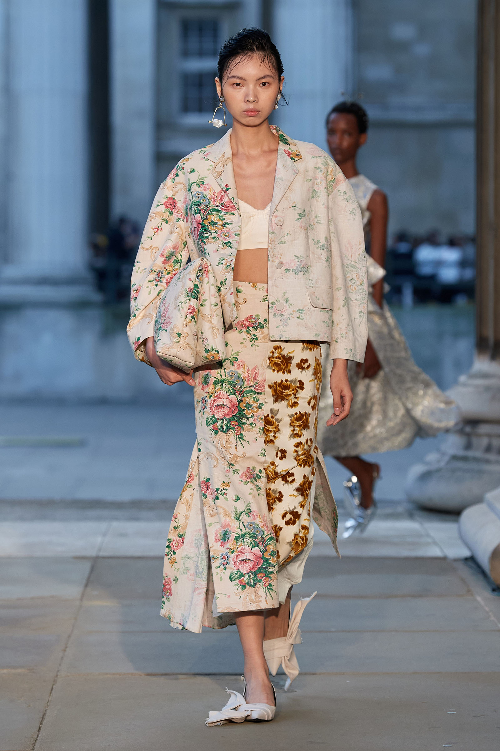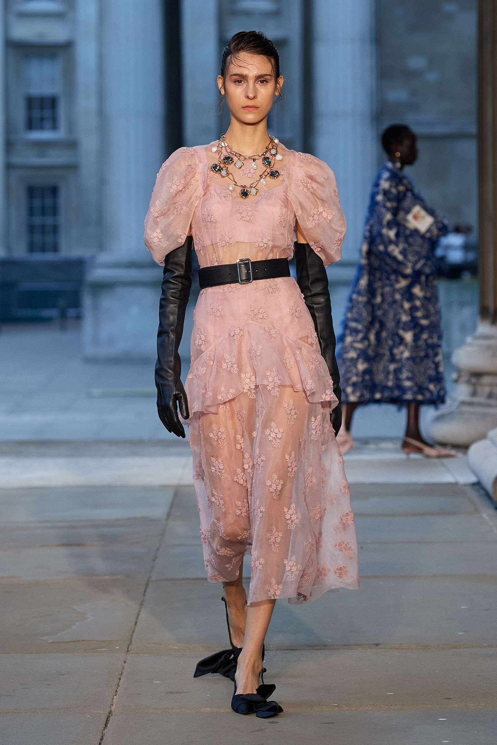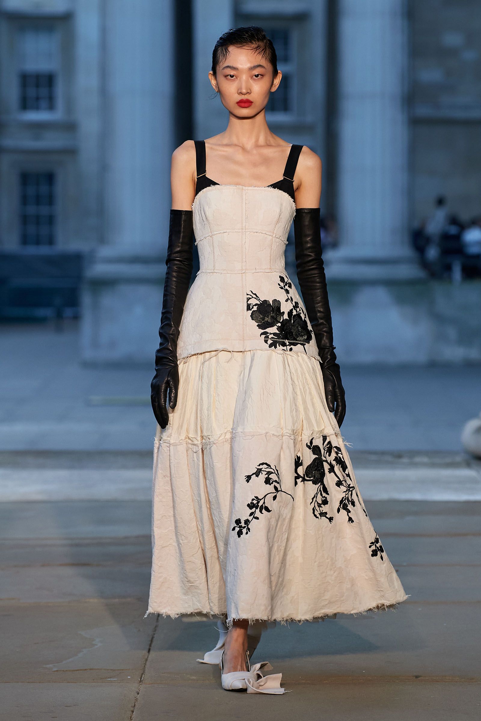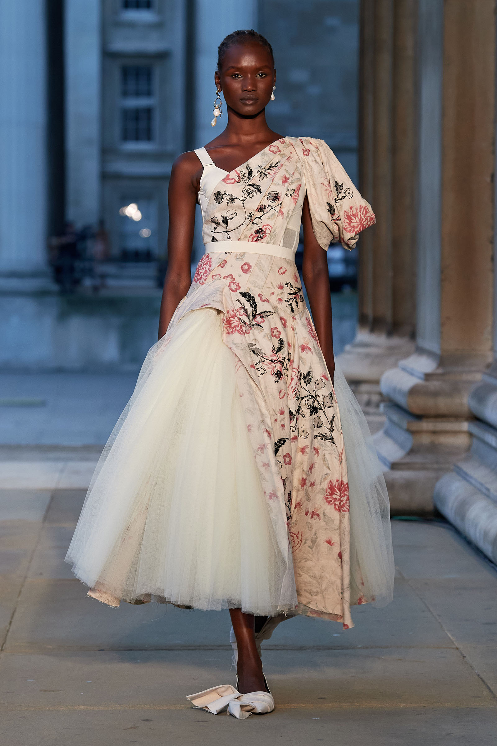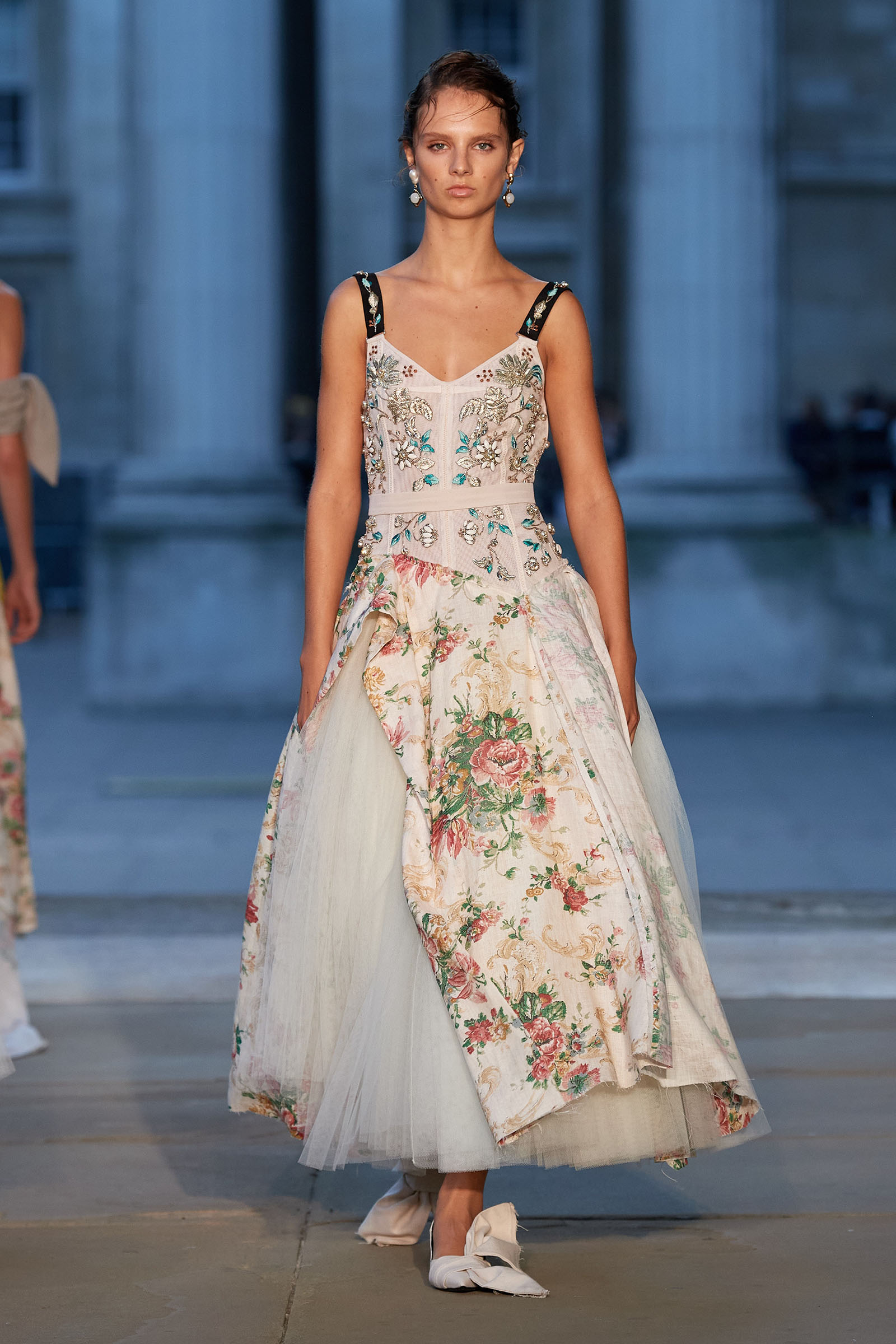 Was there a bit of Mitfordian wit when it came to the shoes too? Something about the floppy fabric bows on the toes started to raise the possibility that Moralioglu might actually have been referencing the feathered feet of rare-chicken breeds—another of Debo’s great hobbies. There was serious chic involved as well, though, and an important sense of things being passed down, altered, and reused by each generation. At the end, when the antique flowery cotton drapes got mixed up in tulle ball skirts, there was yet another family contribution to the mix—some black lace embroidery hand-done by Stella Tennant’s daughter, Cecily Lasnet, Debo’s great-granddaughter.