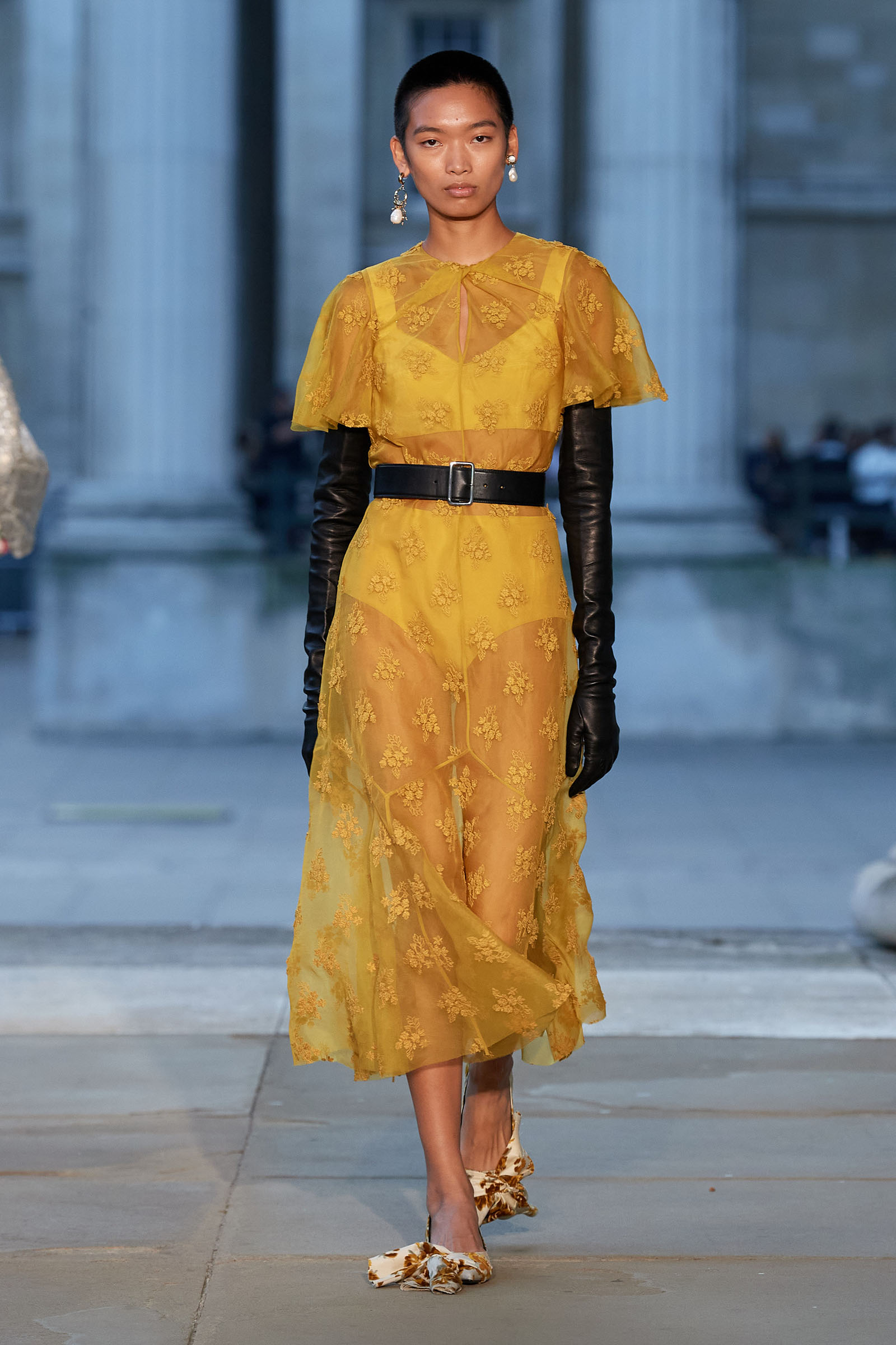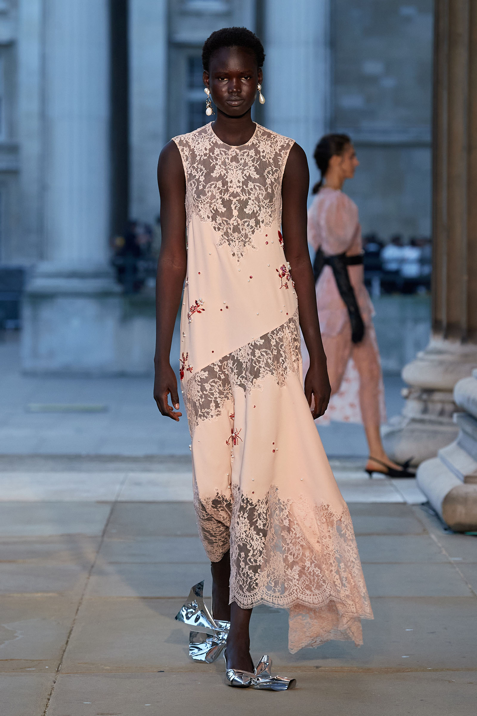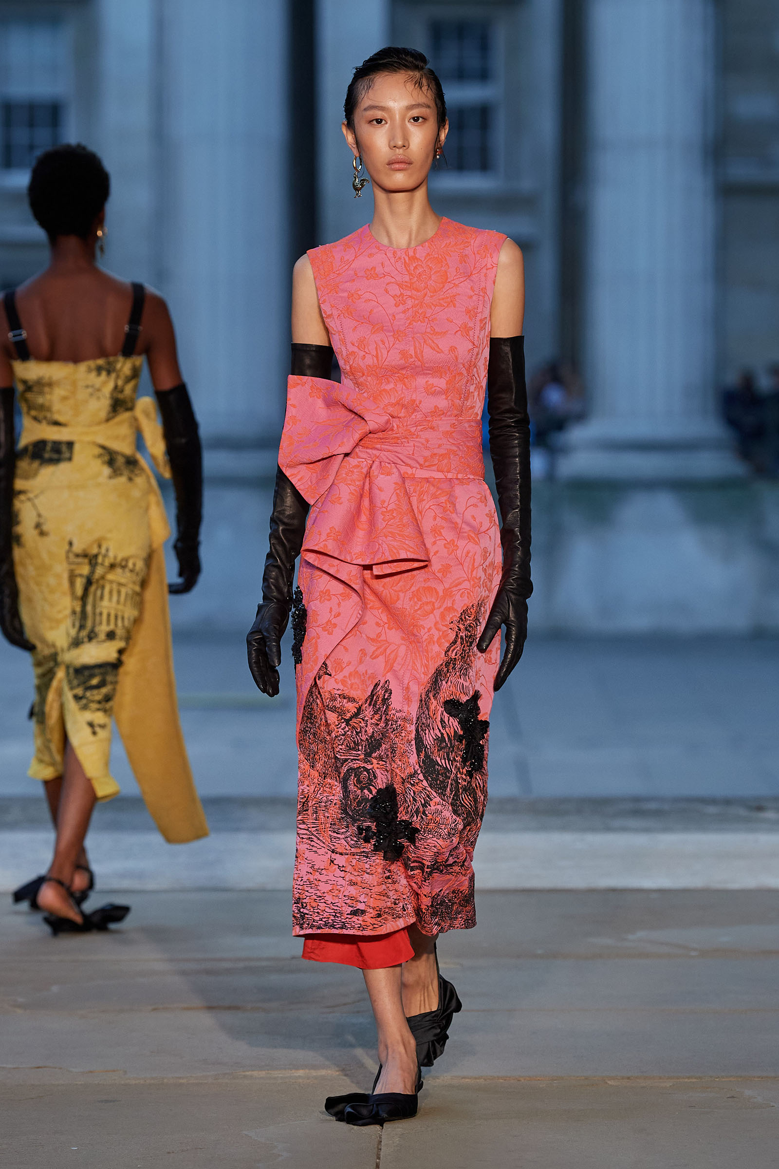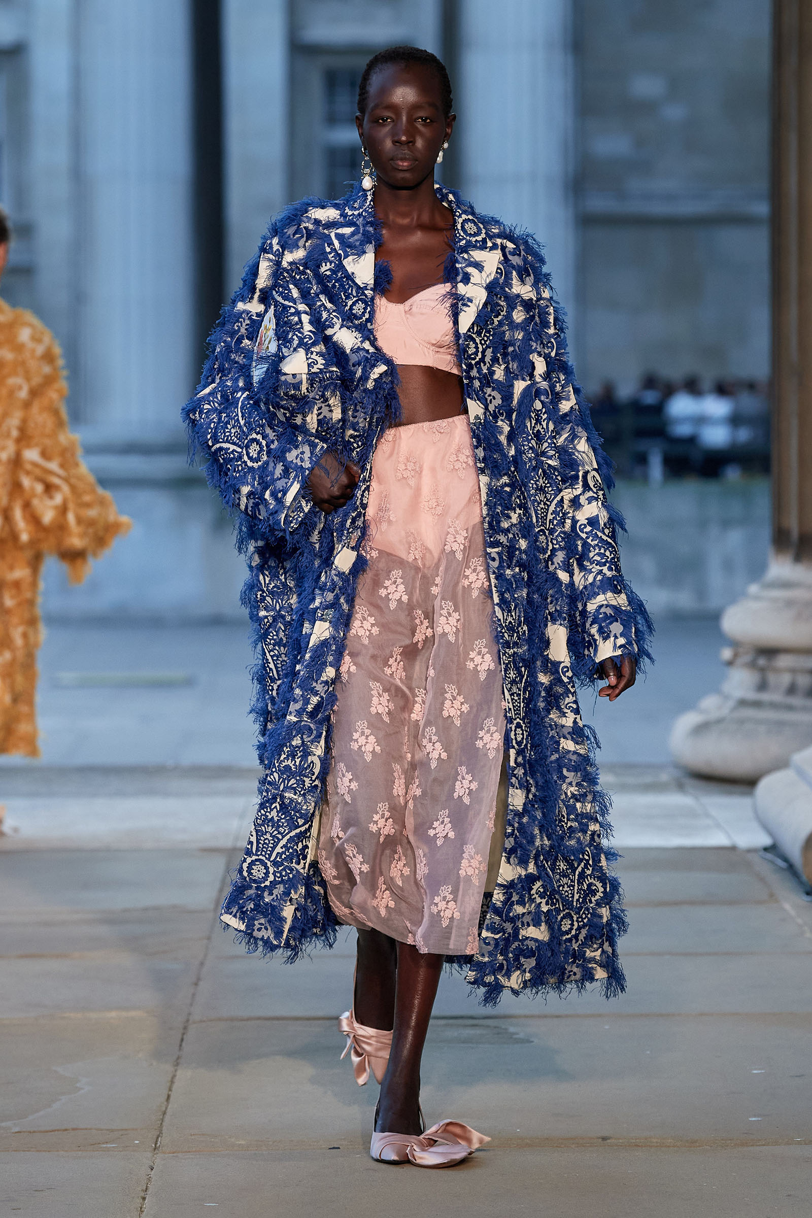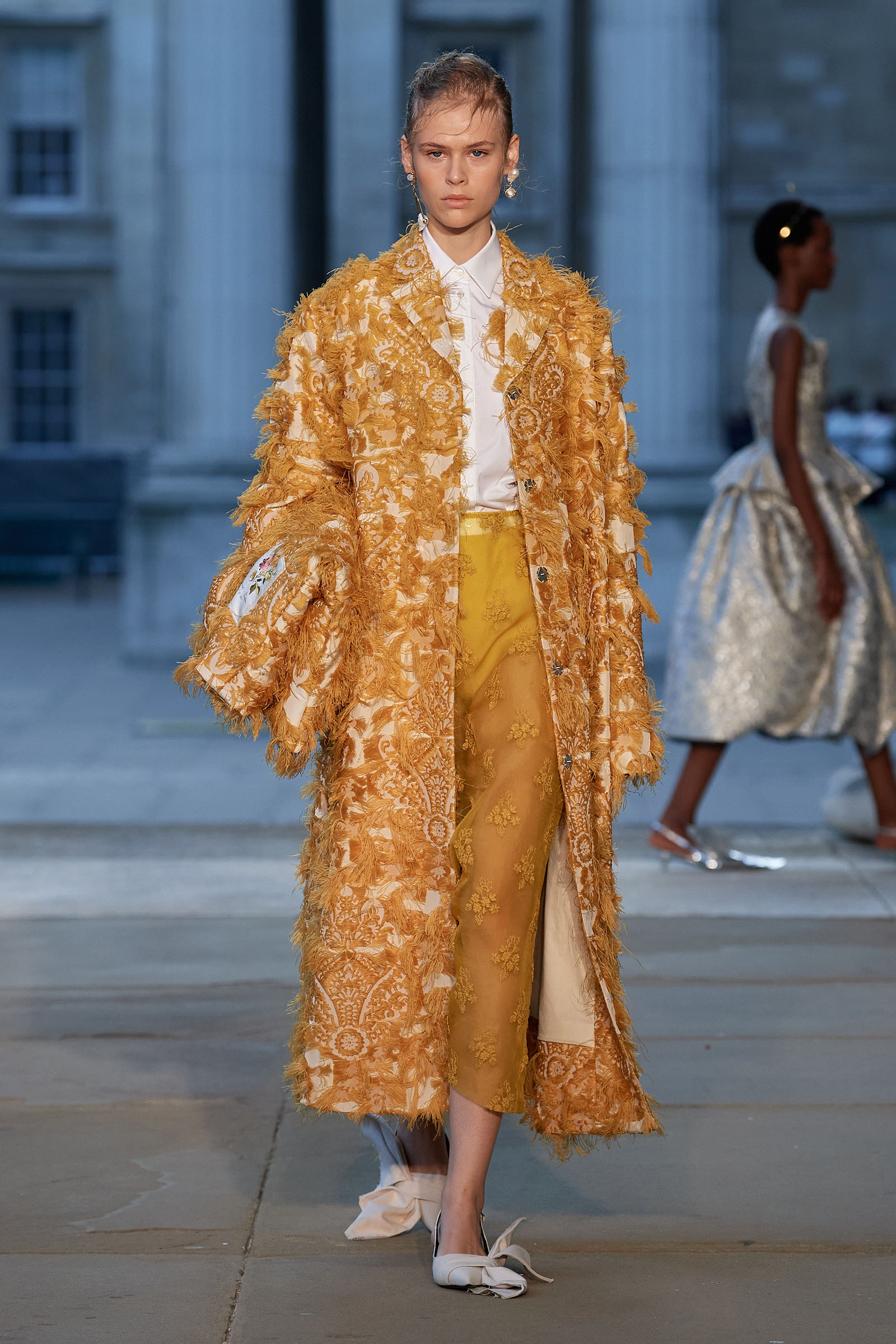 Was there a bit of Mitfordian wit when it came to the shoes too? Something about the floppy fabric bows on the toes started to raise the possibility that Moralioglu might actually have been referencing the feathered feet of rare-chicken breeds—another of Debo’s great hobbies. There was serious chic involved as well, though, and an important sense of things being passed down, altered, and reused by each generation. At the end, when the antique flowery cotton drapes got mixed up in tulle ball skirts, there was yet another family contribution to the mix—some black lace embroidery hand-done by Stella Tennant’s daughter, Cecily Lasnet, Debo’s great-granddaughter.