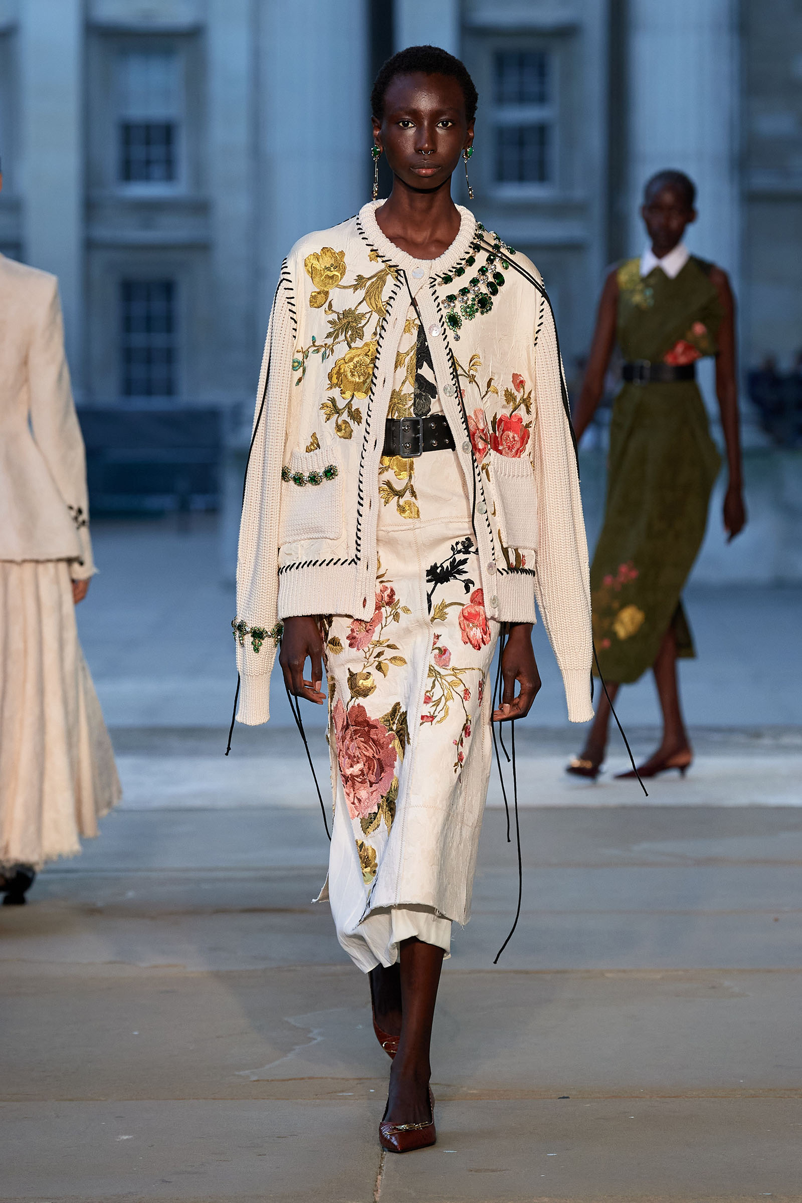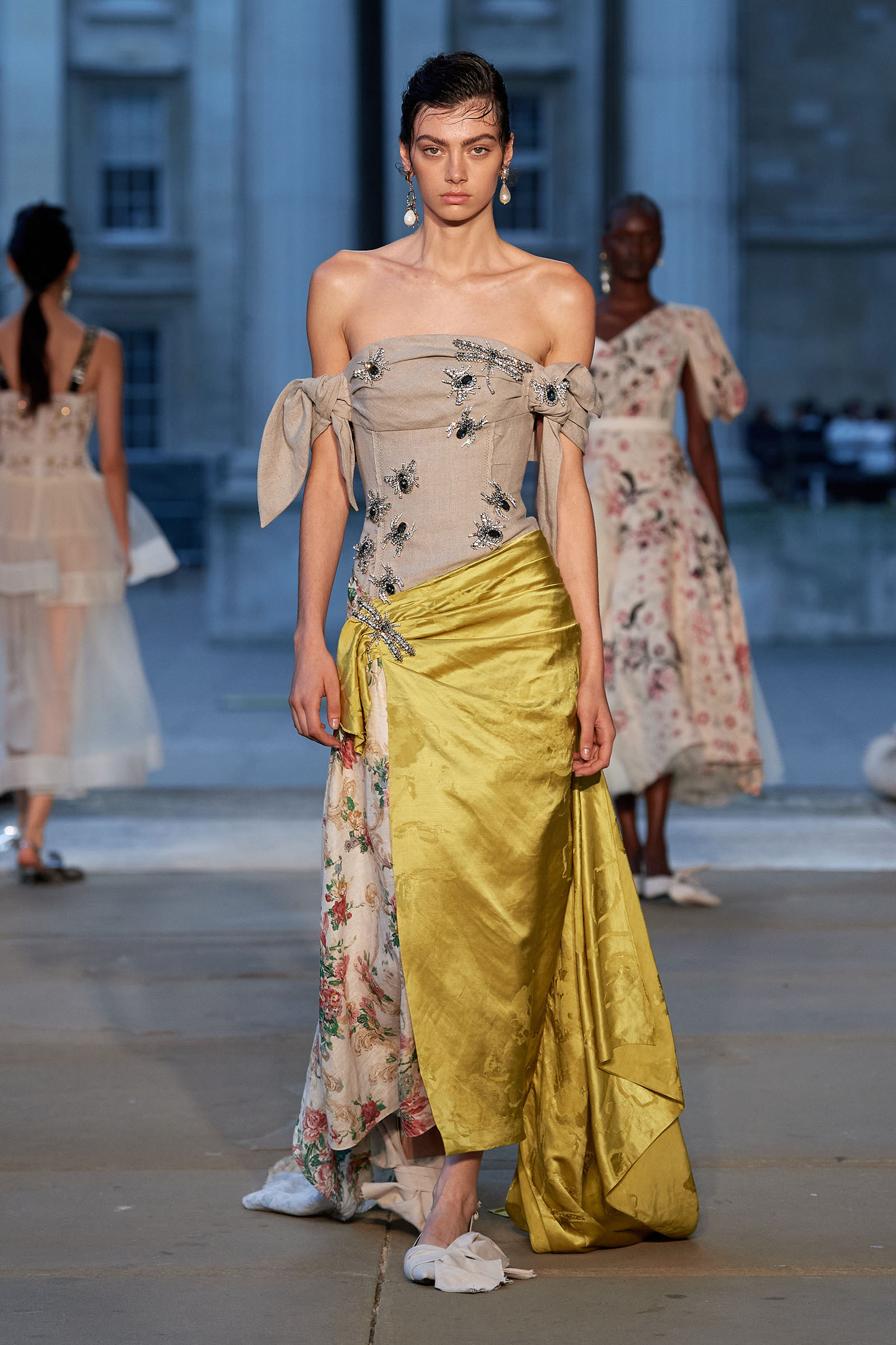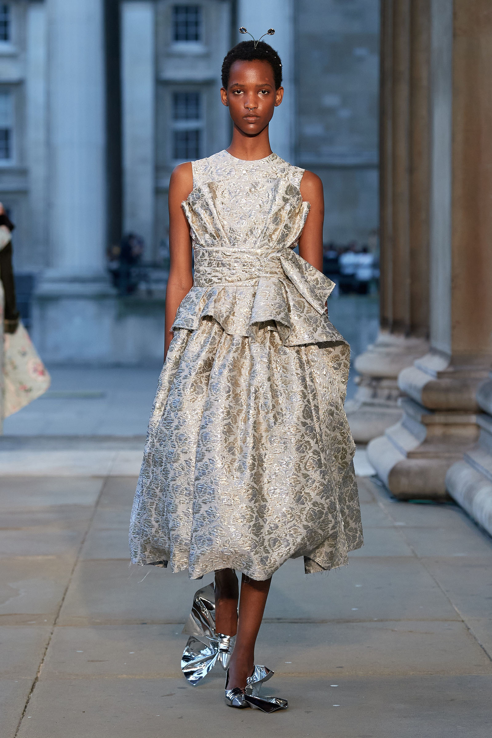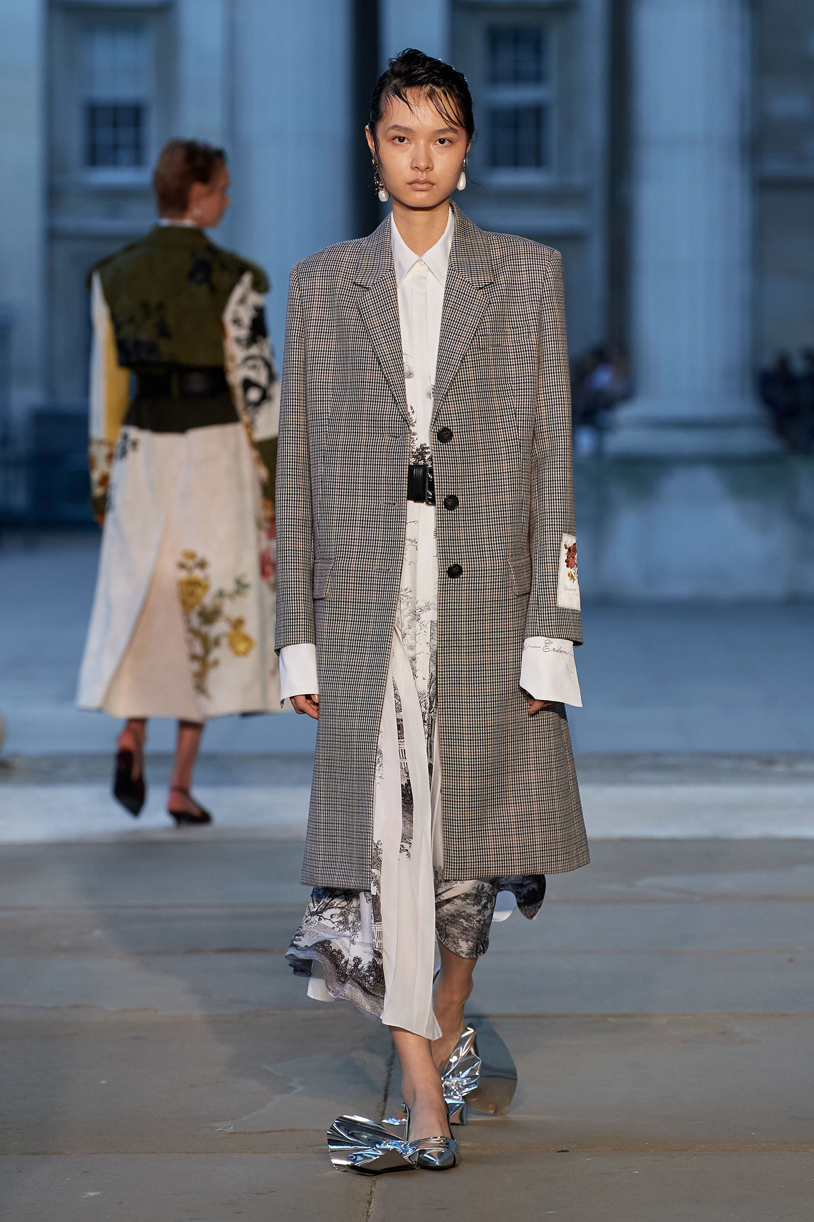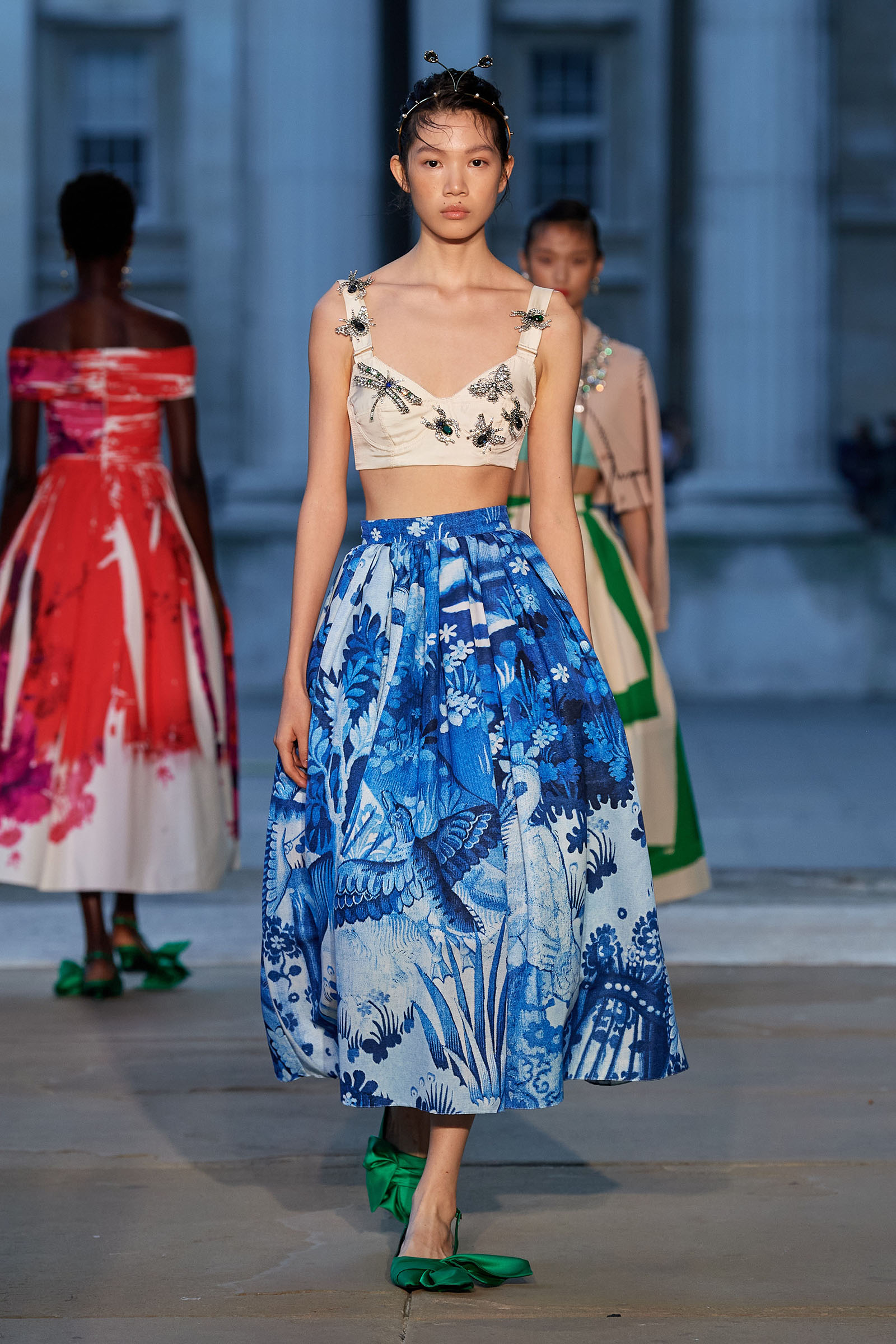 It was peak Erdem, of course. The biographies of strong and unconventional women have always informed the background of the designer’s best work—and this subject, as aristocratic a chatelaine and hostess as they come, was also a robustly practical countrywoman and, as he put it, “a strict proponent of make do and mend.” Debo’s brisk organizing abilities helped save the house after steep death duties brought about the sale to the nation of the 15th-century Devonshire Hunting Tapestries (now hanging in the V&A). A blown-up image of the medieval scenery was there today in a blue and white printed dirndl. Her quirky penchant for collecting bug jewelry—which she passed on to her granddaughter Stella Tennant—was caught in dragonfly brooches and a two-pronged tiara that looked just like a pair of insect antennae.