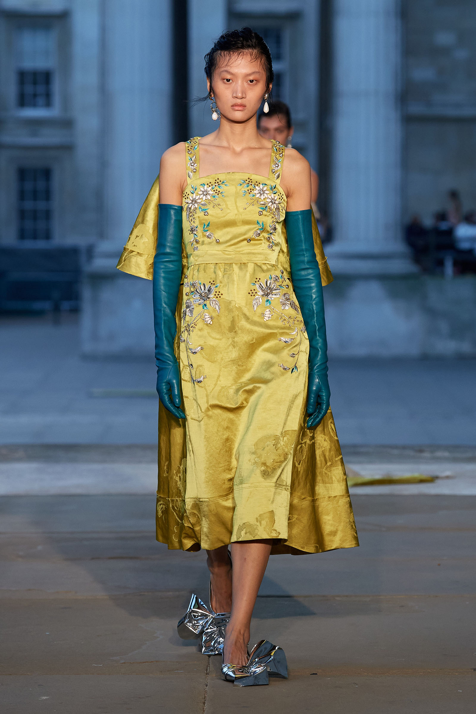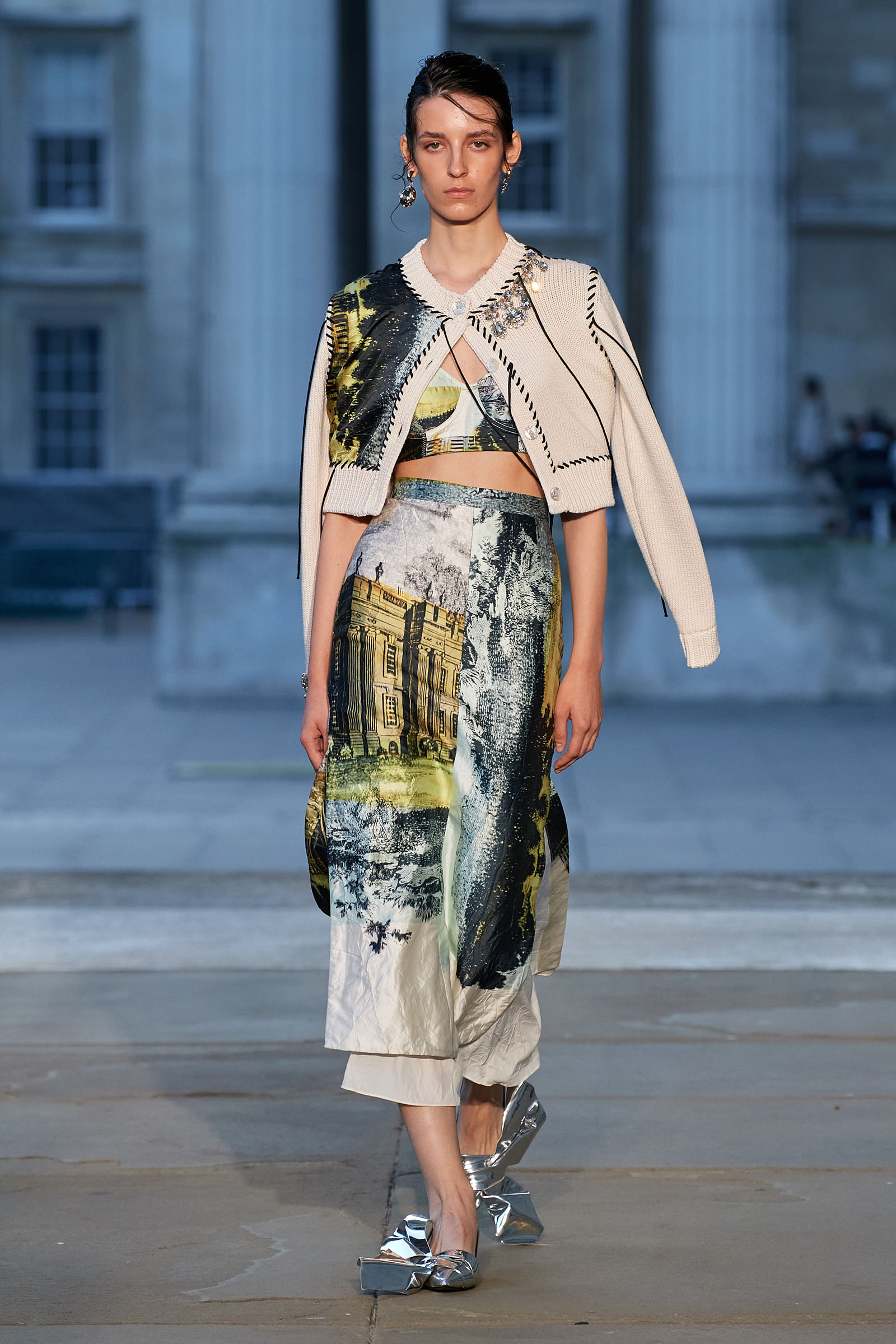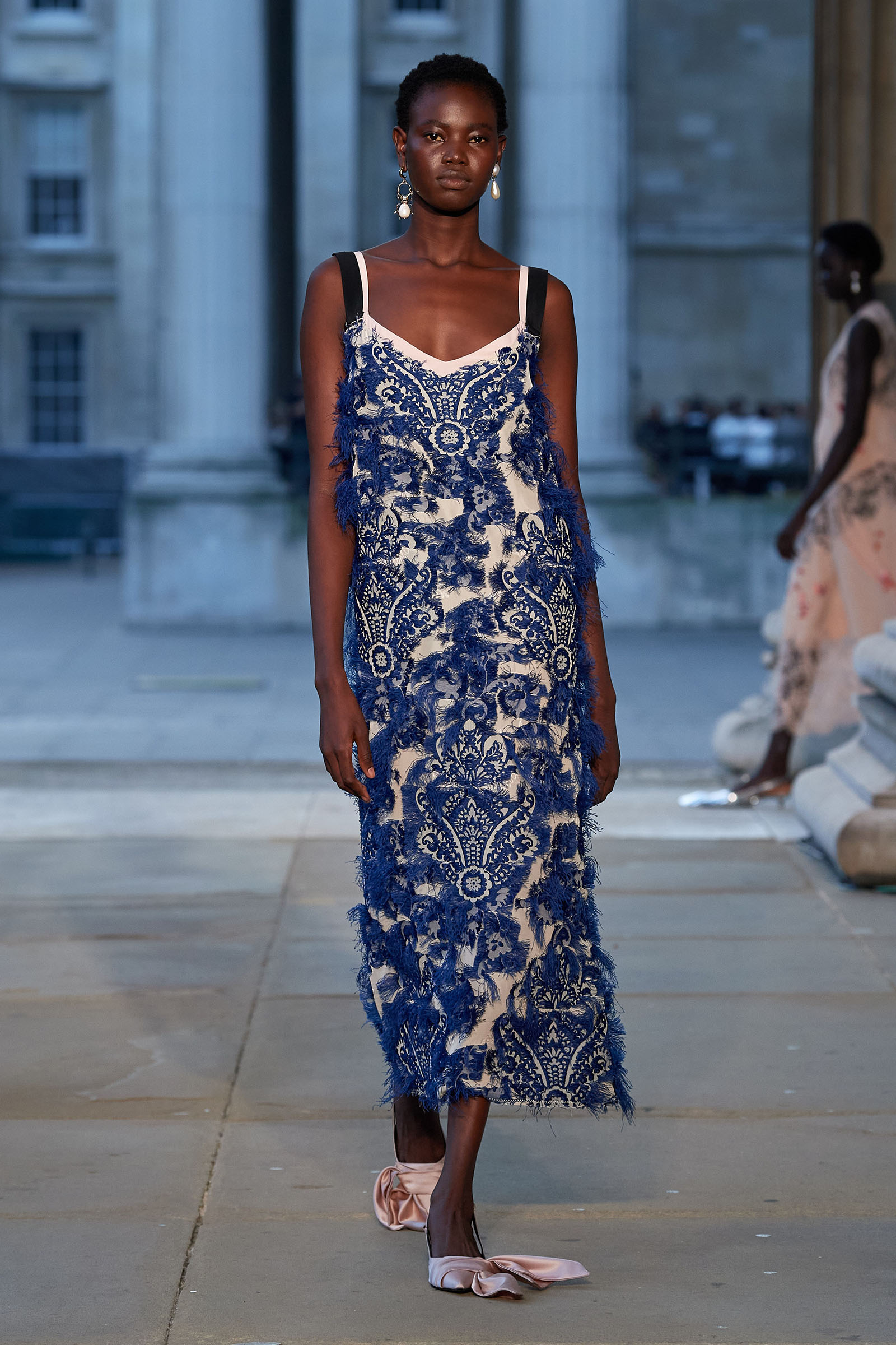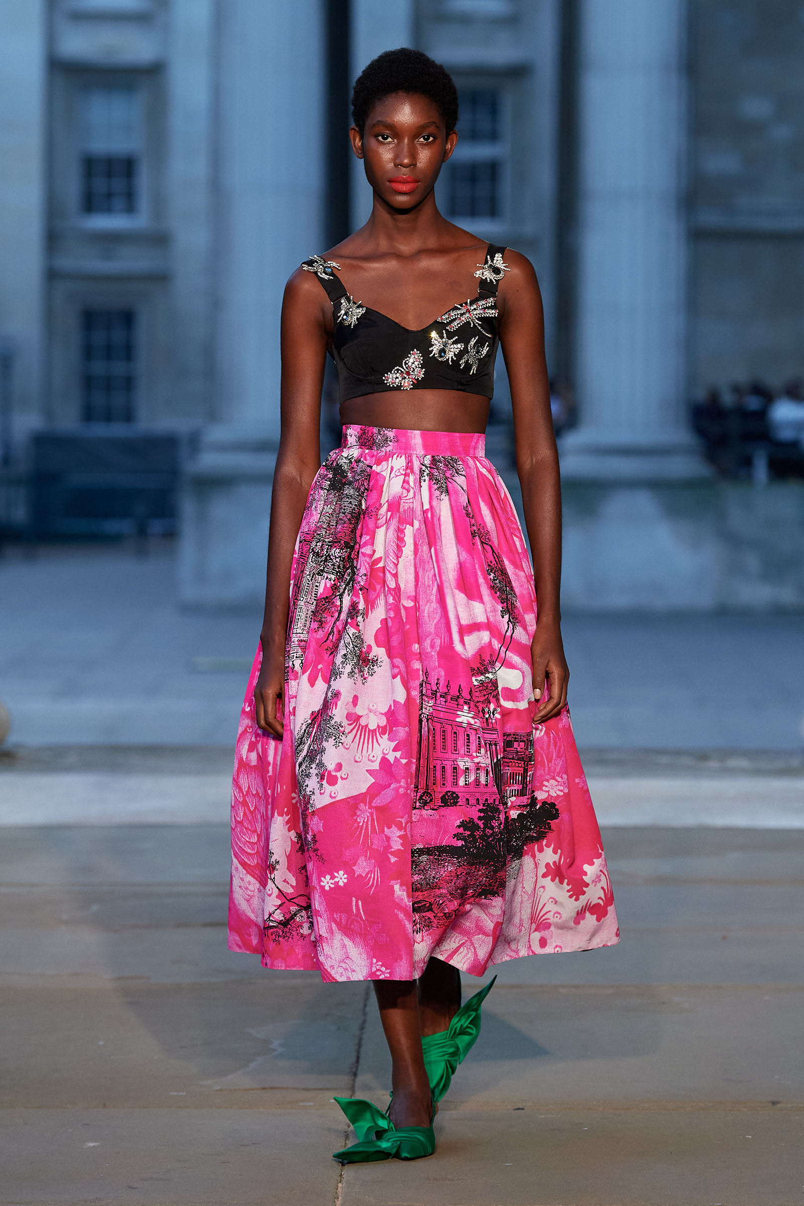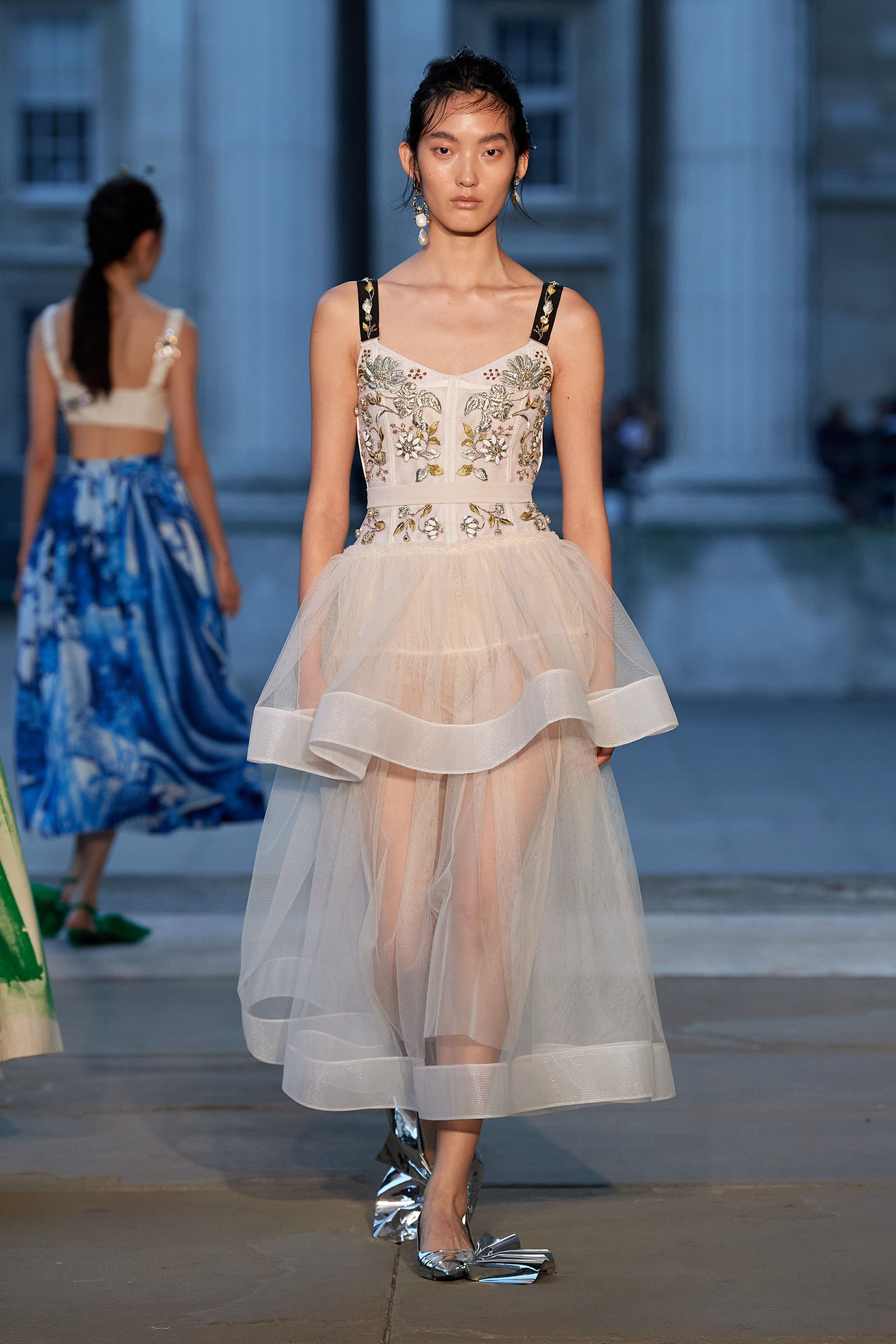 It was peak Erdem, of course. The biographies of strong and unconventional women have always informed the background of the designer’s best work—and this subject, as aristocratic a chatelaine and hostess as they come, was also a robustly practical countrywoman and, as he put it, “a strict proponent of make do and mend.” Debo’s brisk organizing abilities helped save the house after steep death duties brought about the sale to the nation of the 15th-century Devonshire Hunting Tapestries (now hanging in the V&A). A blown-up image of the medieval scenery was there today in a blue and white printed dirndl. Her quirky penchant for collecting bug jewelry—which she passed on to her granddaughter Stella Tennant—was caught in dragonfly brooches and a two-pronged tiara that looked just like a pair of insect antennae.