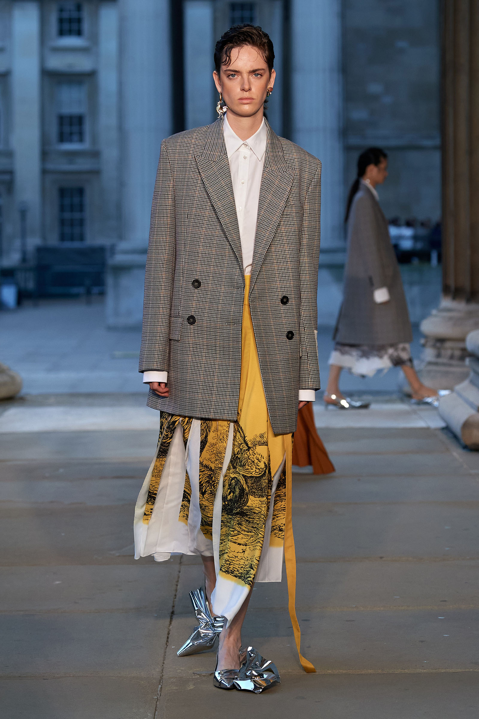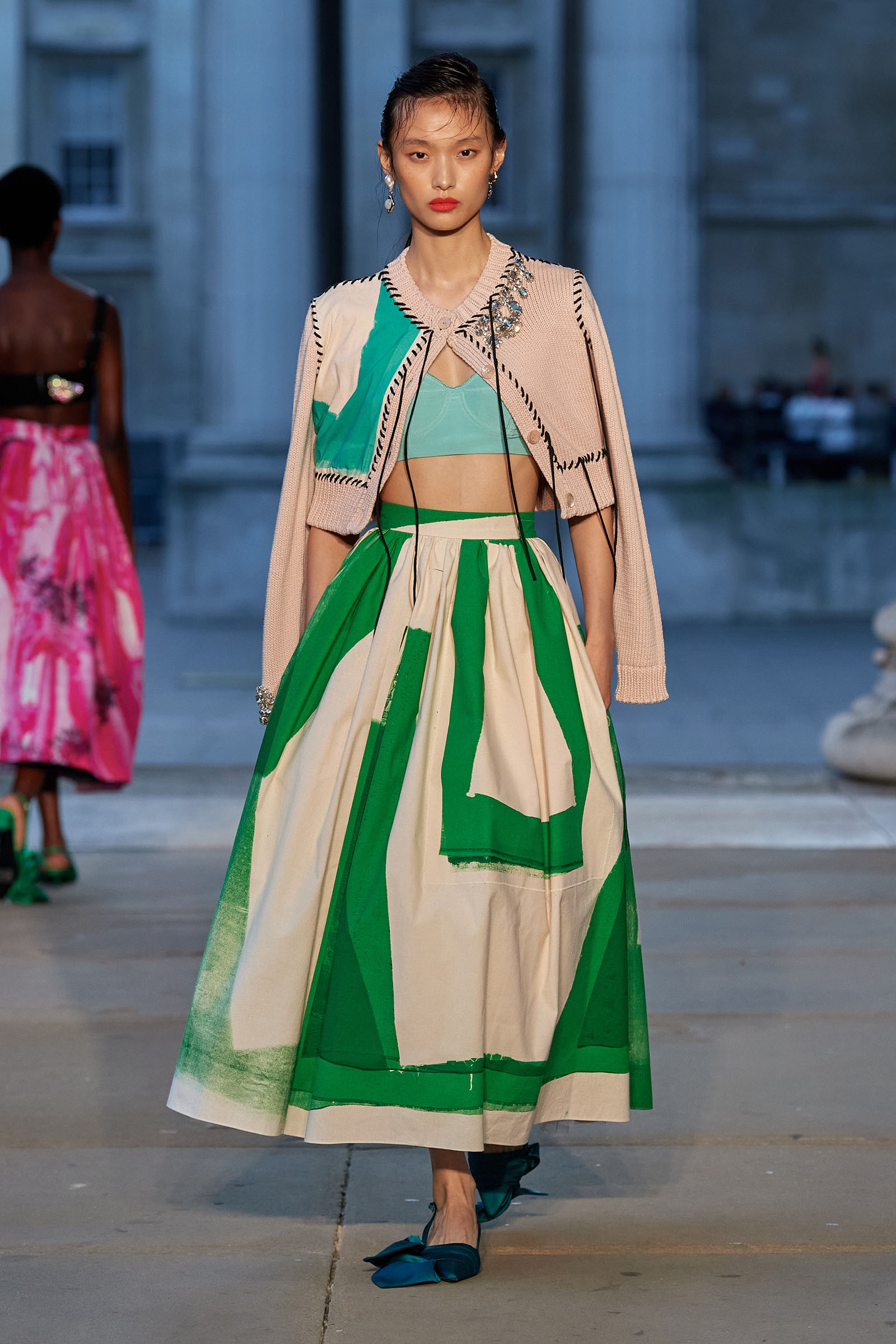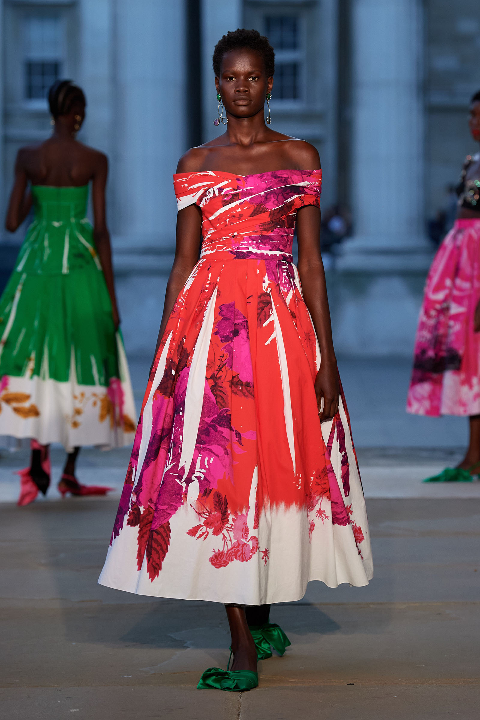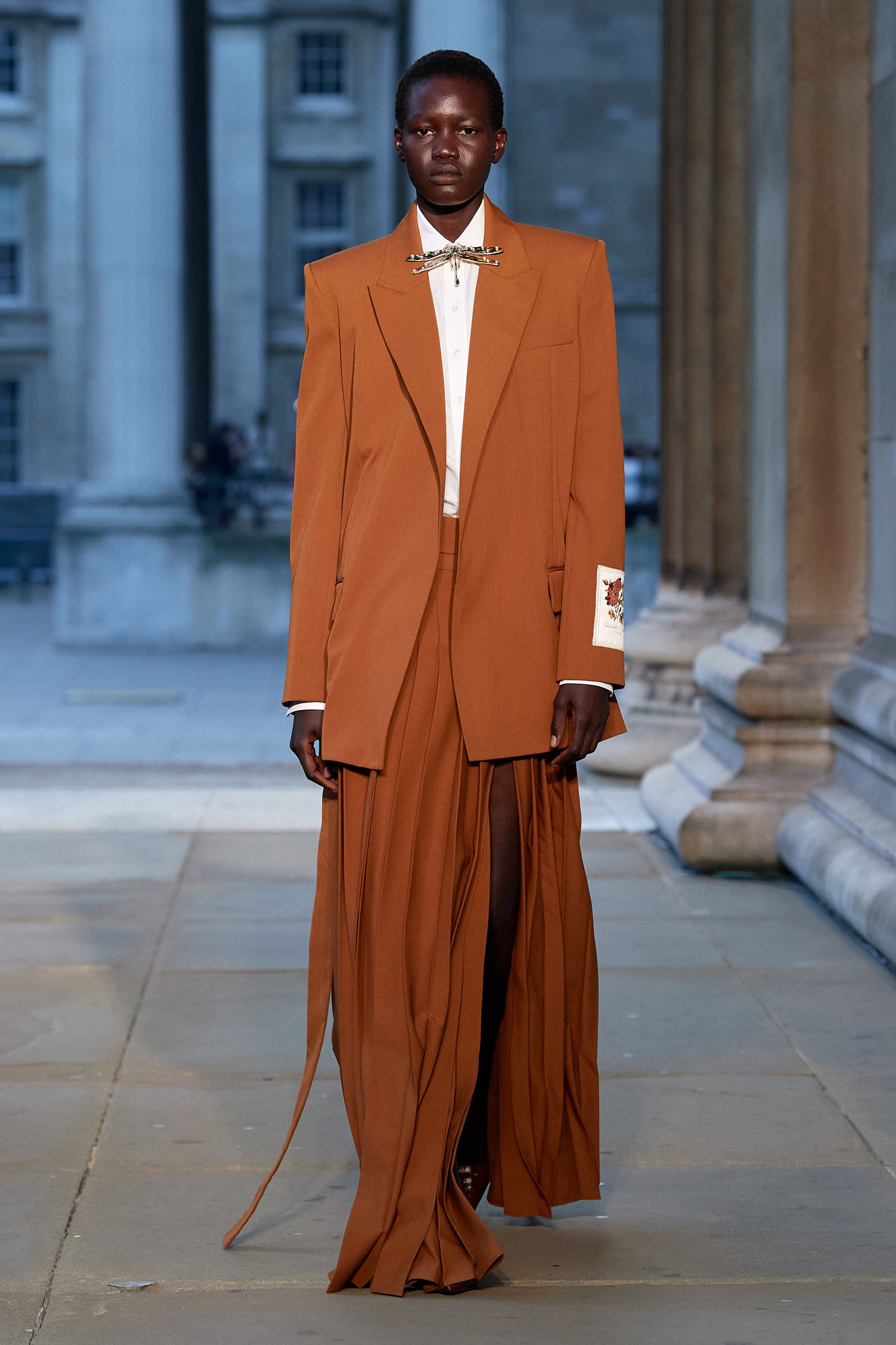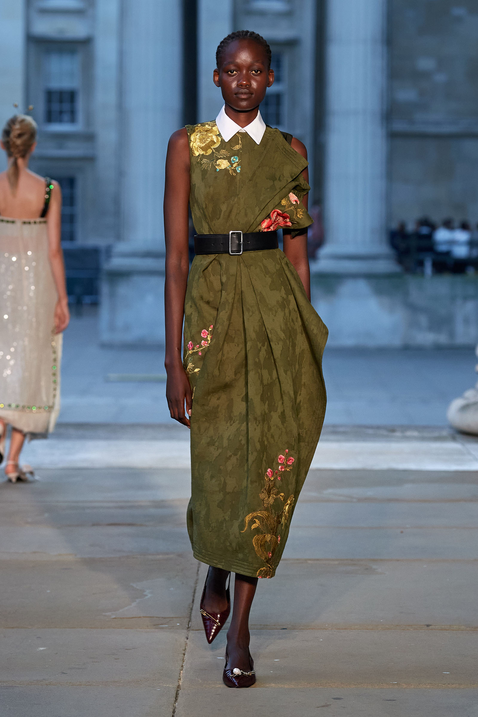 It was peak Erdem, of course. The biographies of strong and unconventional women have always informed the background of the designer’s best work—and this subject, as aristocratic a chatelaine and hostess as they come, was also a robustly practical countrywoman and, as he put it, “a strict proponent of make do and mend.” Debo’s brisk organizing abilities helped save the house after steep death duties brought about the sale to the nation of the 15th-century Devonshire Hunting Tapestries (now hanging in the V&A). A blown-up image of the medieval scenery was there today in a blue and white printed dirndl. Her quirky penchant for collecting bug jewelry—which she passed on to her granddaughter Stella Tennant—was caught in dragonfly brooches and a two-pronged tiara that looked just like a pair of insect antennae.