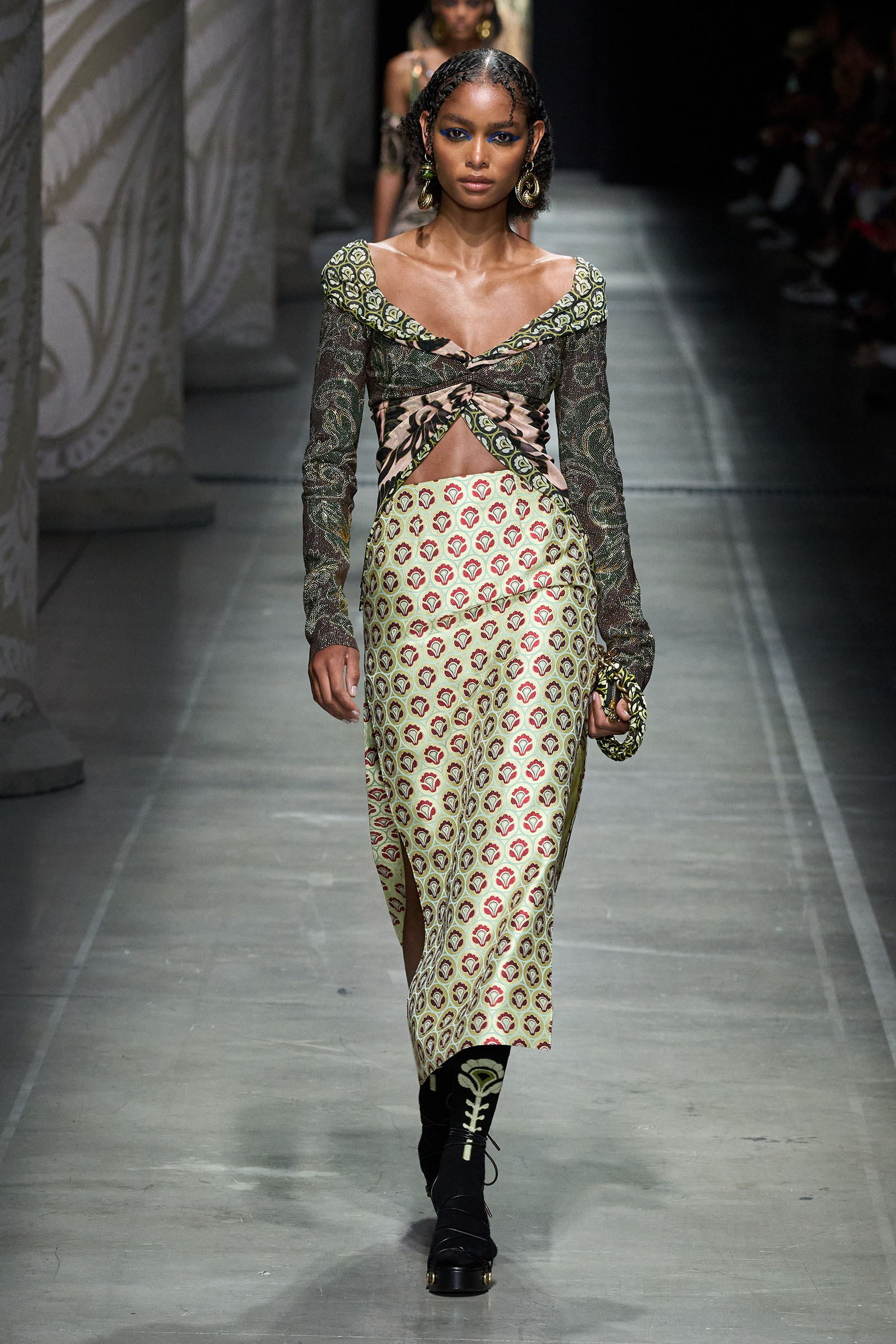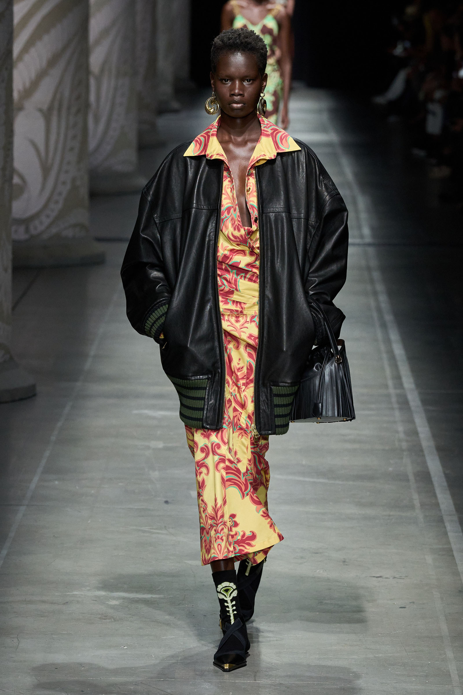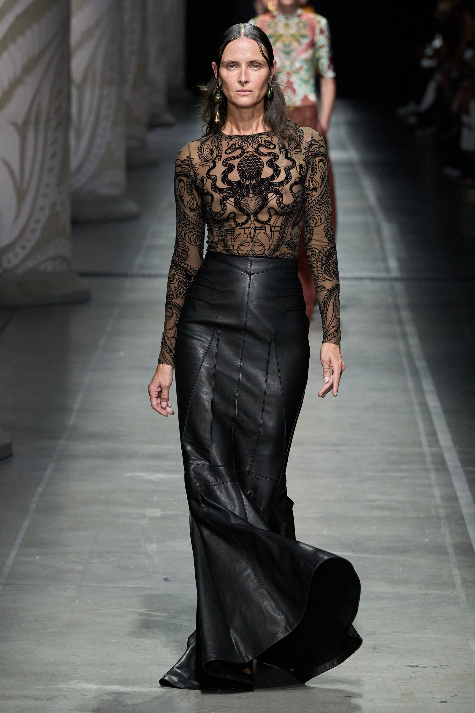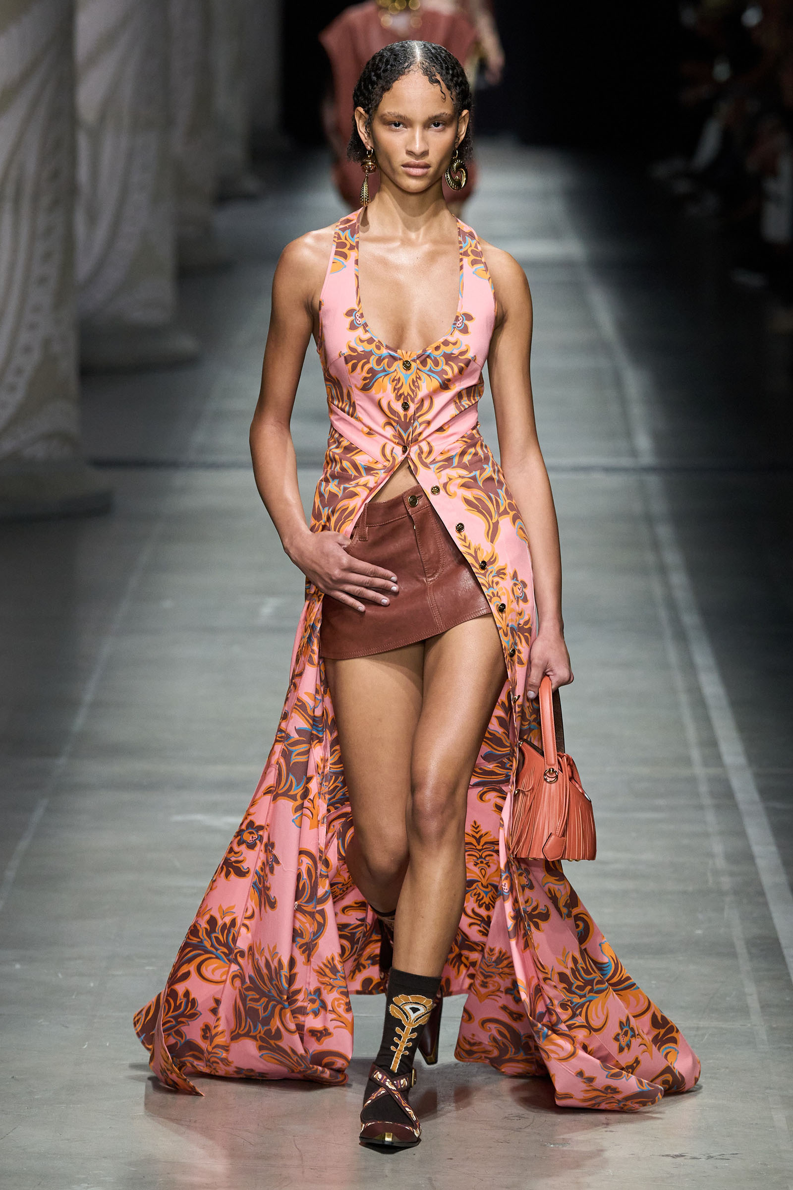 De Vincenzo’s audacity and quirk were the glue that kept the collection cohesive, despite its visual jumble of graphics and handsome textures. “But there are no citations, no recognizable attributions, everything comes to life in a magical no-place,” he said. Not afraid to confront challenging shapes (swirling trailing hems sneaking awkwardly around the ankles), unexpected juxtapositions of volumes (XXXL leather blazers worn over equally humongous tentlike strapless circle dresses) and redundant intricacies of construction (an abundance of twisting, knotting, braiding and slicing), De Vincenzo is carving a distinctive niche of cool for Etro, bending its codes into a spirited, vital, visually compelling rendition. The diverse, refined casting, sophisticated grooming and imaginative styling only added to a convincing performance. De Vincenzo is bringing Etro to a pretty good no-place.