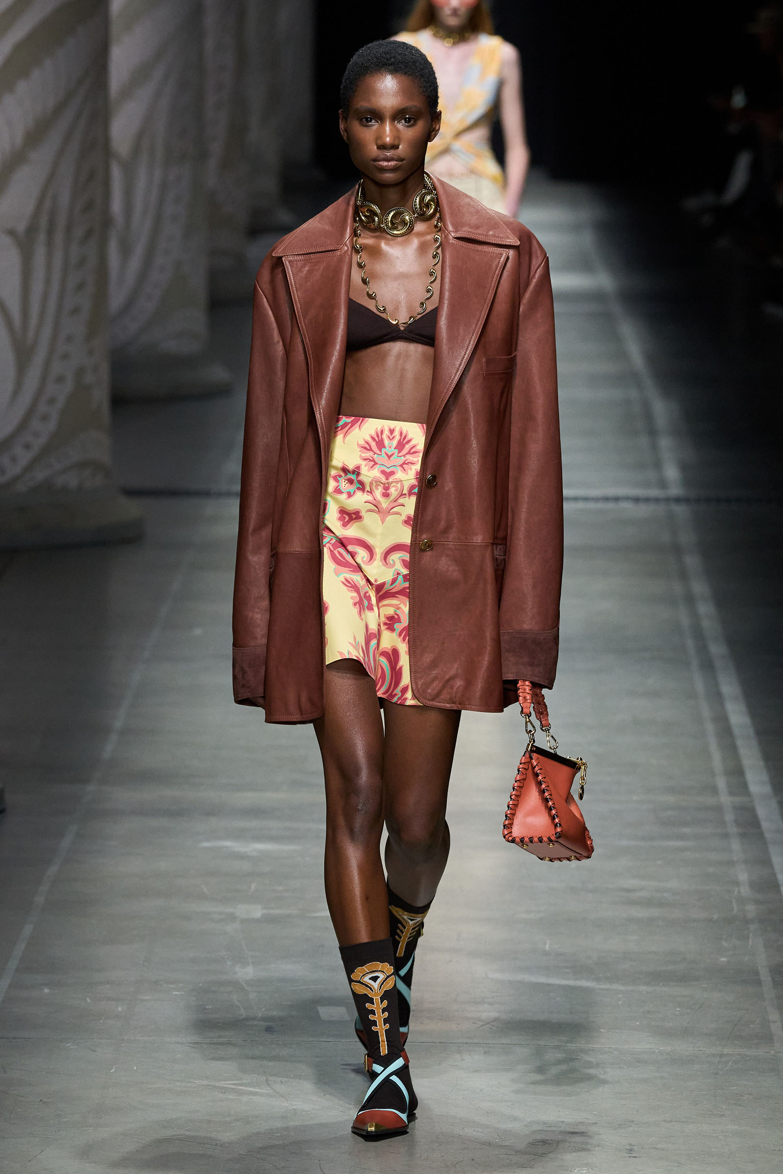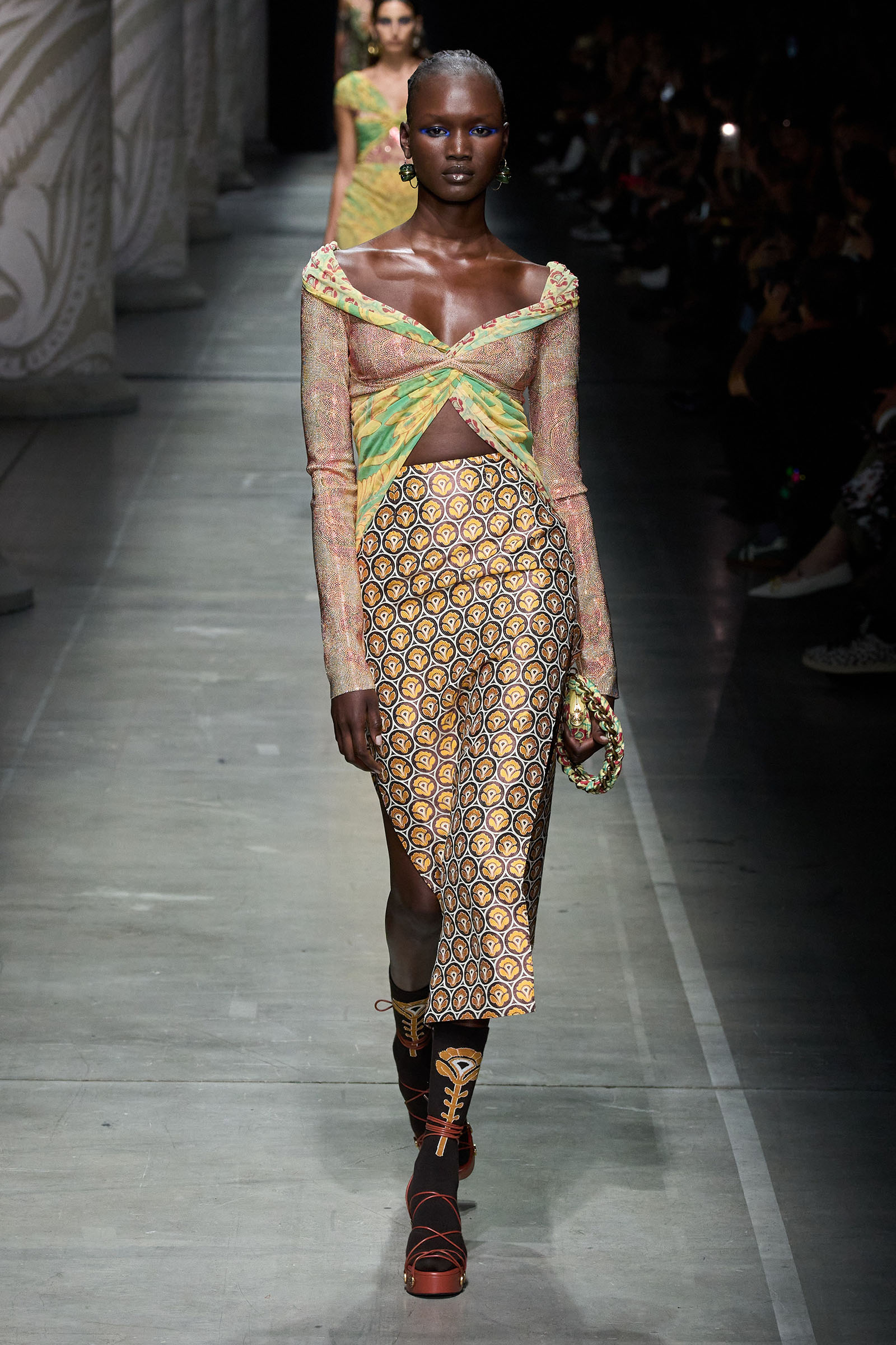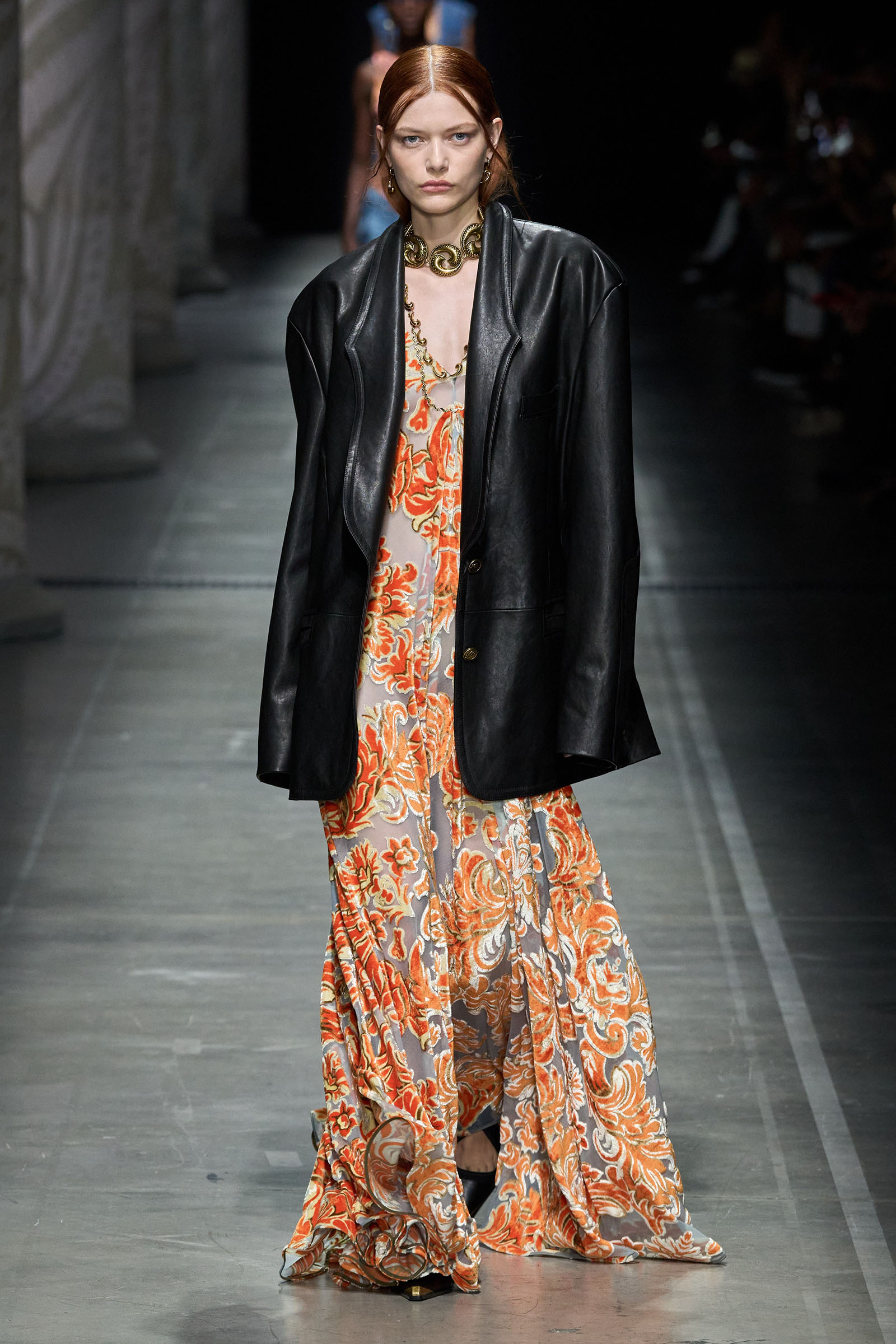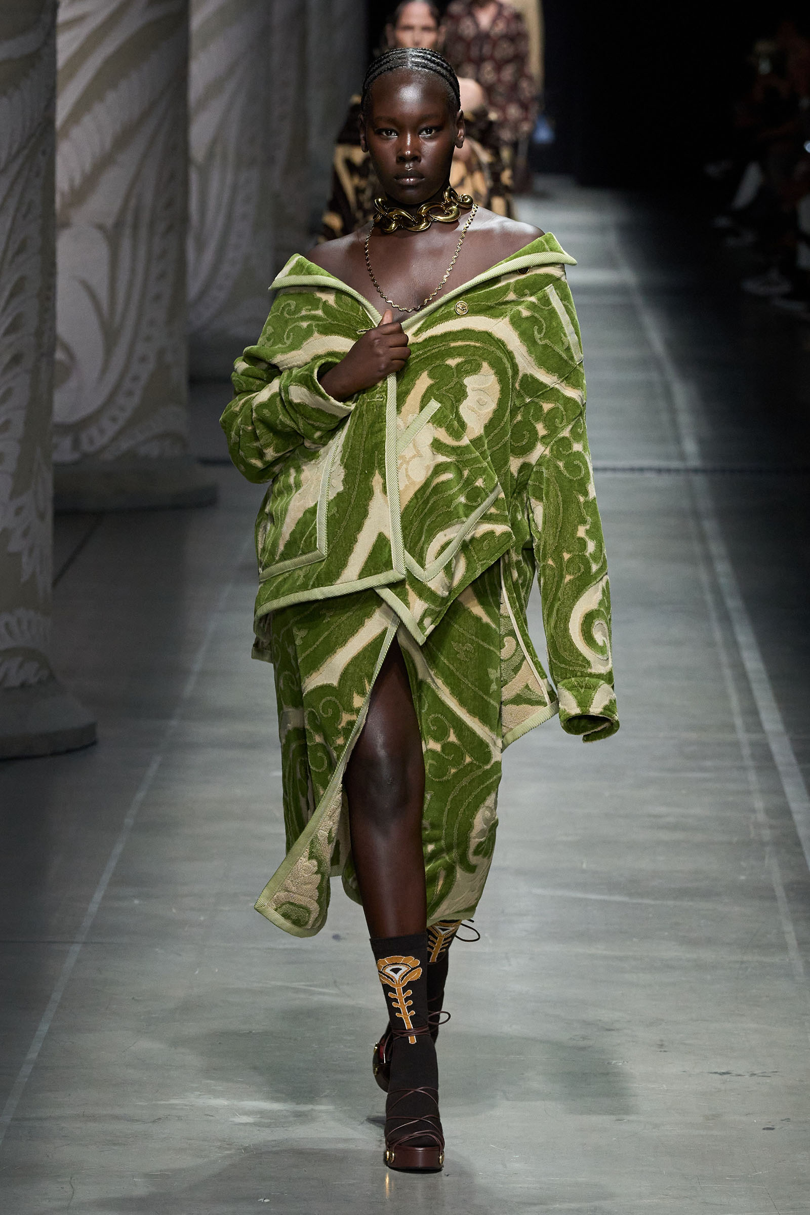 De Vincenzo’s audacity and quirk were the glue that kept the collection cohesive, despite its visual jumble of graphics and handsome textures. “But there are no citations, no recognizable attributions, everything comes to life in a magical no-place,” he said. Not afraid to confront challenging shapes (swirling trailing hems sneaking awkwardly around the ankles), unexpected juxtapositions of volumes (XXXL leather blazers worn over equally humongous tentlike strapless circle dresses) and redundant intricacies of construction (an abundance of twisting, knotting, braiding and slicing), De Vincenzo is carving a distinctive niche of cool for Etro, bending its codes into a spirited, vital, visually compelling rendition. The diverse, refined casting, sophisticated grooming and imaginative styling only added to a convincing performance. De Vincenzo is bringing Etro to a pretty good no-place.