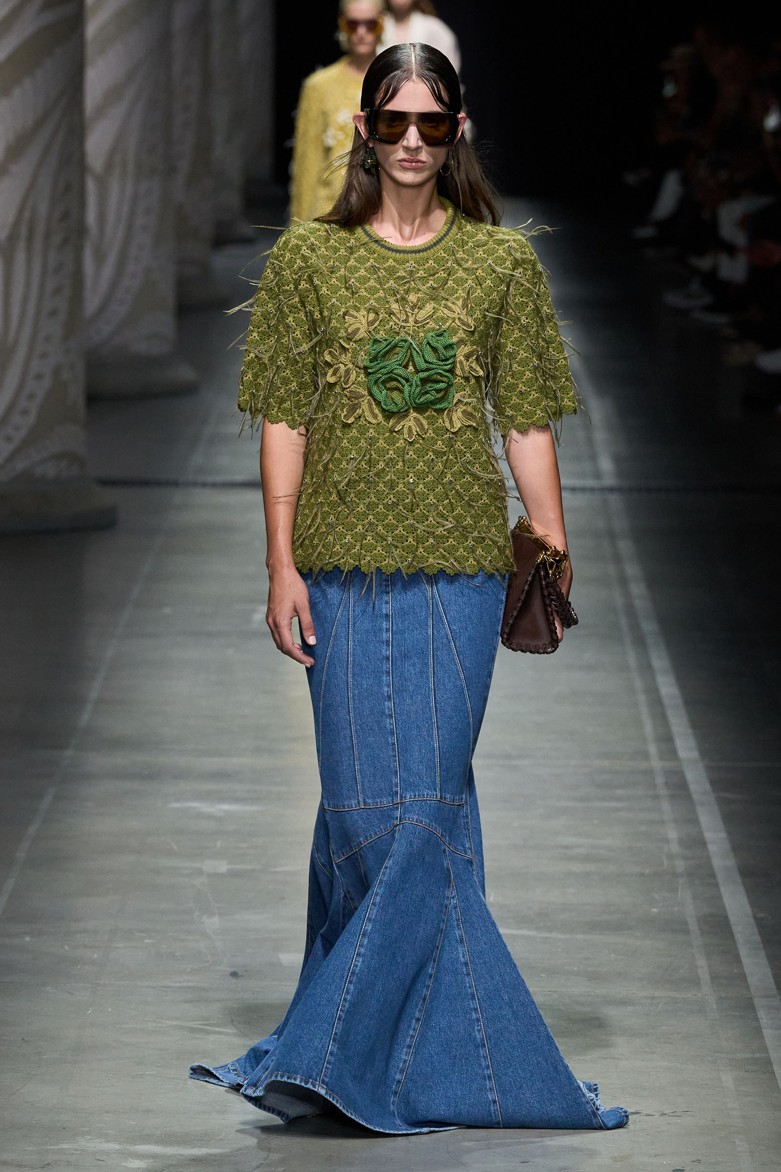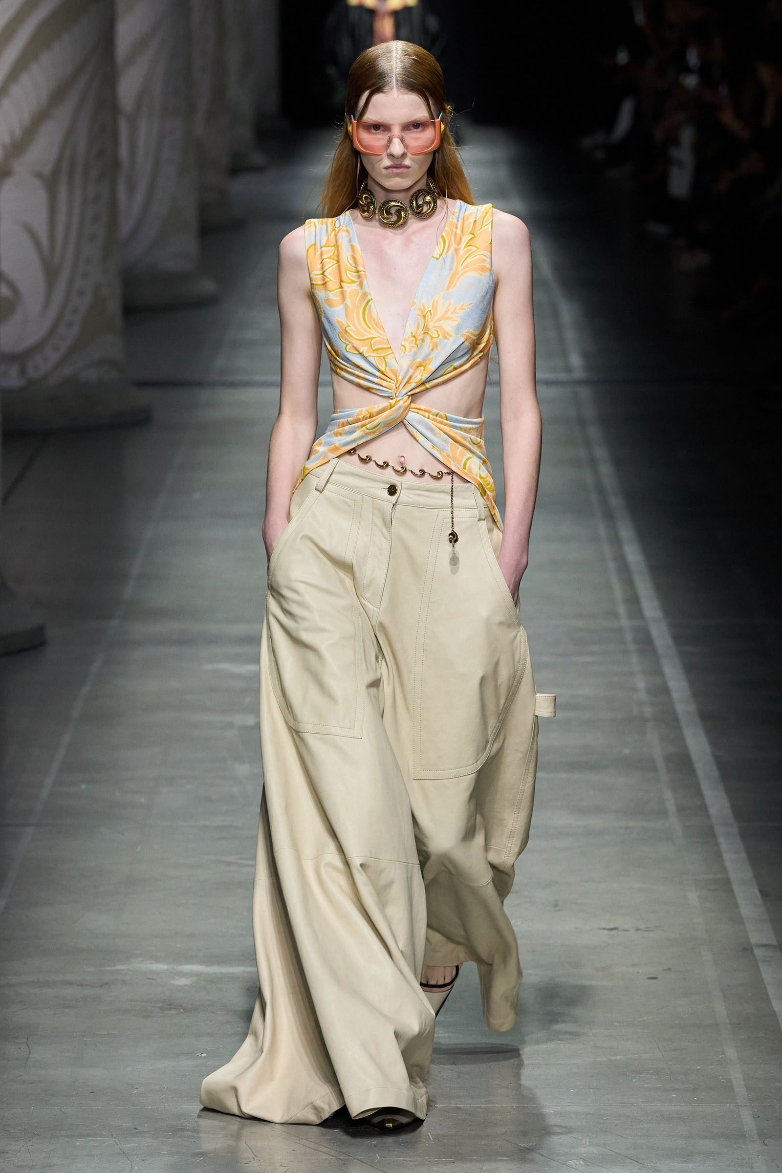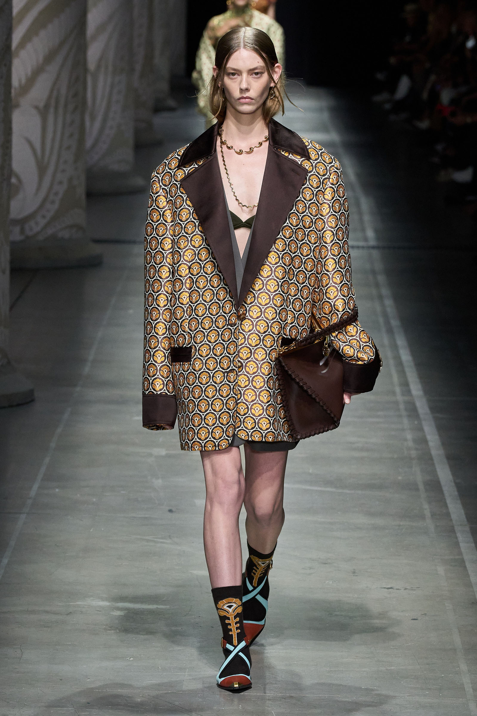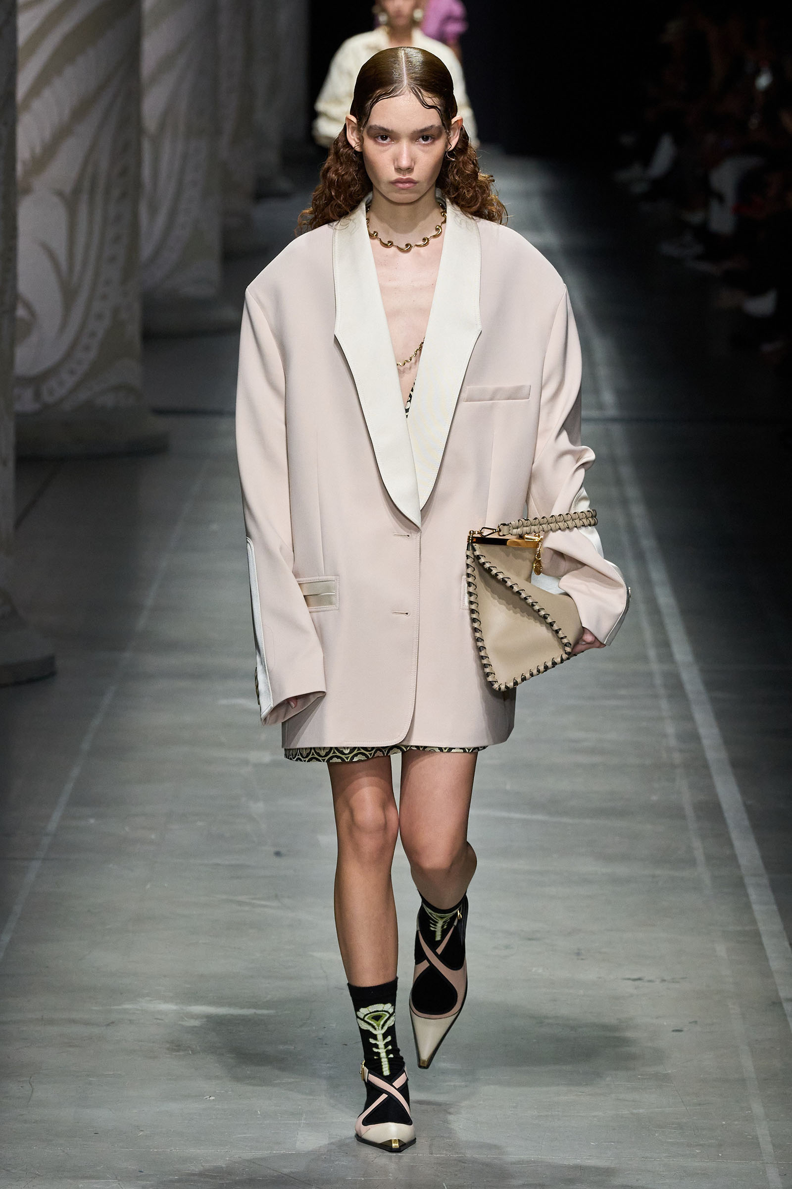 De Vincenzo’s audacity and quirk were the glue that kept the collection cohesive, despite its visual jumble of graphics and handsome textures. “But there are no citations, no recognizable attributions, everything comes to life in a magical no-place,” he said. Not afraid to confront challenging shapes (swirling trailing hems sneaking awkwardly around the ankles), unexpected juxtapositions of volumes (XXXL leather blazers worn over equally humongous tentlike strapless circle dresses) and redundant intricacies of construction (an abundance of twisting, knotting, braiding and slicing), De Vincenzo is carving a distinctive niche of cool for Etro, bending its codes into a spirited, vital, visually compelling rendition. The diverse, refined casting, sophisticated grooming and imaginative styling only added to a convincing performance. De Vincenzo is bringing Etro to a pretty good no-place.
