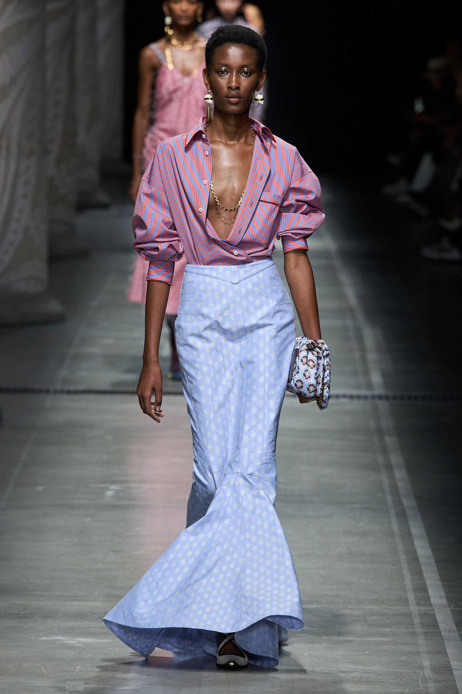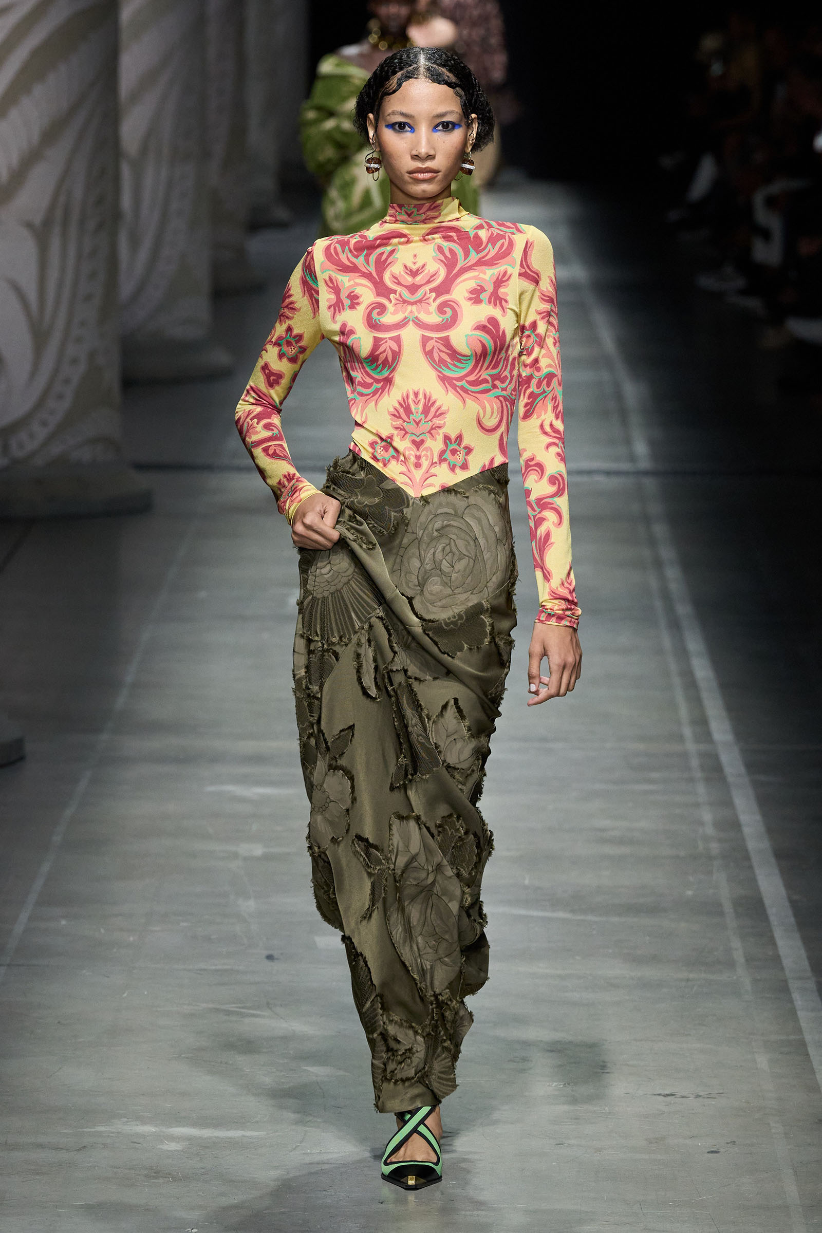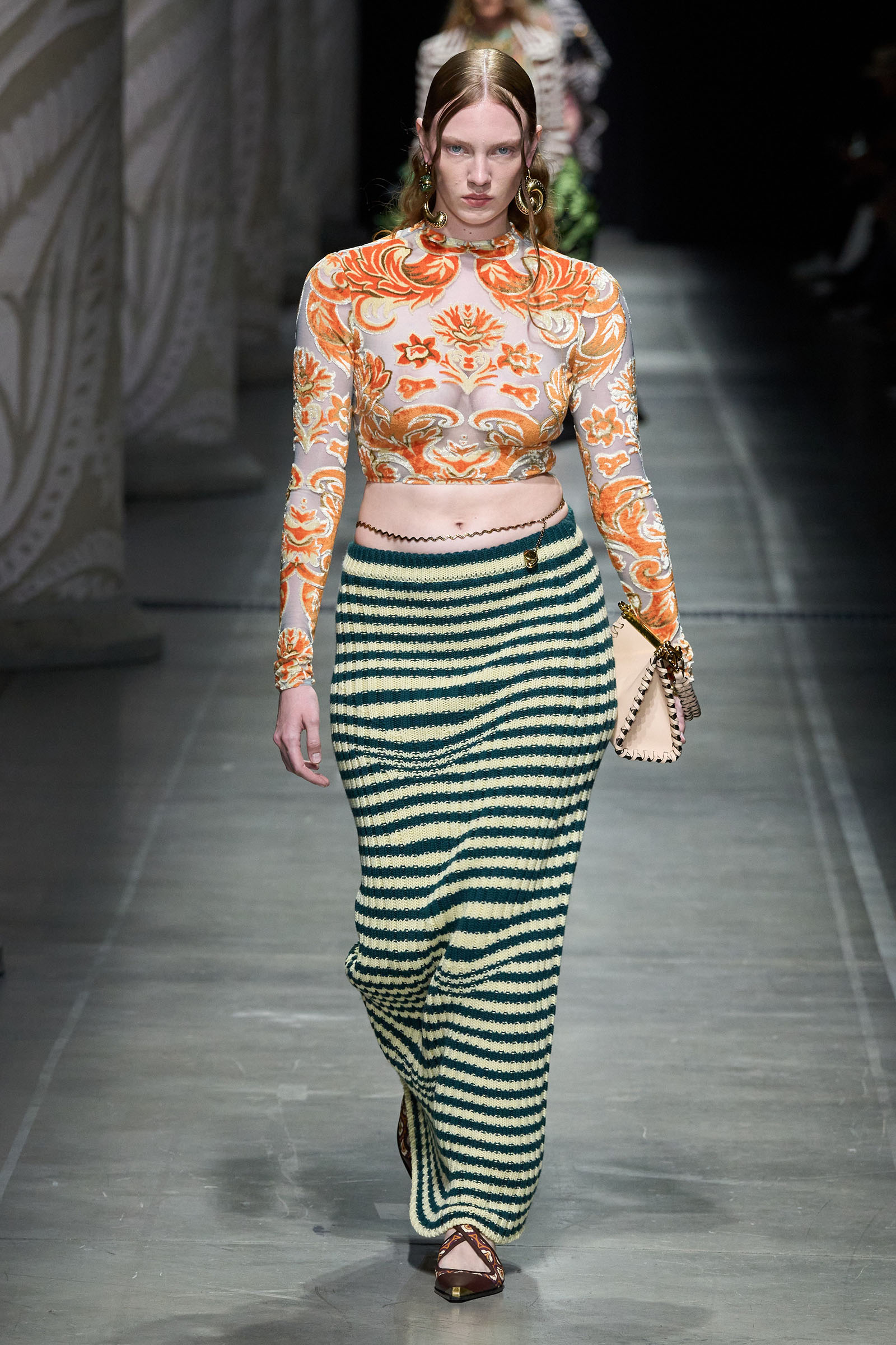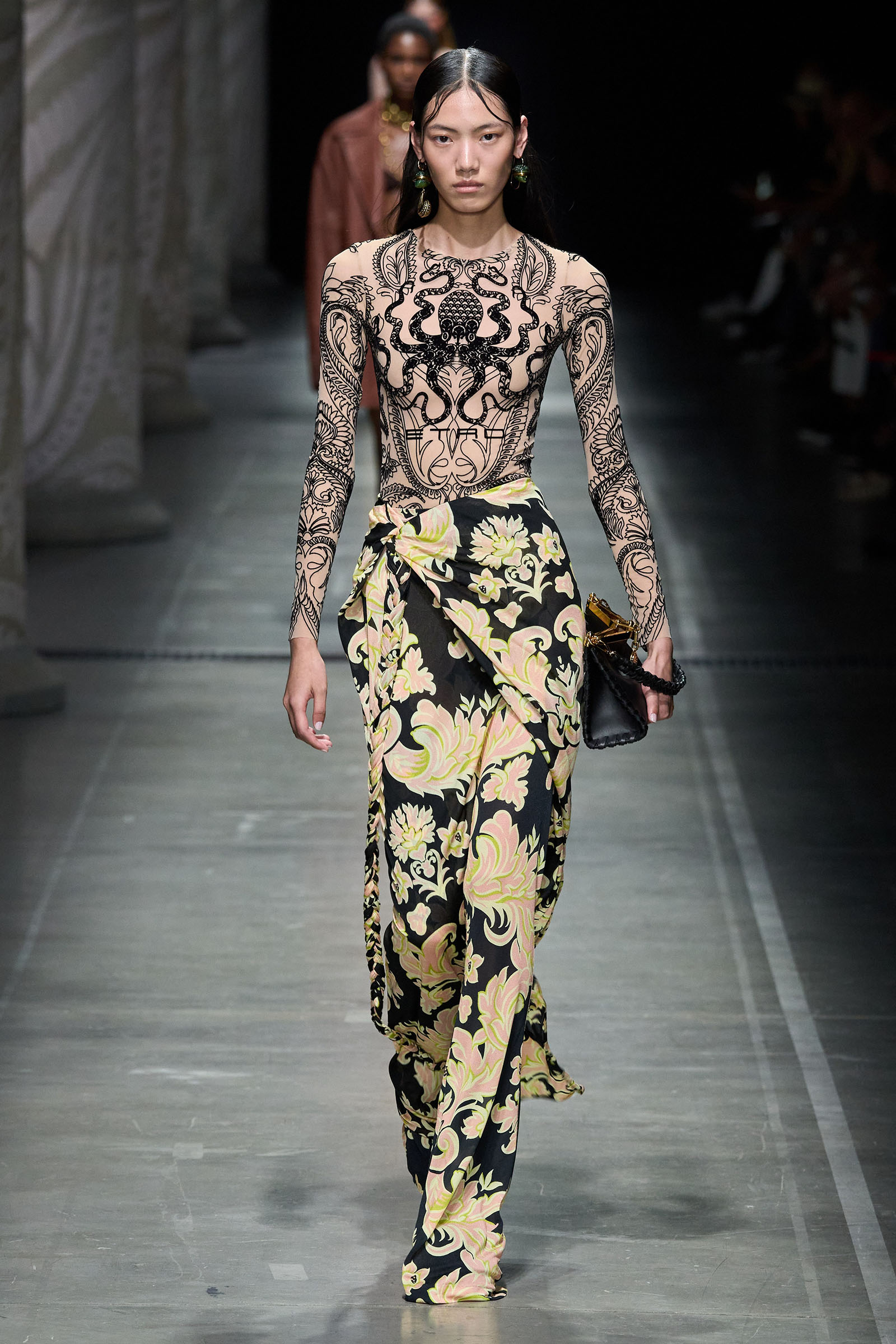 Marco De Vincenzo is an eager traveler; this year he visited Africa and recently spent his holidays in Cambodia. But he also navigates frequently around Etro’s vast archive, a treasure trove of rare fabrics and prints, where he gets lost in a sort of suspended journey. “It’s weird how the imagination brings you to places that somehow you can’t describe,” he said. “The magic of the temples of Angkor Wat, a scrap of beautiful brocade from the 18th century…. The mind travels through memories and suggestions, mixing them together with no logic or rational hierarchy, and lands instinctively in fabulous places with no name.” He called his spring collection Nowhere.