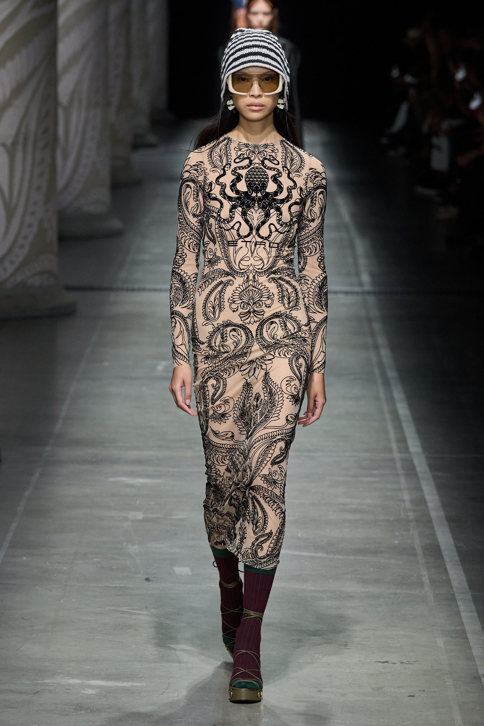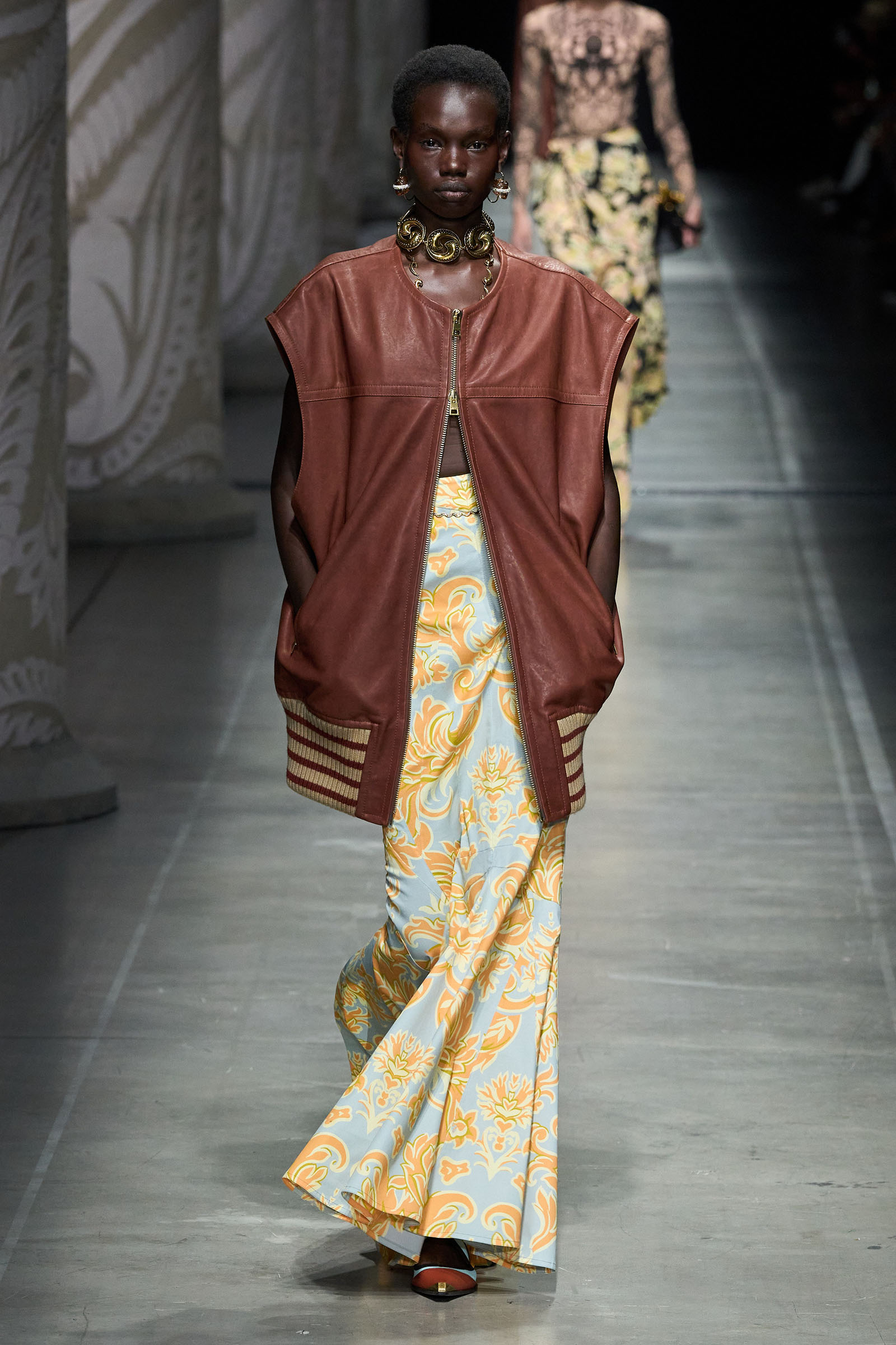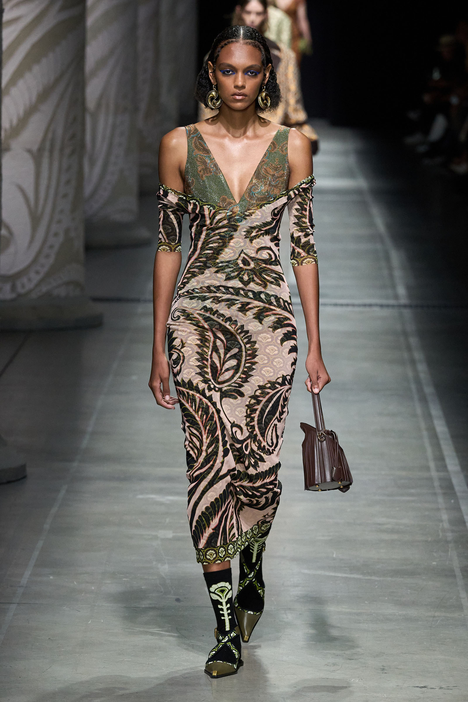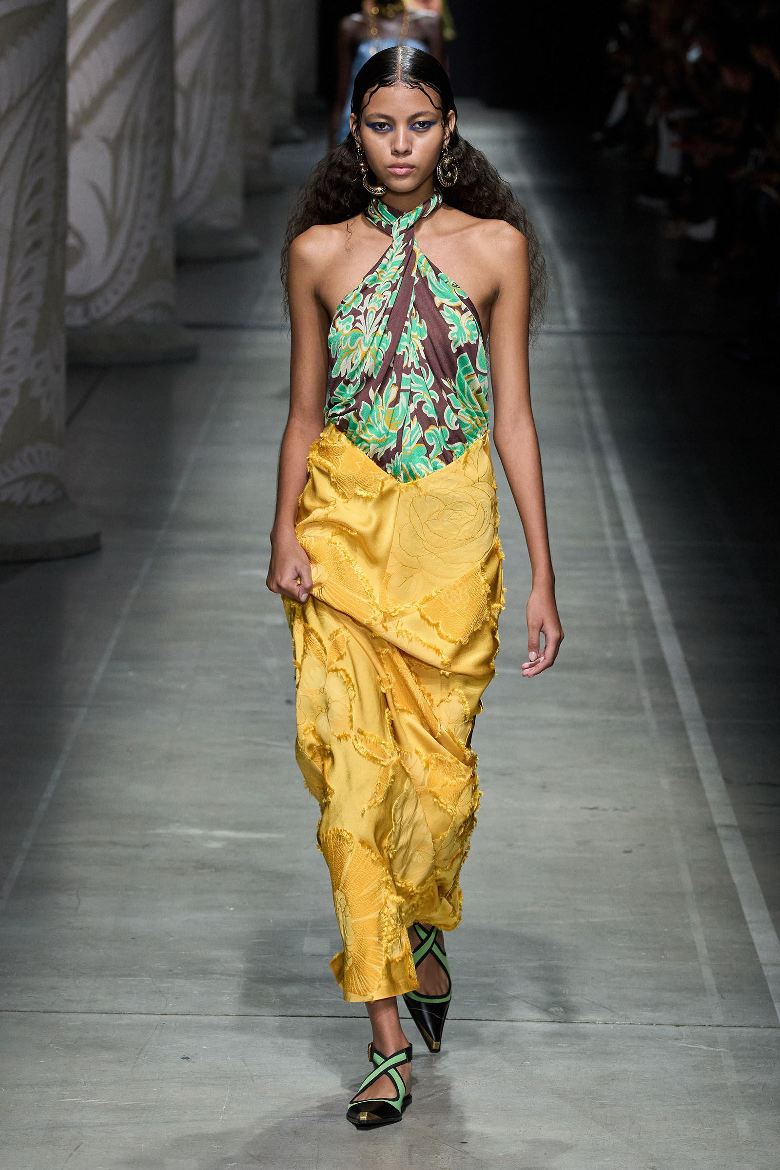 Marco De Vincenzo is an eager traveler; this year he visited Africa and recently spent his holidays in Cambodia. But he also navigates frequently around Etro’s vast archive, a treasure trove of rare fabrics and prints, where he gets lost in a sort of suspended journey. “It’s weird how the imagination brings you to places that somehow you can’t describe,” he said. “The magic of the temples of Angkor Wat, a scrap of beautiful brocade from the 18th century…. The mind travels through memories and suggestions, mixing them together with no logic or rational hierarchy, and lands instinctively in fabulous places with no name.” He called his spring collection Nowhere.