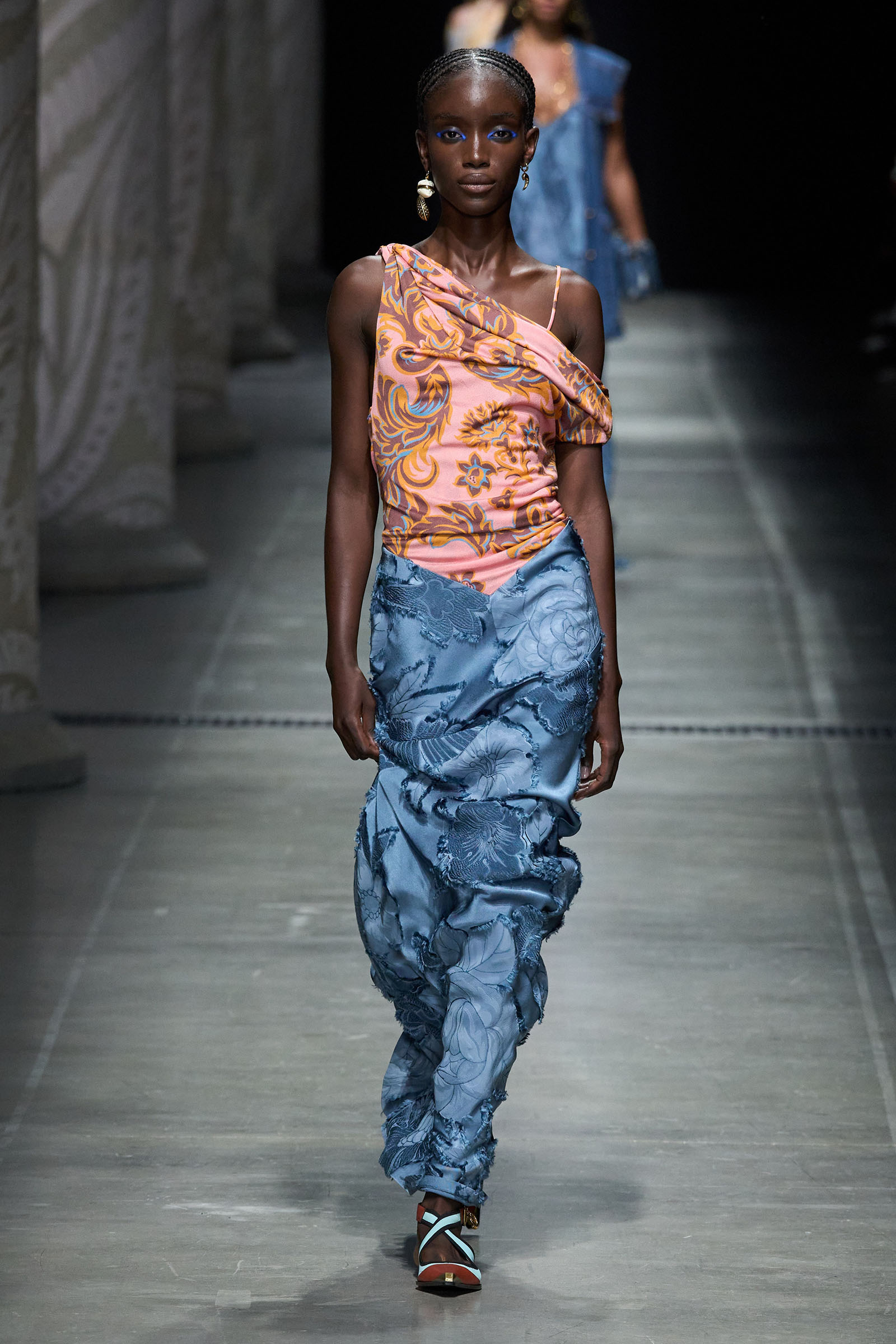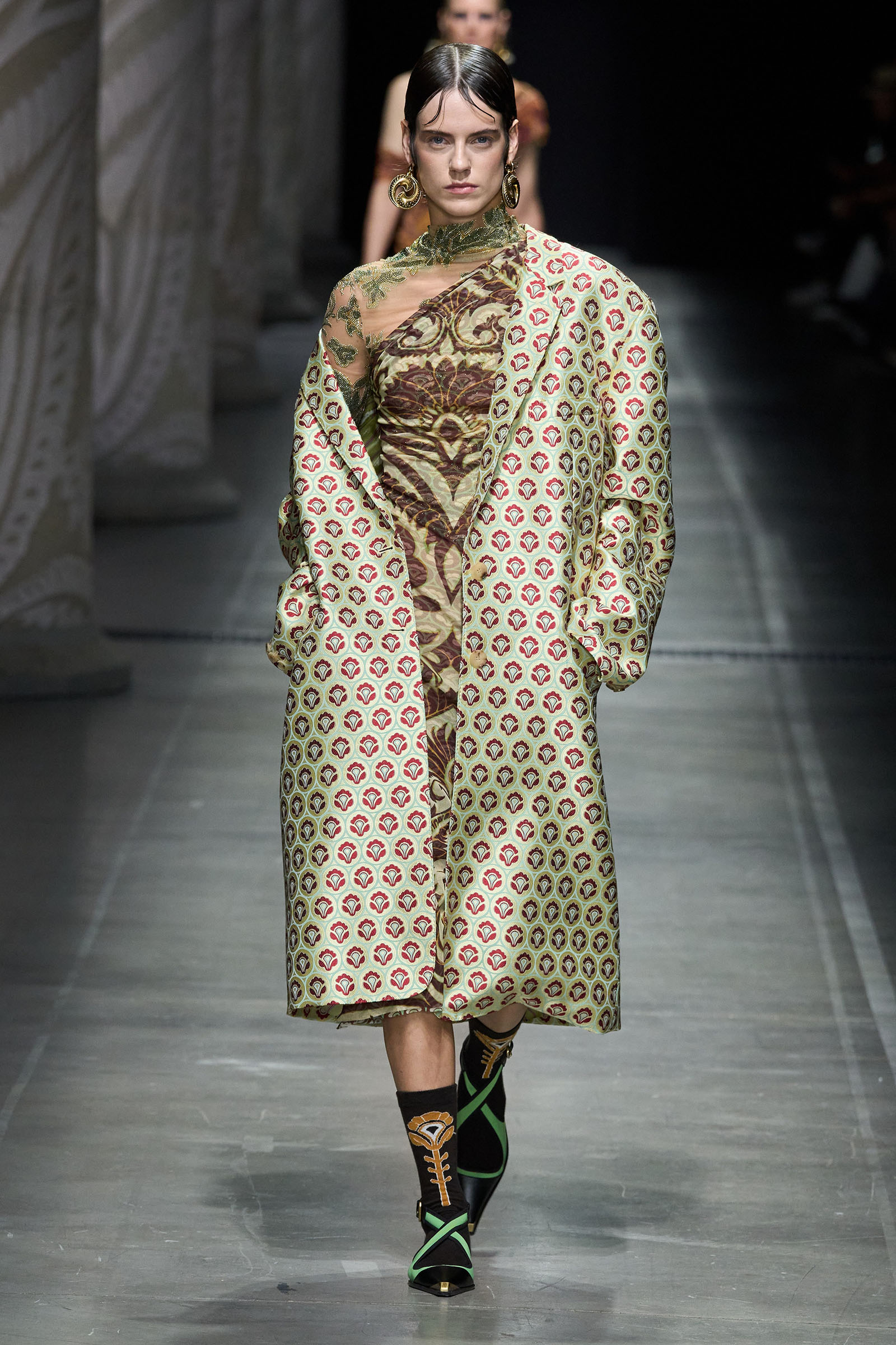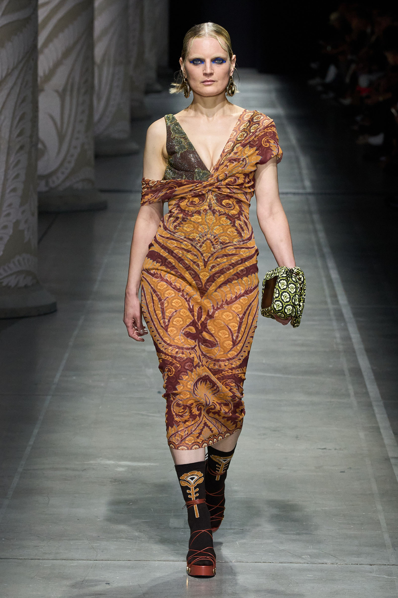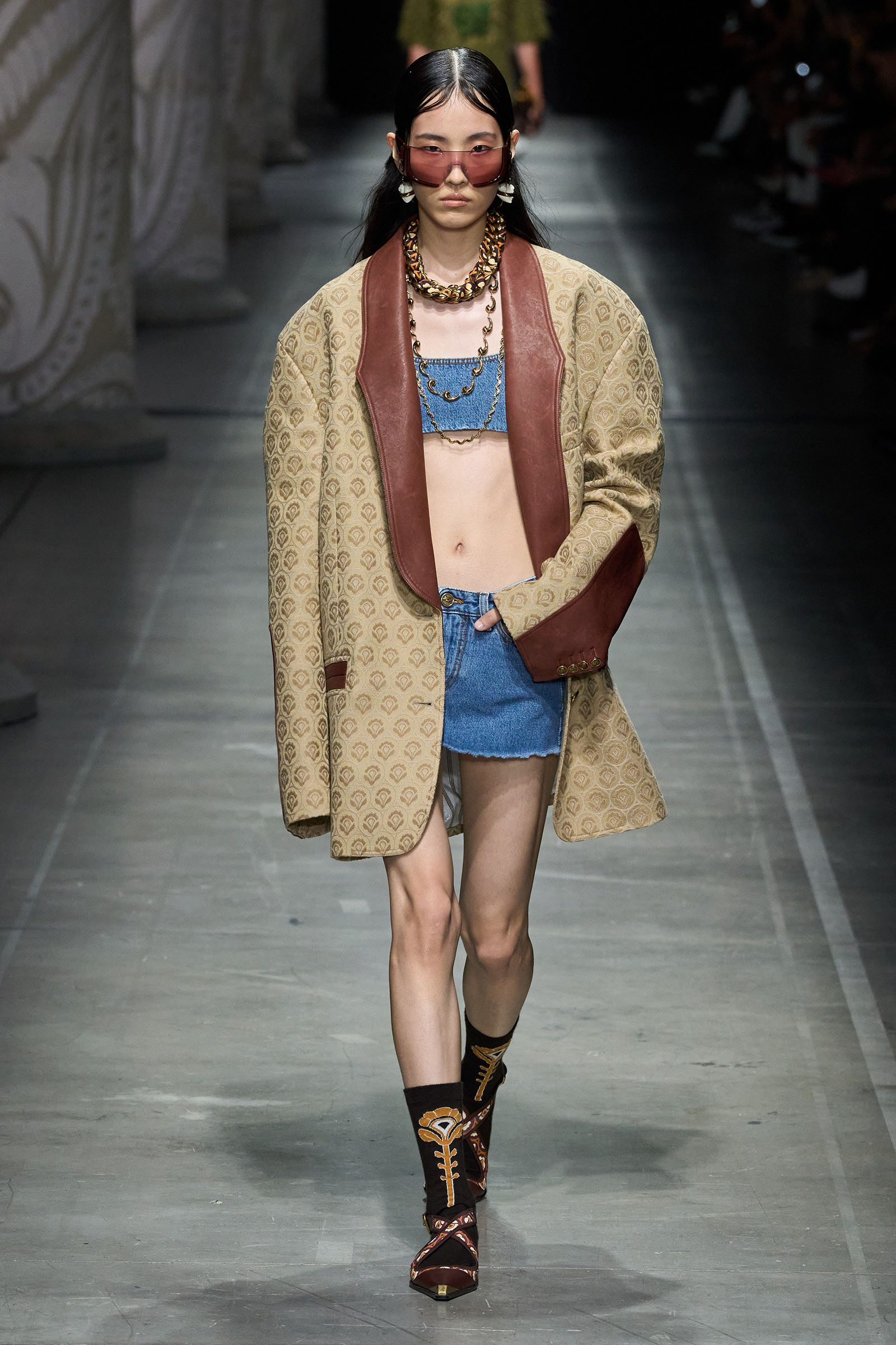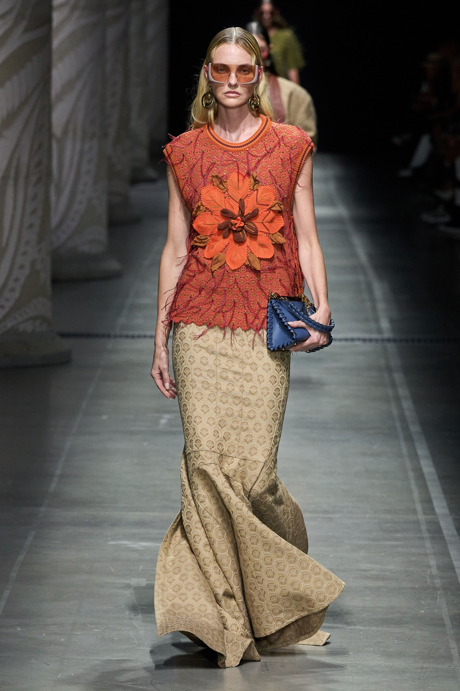 Marco De Vincenzo is an eager traveler; this year he visited Africa and recently spent his holidays in Cambodia. But he also navigates frequently around Etro’s vast archive, a treasure trove of rare fabrics and prints, where he gets lost in a sort of suspended journey. “It’s weird how the imagination brings you to places that somehow you can’t describe,” he said. “The magic of the temples of Angkor Wat, a scrap of beautiful brocade from the 18th century…. The mind travels through memories and suggestions, mixing them together with no logic or rational hierarchy, and lands instinctively in fabulous places with no name.” He called his spring collection Nowhere.