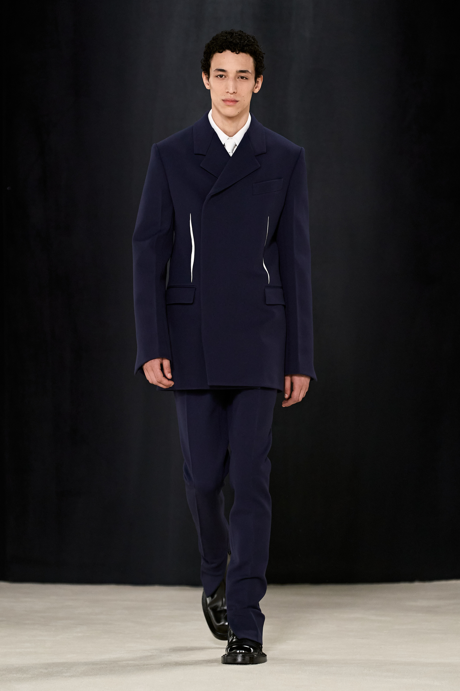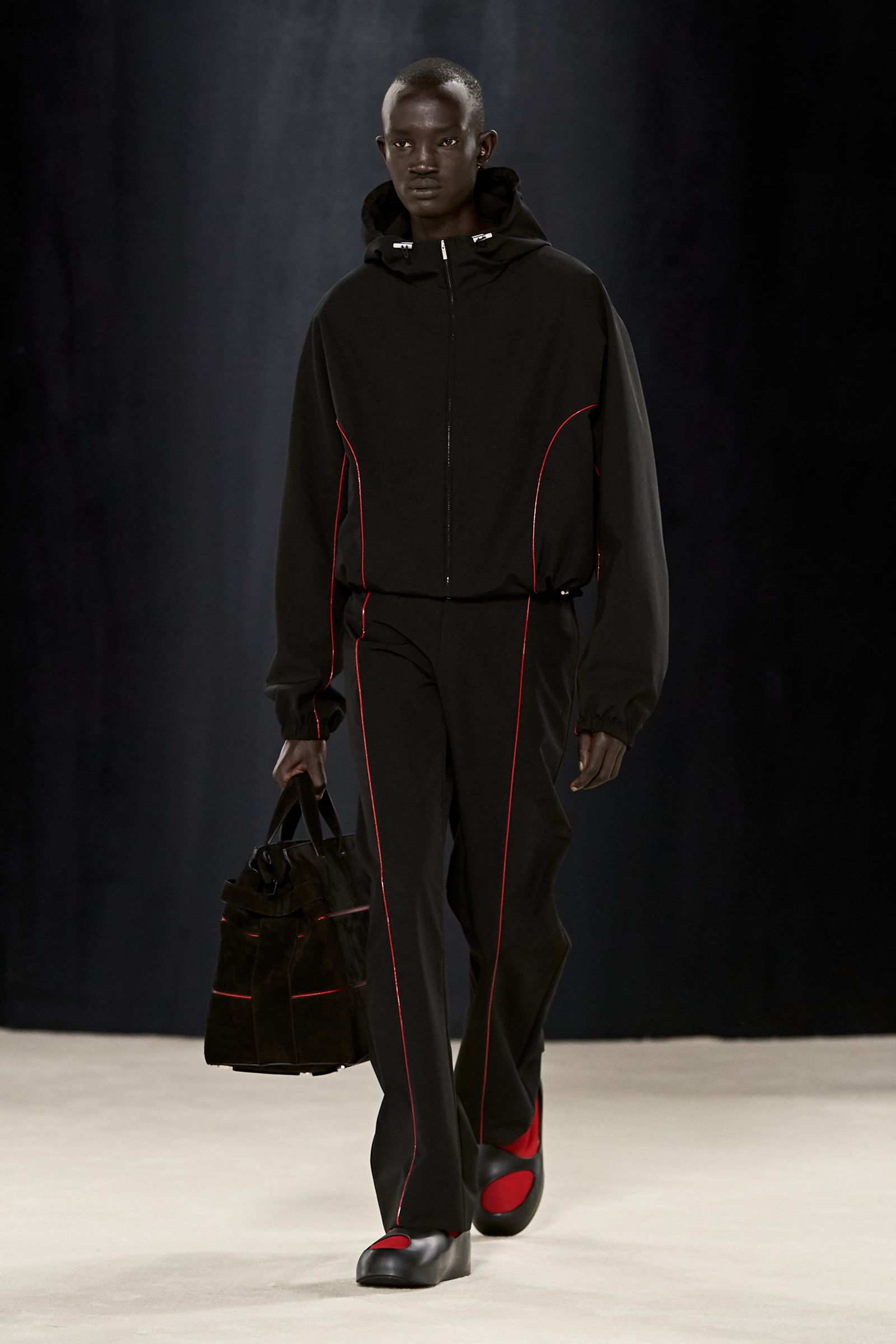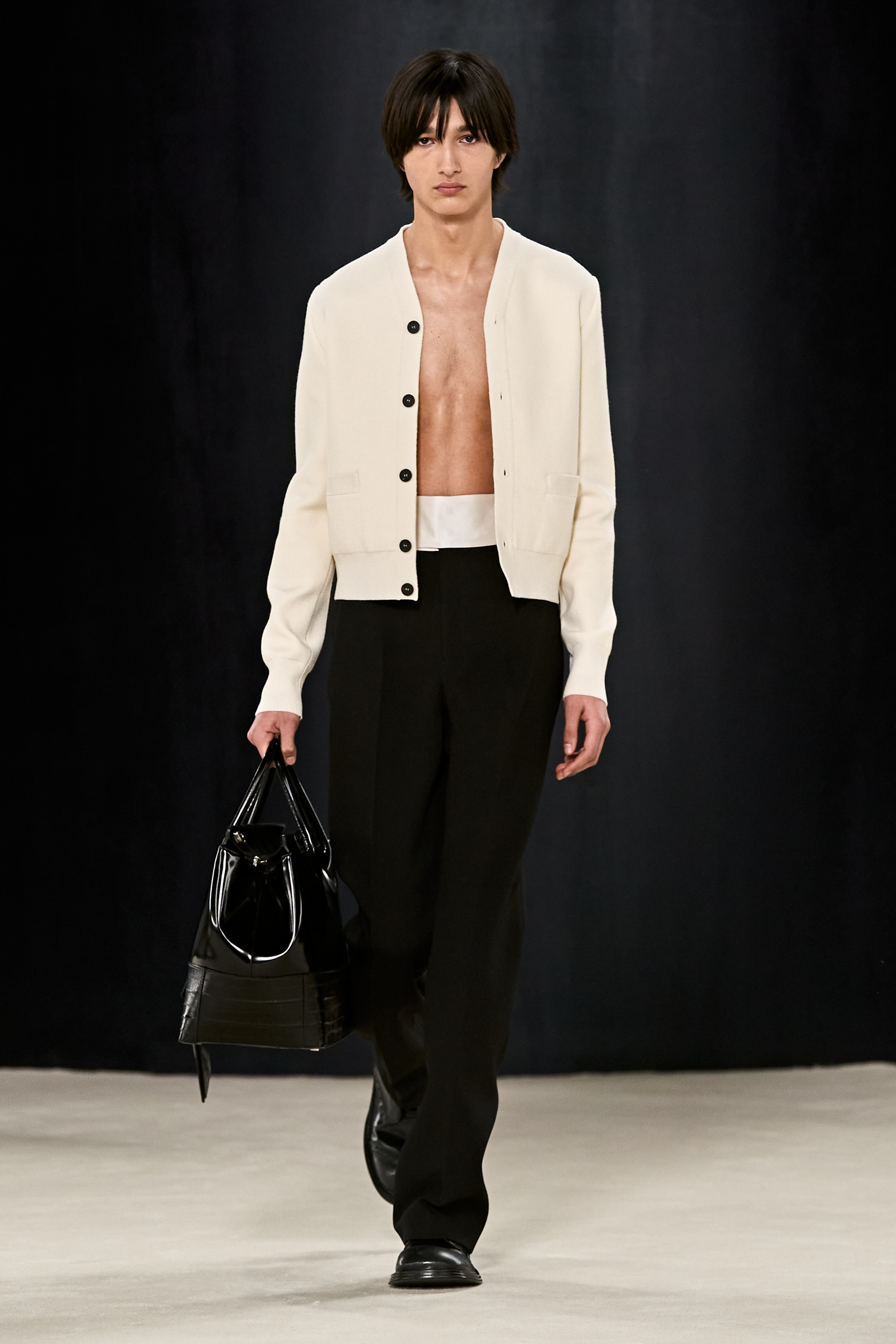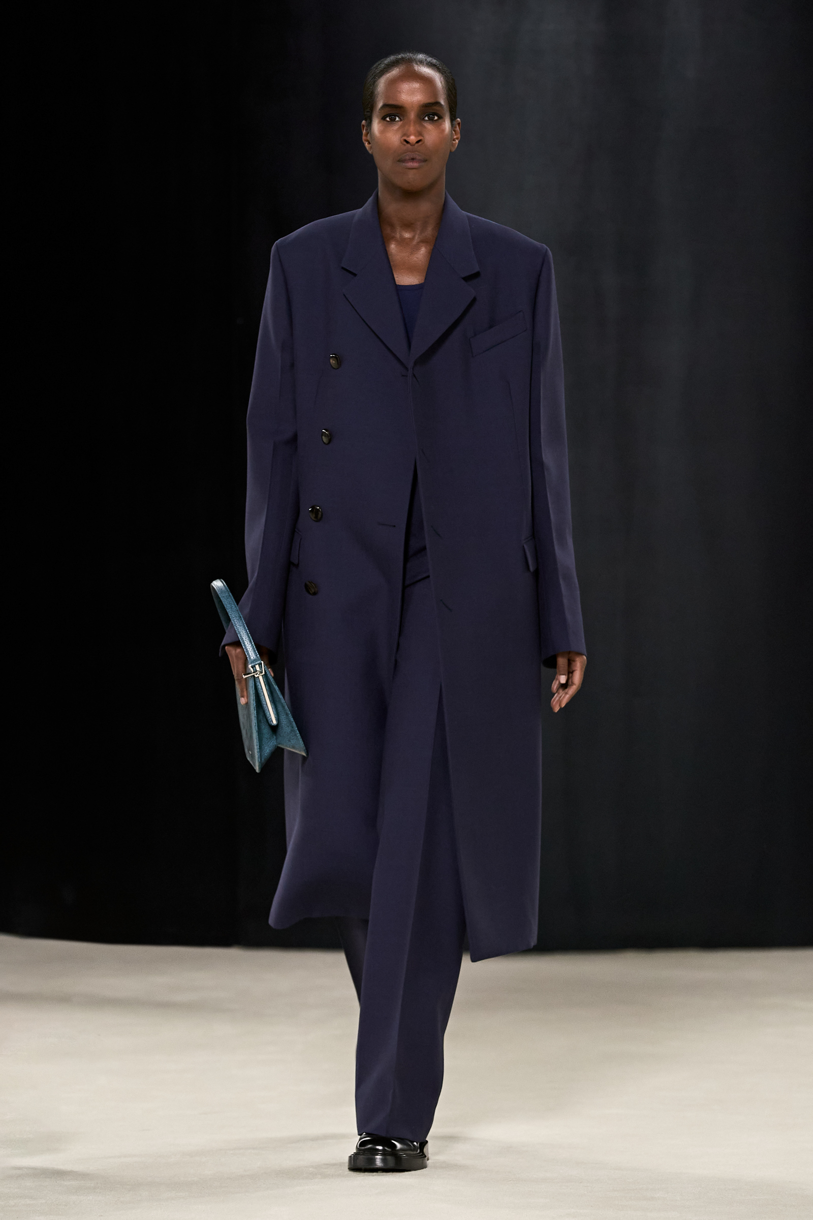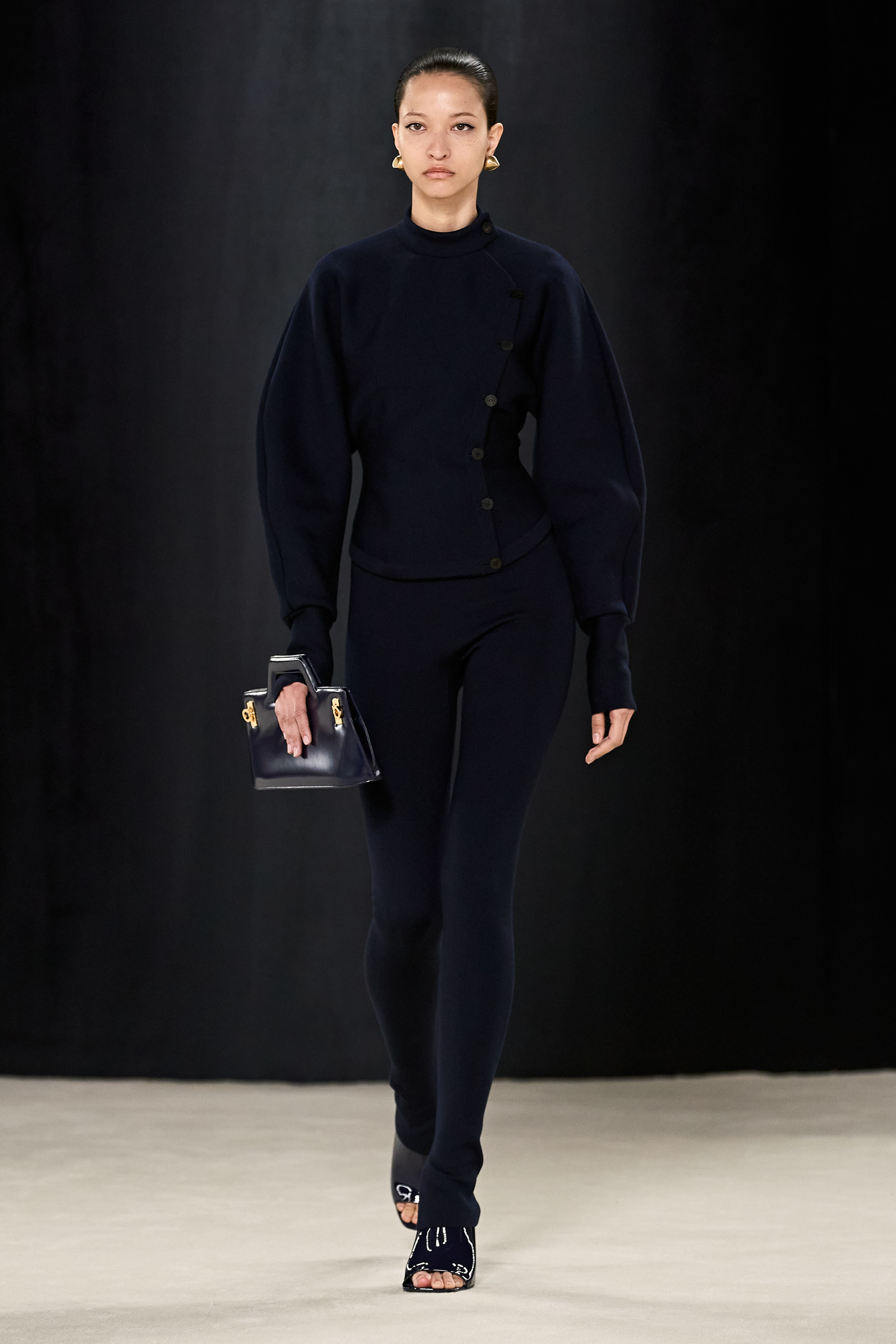 For his second mainline Ferragamo collection today, Maximilian Davis looked to further his mission to render the Florentine house’s historic connections with Hollywood freshly relevant. The founder’s descendants and CEO Marco Gobbetti left no expense spared in the execution of Davis’s direction. Guests included Uma Thurman and NCT’s Lee Jeno. The set was a huge James Cameron meets Richard Serra-esque constructed space within the MiCo convention center—the same building in which Wim Wenders filmed the Gattaca-inspired fall ’21 pandemic-period collection for Ferragamo under Davis’s predecessor, Paul Andrew.