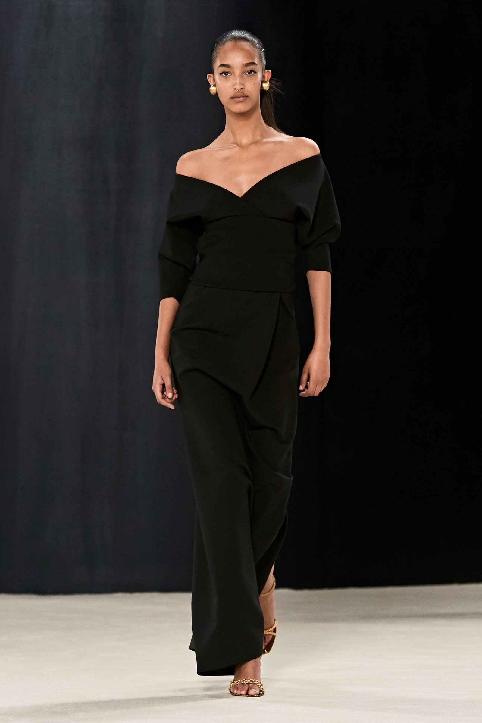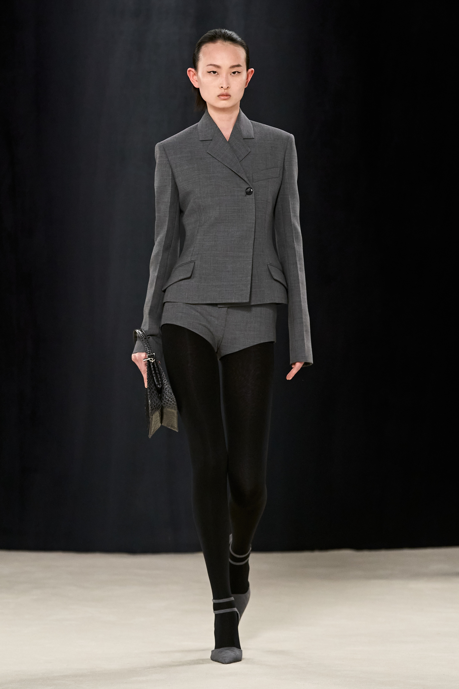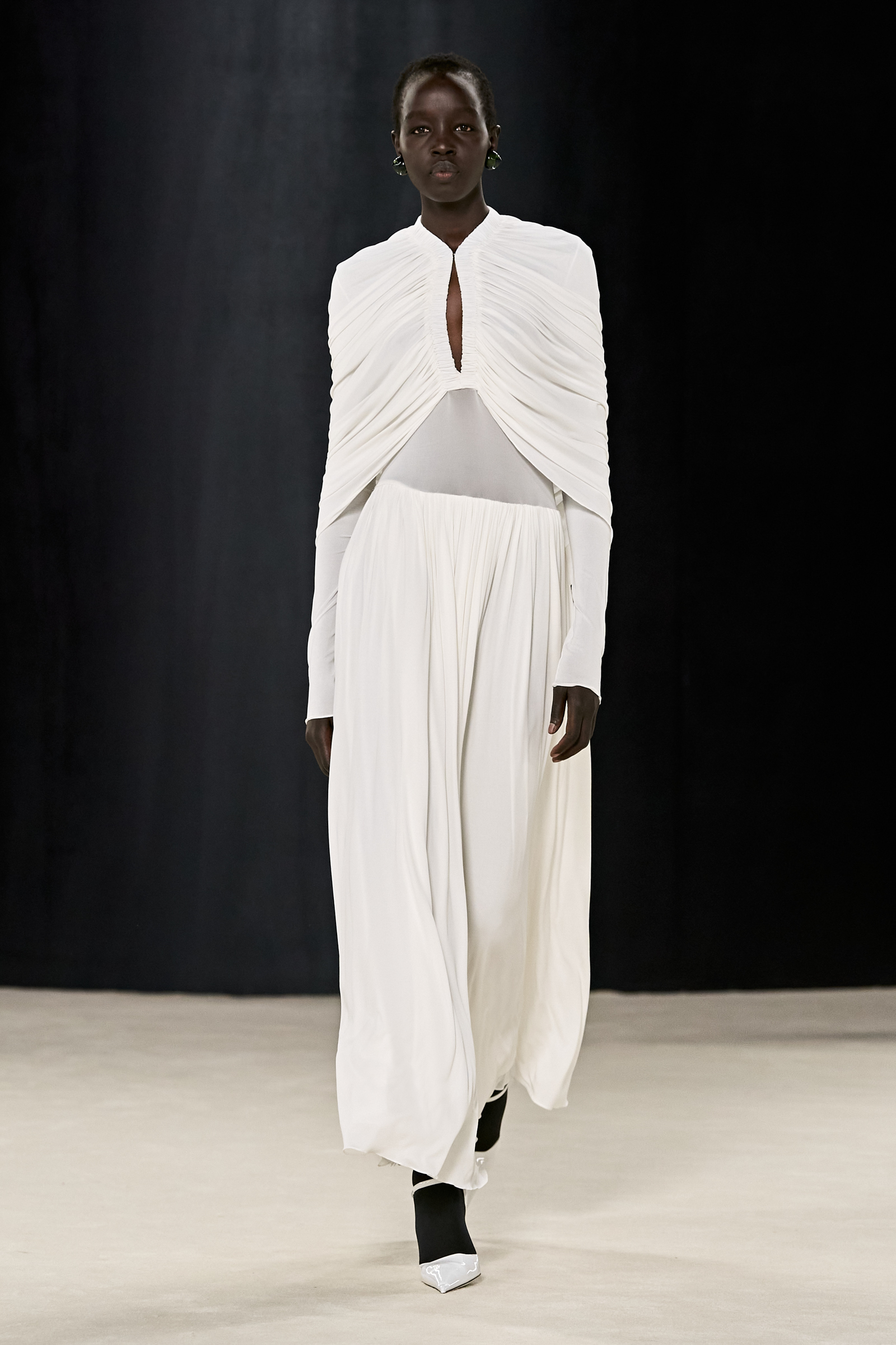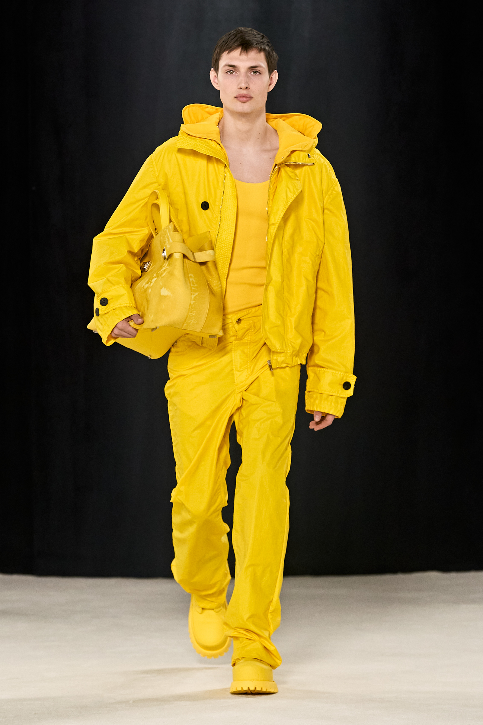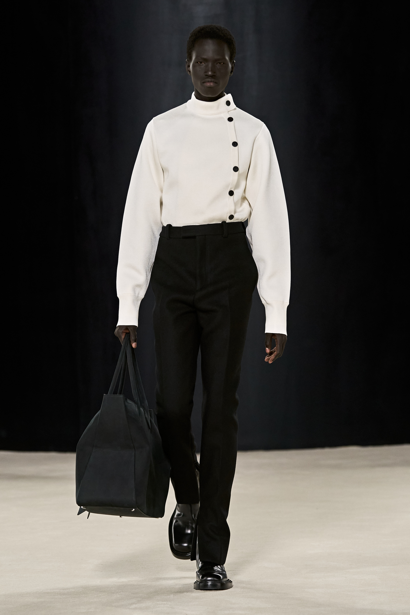 For his second mainline Ferragamo collection today, Maximilian Davis looked to further his mission to render the Florentine house’s historic connections with Hollywood freshly relevant. The founder’s descendants and CEO Marco Gobbetti left no expense spared in the execution of Davis’s direction. Guests included Uma Thurman and NCT’s Lee Jeno. The set was a huge James Cameron meets Richard Serra-esque constructed space within the MiCo convention center—the same building in which Wim Wenders filmed the Gattaca-inspired fall ’21 pandemic-period collection for Ferragamo under Davis’s predecessor, Paul Andrew.