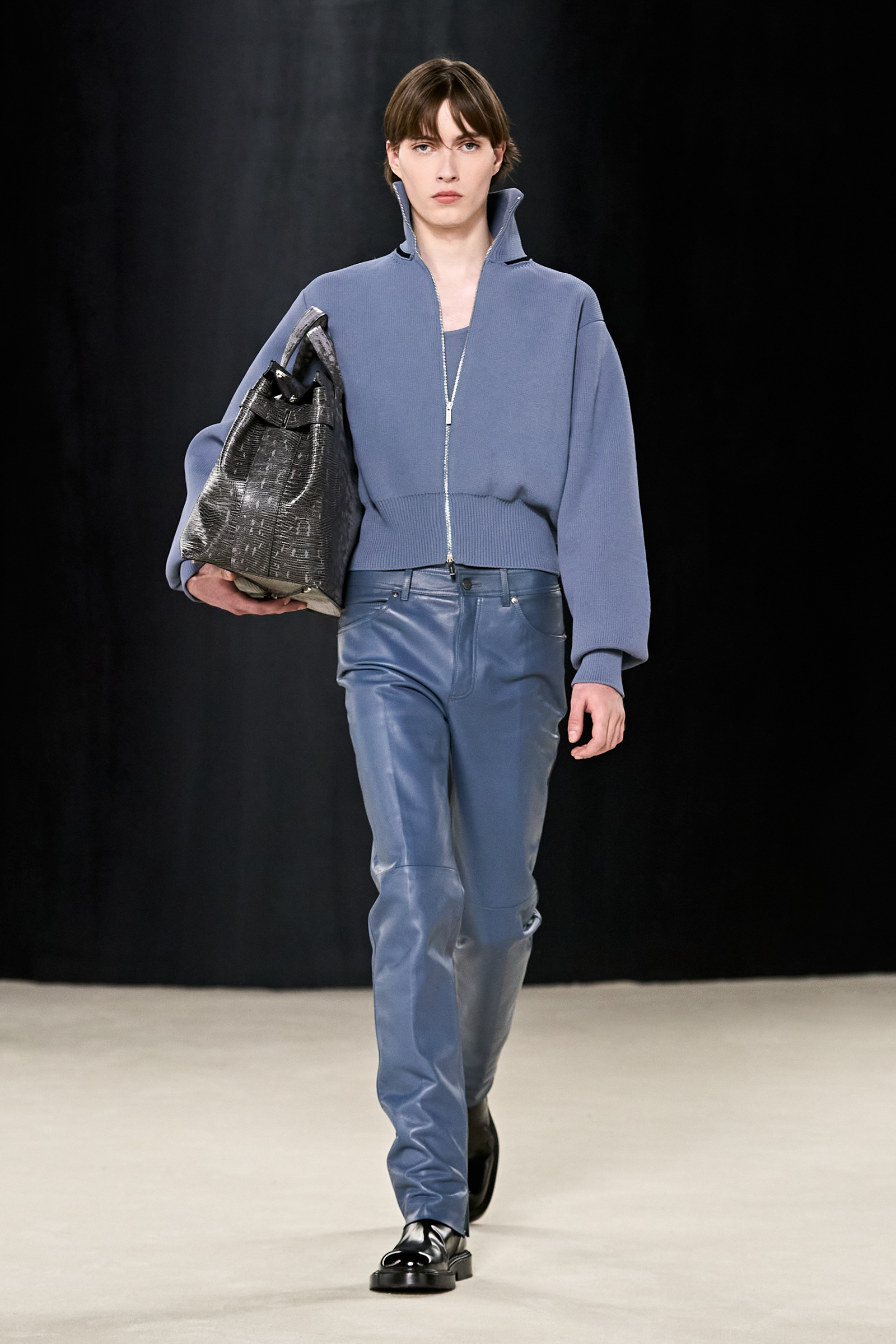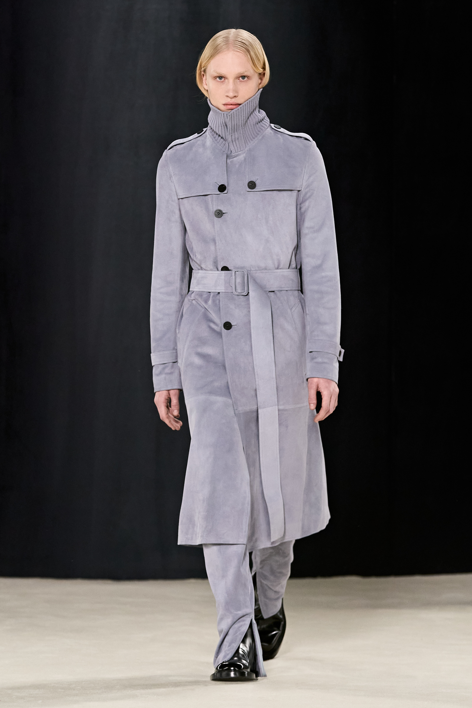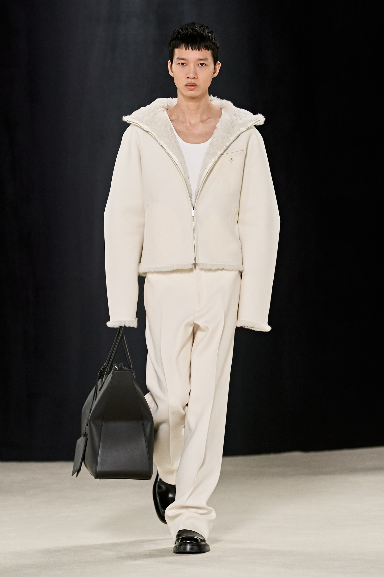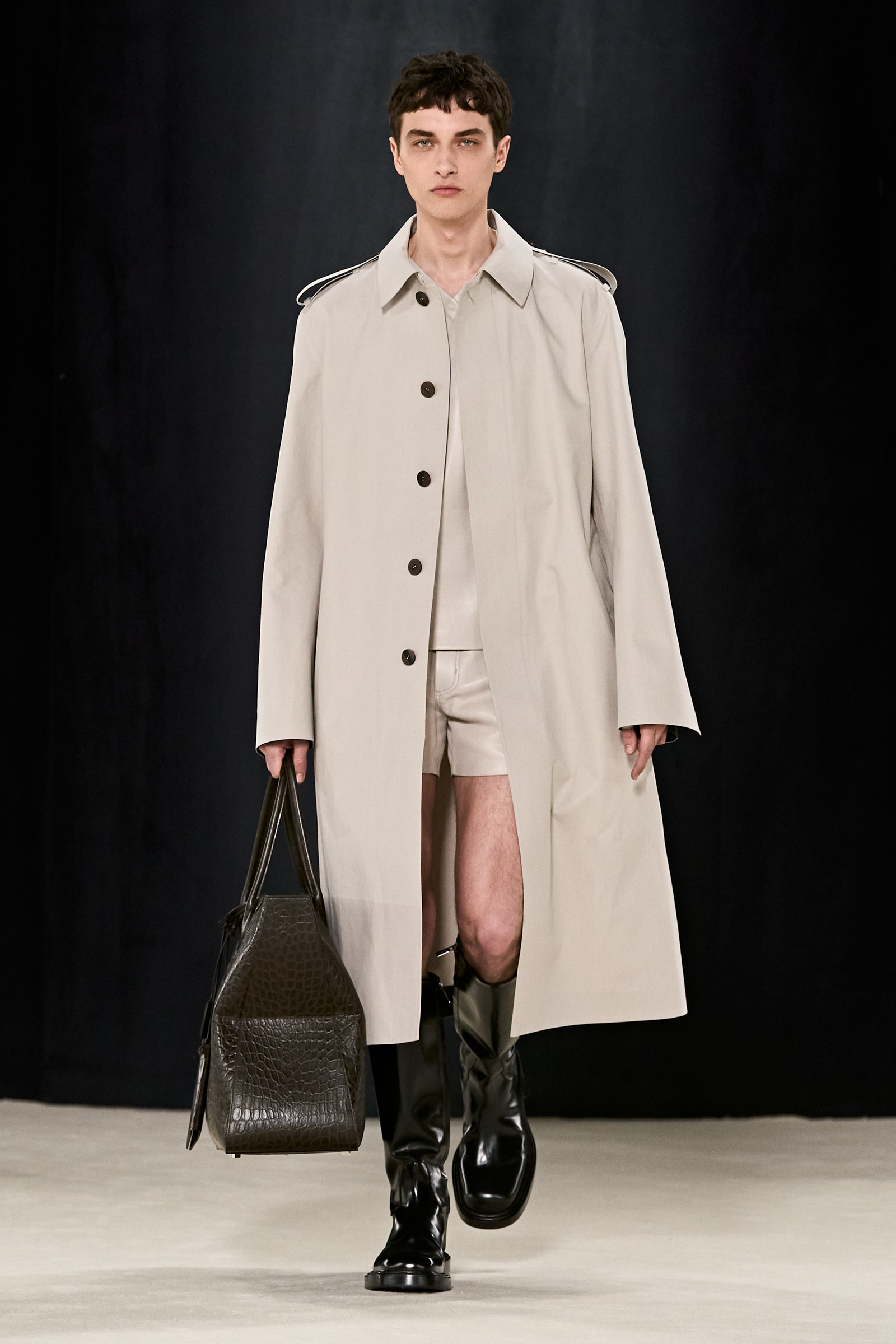 Davis took these period features—focusing especially on circle skirts, nipped waists and sweetheart necklines for women—then effectively worked to add contemporary elements in fabrication or via delicate sportswear detailing. He simultaneously defined his tailoring template—a high-lapeled, one-and-a-half breasted, and as-nipped-as-womenswear jacket shape (which had echoes of Adrien Brody in his red Prada fall 2012 officer’s coat)—and then expanded it equally across both genders. The placement of the buttons and the length were the only gender-identifying elements here. Some more off-duty looks (jeans and tank tops, trenches over shorts) acted as punctuation marks, as did cocoon-like hoodies double layered over flaring long-line skirts. Bags included handsome oversized daybags in lilac and natural lizard.