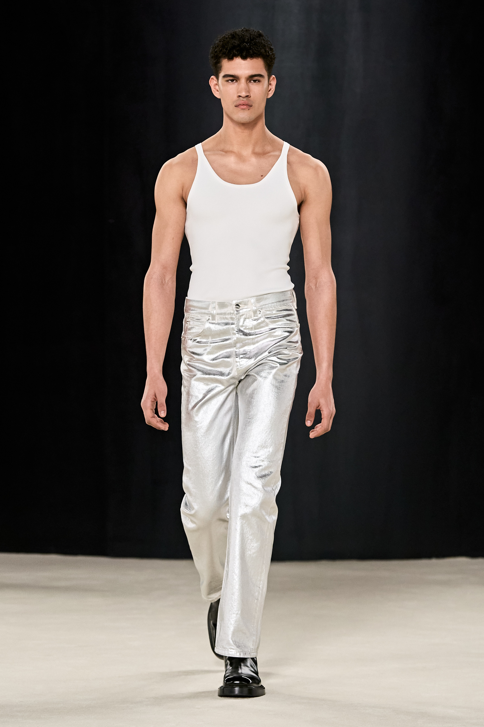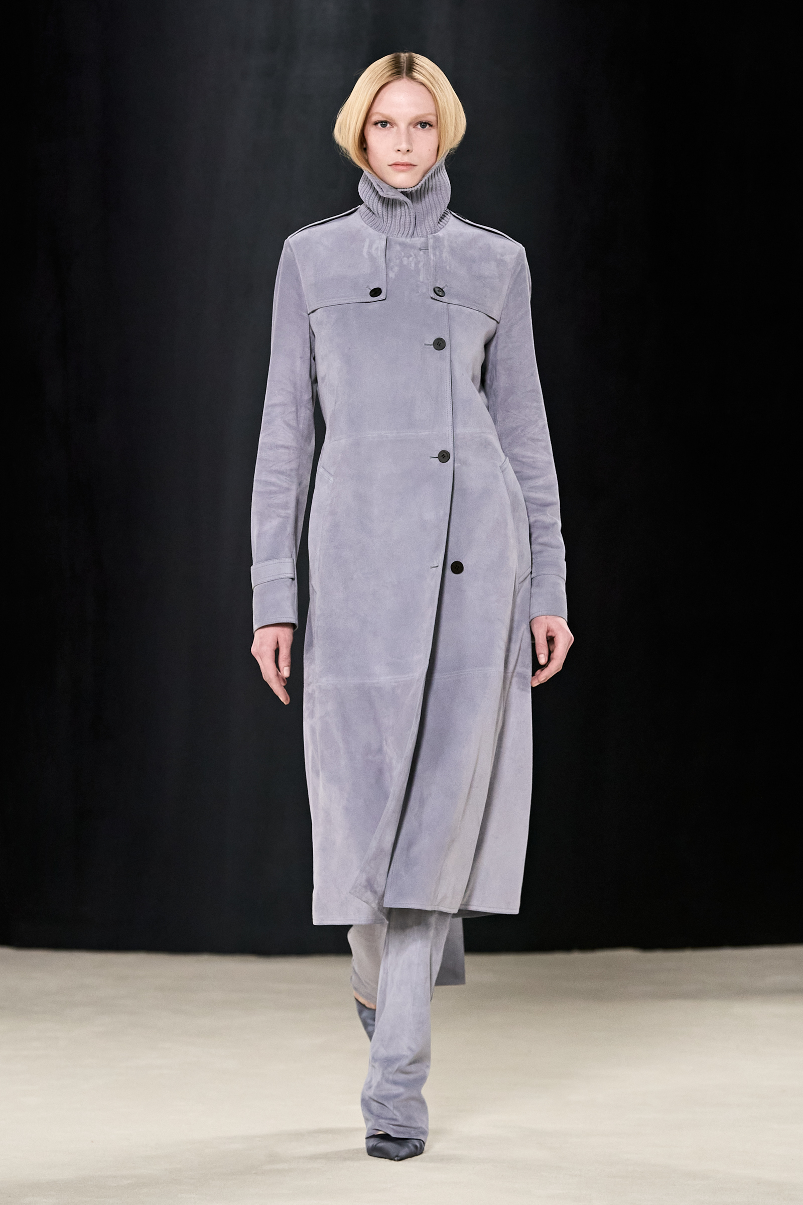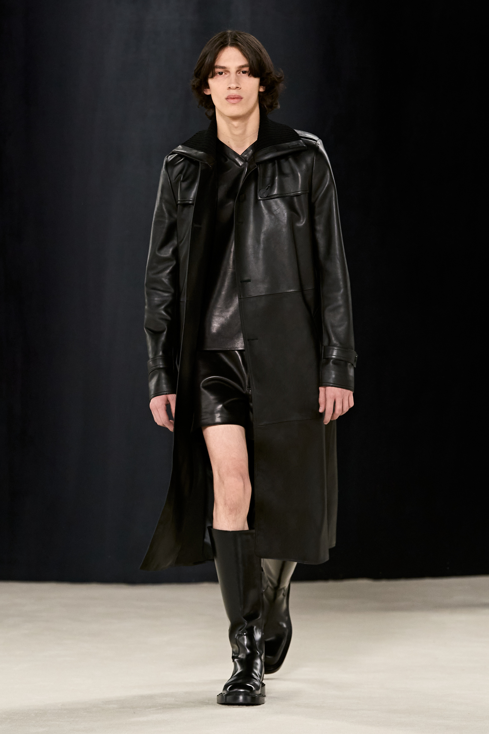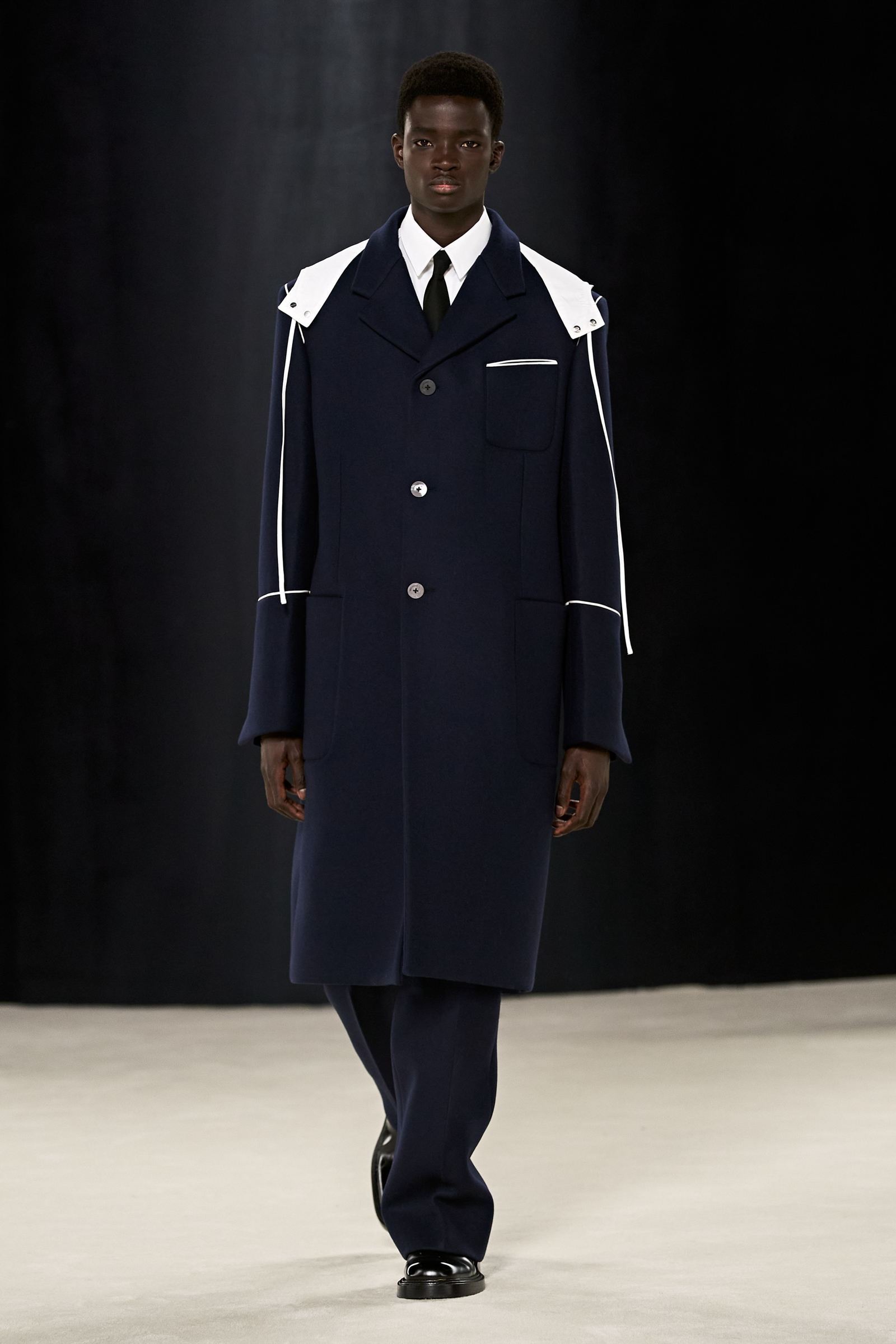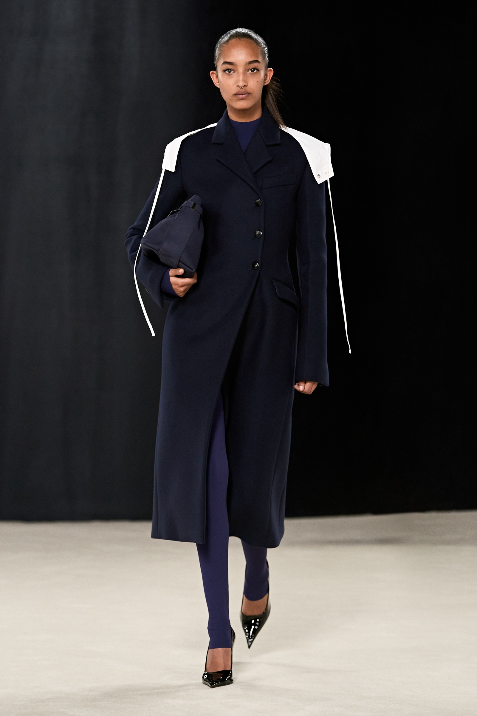 Davis took these period features—focusing especially on circle skirts, nipped waists and sweetheart necklines for women—then effectively worked to add contemporary elements in fabrication or via delicate sportswear detailing. He simultaneously defined his tailoring template—a high-lapeled, one-and-a-half breasted, and as-nipped-as-womenswear jacket shape (which had echoes of Adrien Brody in his red Prada fall 2012 officer’s coat)—and then expanded it equally across both genders. The placement of the buttons and the length were the only gender-identifying elements here. Some more off-duty looks (jeans and tank tops, trenches over shorts) acted as punctuation marks, as did cocoon-like hoodies double layered over flaring long-line skirts. Bags included handsome oversized daybags in lilac and natural lizard.
