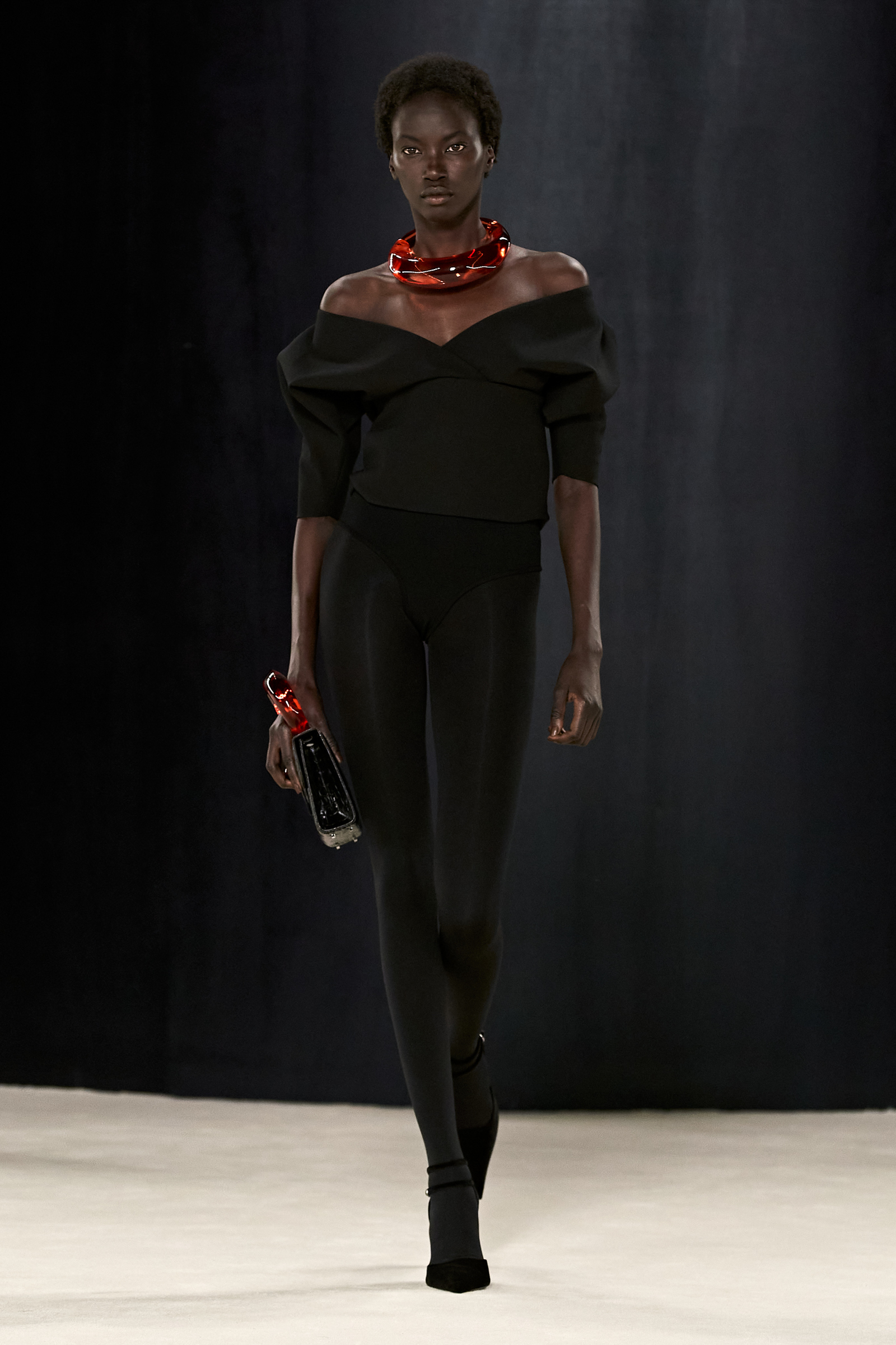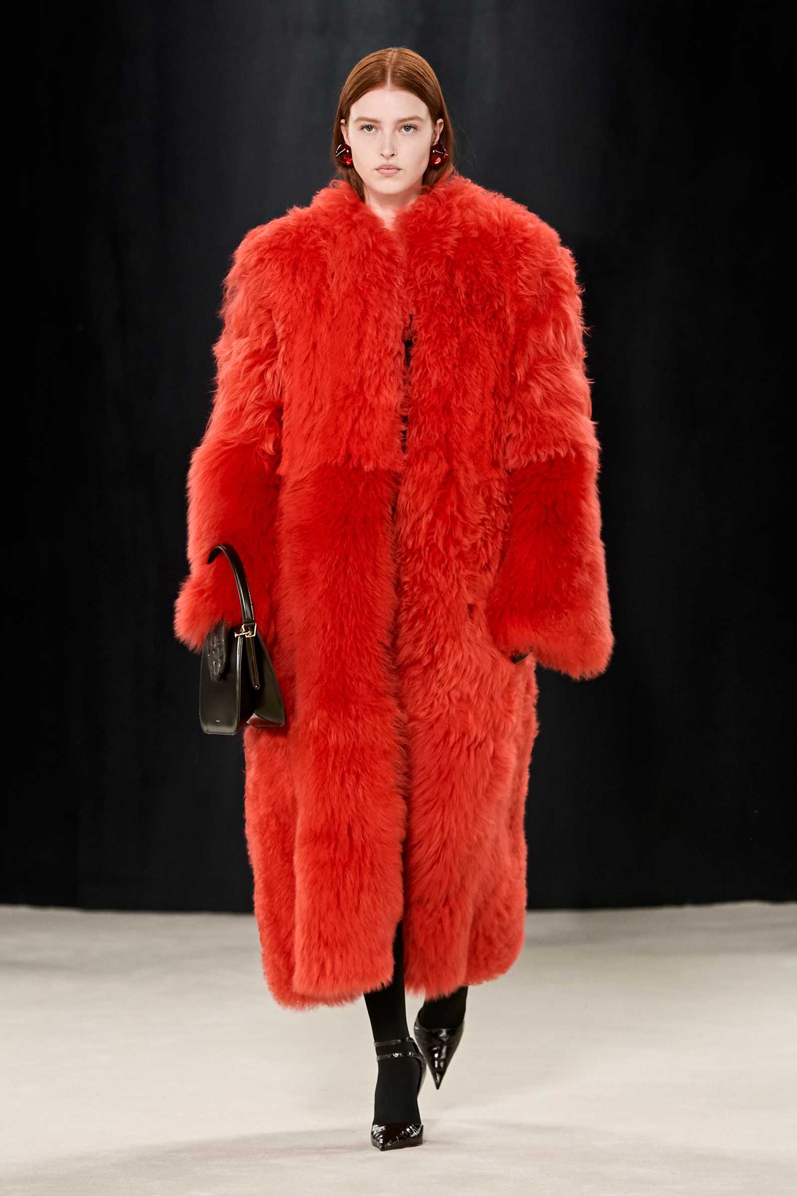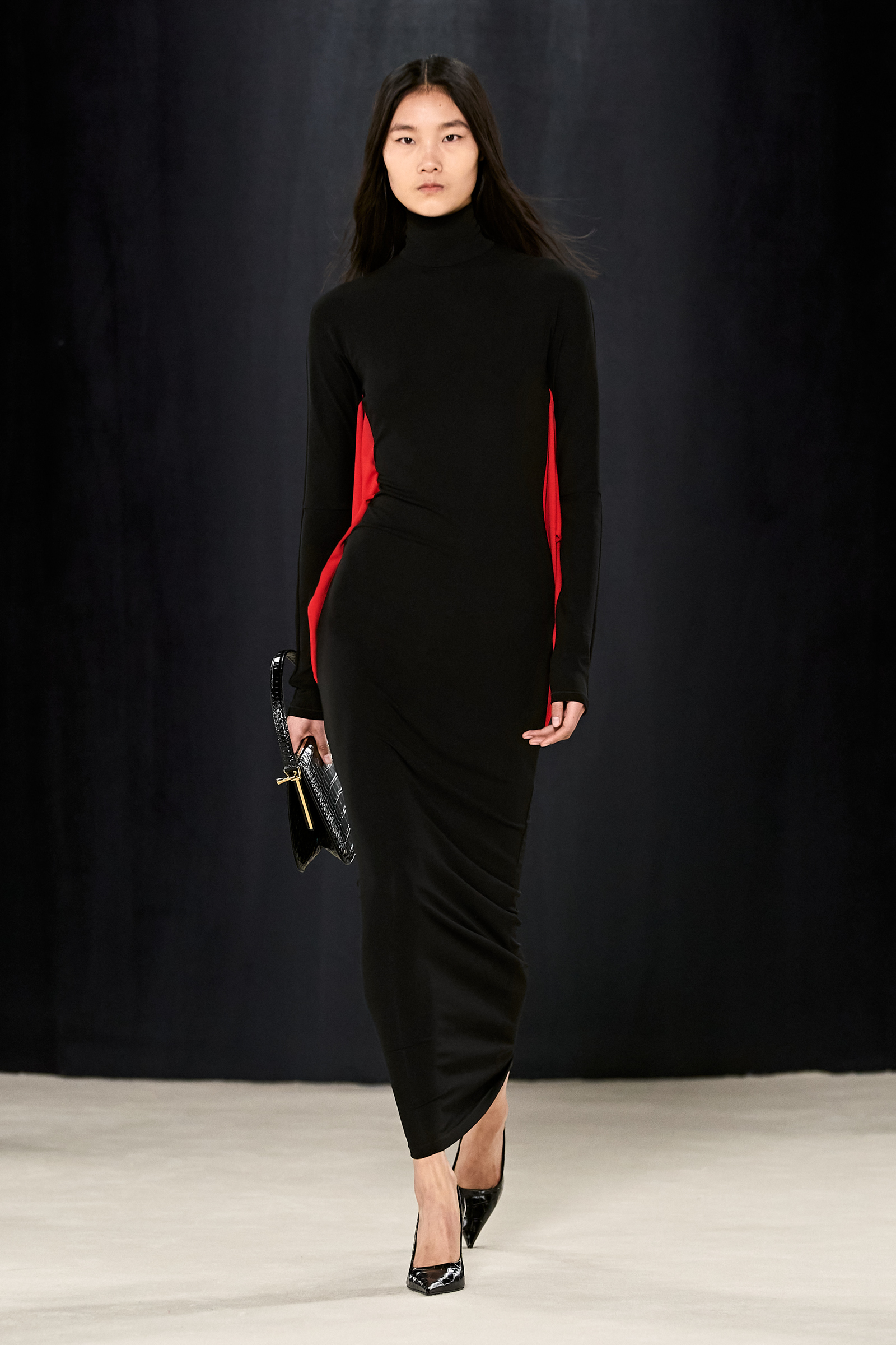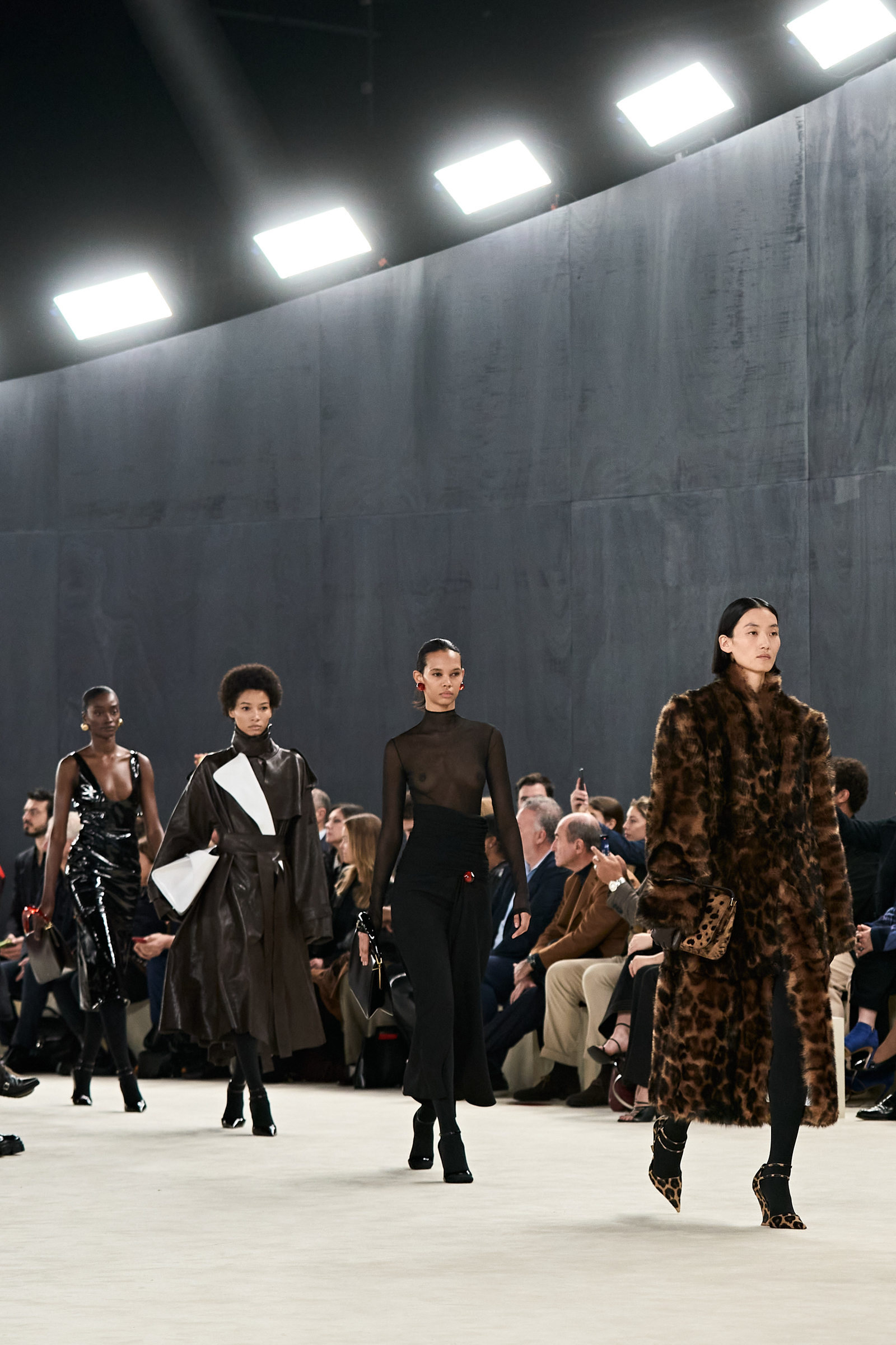 This young designer showed a mature restraint by waiting for a third of the run before pushing the tone of red that Ferragamo is trying to claim as its own, hitting us with a precise red pantsuit and male-worn leather trench. A bathrobe coat in delicately manufactured rectangular panels of scarlet and black leather followed. A black suit, then black dress, and black tracksuit were all defined by Lucio Fontana-esque welts of scarlet—via opened dart, side-ruffle and piping respectively. There was a similar considered duality in a full skirted brown trench with a contrasting cream collar accented by an accompanying same-color bag. Davis’s closing series of scoop and sweetheart neck wiggle dresses or tops and leggings, in shiny patent meets PVC material, or matte silk/wool, were successful expressions of the retro-future collision between the contemporary and his historical starting point.