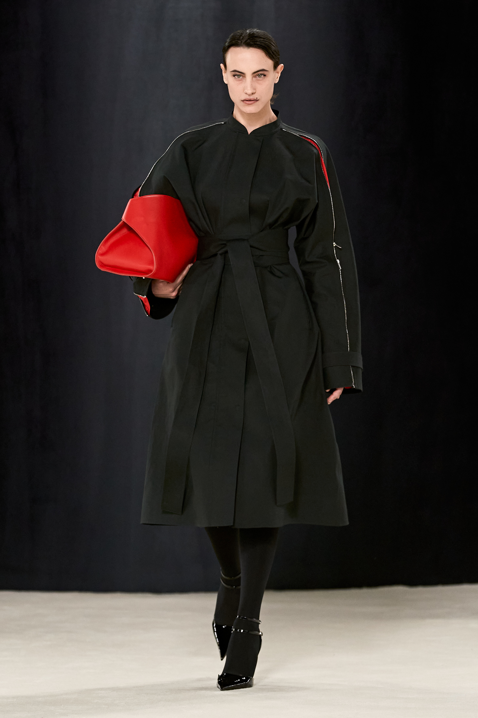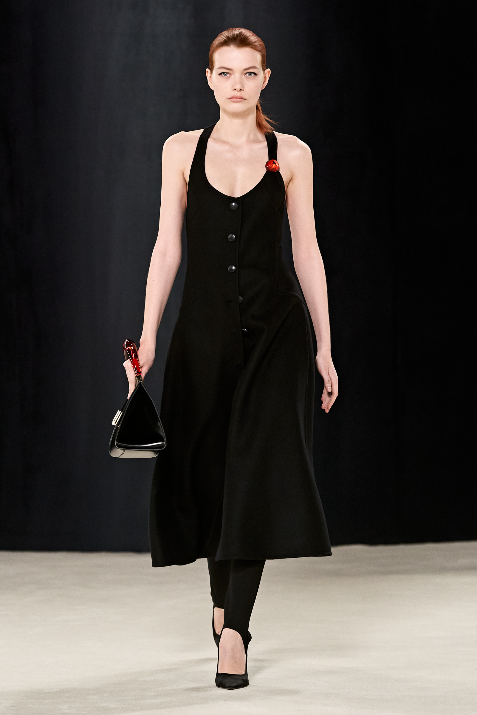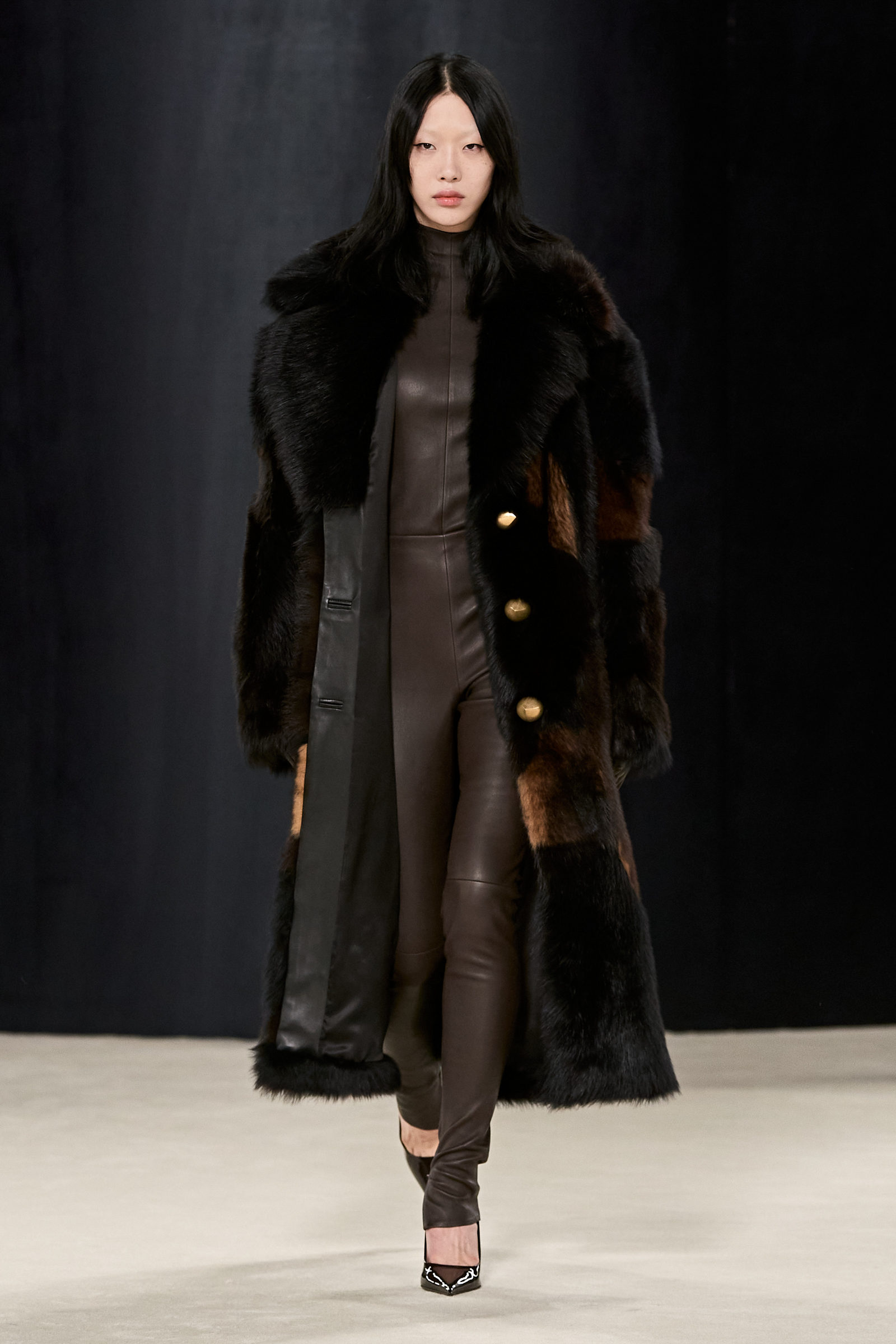 This young designer showed a mature restraint by waiting for a third of the run before pushing the tone of red that Ferragamo is trying to claim as its own, hitting us with a precise red pantsuit and male-worn leather trench. A bathrobe coat in delicately manufactured rectangular panels of scarlet and black leather followed. A black suit, then black dress, and black tracksuit were all defined by Lucio Fontana-esque welts of scarlet—via opened dart, side-ruffle and piping respectively. There was a similar considered duality in a full skirted brown trench with a contrasting cream collar accented by an accompanying same-color bag. Davis’s closing series of scoop and sweetheart neck wiggle dresses or tops and leggings, in shiny patent meets PVC material, or matte silk/wool, were successful expressions of the retro-future collision between the contemporary and his historical starting point.