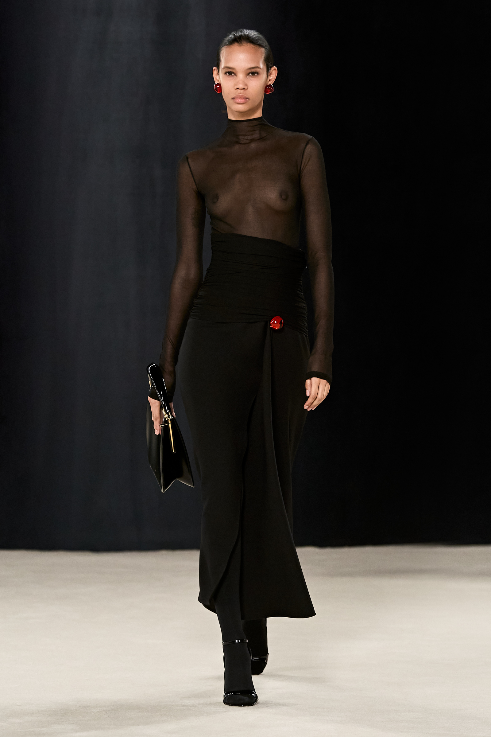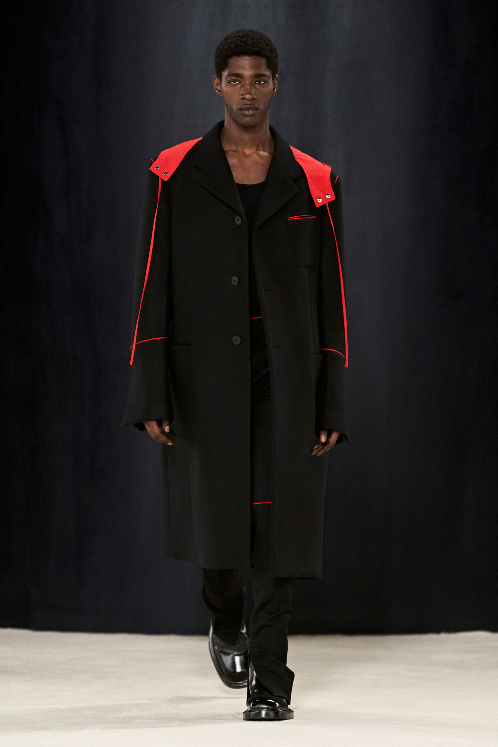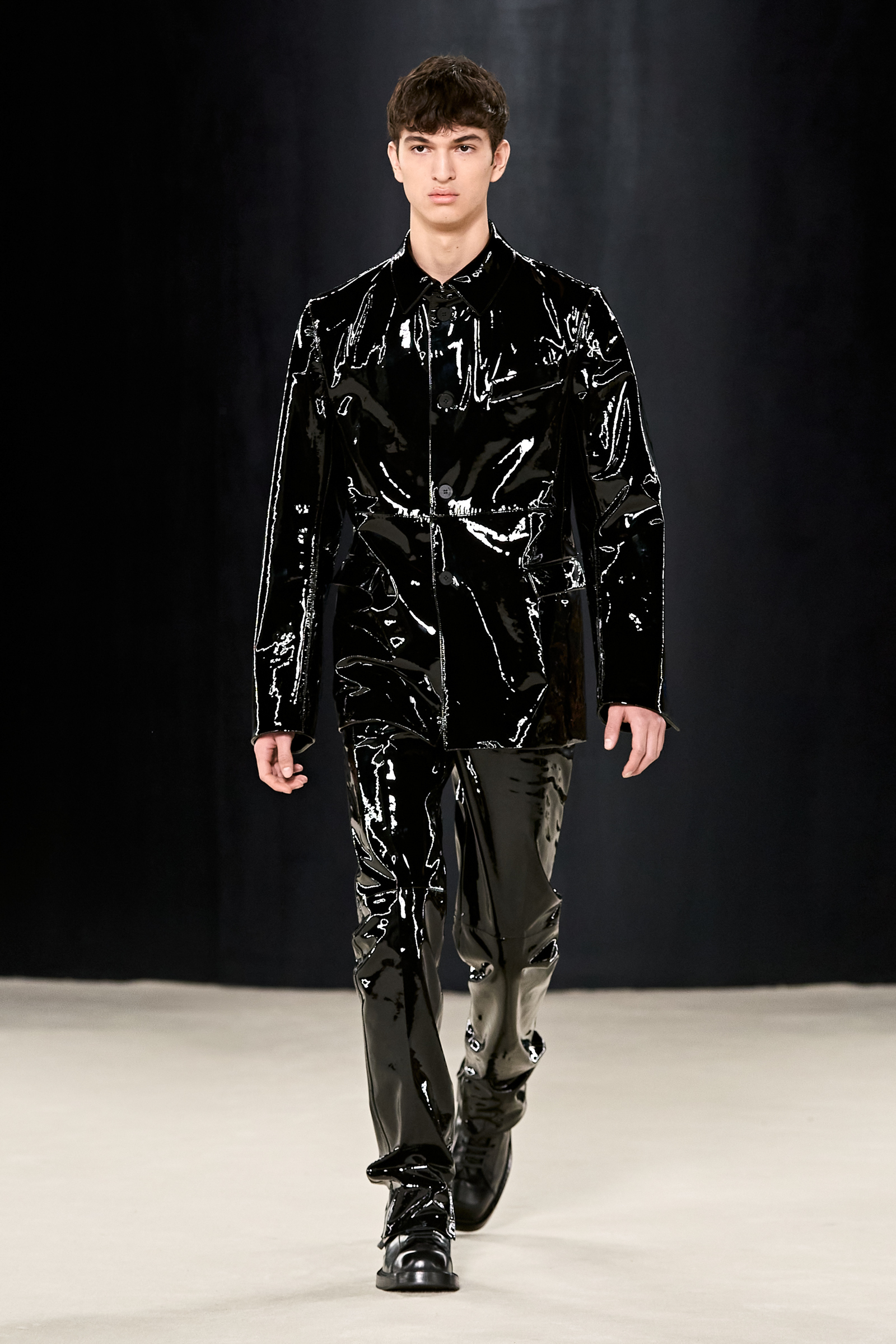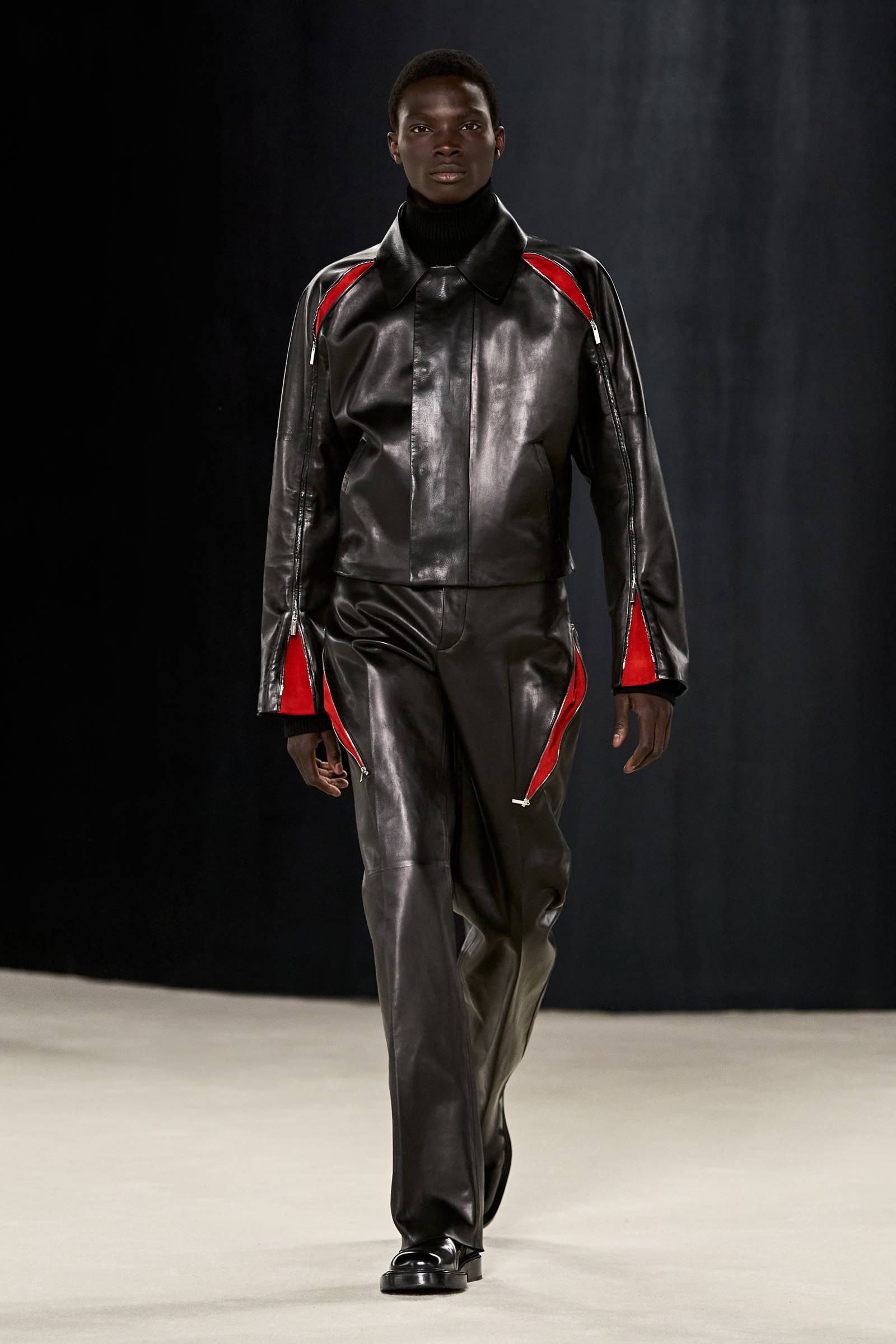 This young designer showed a mature restraint by waiting for a third of the run before pushing the tone of red that Ferragamo is trying to claim as its own, hitting us with a precise red pantsuit and male-worn leather trench. A bathrobe coat in delicately manufactured rectangular panels of scarlet and black leather followed. A black suit, then black dress, and black tracksuit were all defined by Lucio Fontana-esque welts of scarlet—via opened dart, side-ruffle and piping respectively. There was a similar considered duality in a full skirted brown trench with a contrasting cream collar accented by an accompanying same-color bag. Davis’s closing series of scoop and sweetheart neck wiggle dresses or tops and leggings, in shiny patent meets PVC material, or matte silk/wool, were successful expressions of the retro-future collision between the contemporary and his historical starting point.