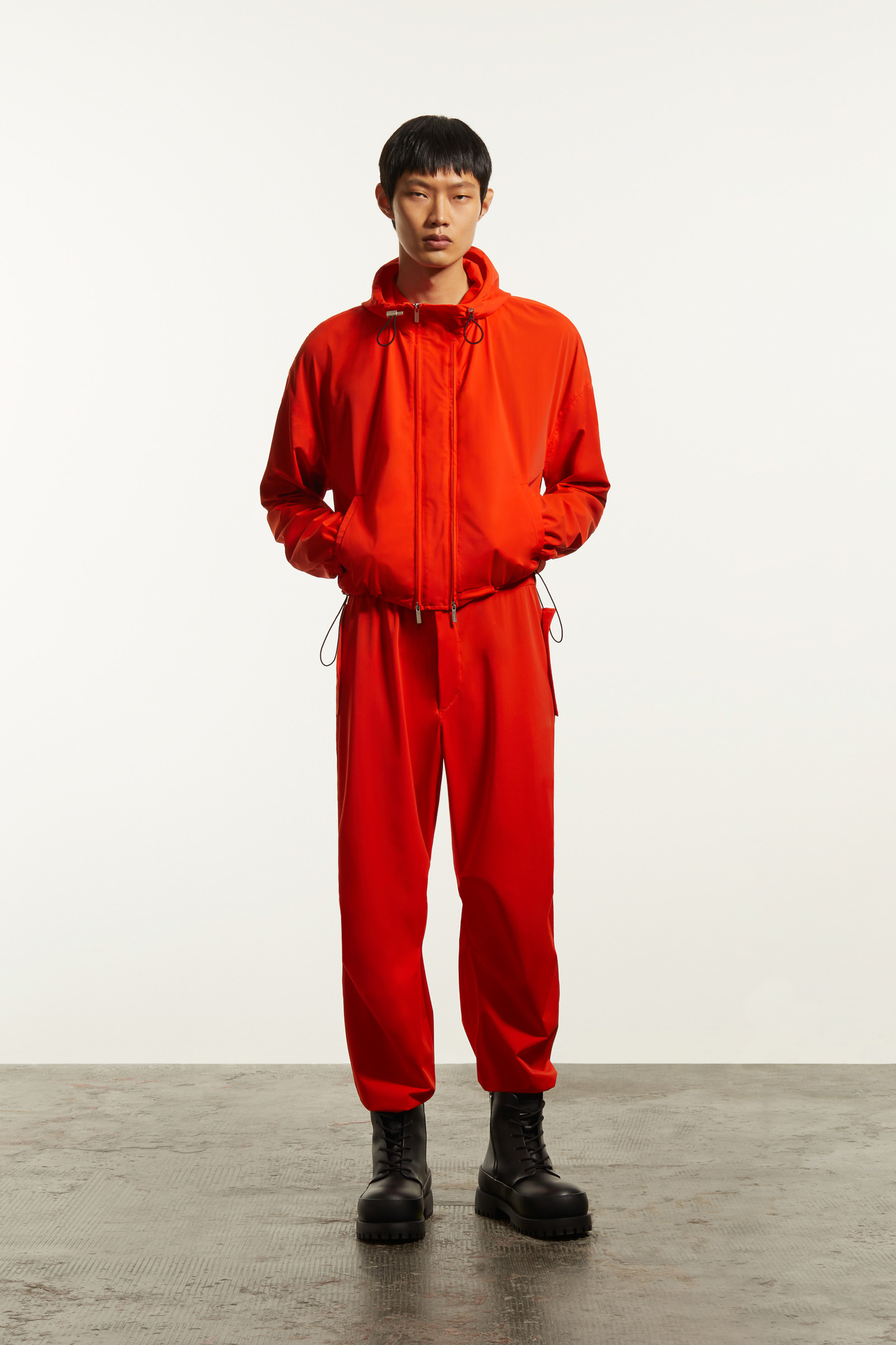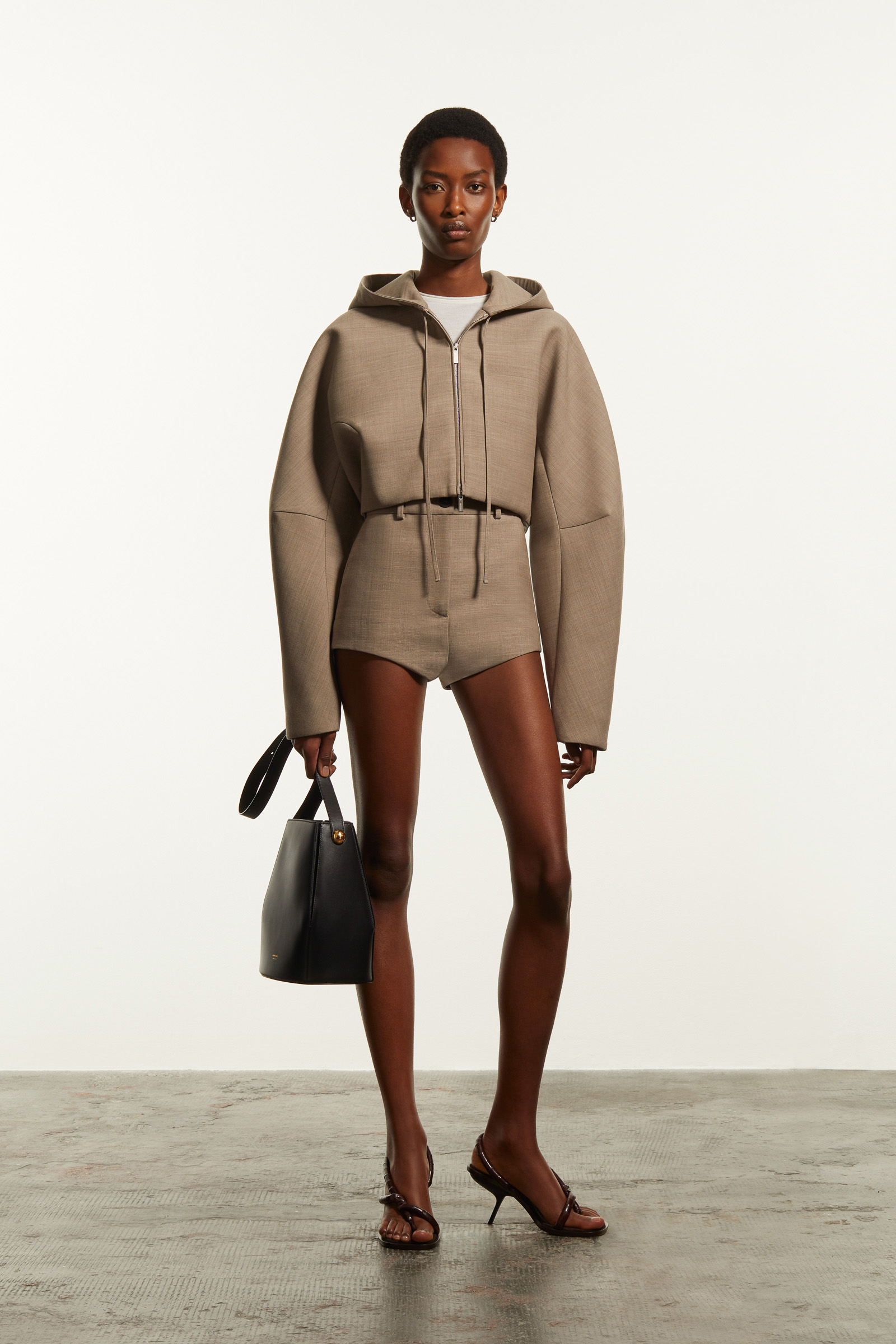 Making the case for a Ferragamo wardrobe for the cool younger people of the family, Davis offered cocoon-shaped hoodies and batwing-sleeve cropped blousons; the ultra-short shorts they were worn with hinted at provocation, even if they were cut in natté wool with a luxurious texture.