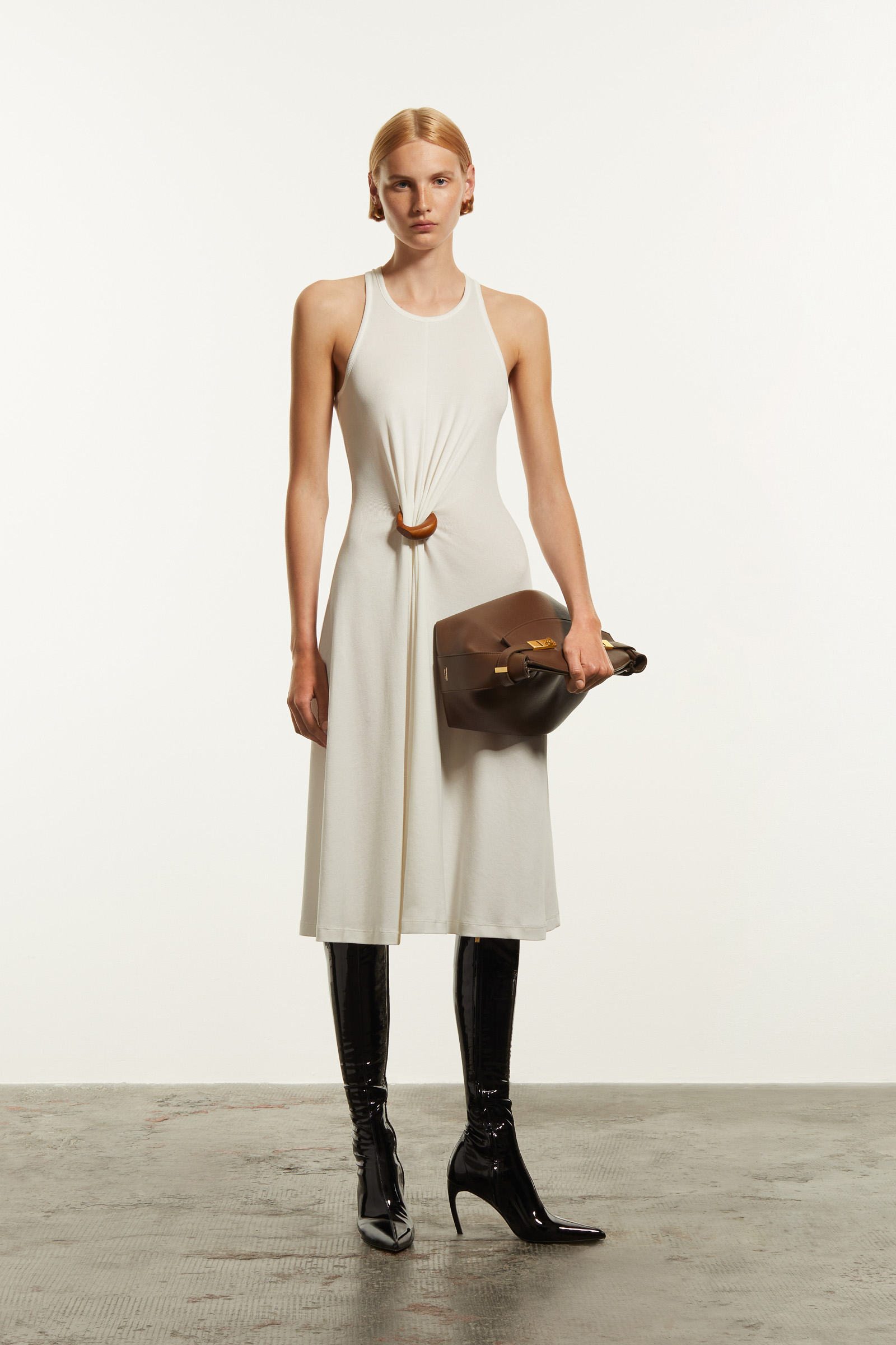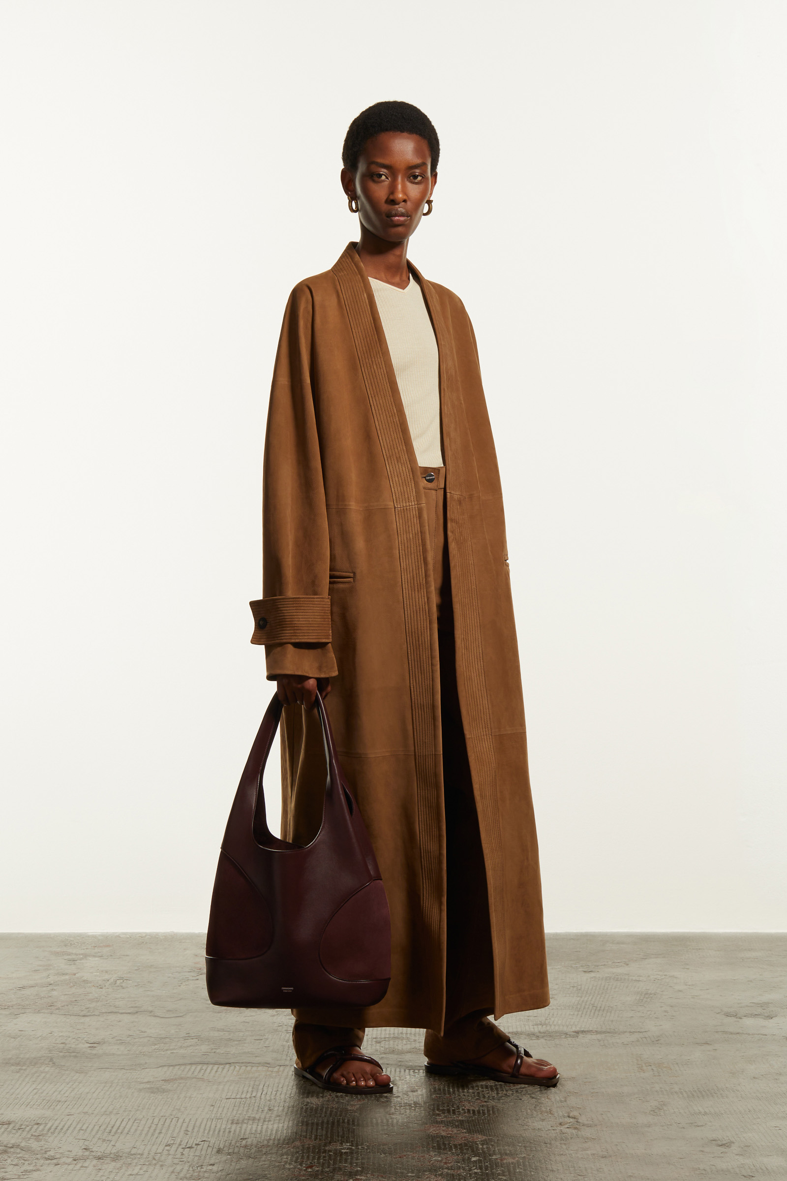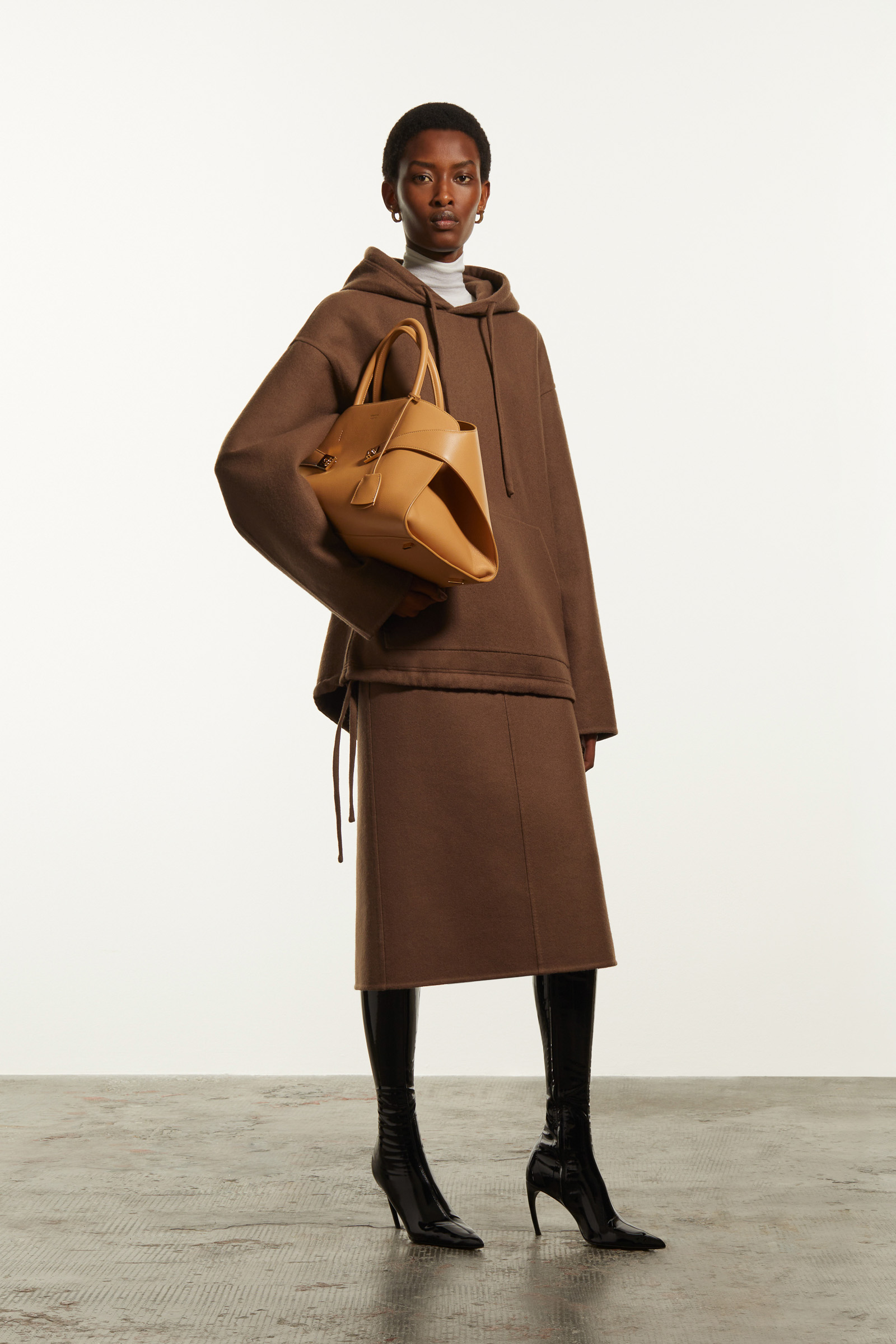 Part of the designer’s game is to upgrade the sporty to a chicer status. Case in point was a classic flight jacket, elevated via a round, mid-century couture-ish volume that was proposed with a midi A-line skirt for a sort of new skirt suit template. Shape-holding yet smooth nubuck leather in a soft shade of caramel highlighted the sensuous touch Davis often adds to clean, linear constructions.